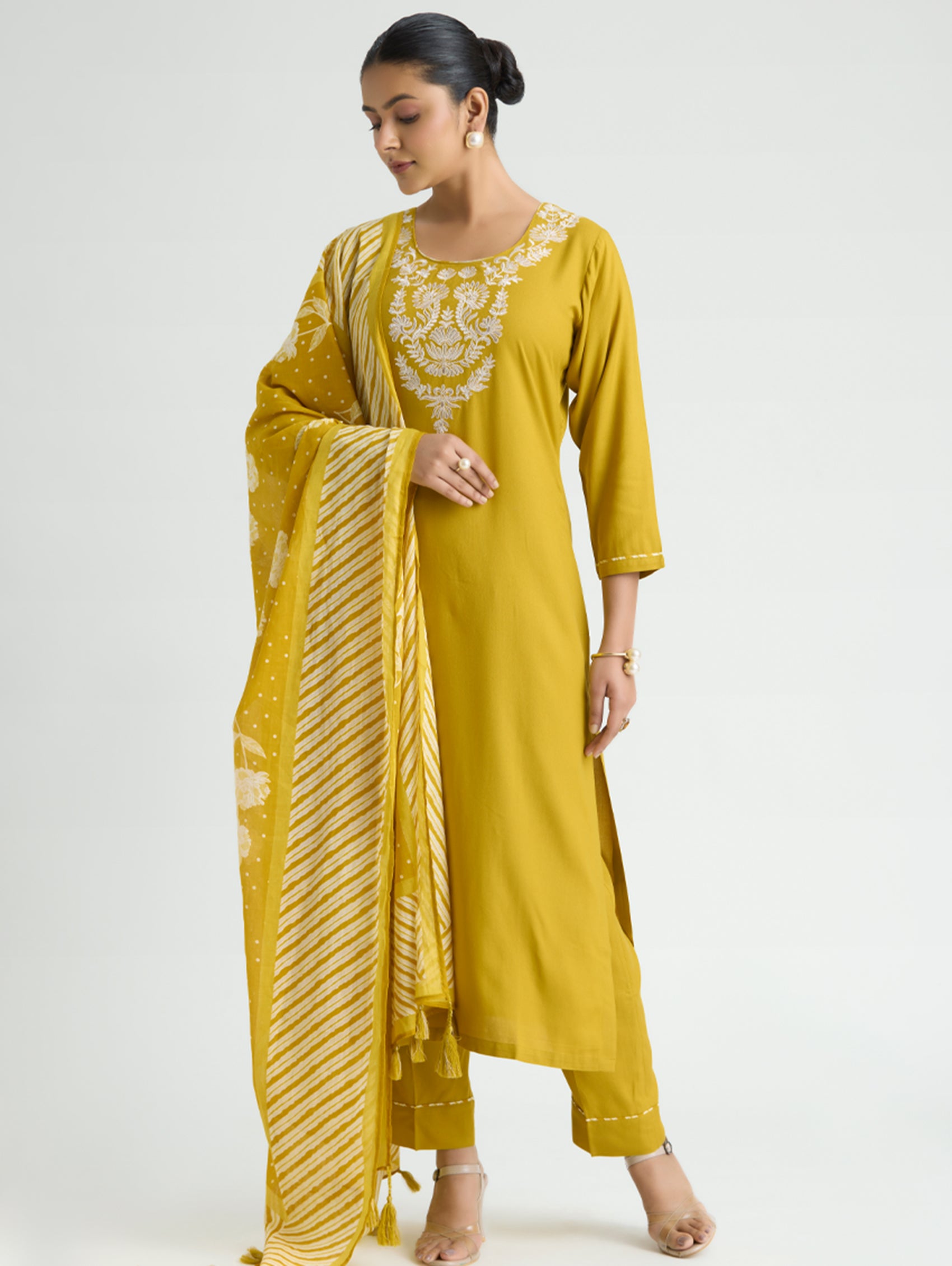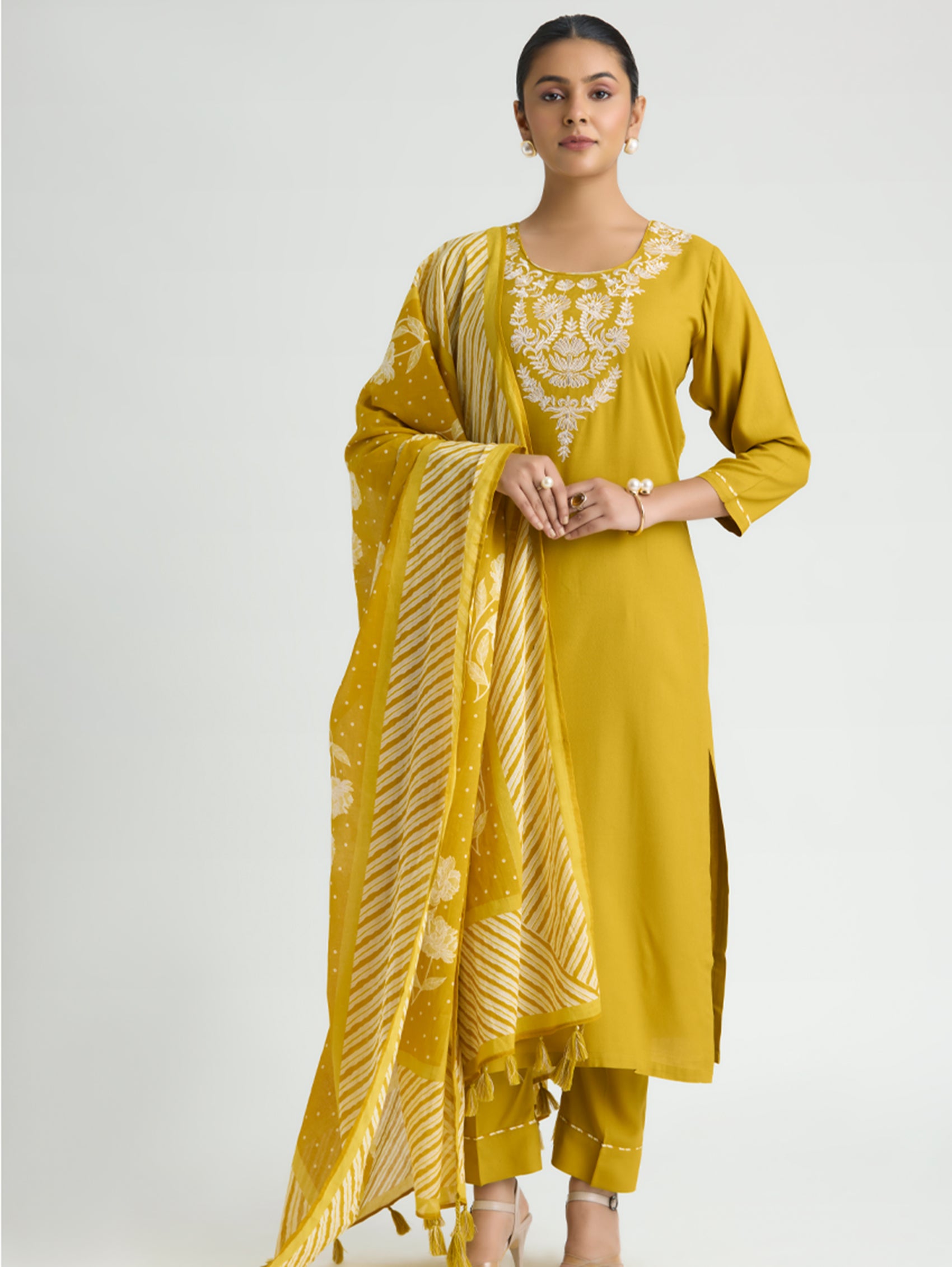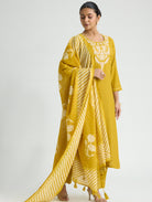 Yellow Embroidered Viscose Rayon Suit Set with Dupatta