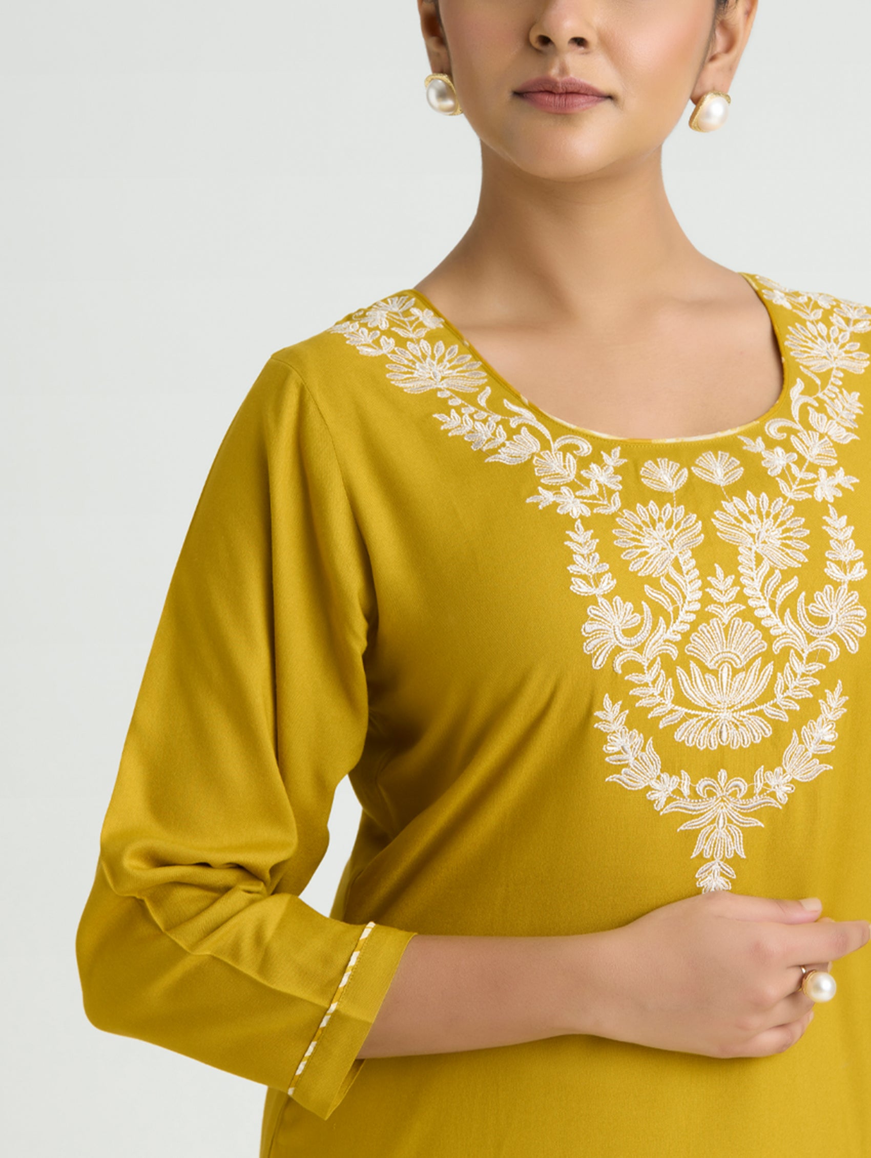 • Kurta with round neckline, three-fourth sleeves, and side slits open