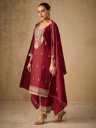 Experience elegance with this straight-fit suit crafted from premium viscose silk. The kurta showcases intricate cording thread embroidery, paired perfectly with matching straight palazzo pants and an embroidered viscose silk dupatta. This ensemble combines traditional artistry with modern style, delivering a polished and effortlessly stylish appearance.