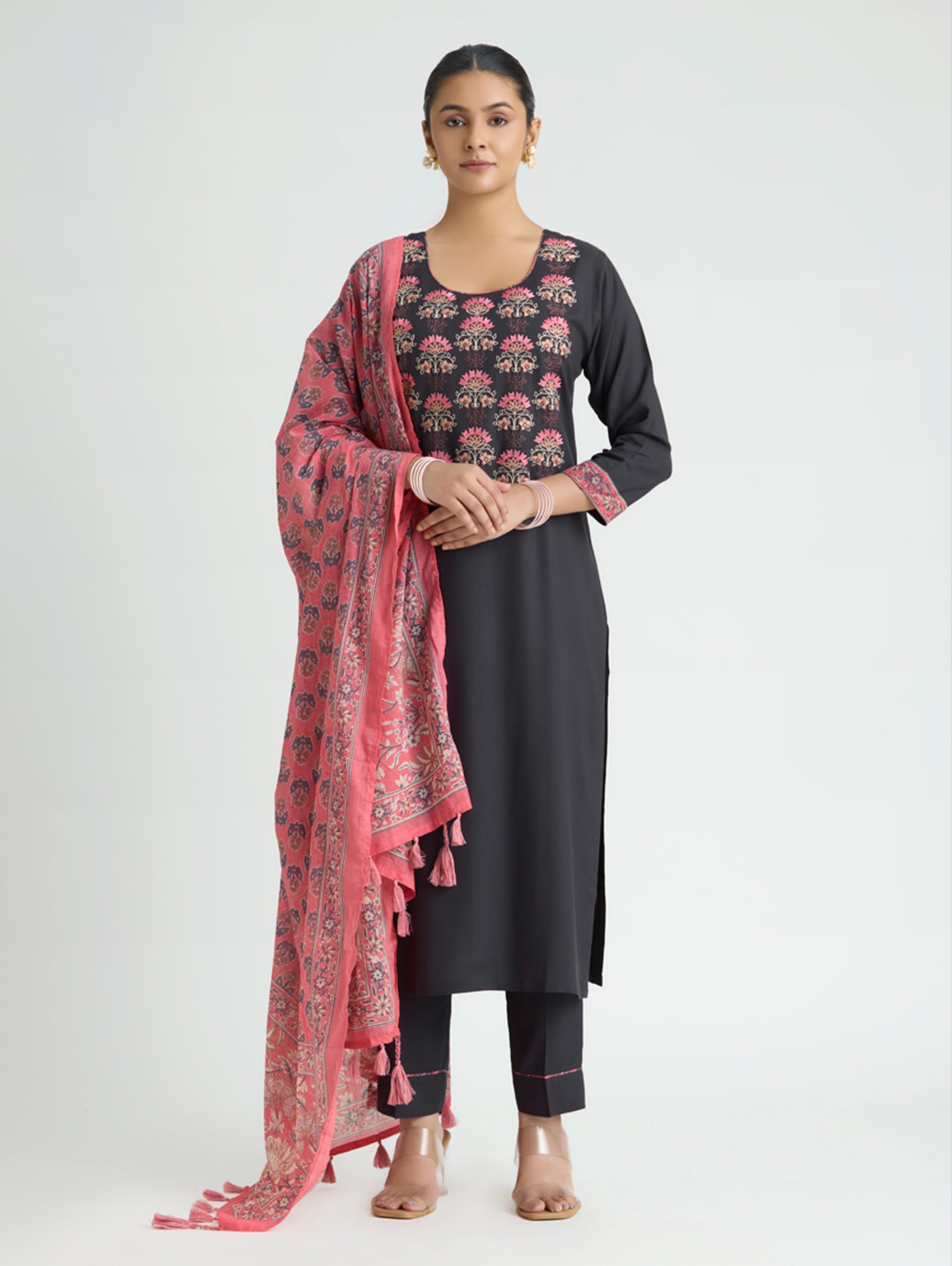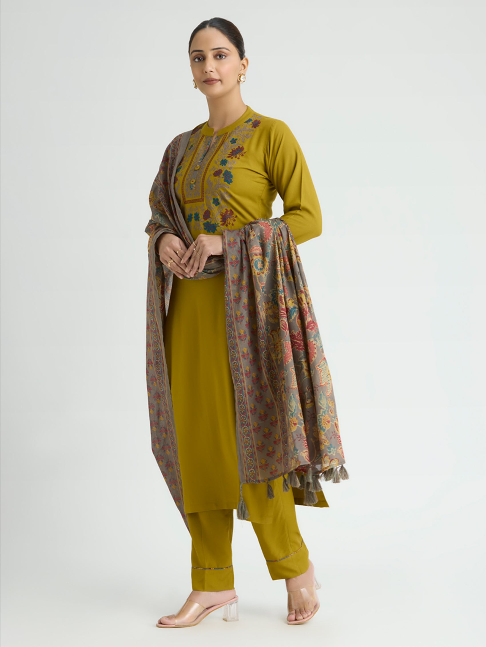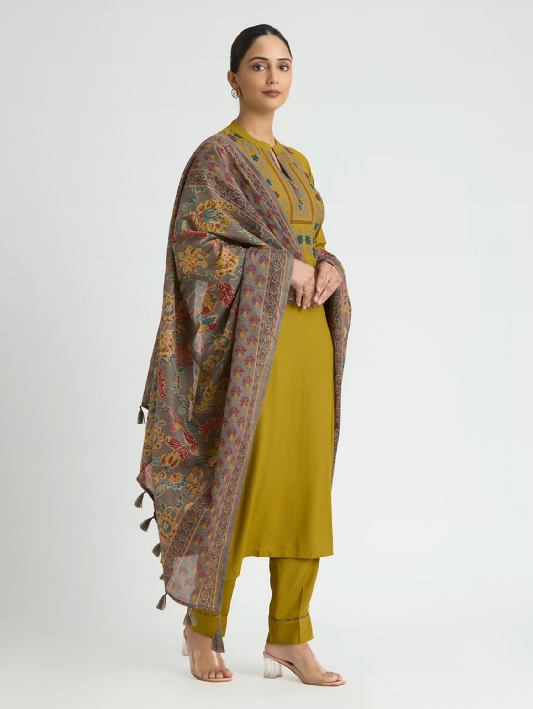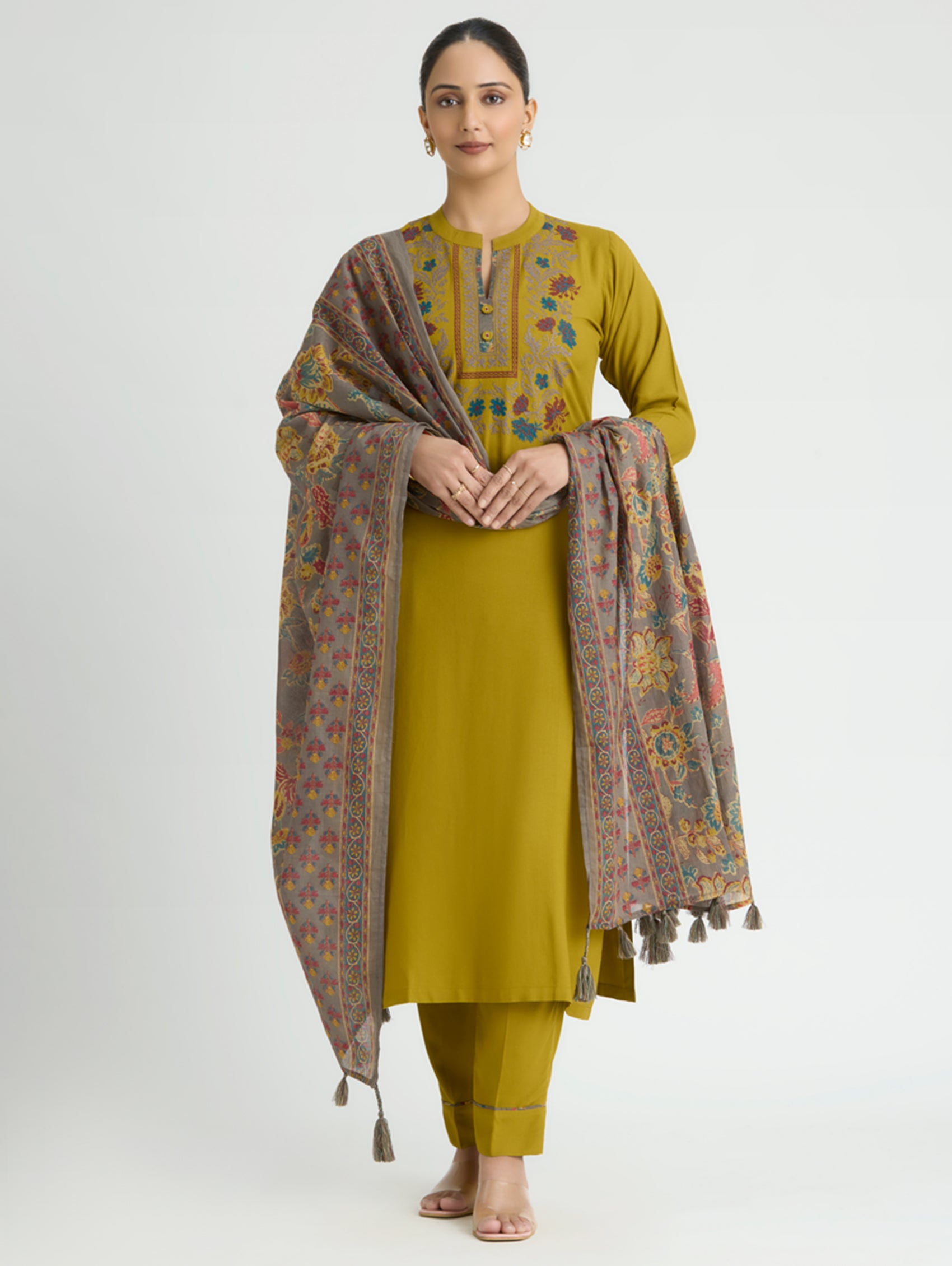 Indulge in luxury and cosiness with our Embroidered Rayon Suit Set, consisting of a chic kurta and perfectly-tailored pants crafted from Liva-Certified Viscose Rayon material, paired with a breathtaking printed dupatta in soft mul fabric. The kurta boasts exquisite embroidery, elevating its elegance to new heights.