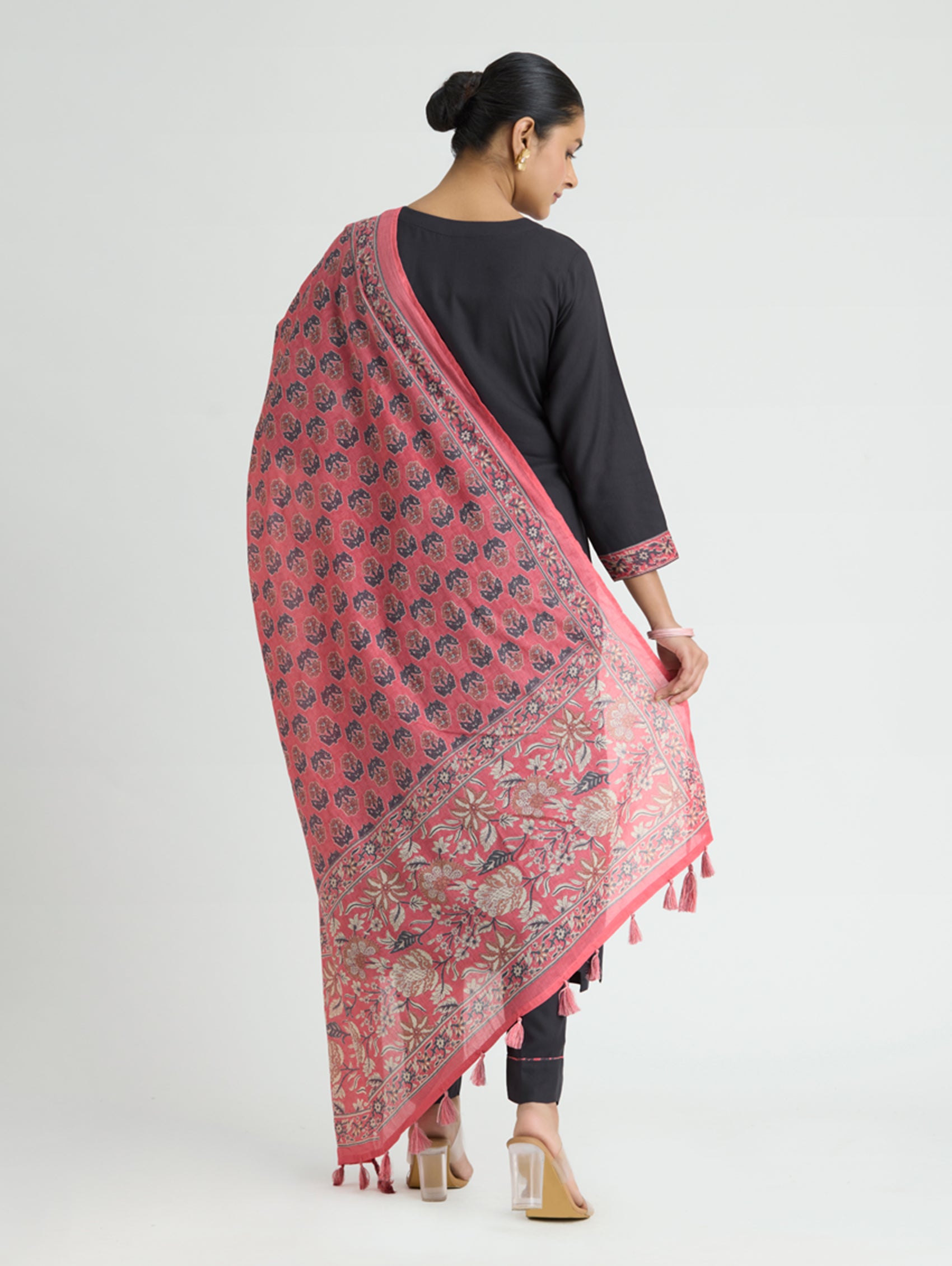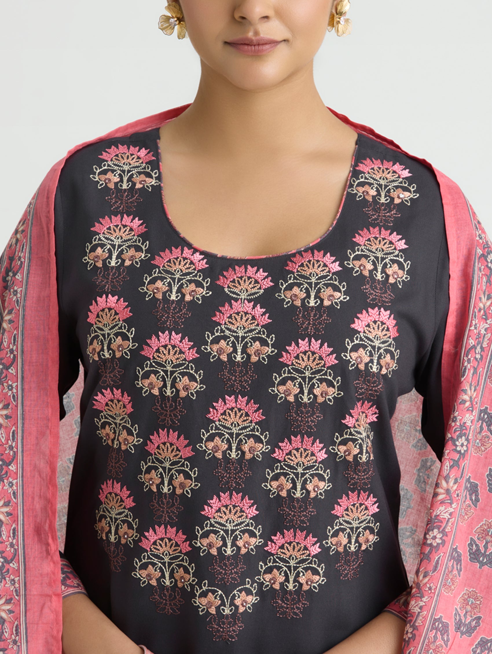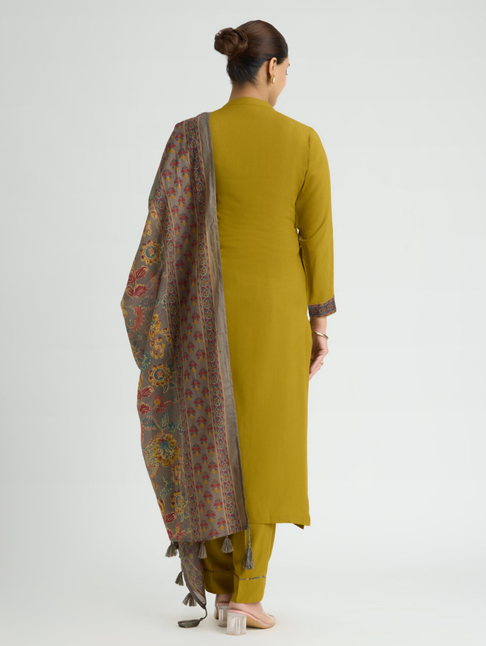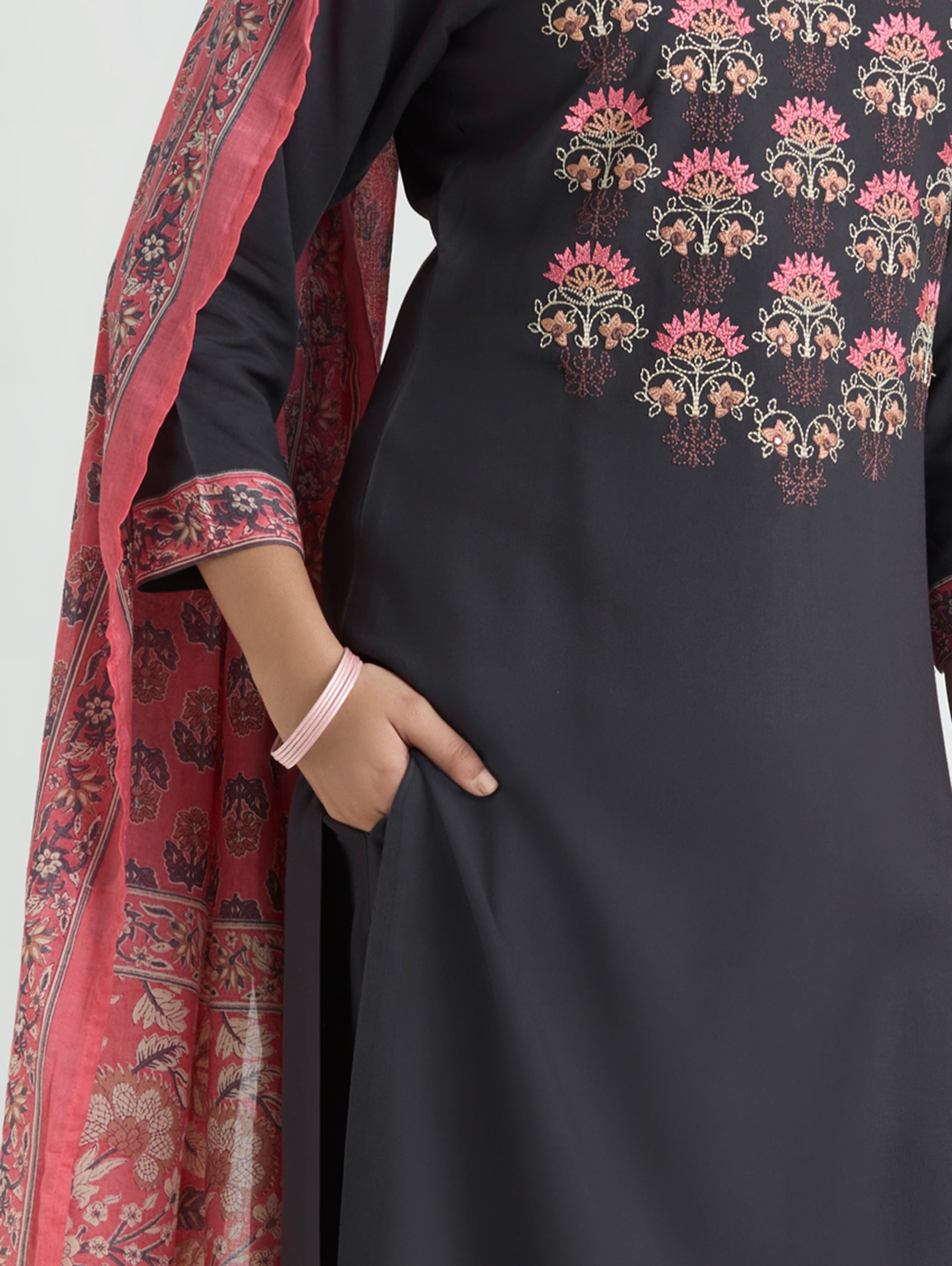 Indulge in luxury and cosiness with our Embroidered Rayon Suit Set, consisting of a chic kurta and perfectly-tailored pants crafted from Liva-Certified Viscose Rayon material, paired with a breathtaking printed dupatta in soft mul fabric. The kurta boasts exquisite embroidery, elevating its elegance to new heights.
