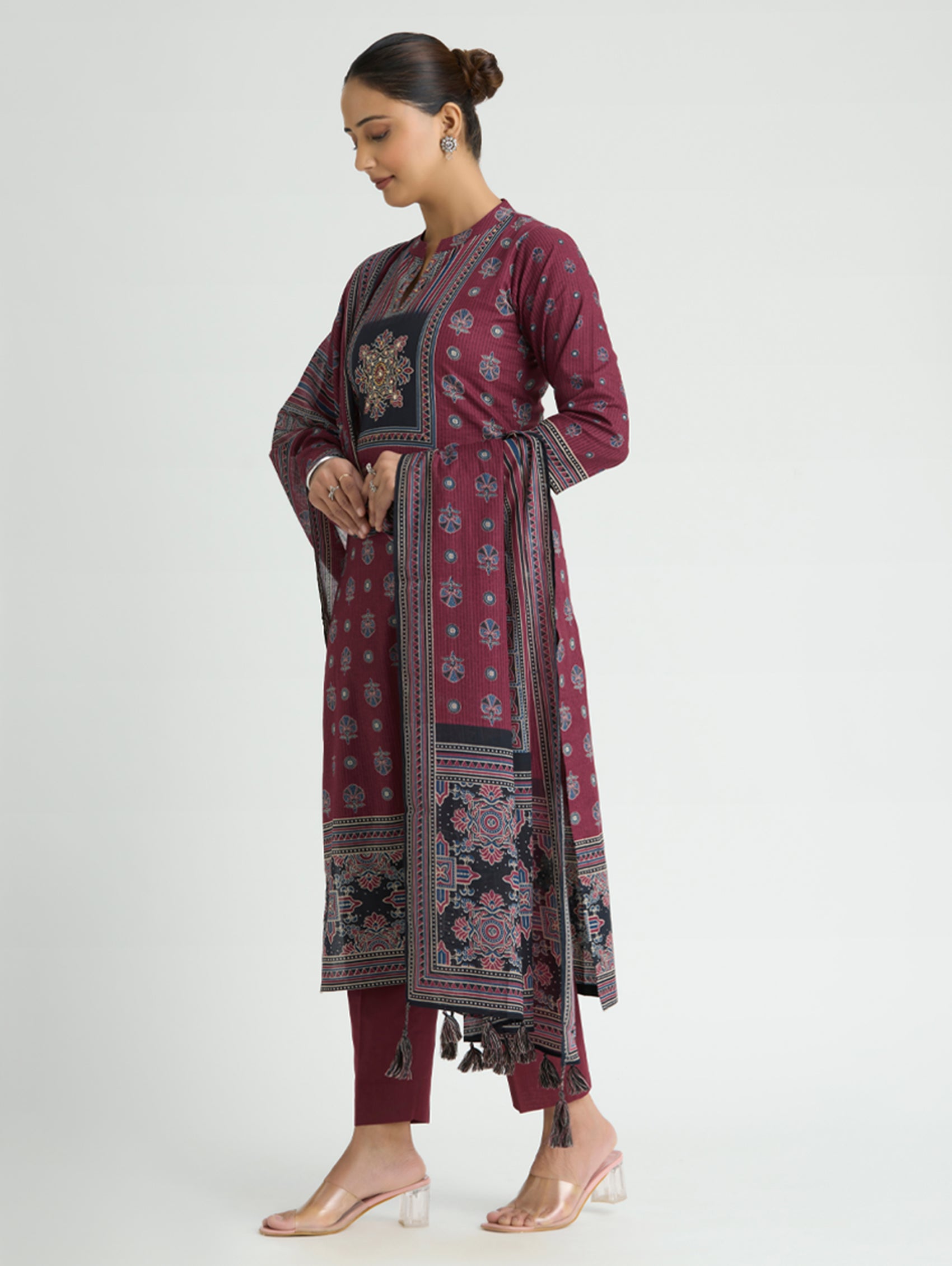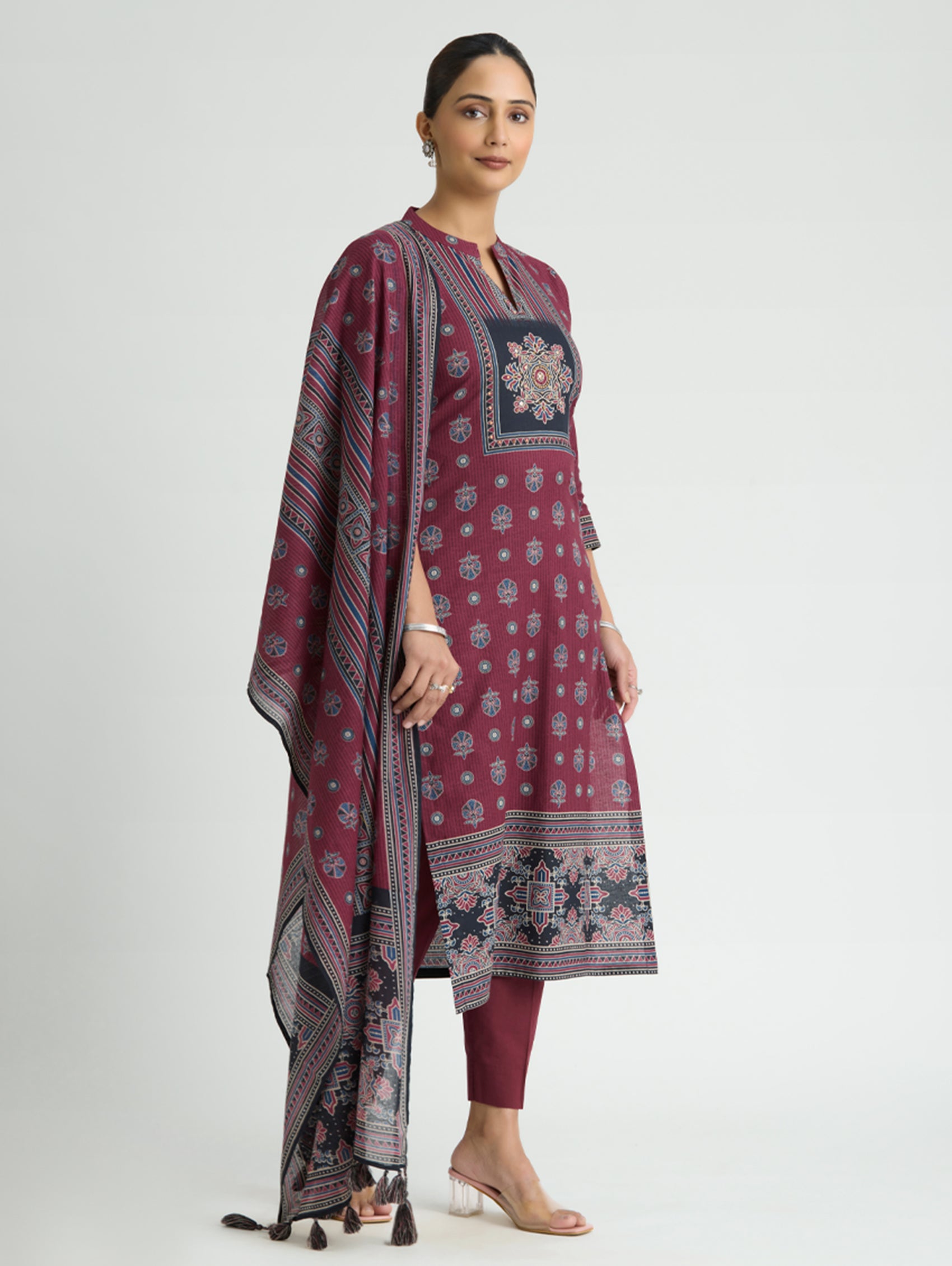 Wine Berry Embellished Print Pure Cotton Suit Set with Dupatta