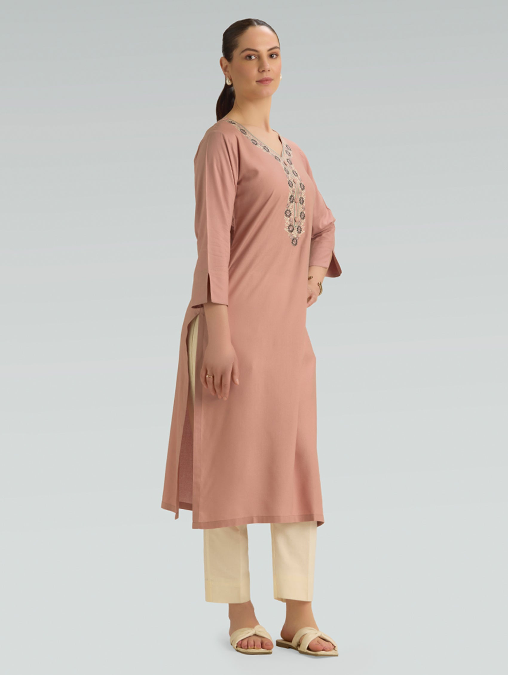 • Kurta with notched round neckline, three-fourth sleeves, and side slits open.