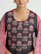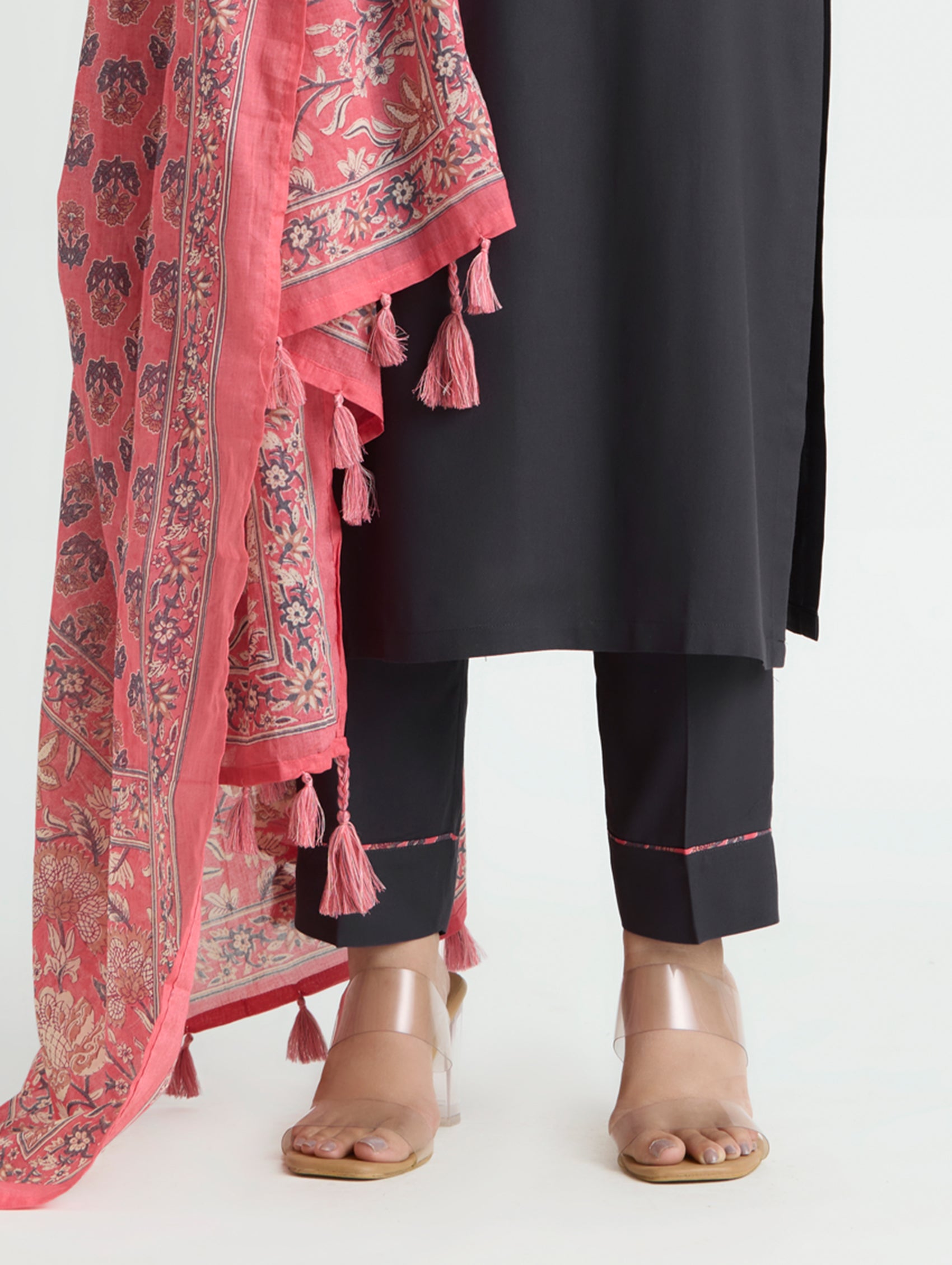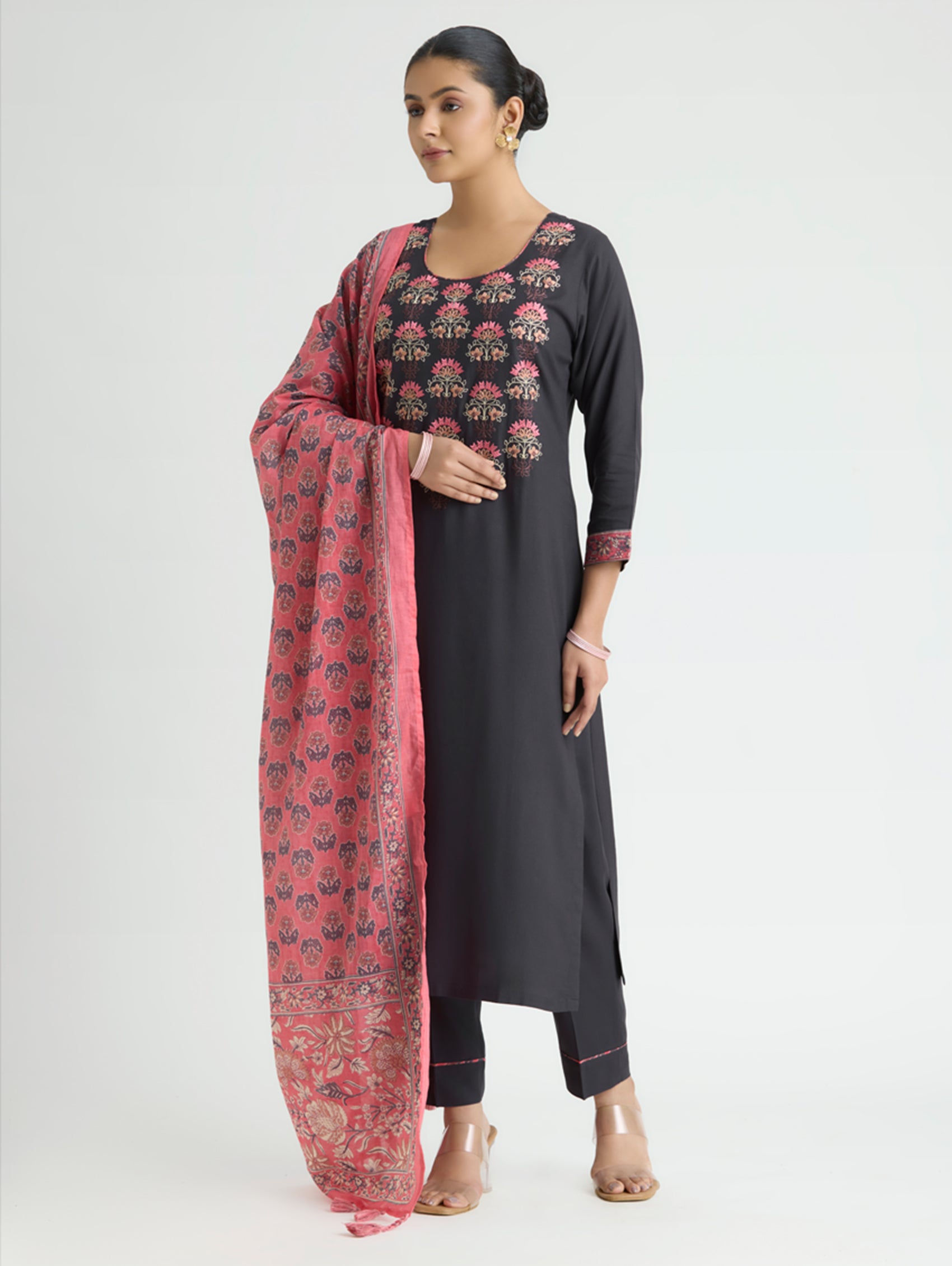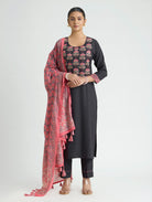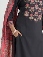 Dark Grey Embroidered Viscose Rayon Suit Set with Dupatta