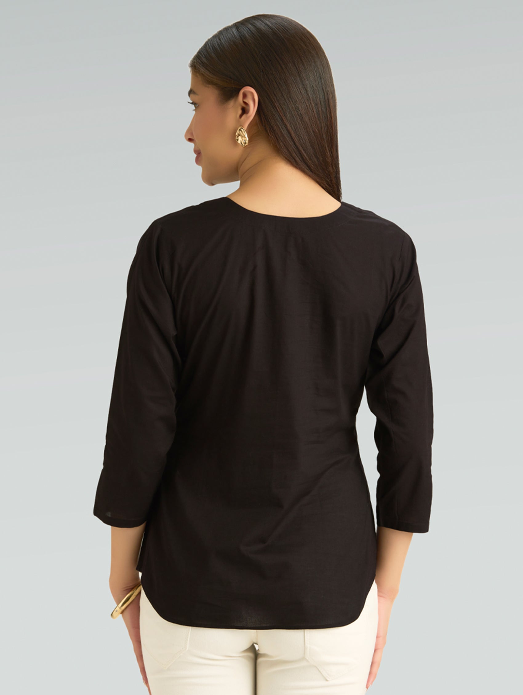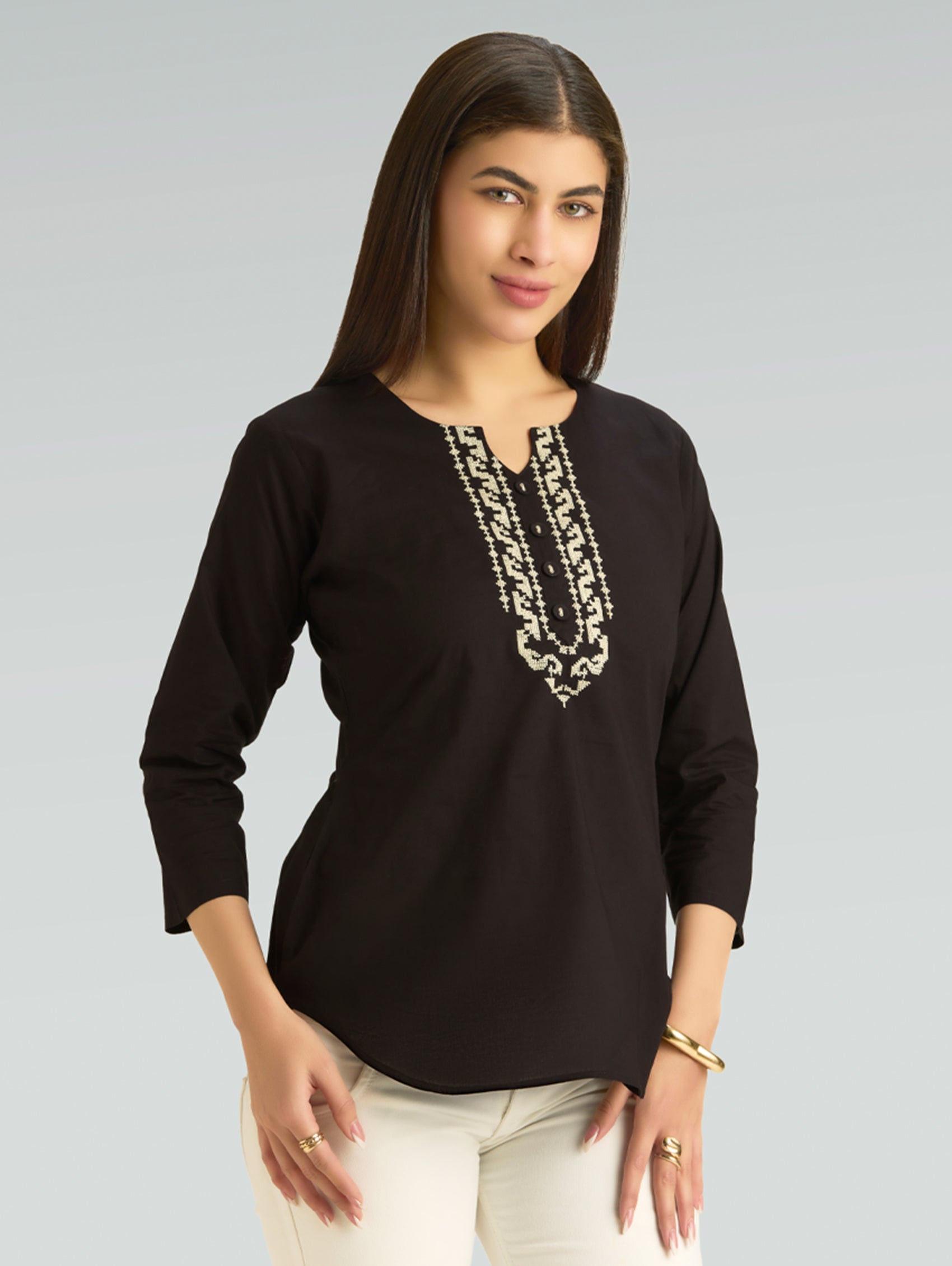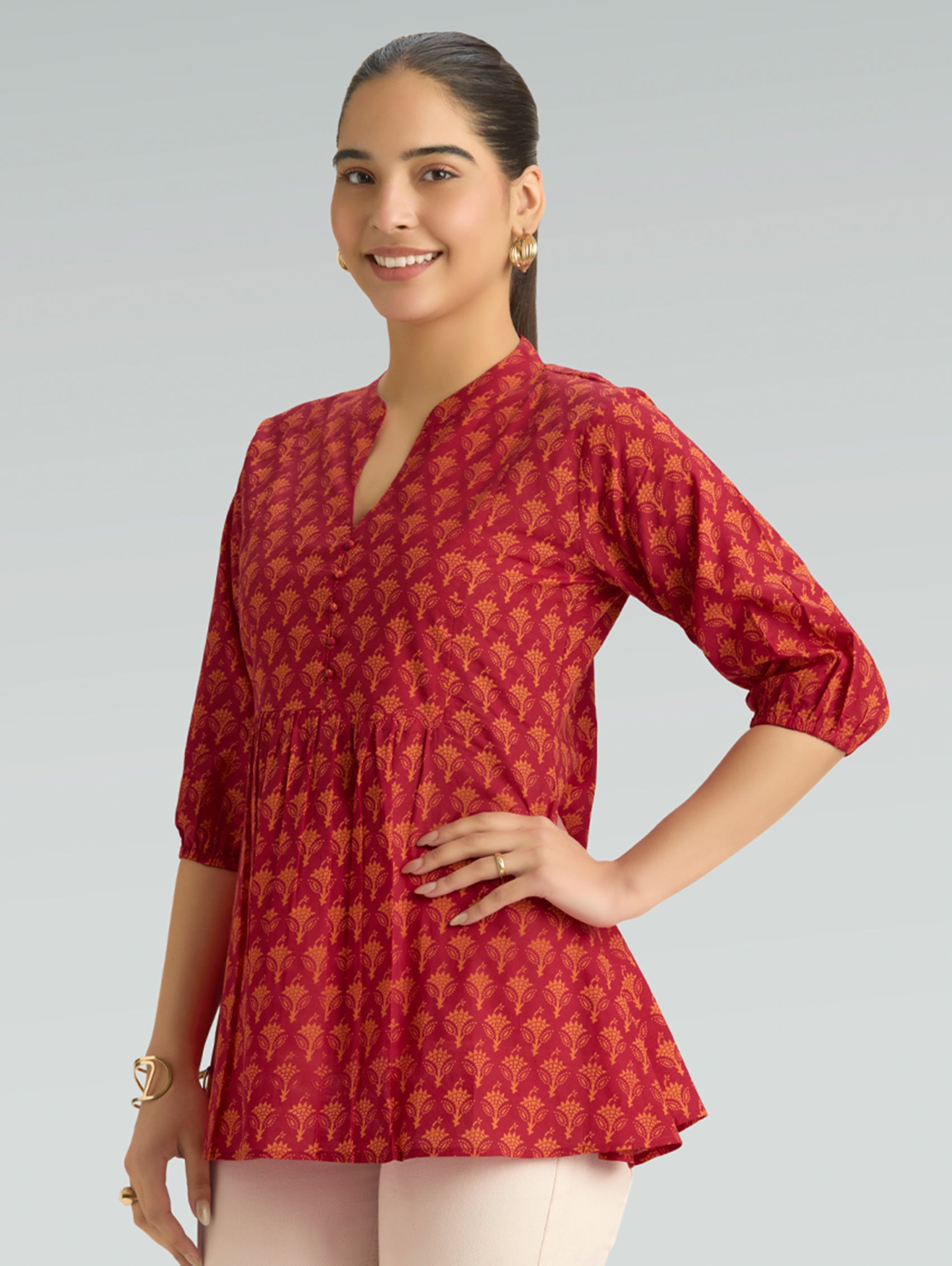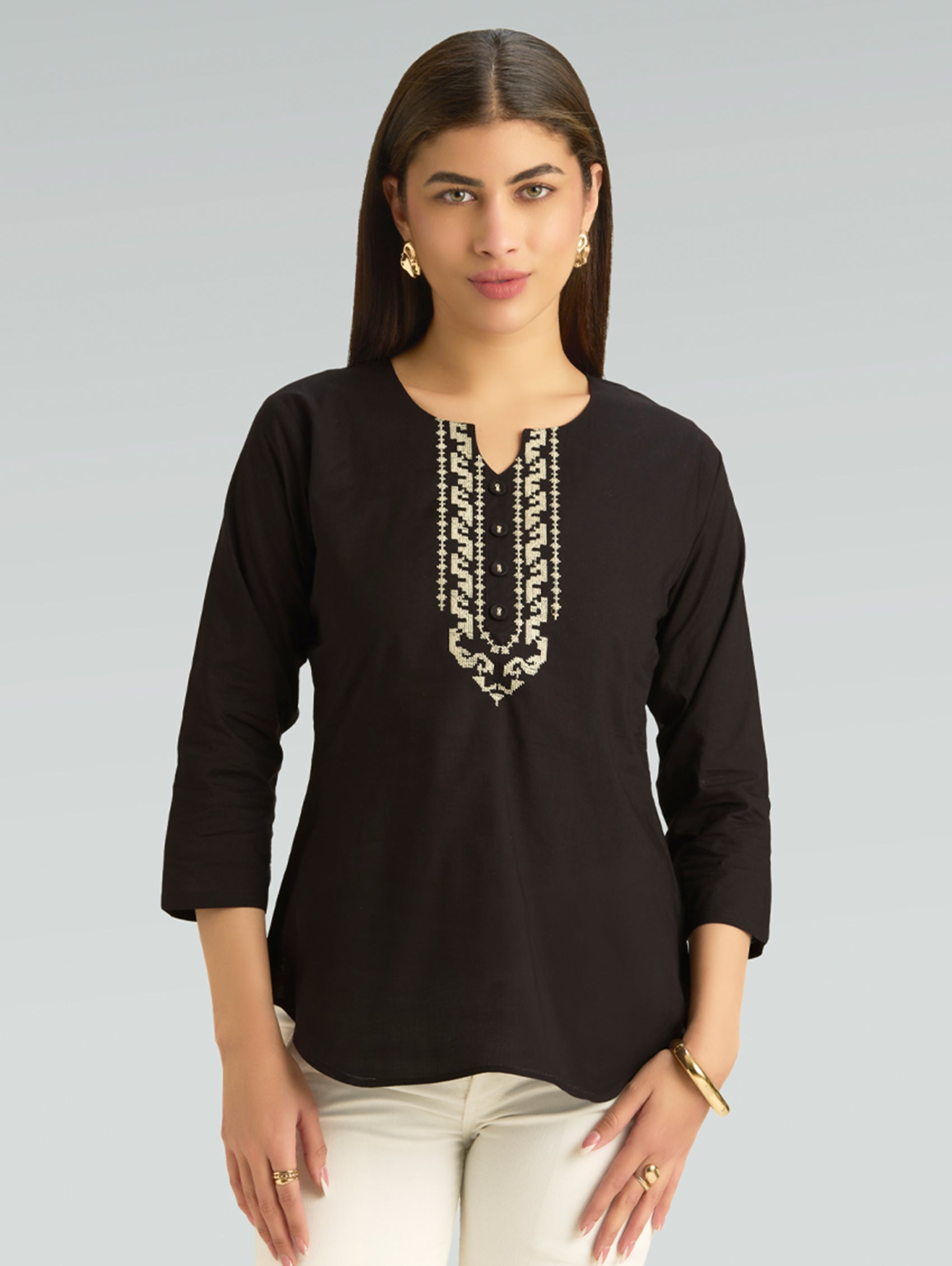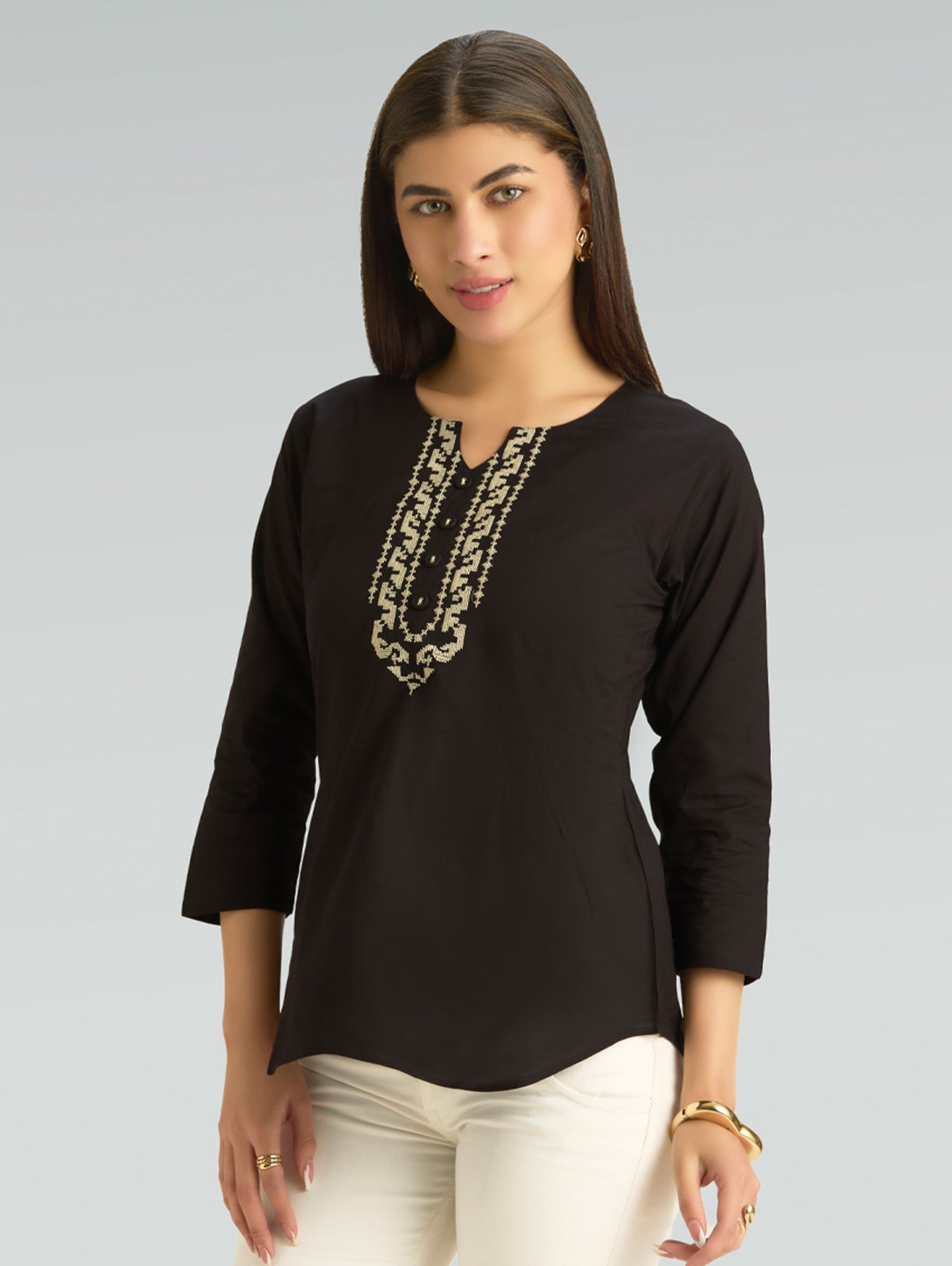 • Short Kurti with V-neckline, three-fourth sleeves, and side slits open