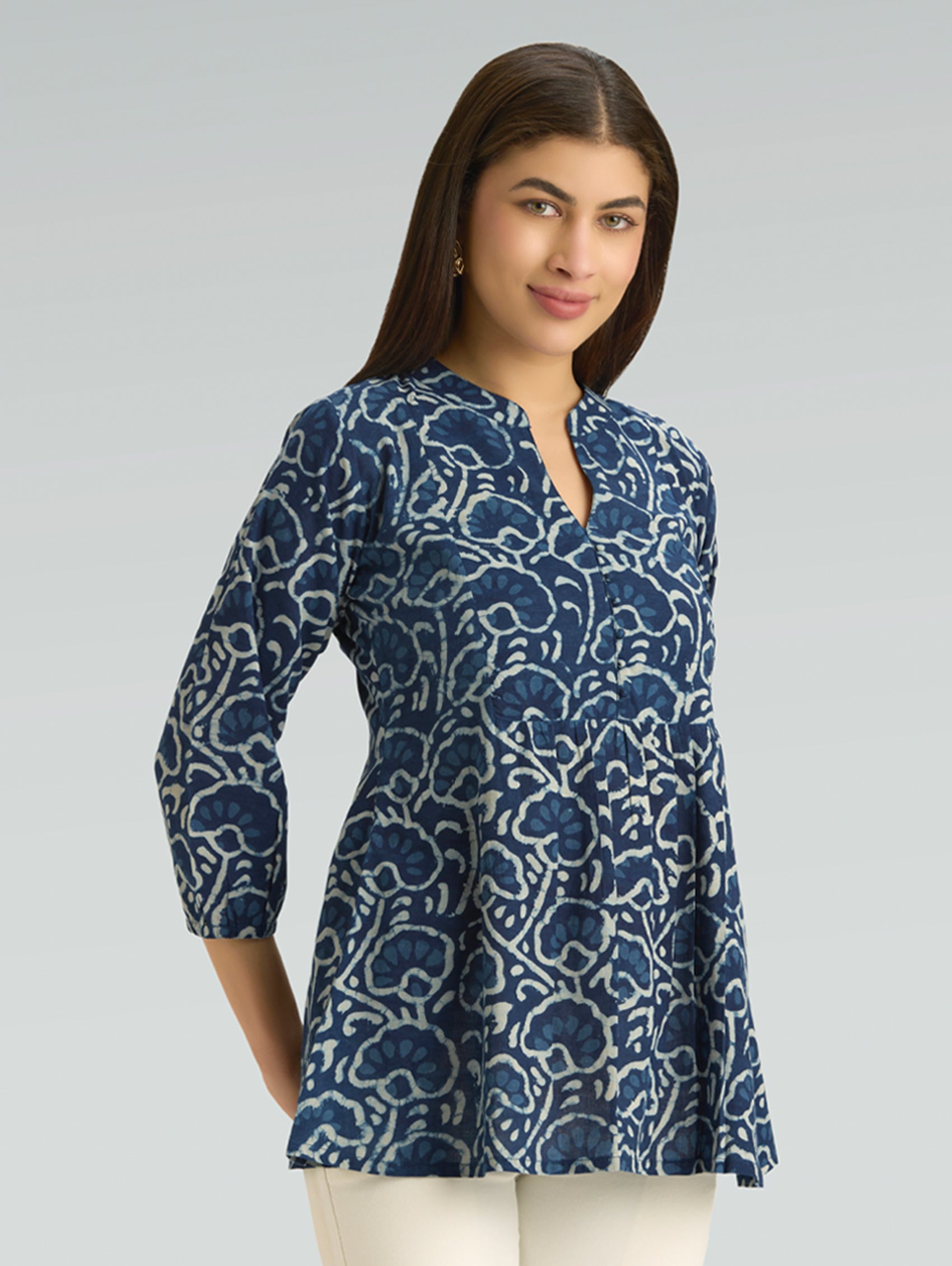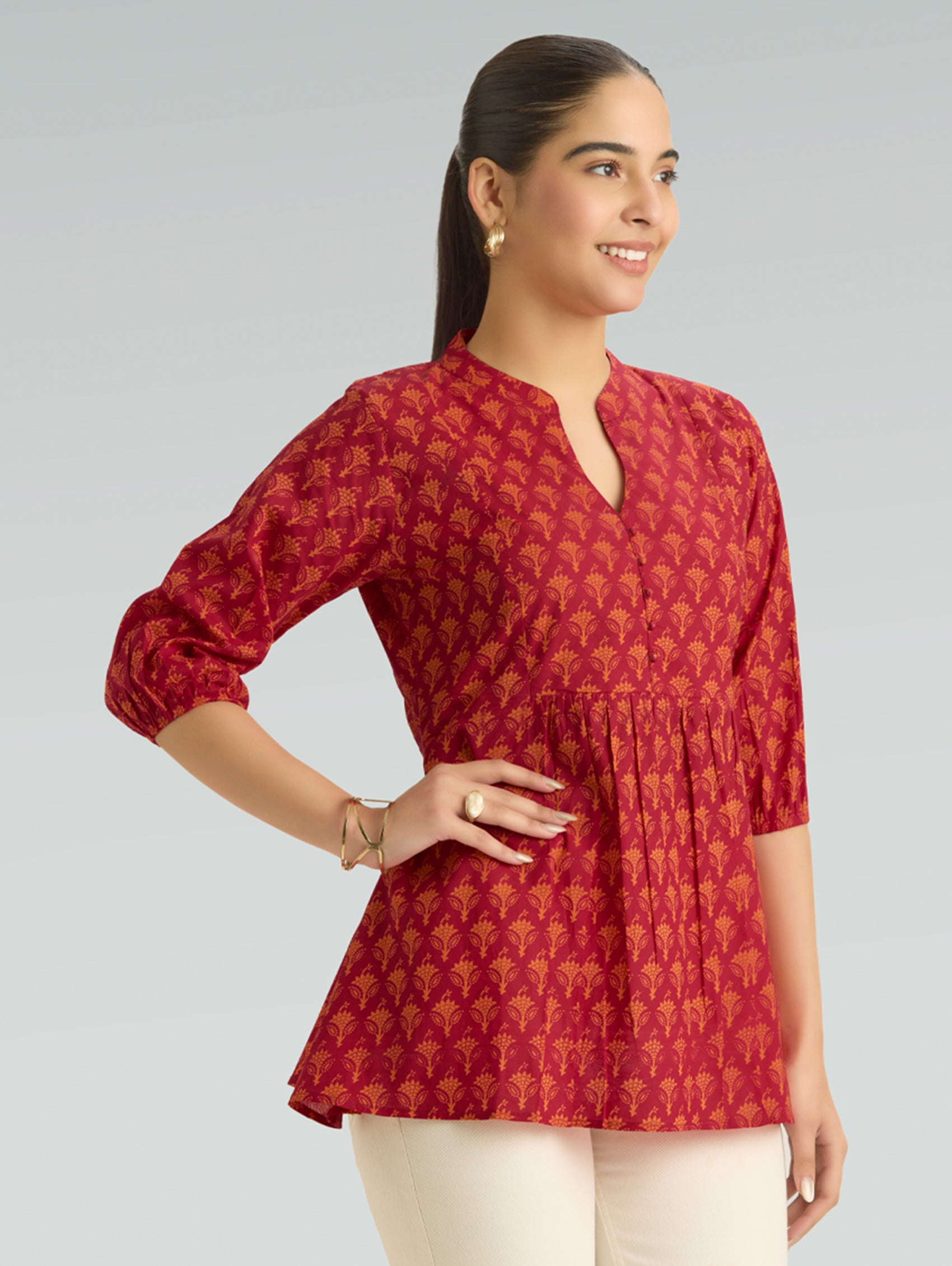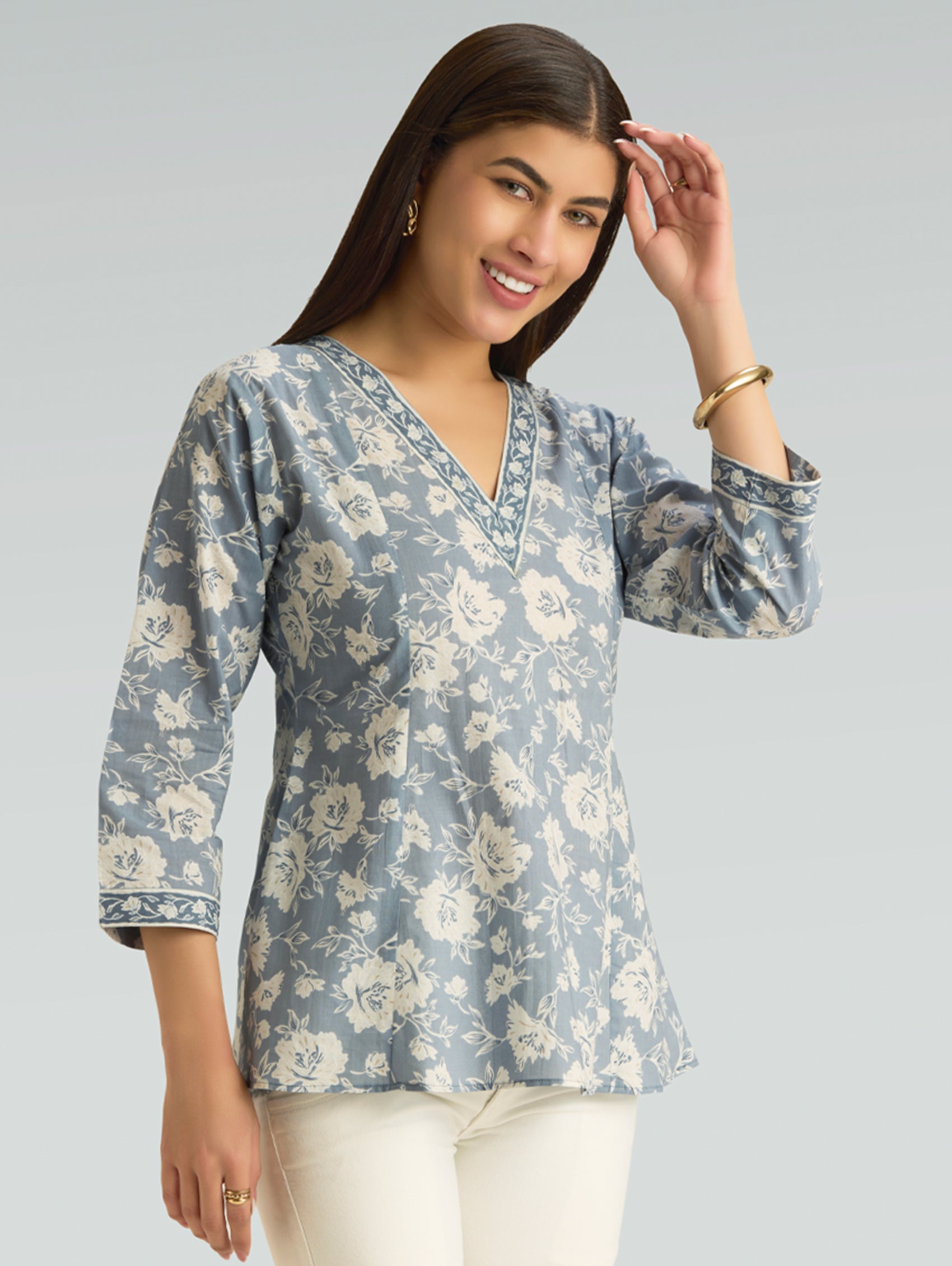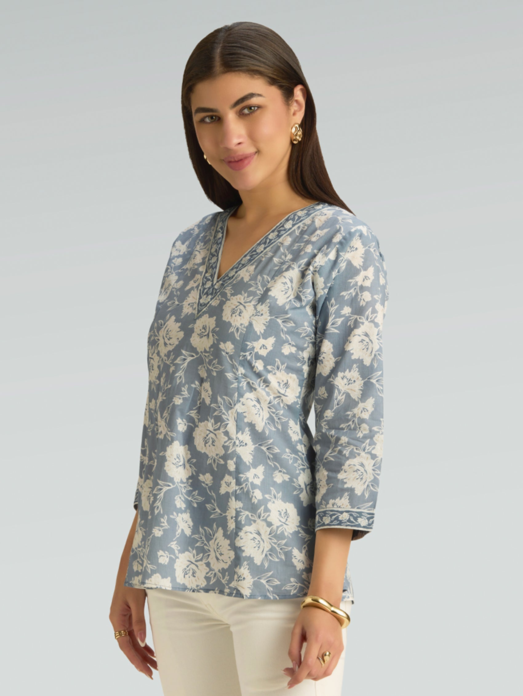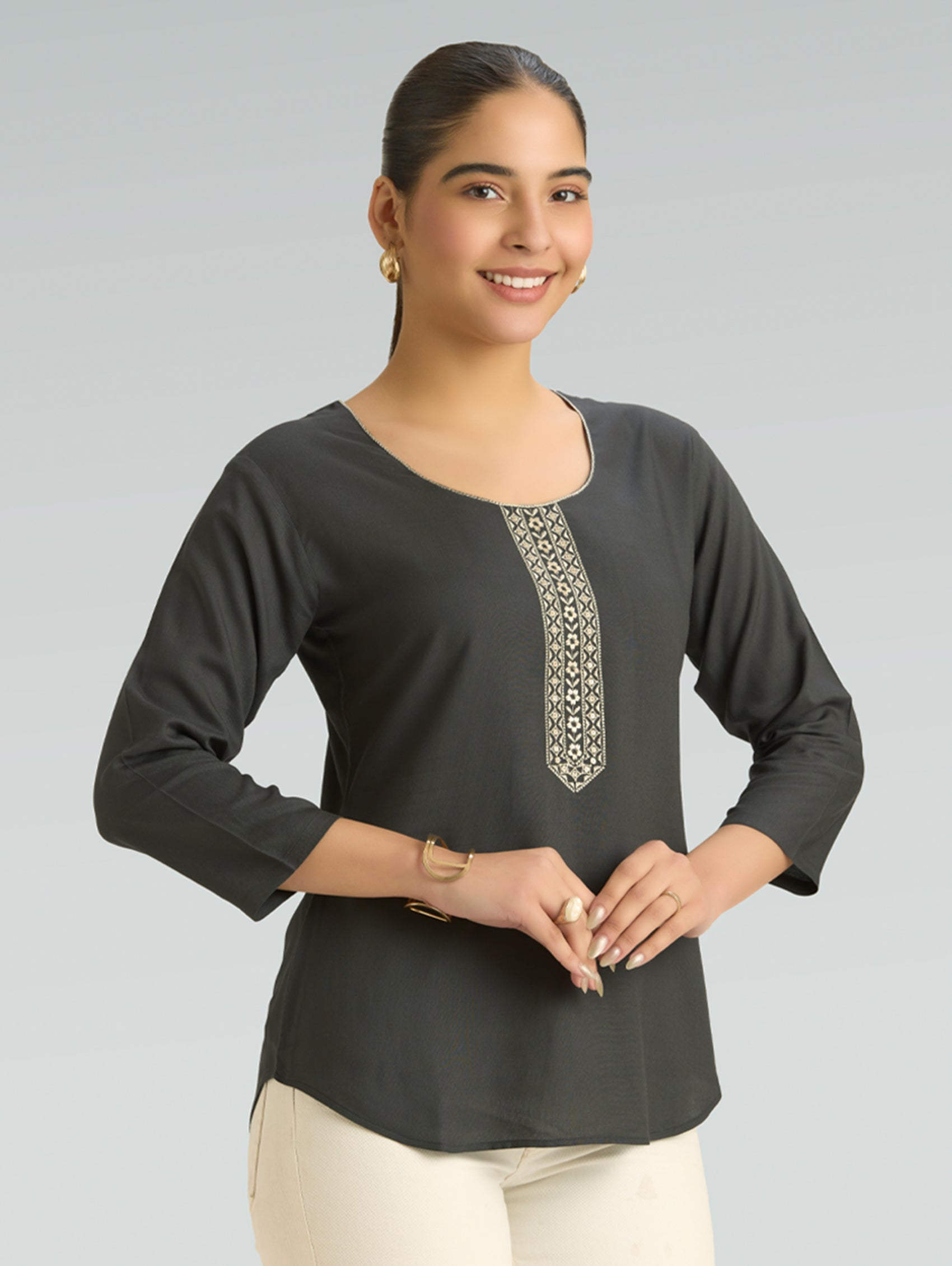 • Short Kurti with V-neckline, three-fourth sleeves, and side slits open