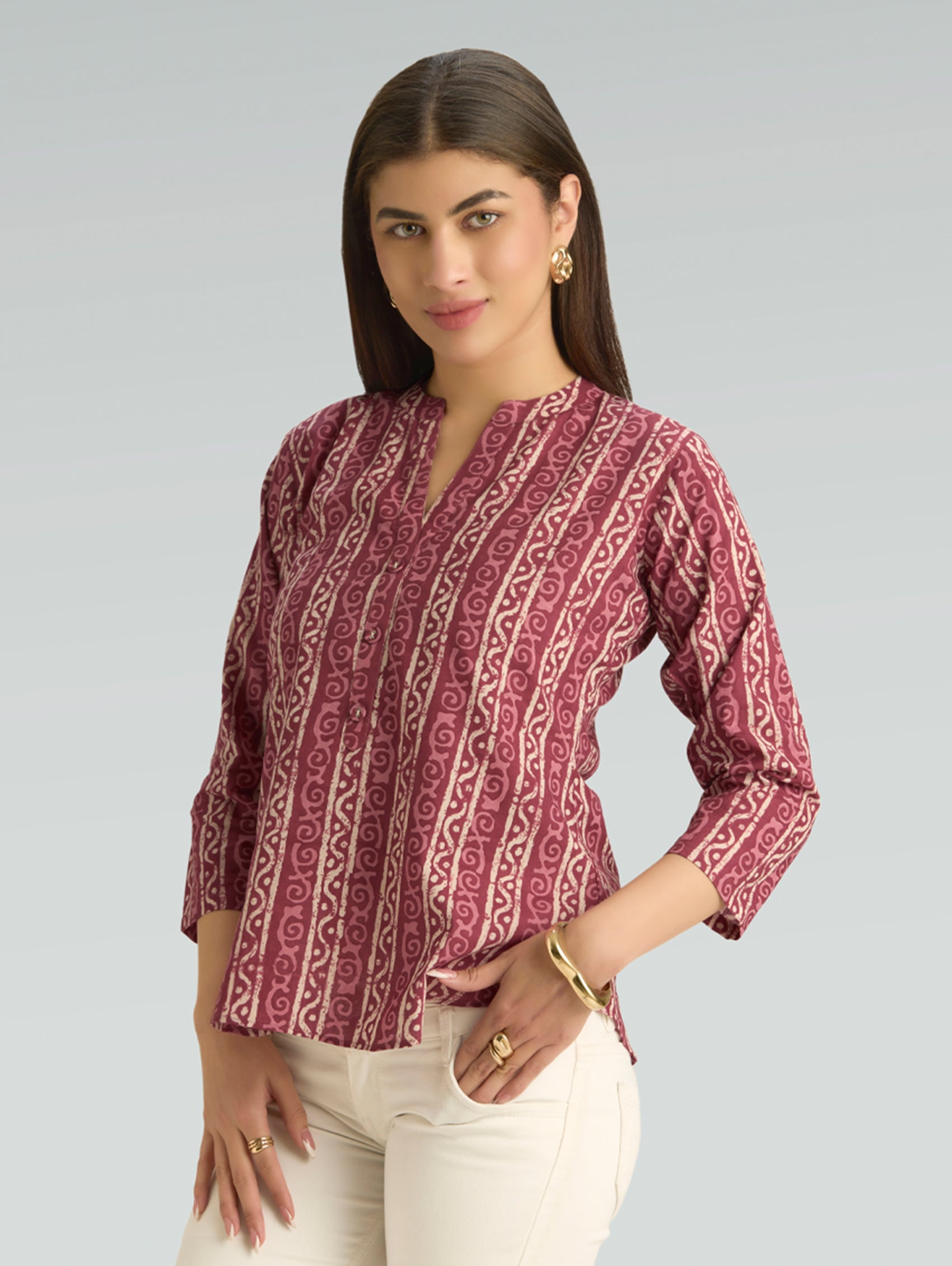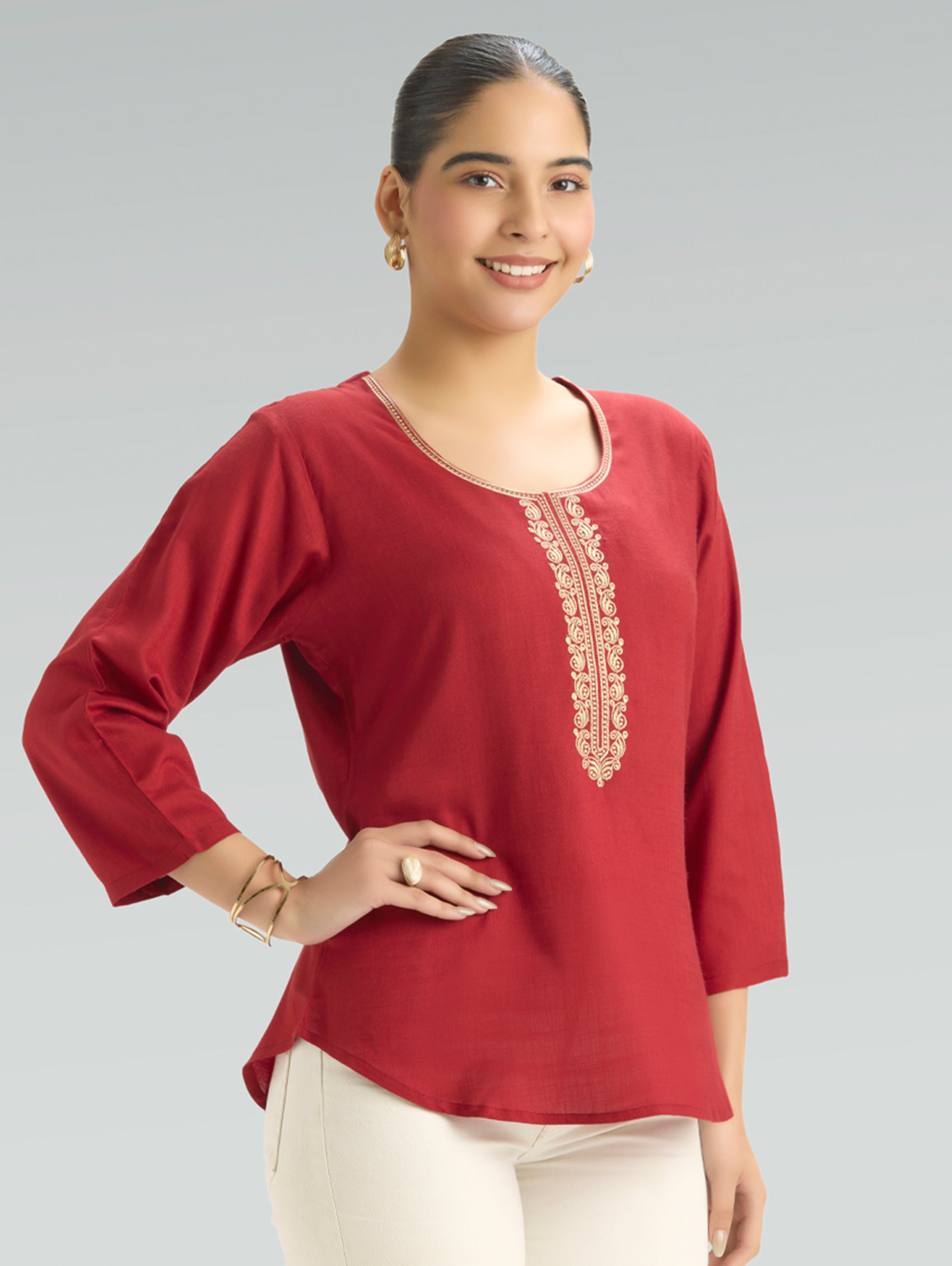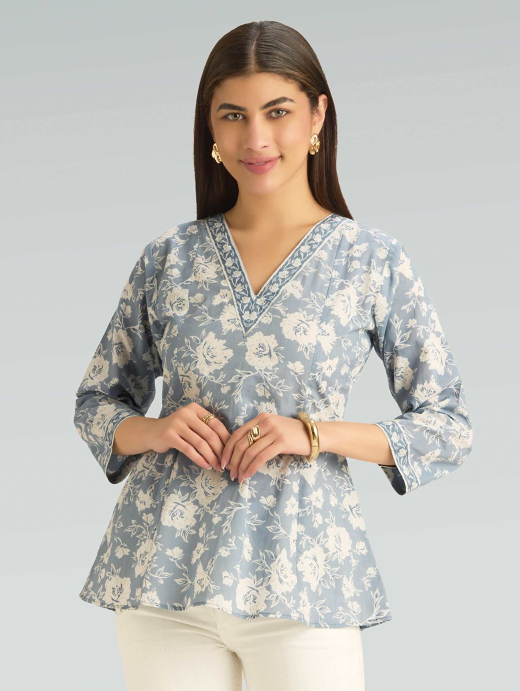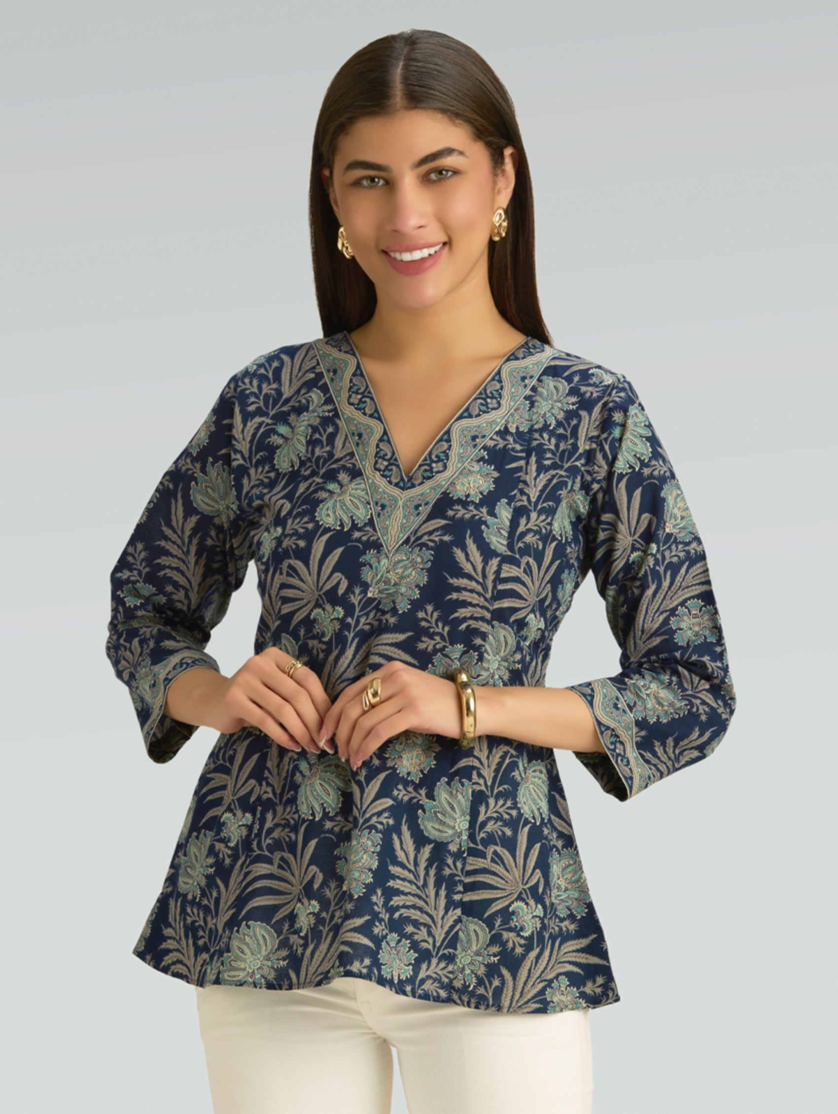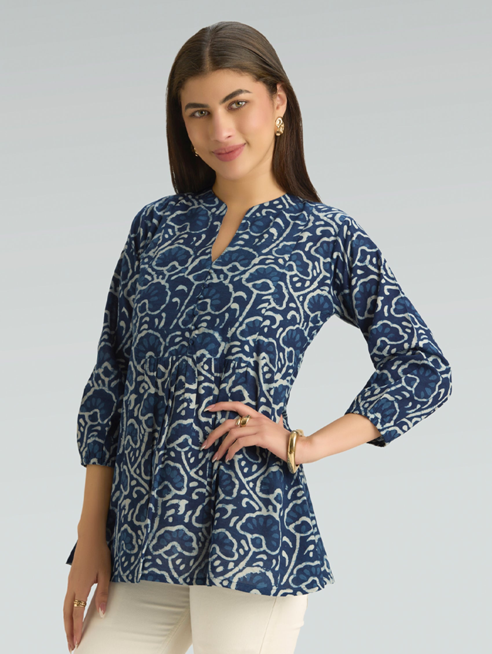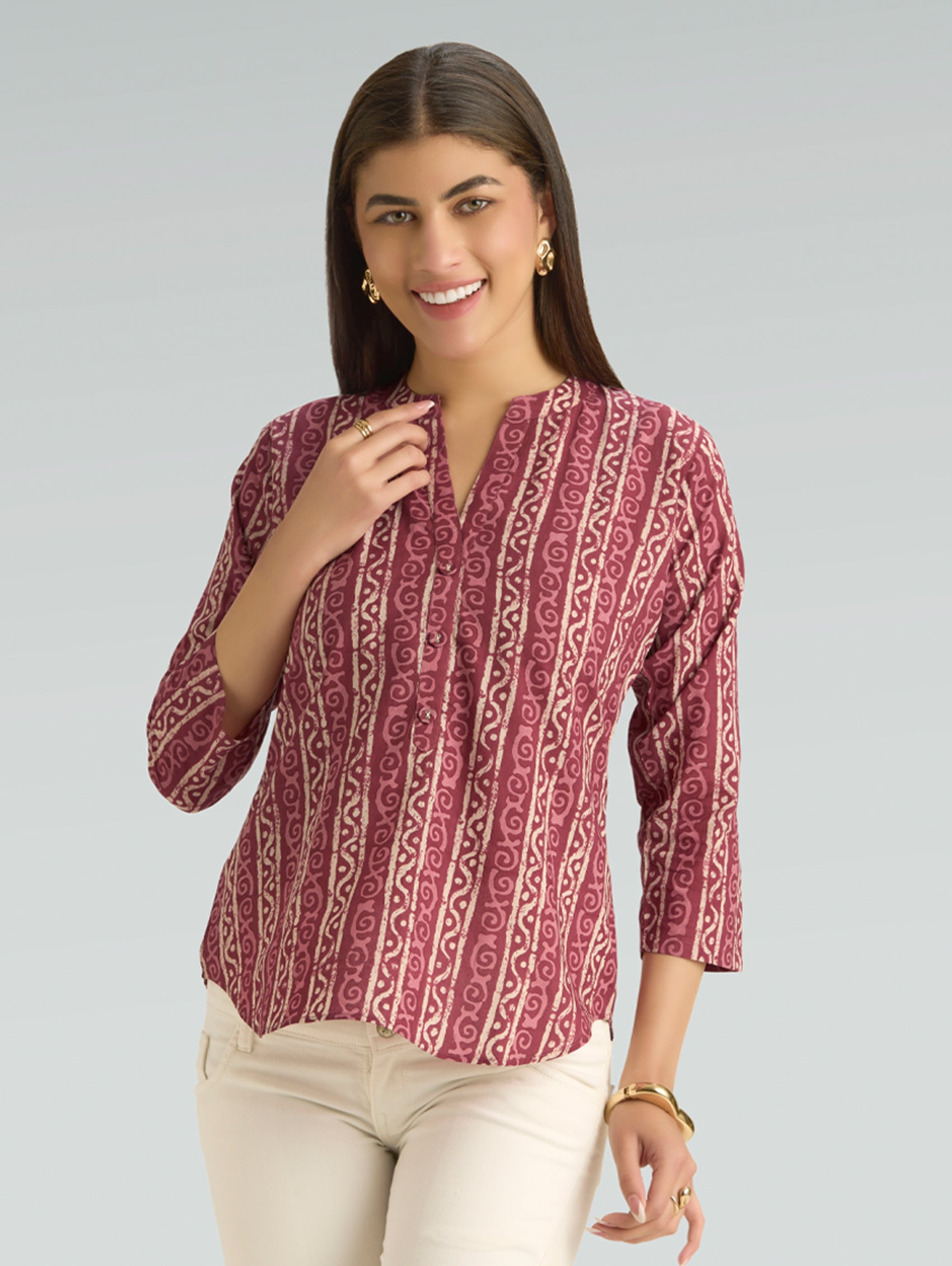 • Short Kurti with V-neckline, three-fourth sleeves, and side slits open