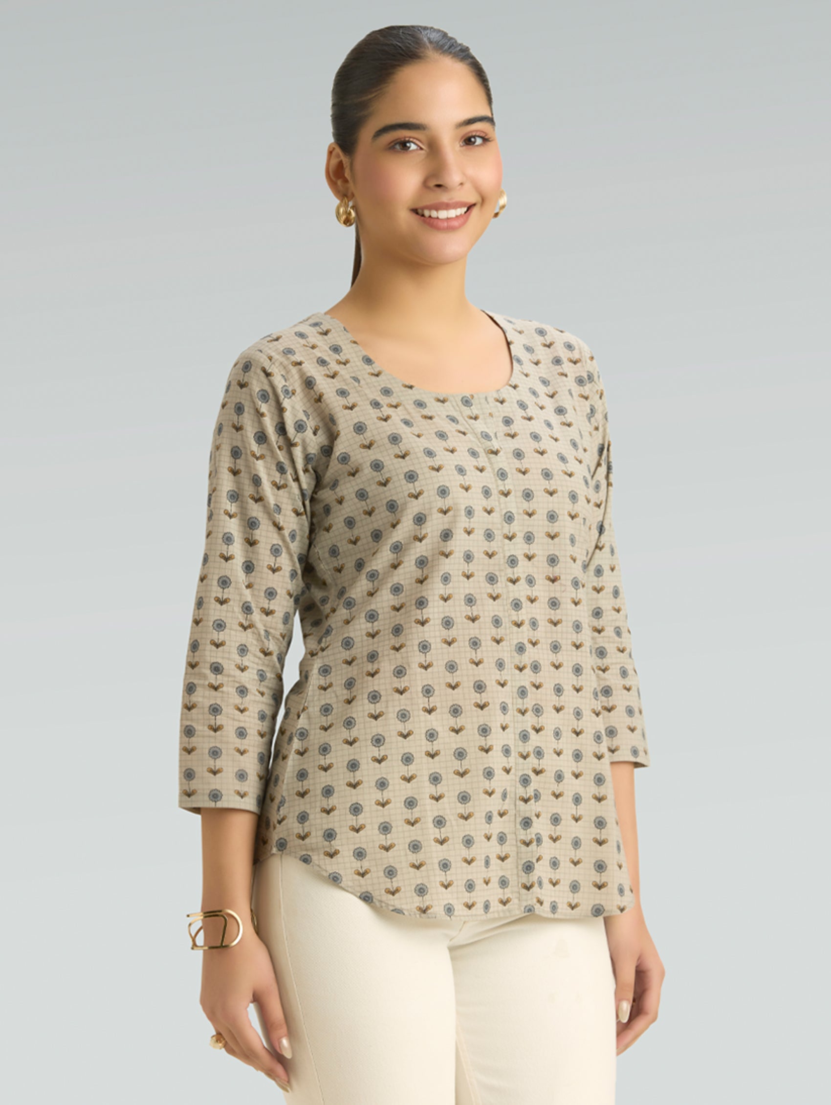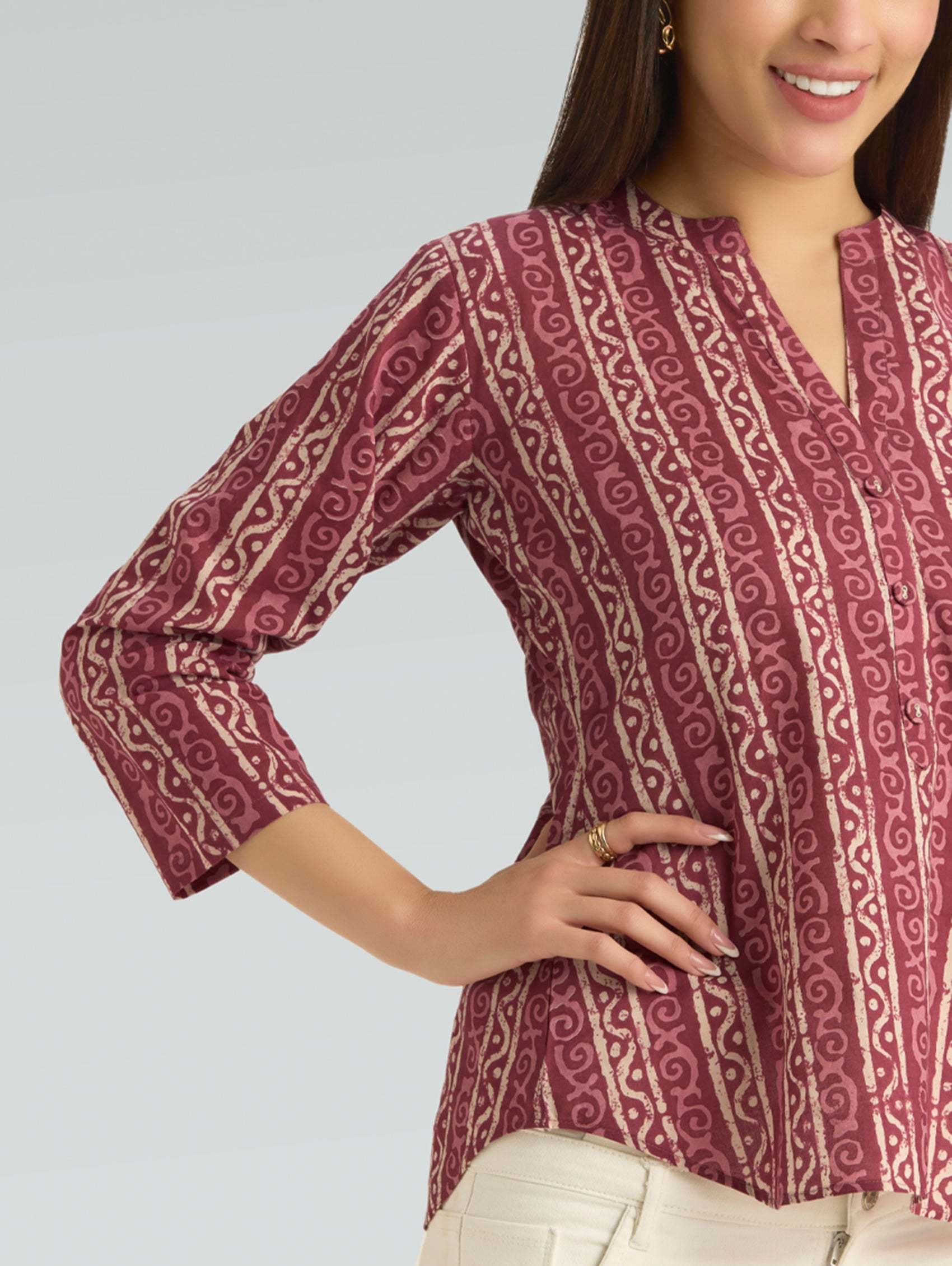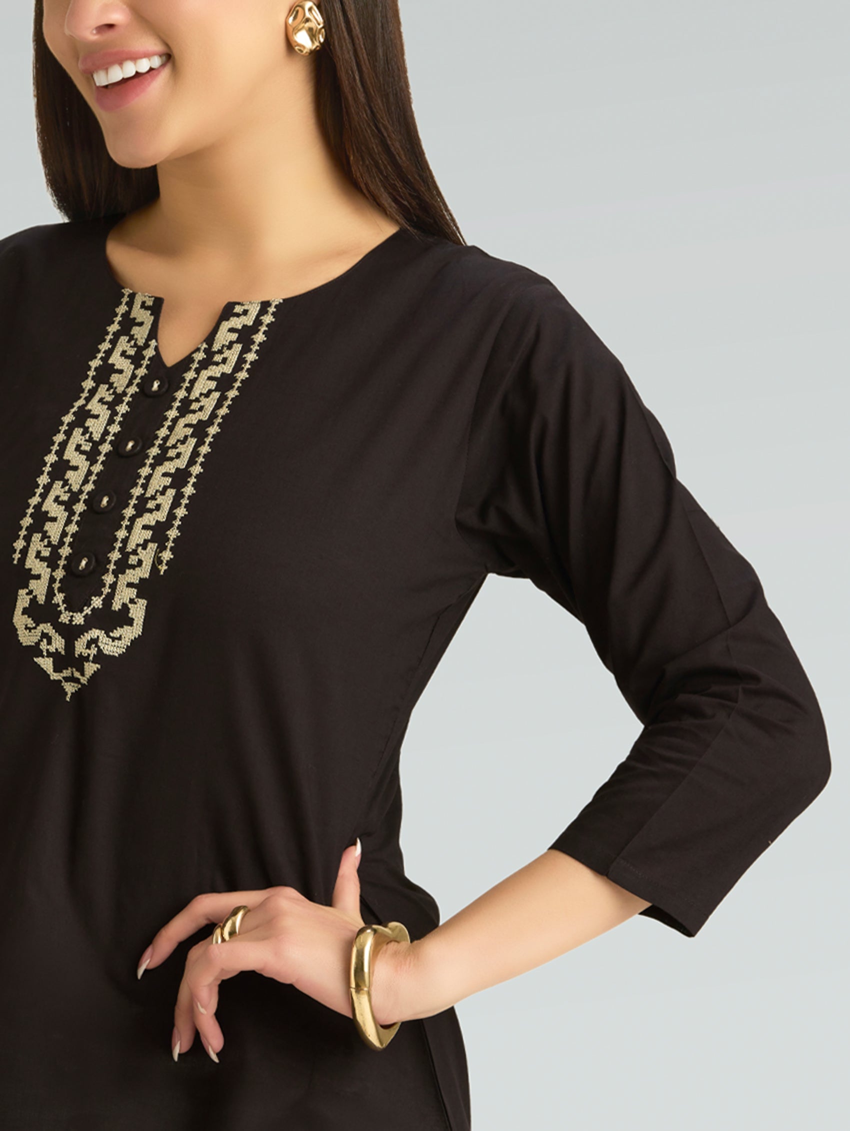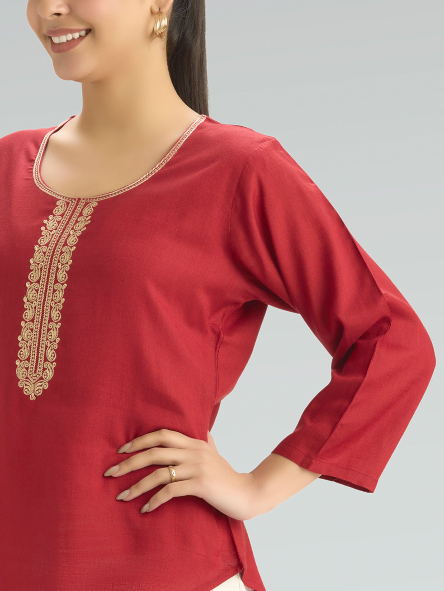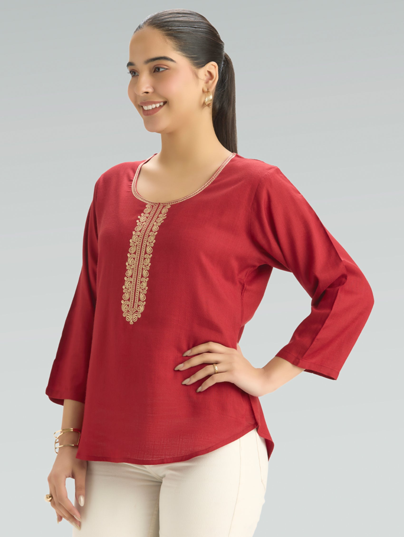 • Short Kurti with V-neckline, three-fourth sleeves, and side slits open