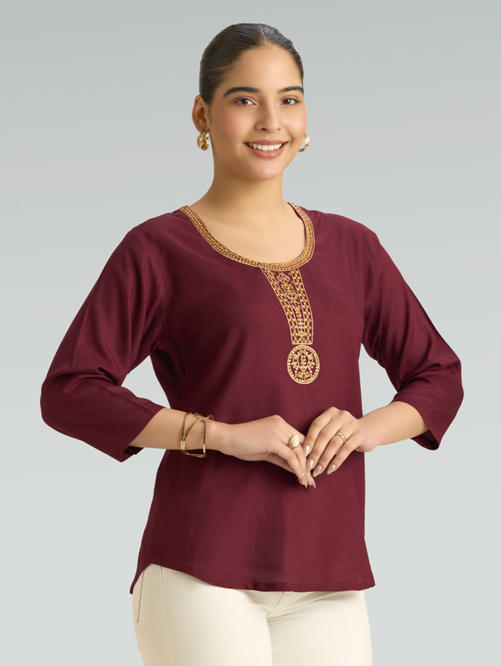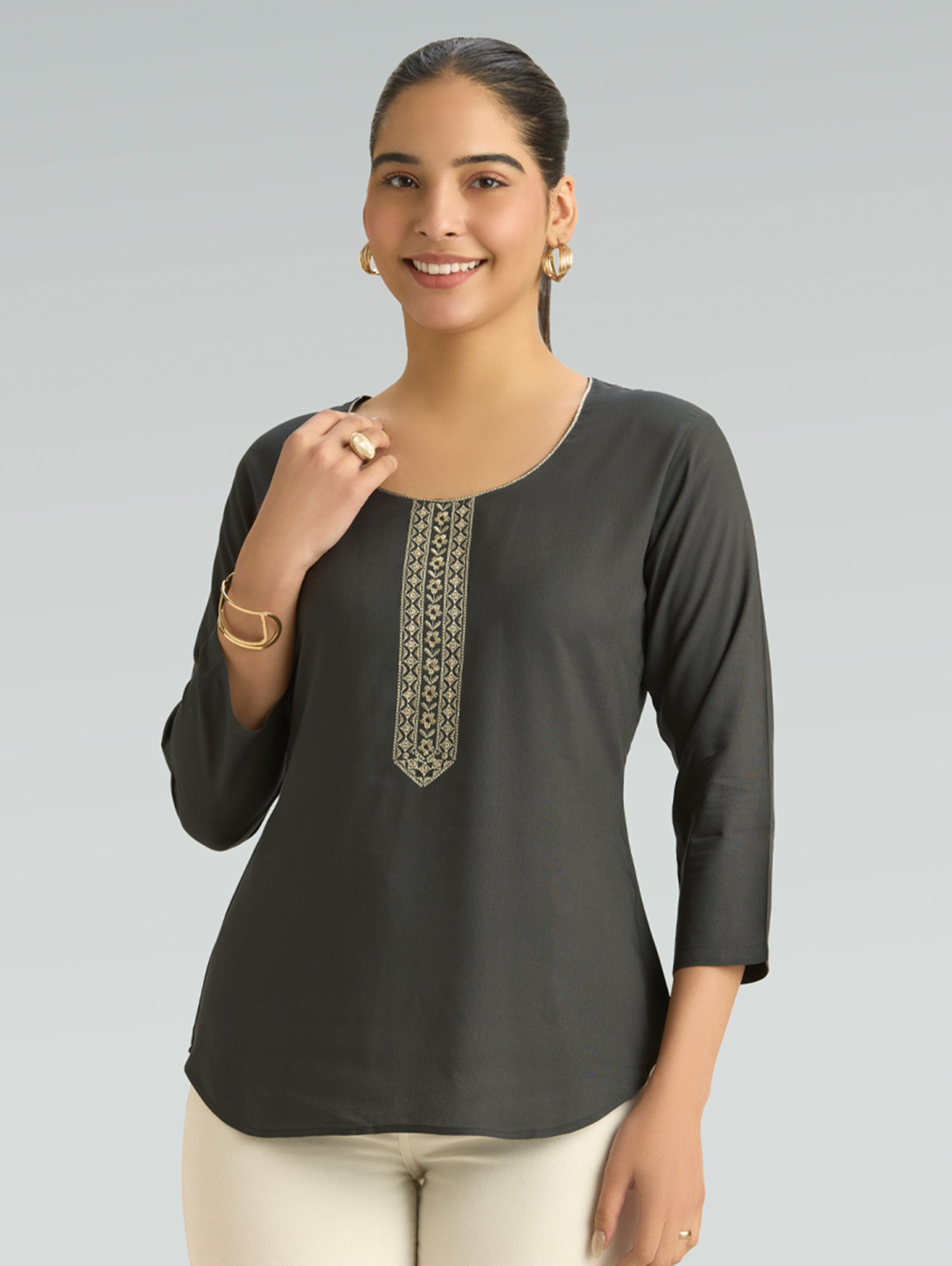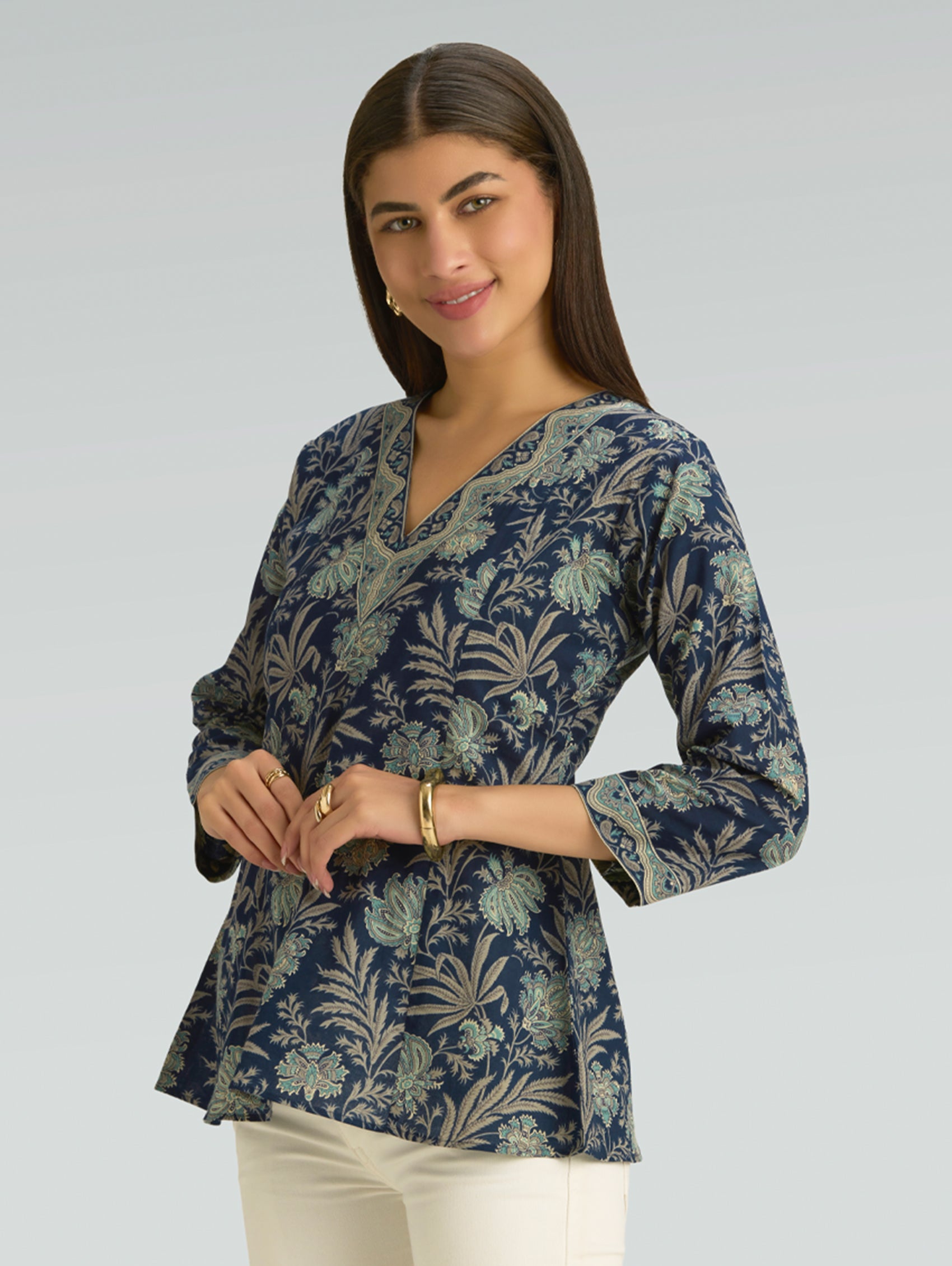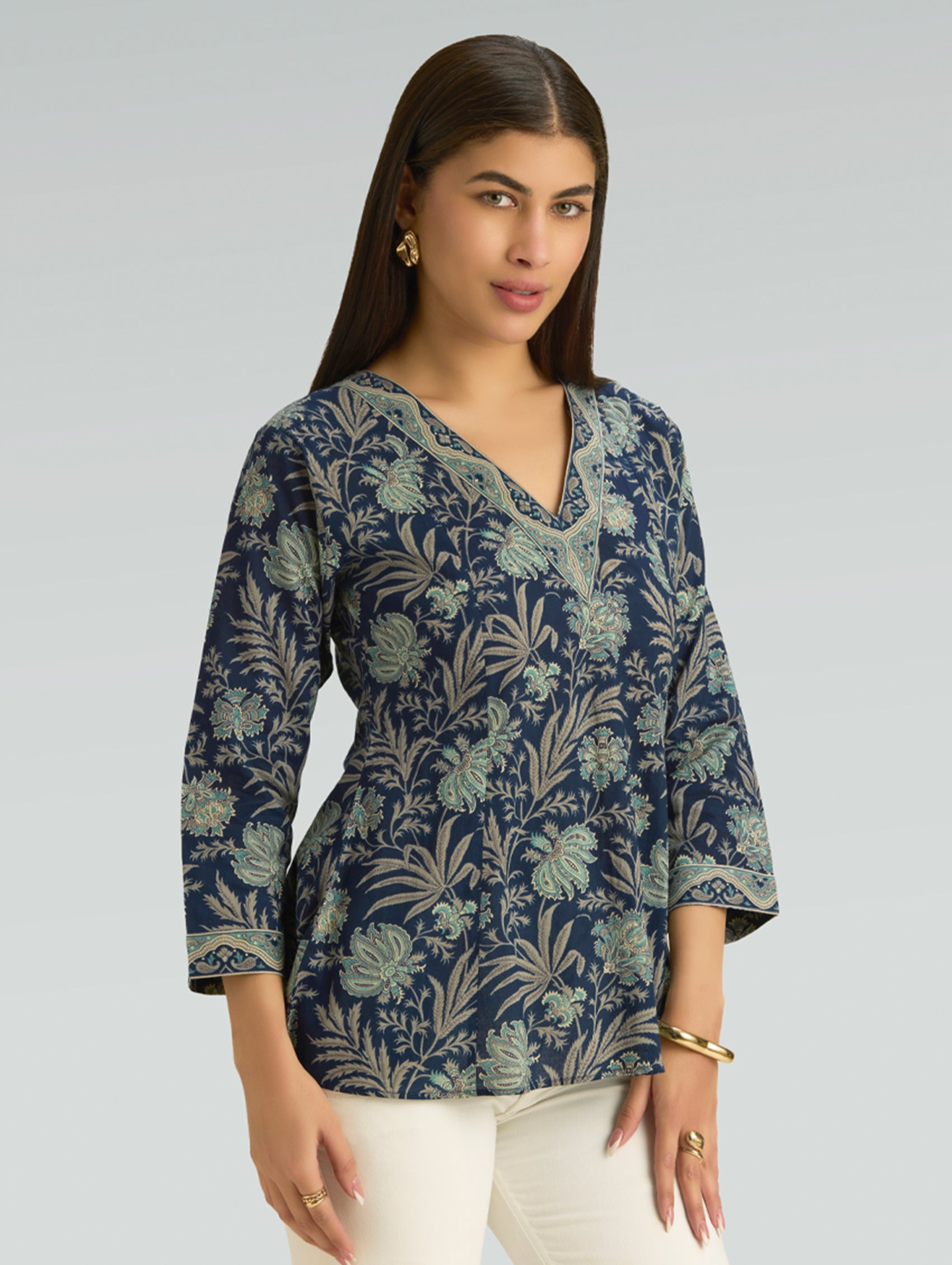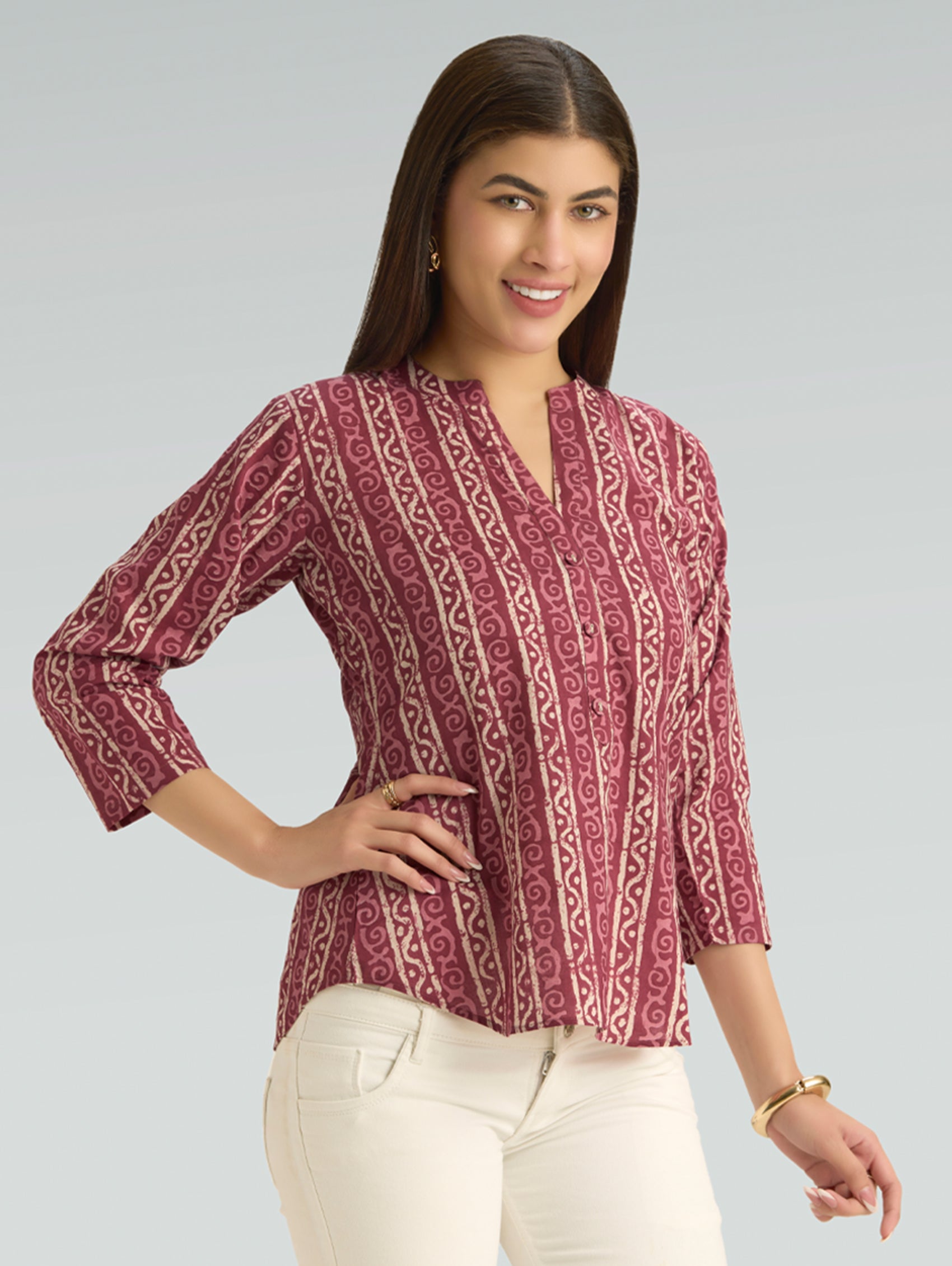 • Short Kurti with V-neckline, three-fourth sleeves, and side slits open