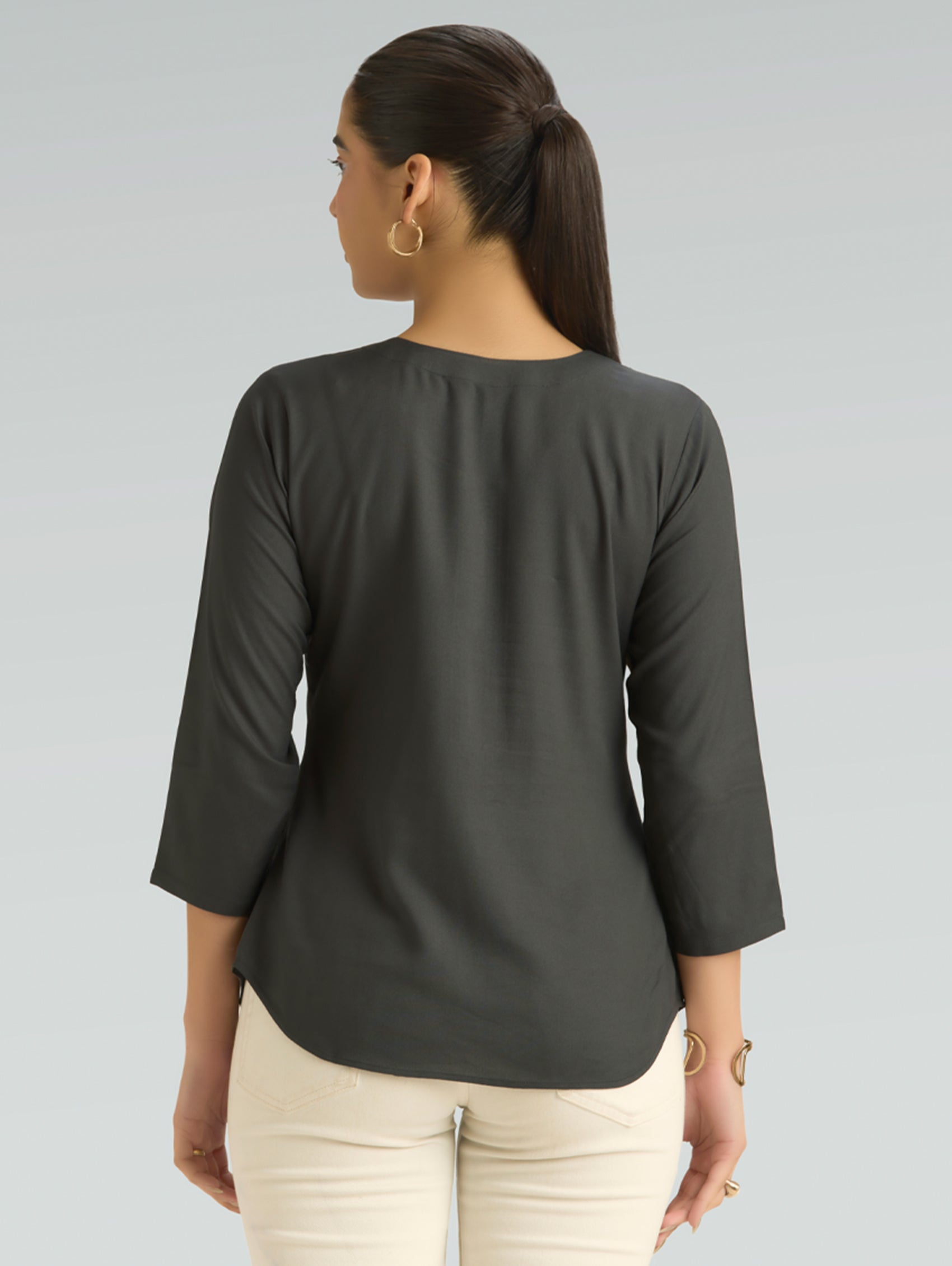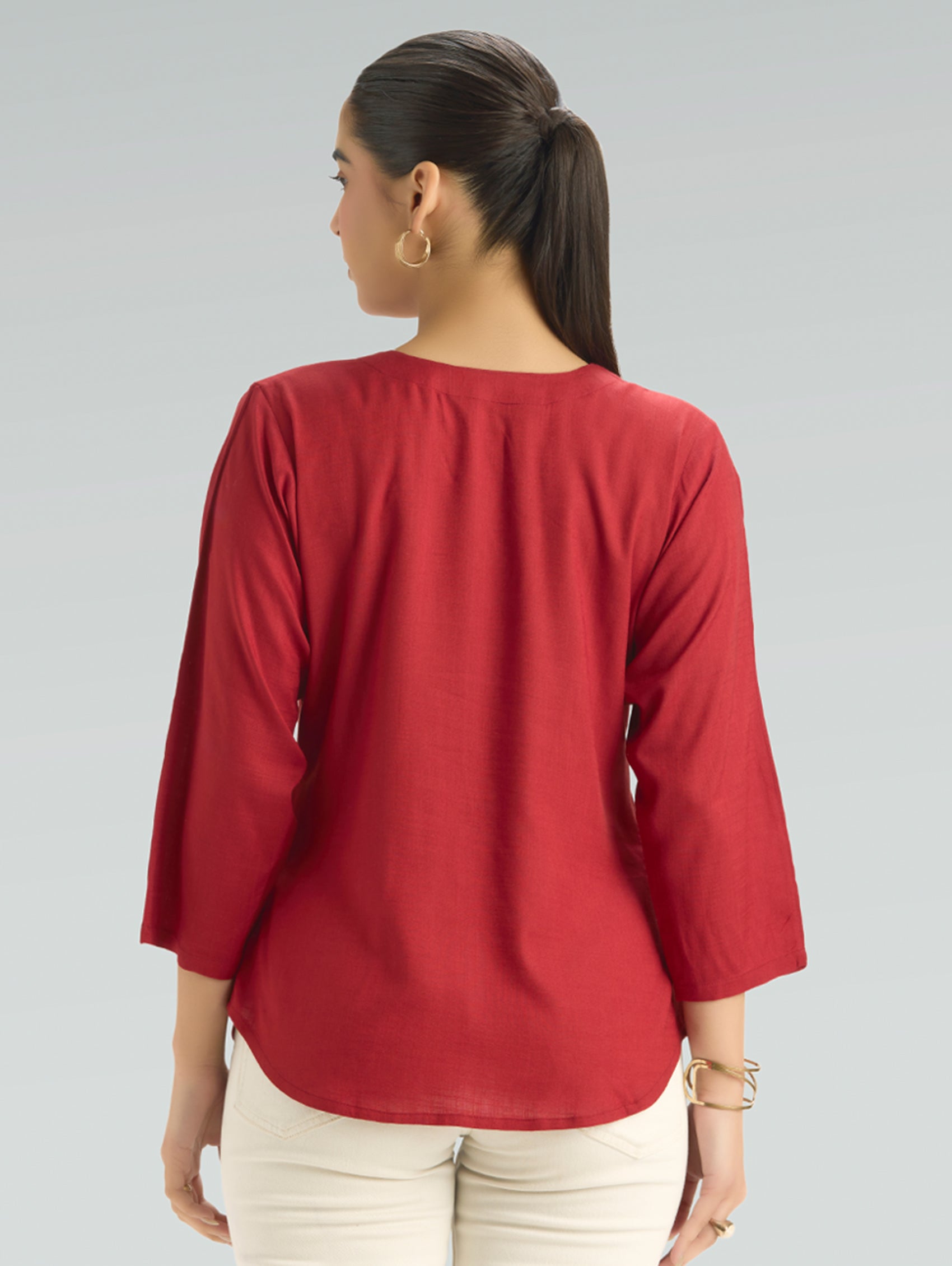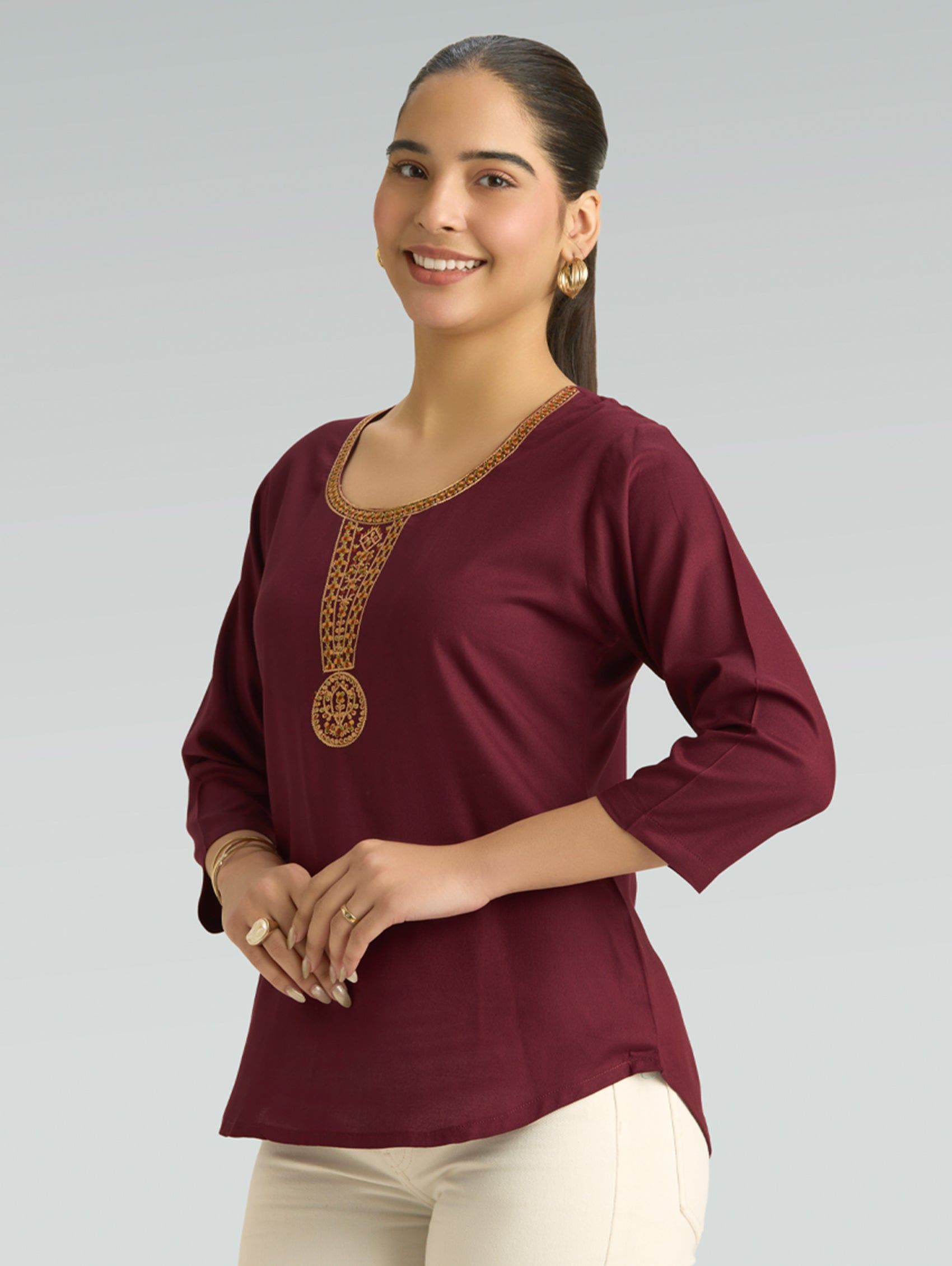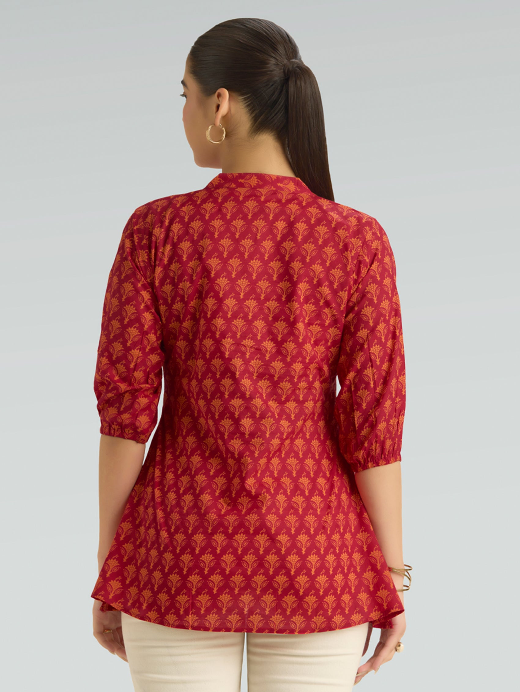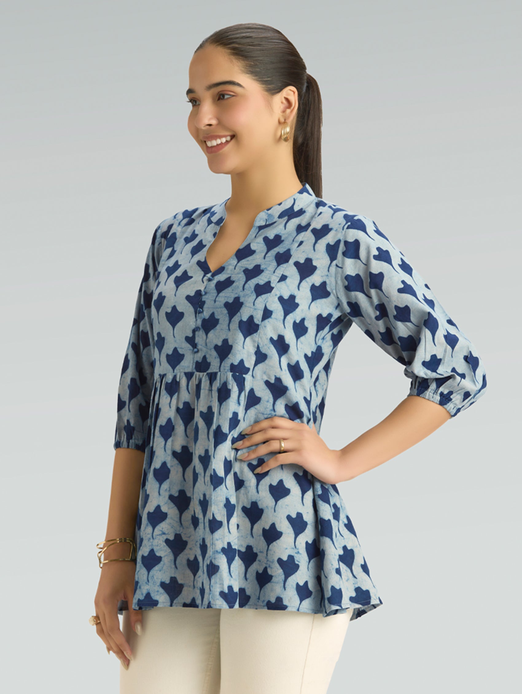 • Short Kurti with V-neckline, three-fourth sleeves, and side slits open