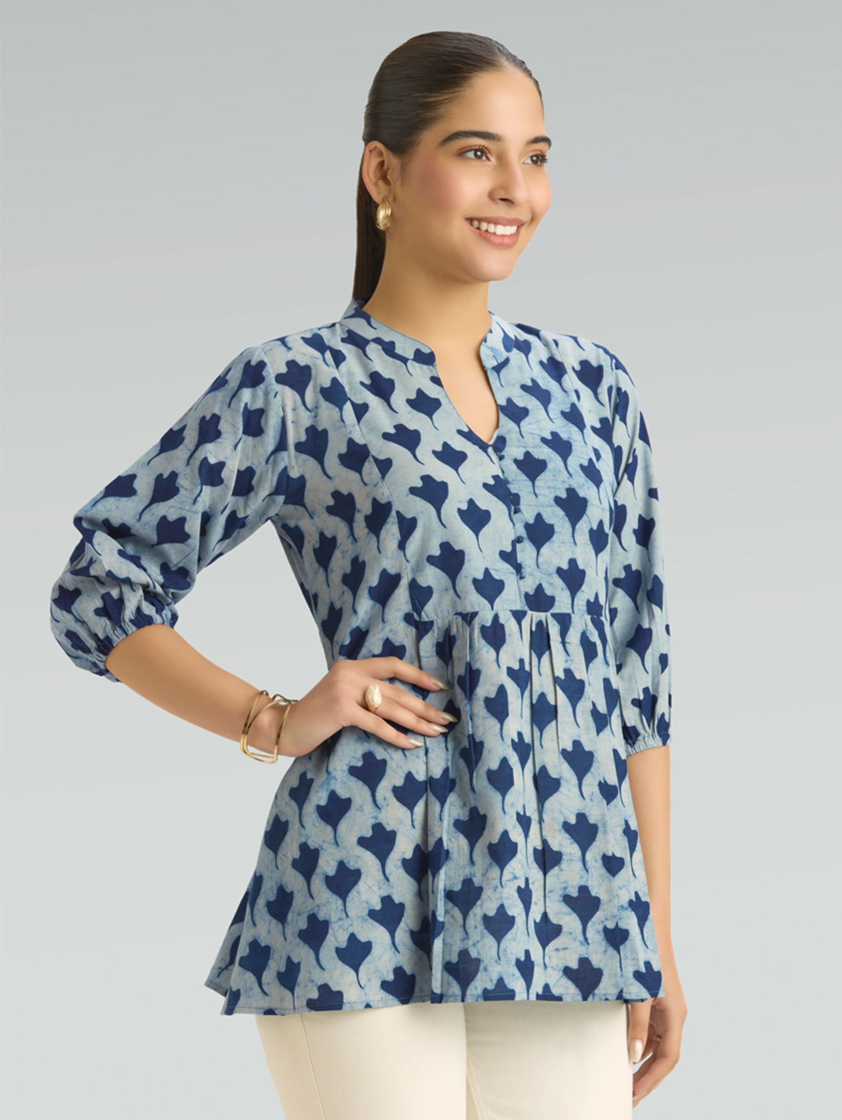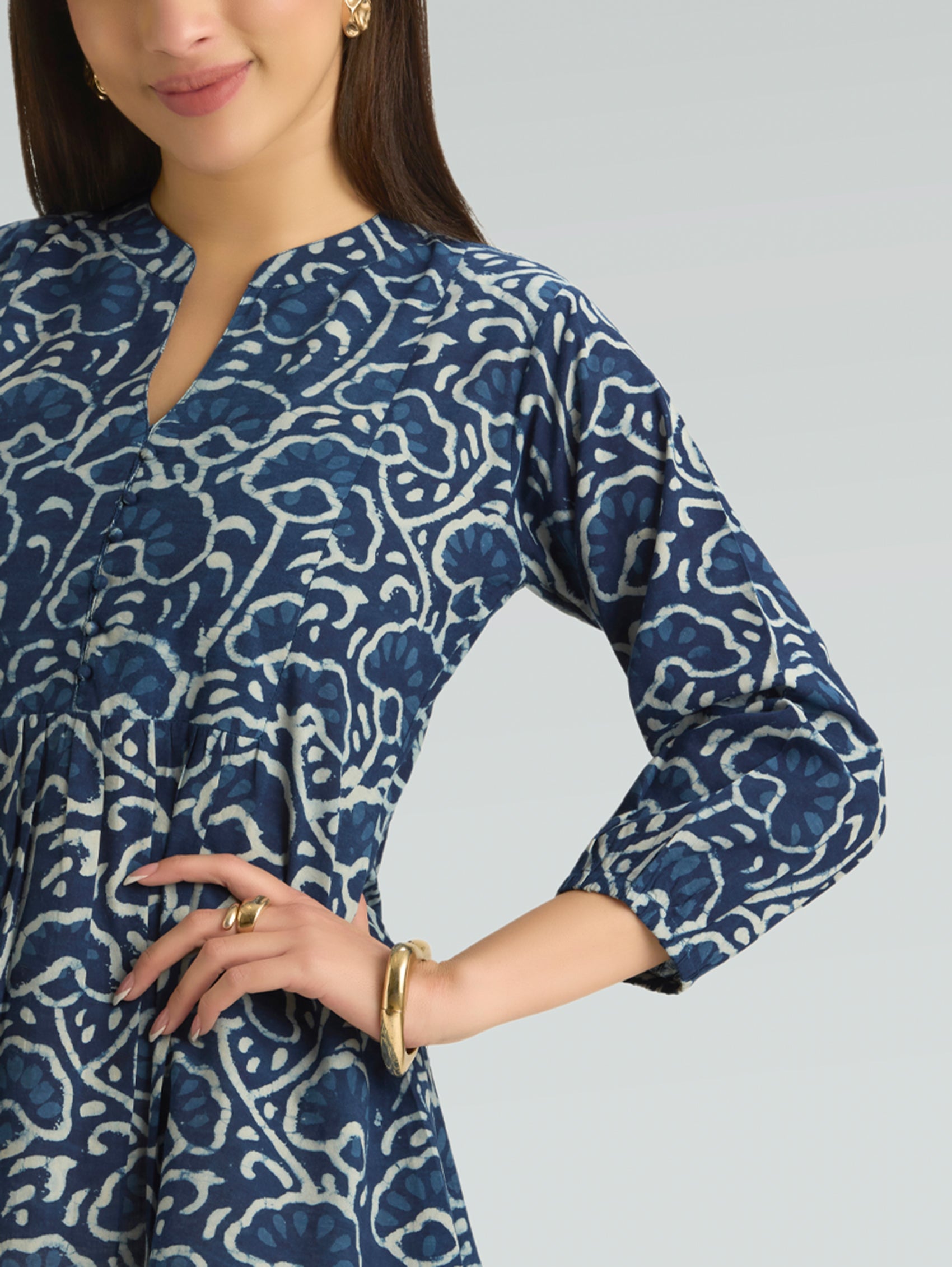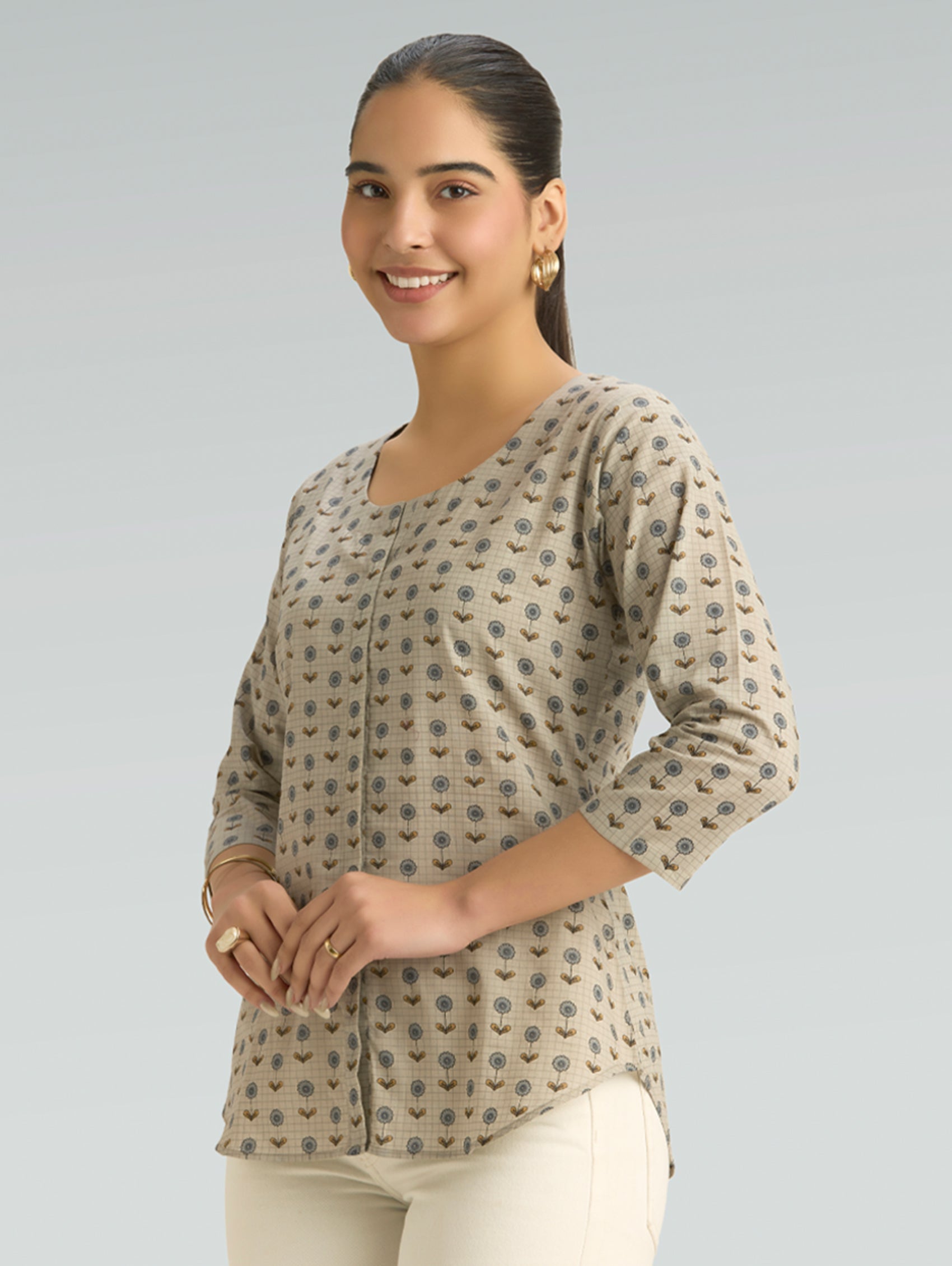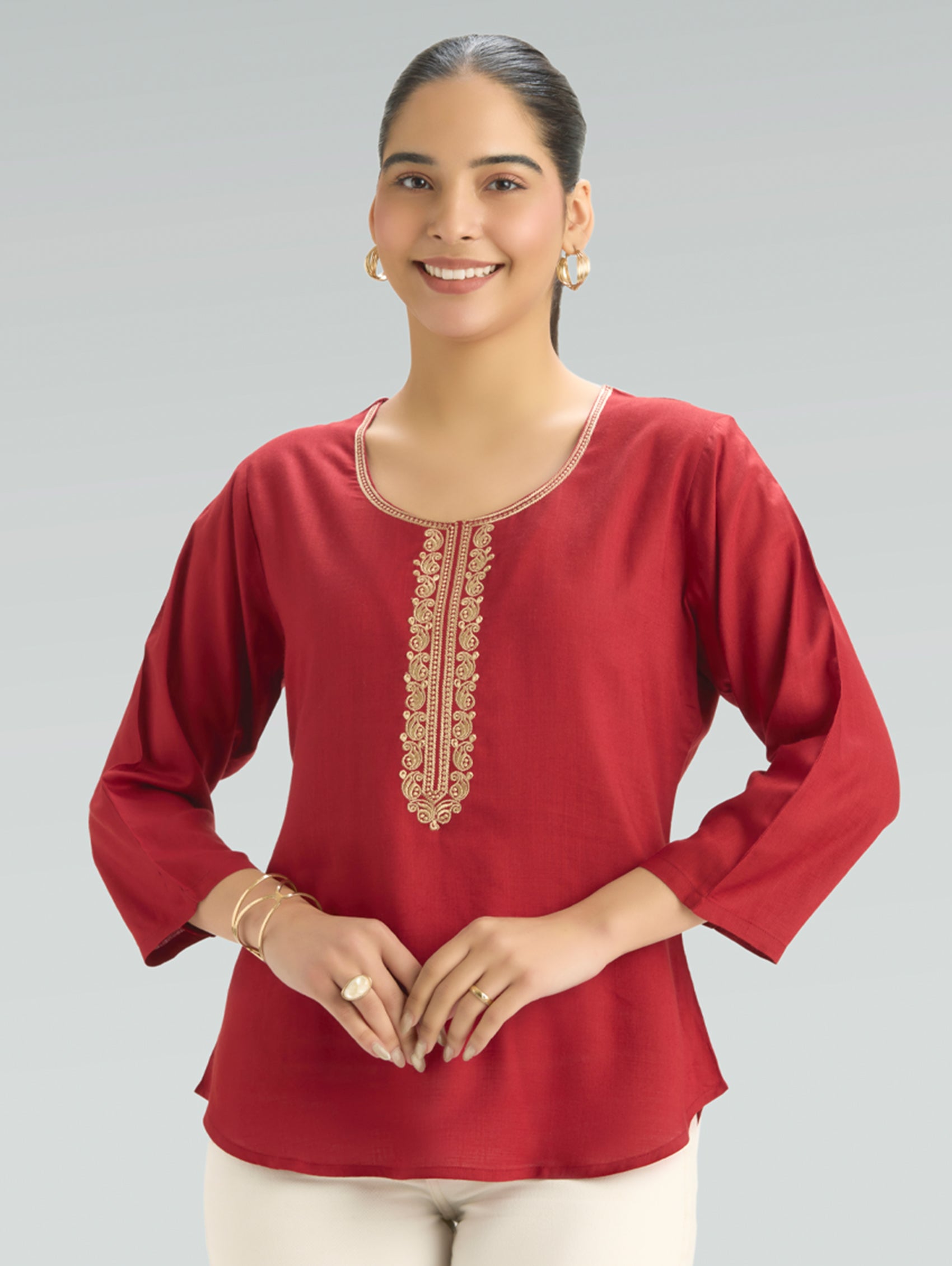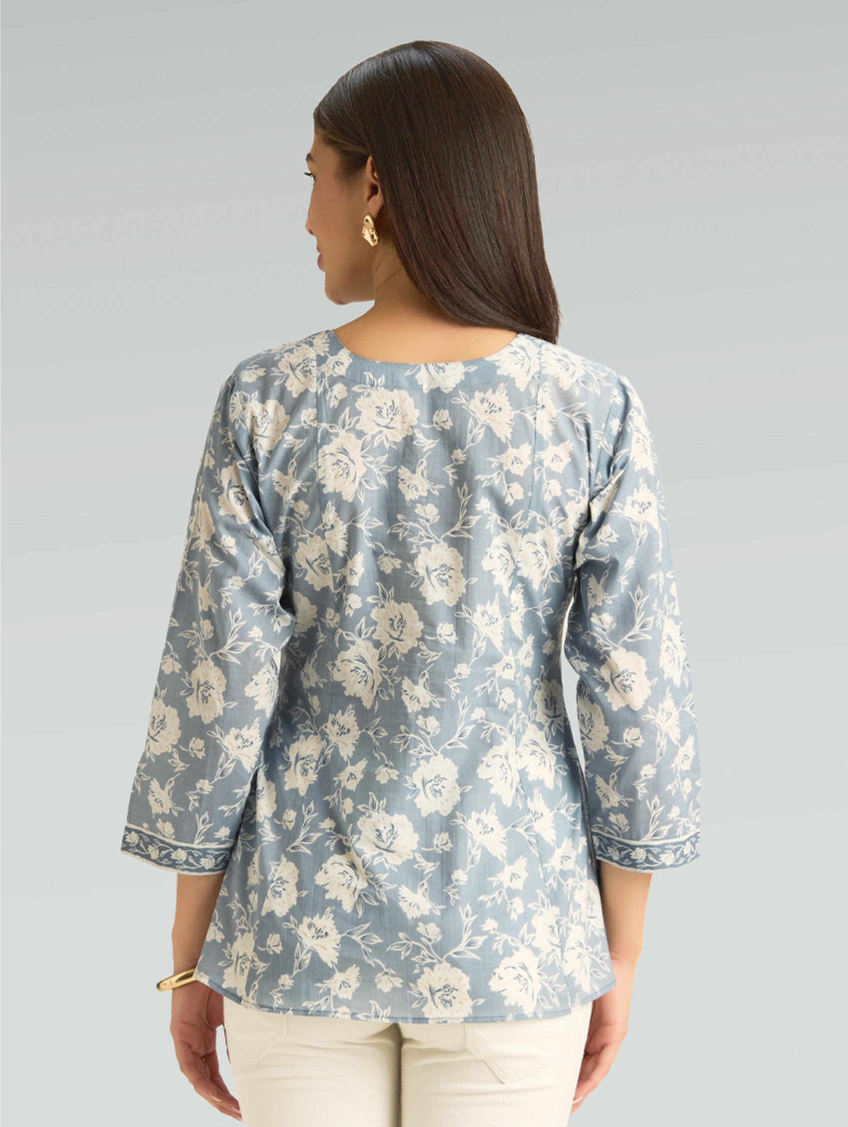 • Short Kurti with V-neckline, three-fourth sleeves, and side slits open