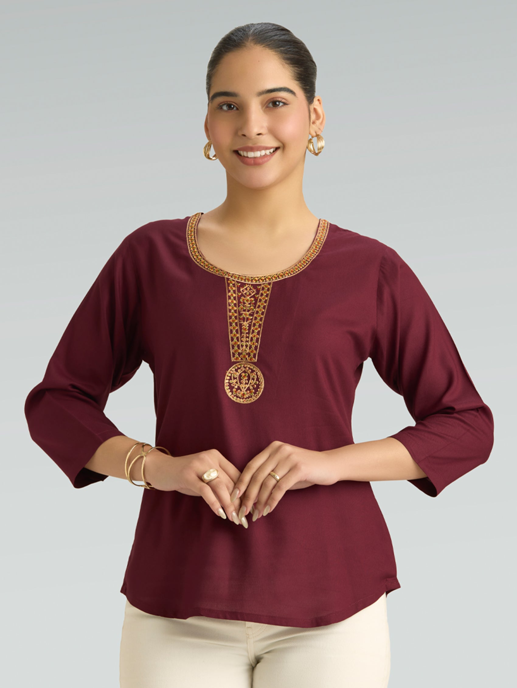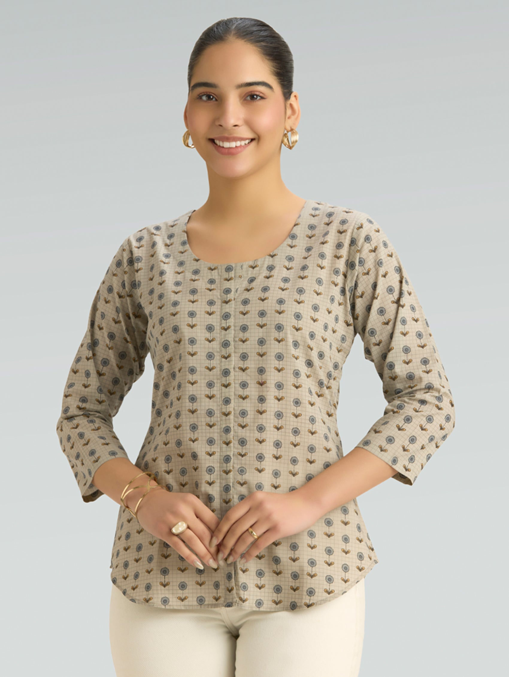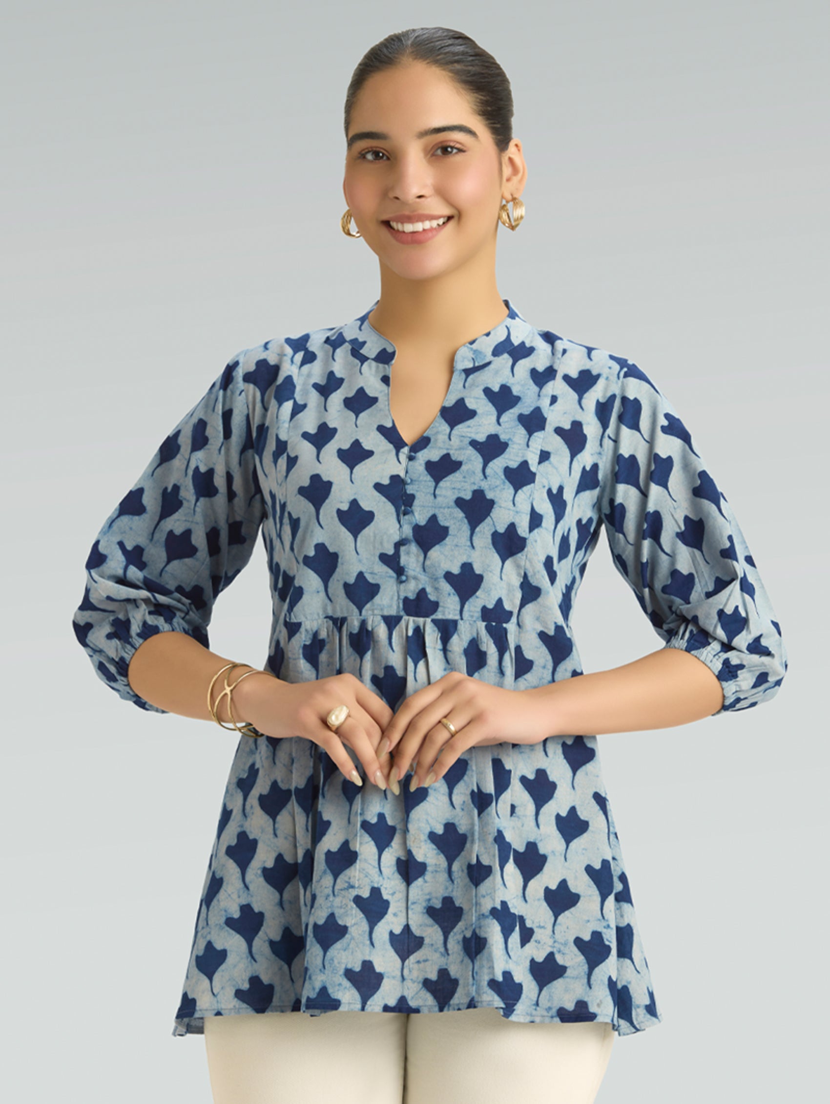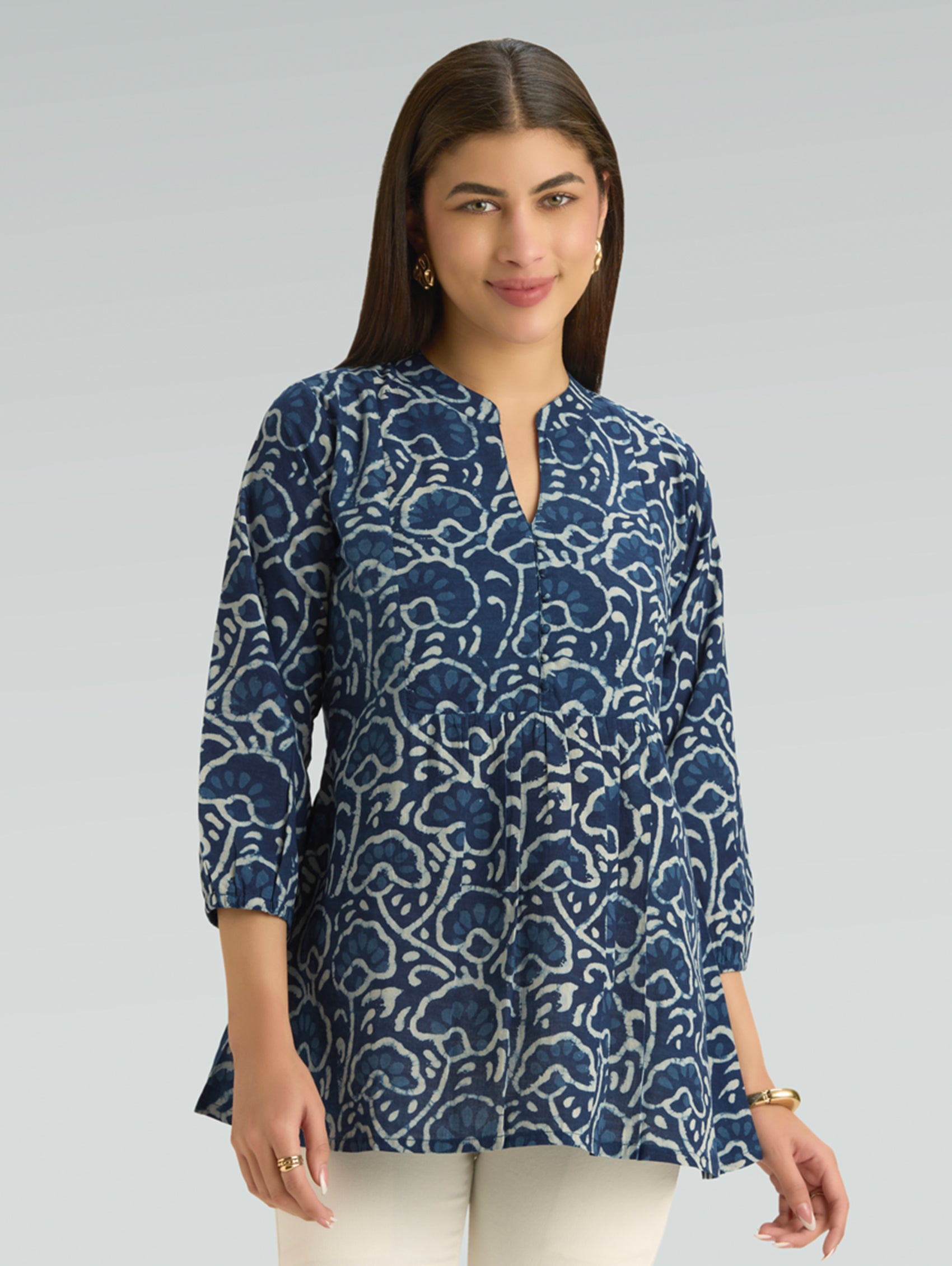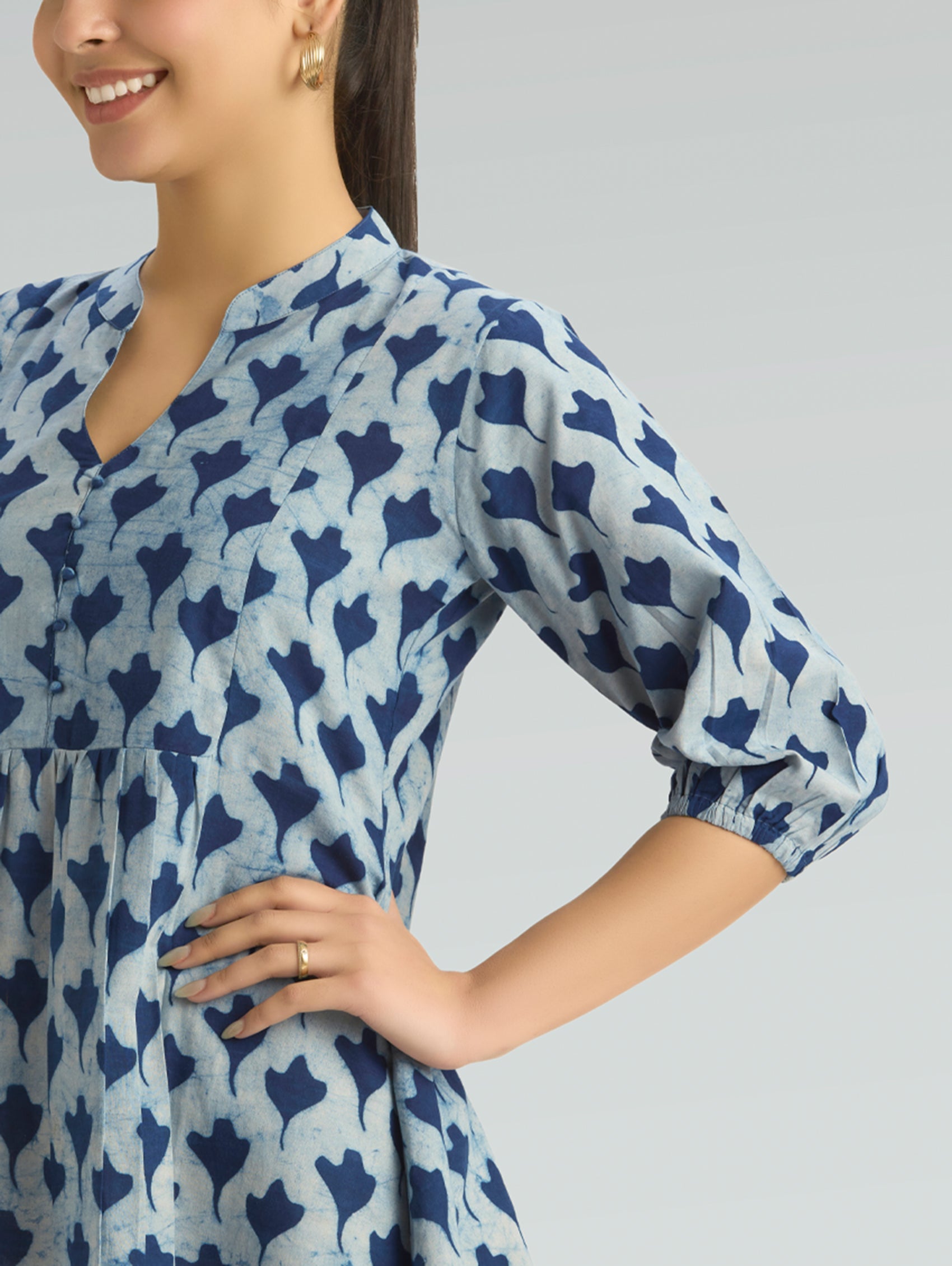 • Short Kurti with V-neckline, three-fourth sleeves, and side slits open