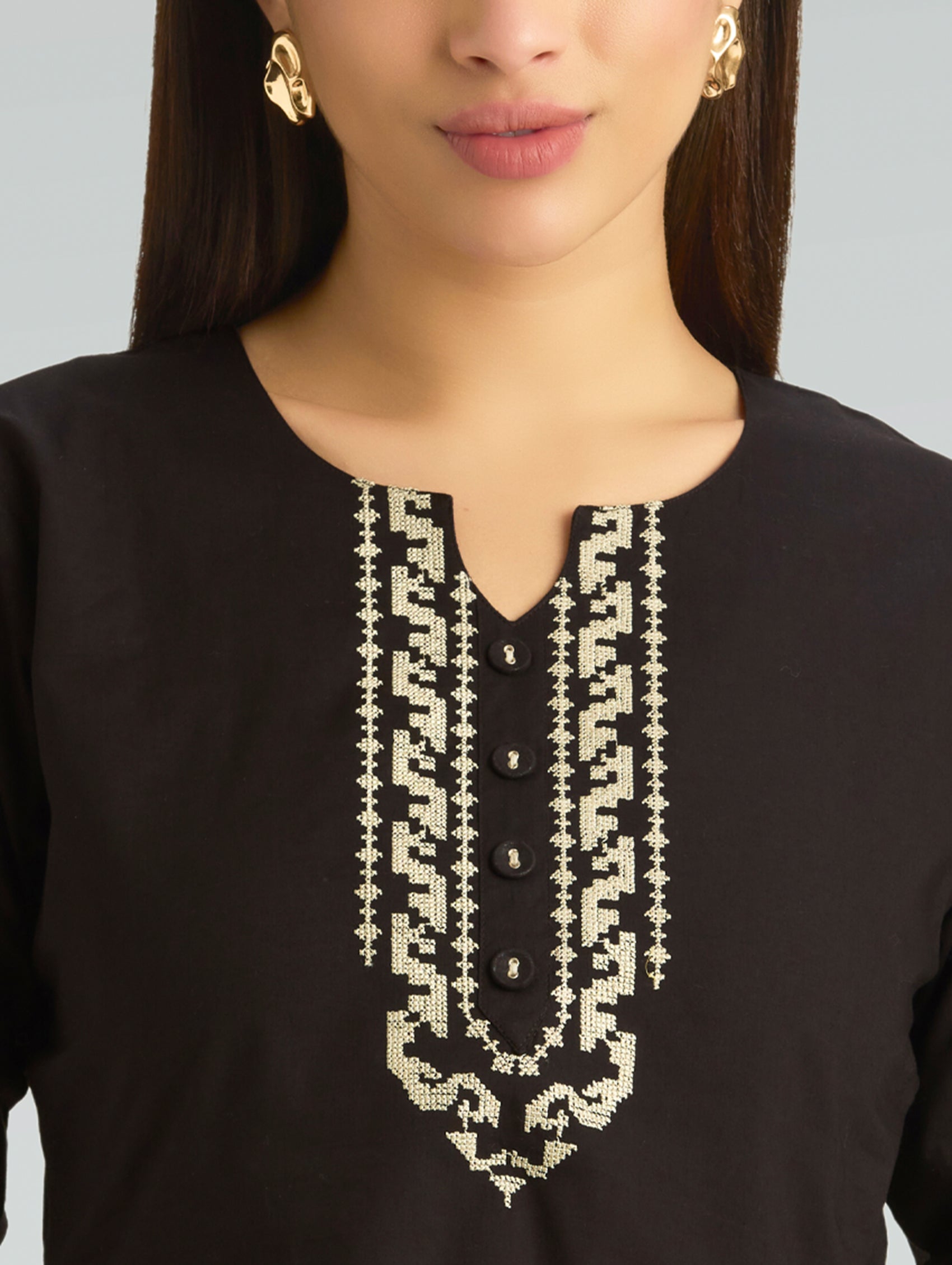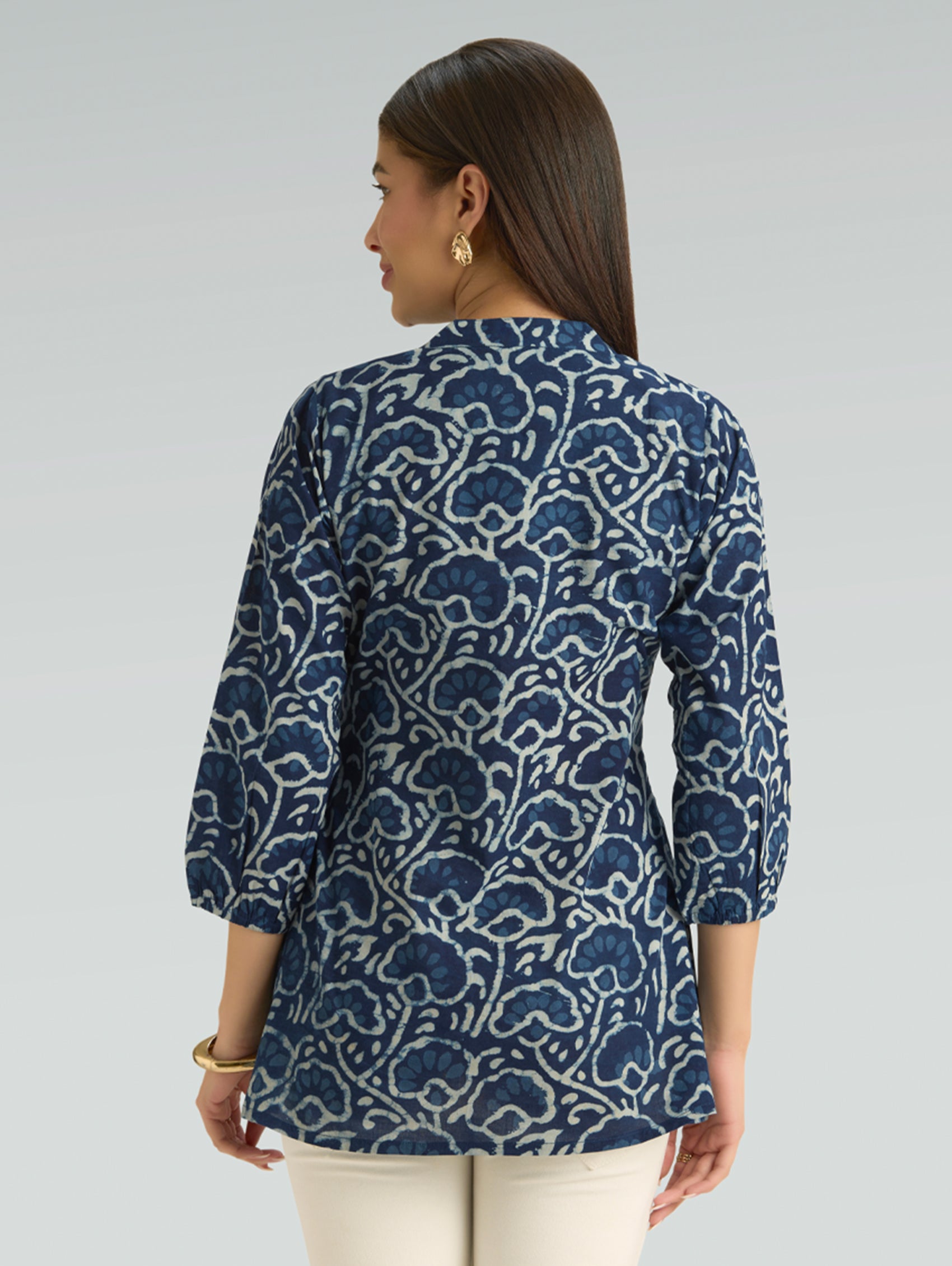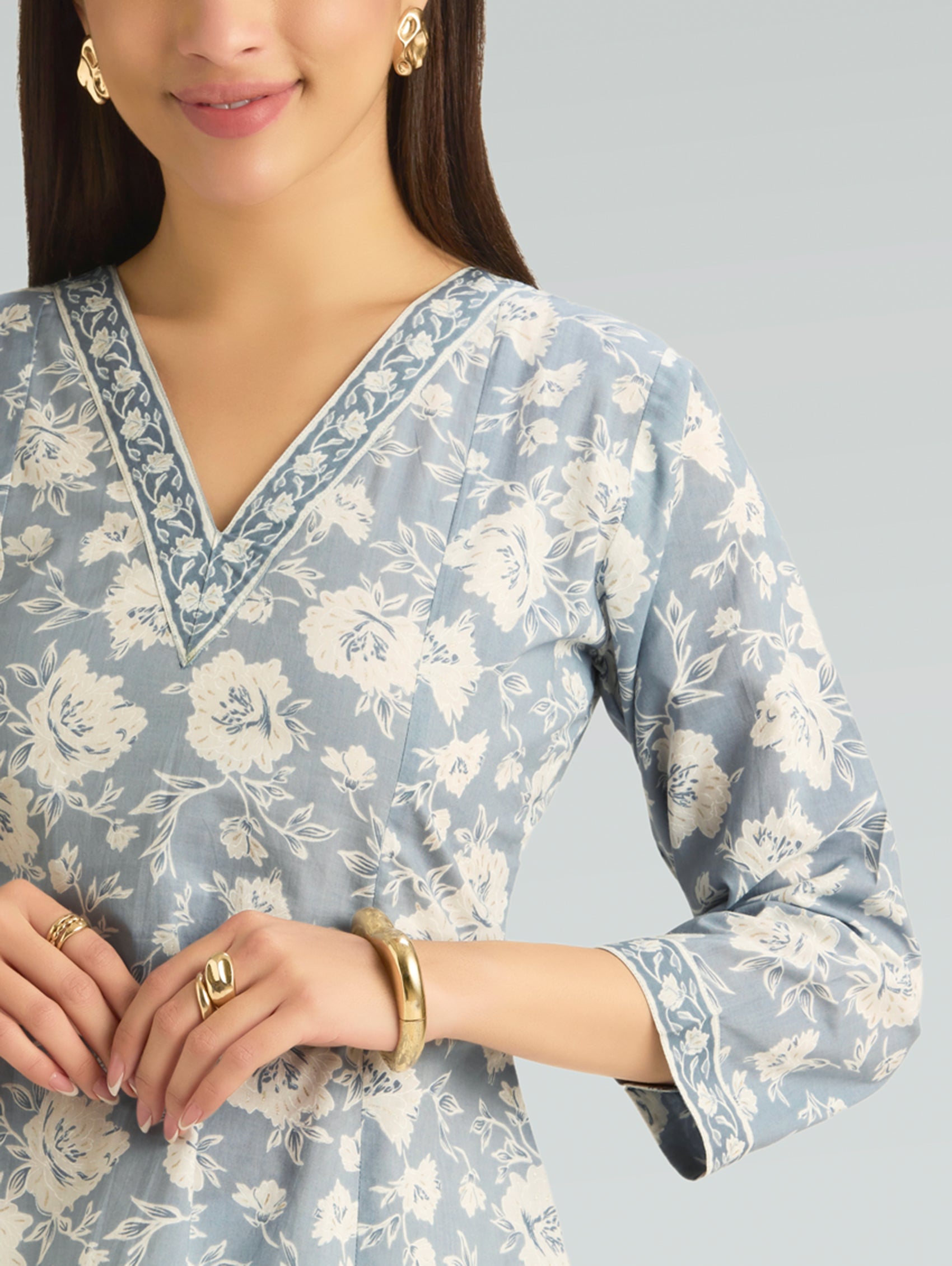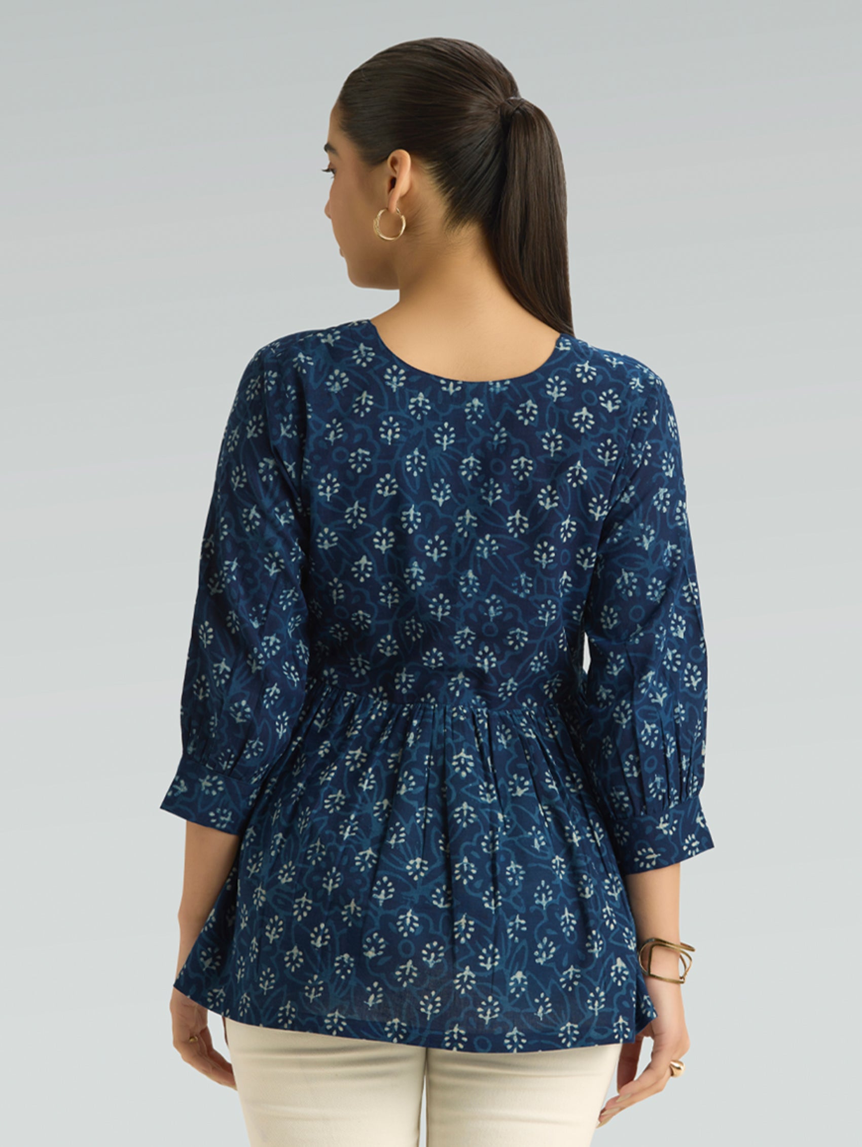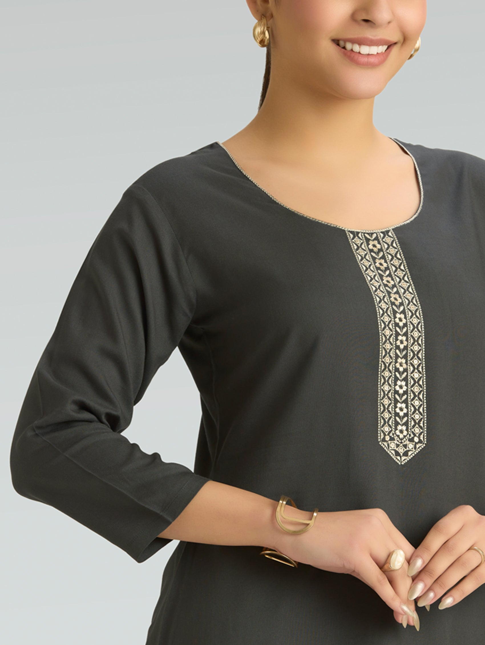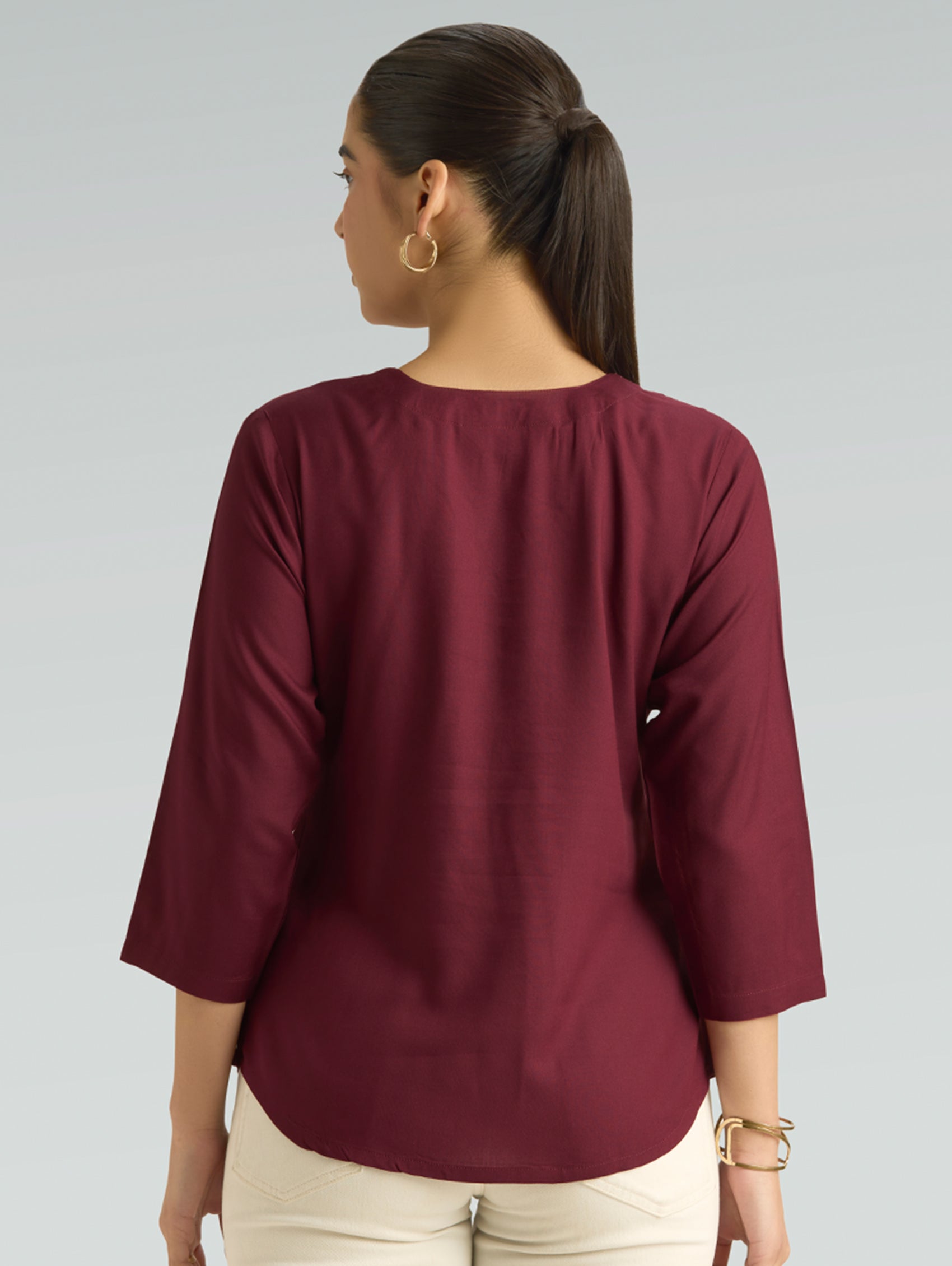 • Short Kurti with V-neckline, three-fourth sleeves, and side slits open