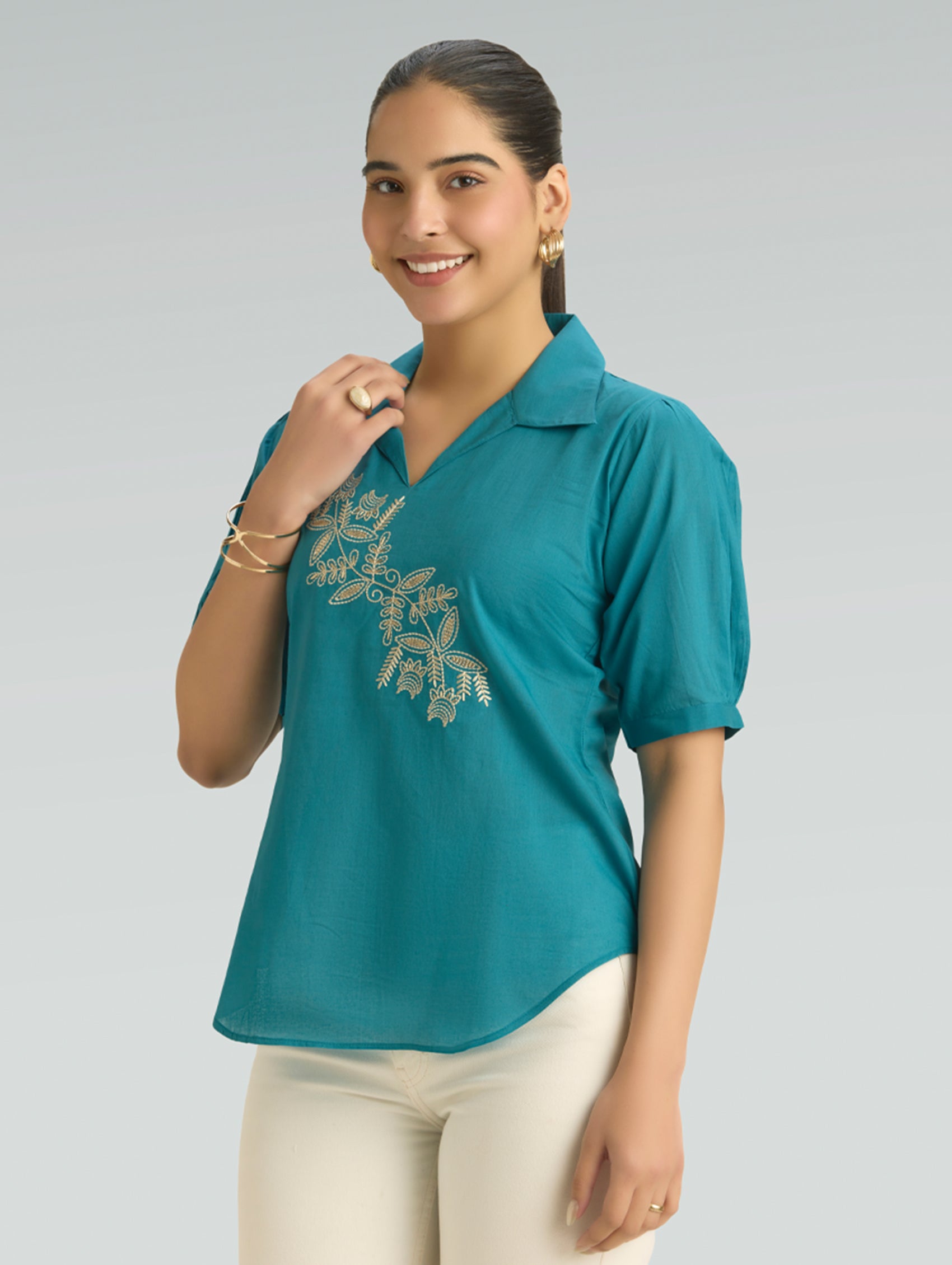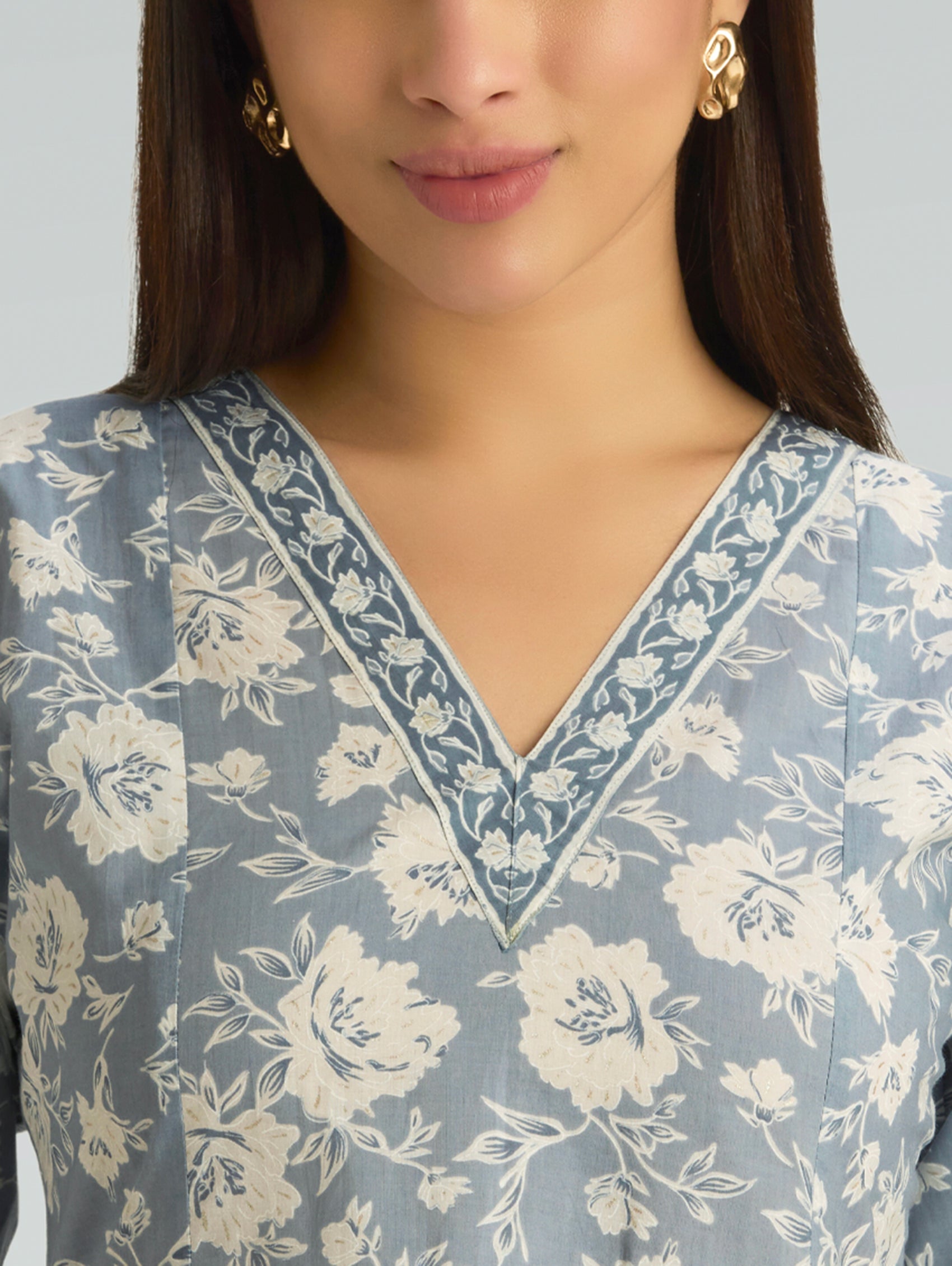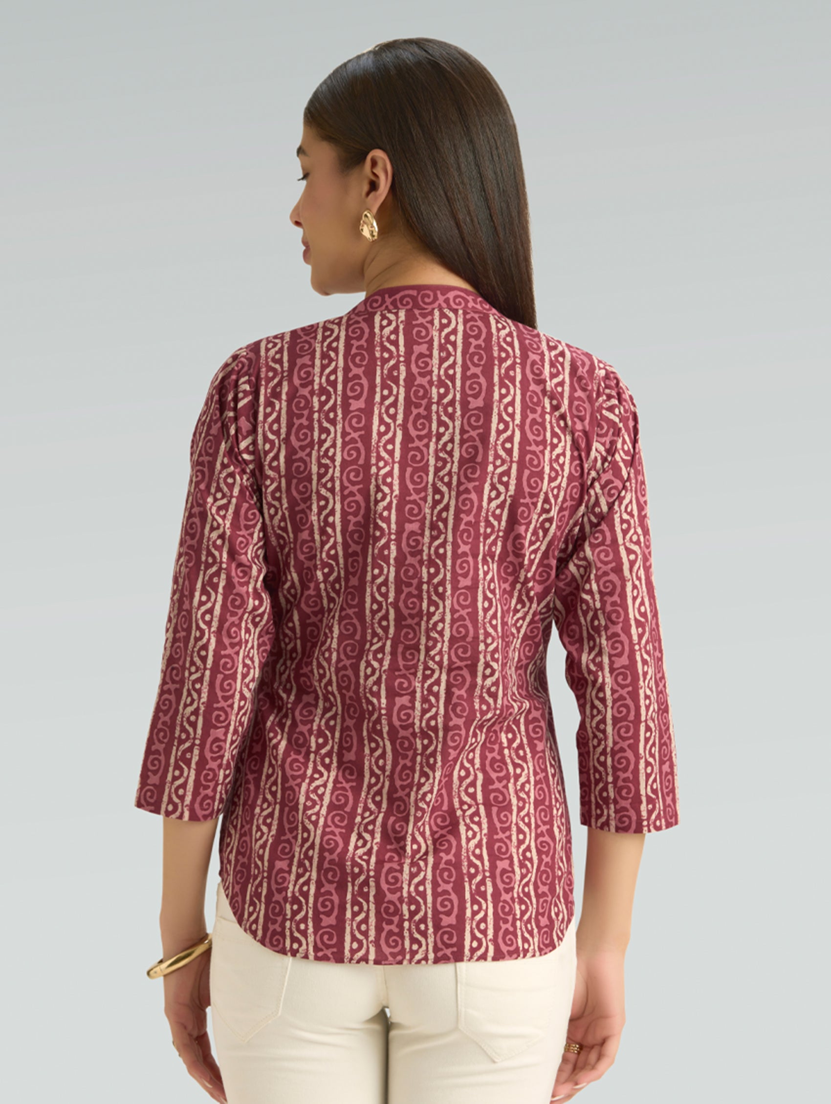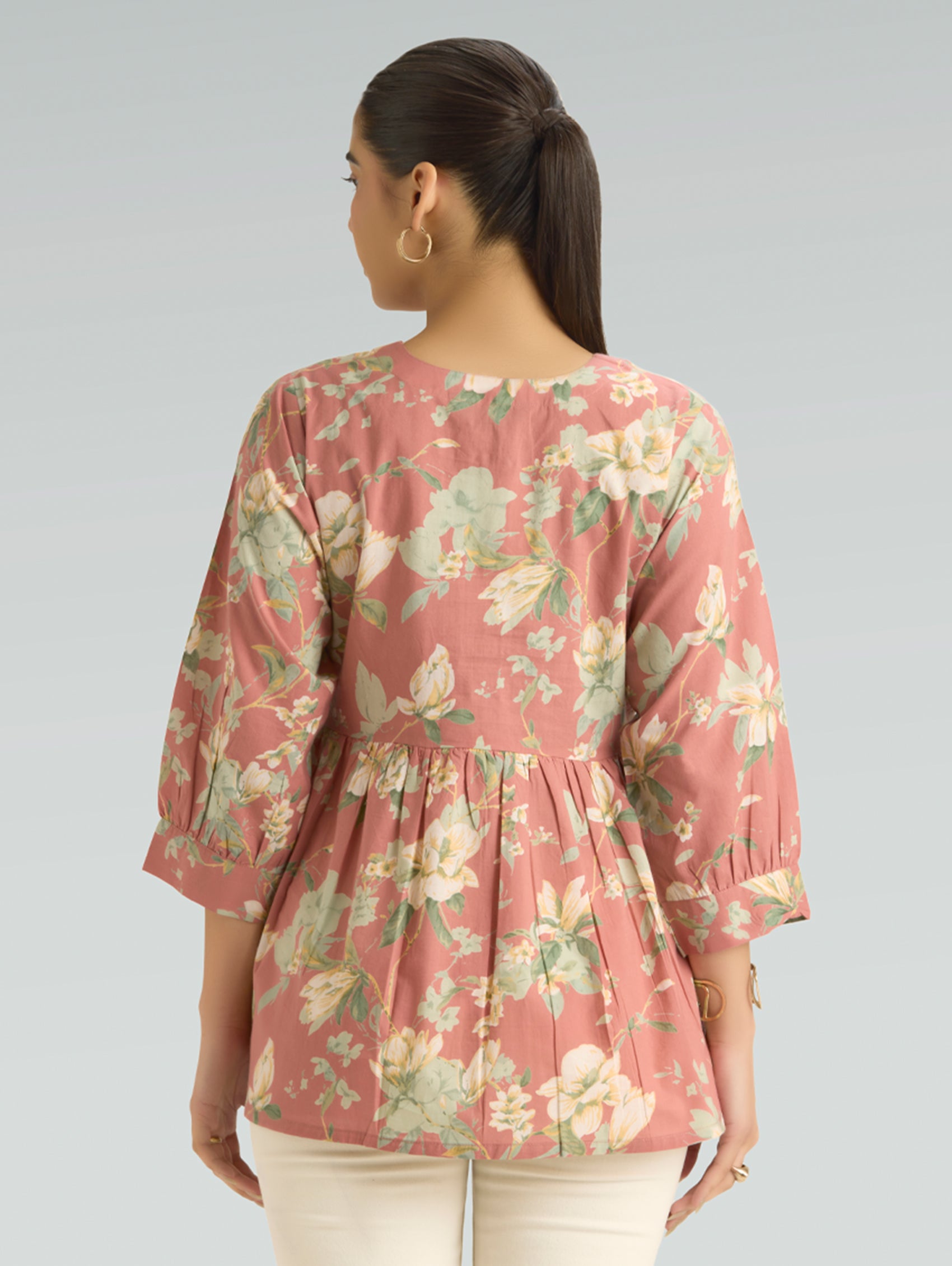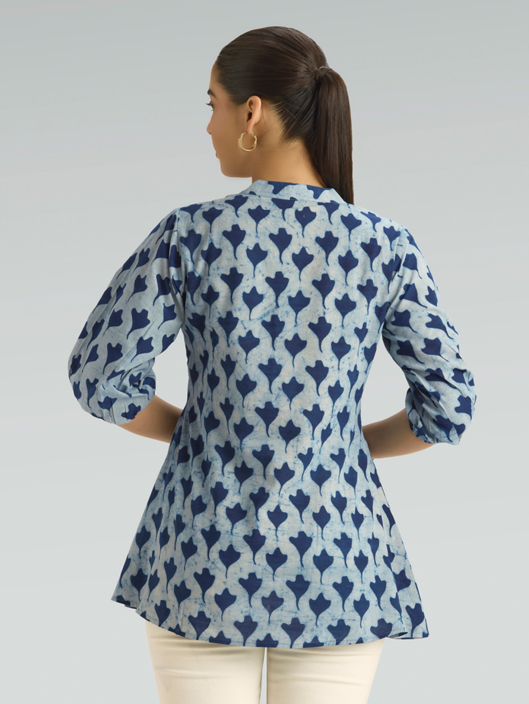 • Short Kurti with V-neckline, three-fourth sleeves, and side slits open
