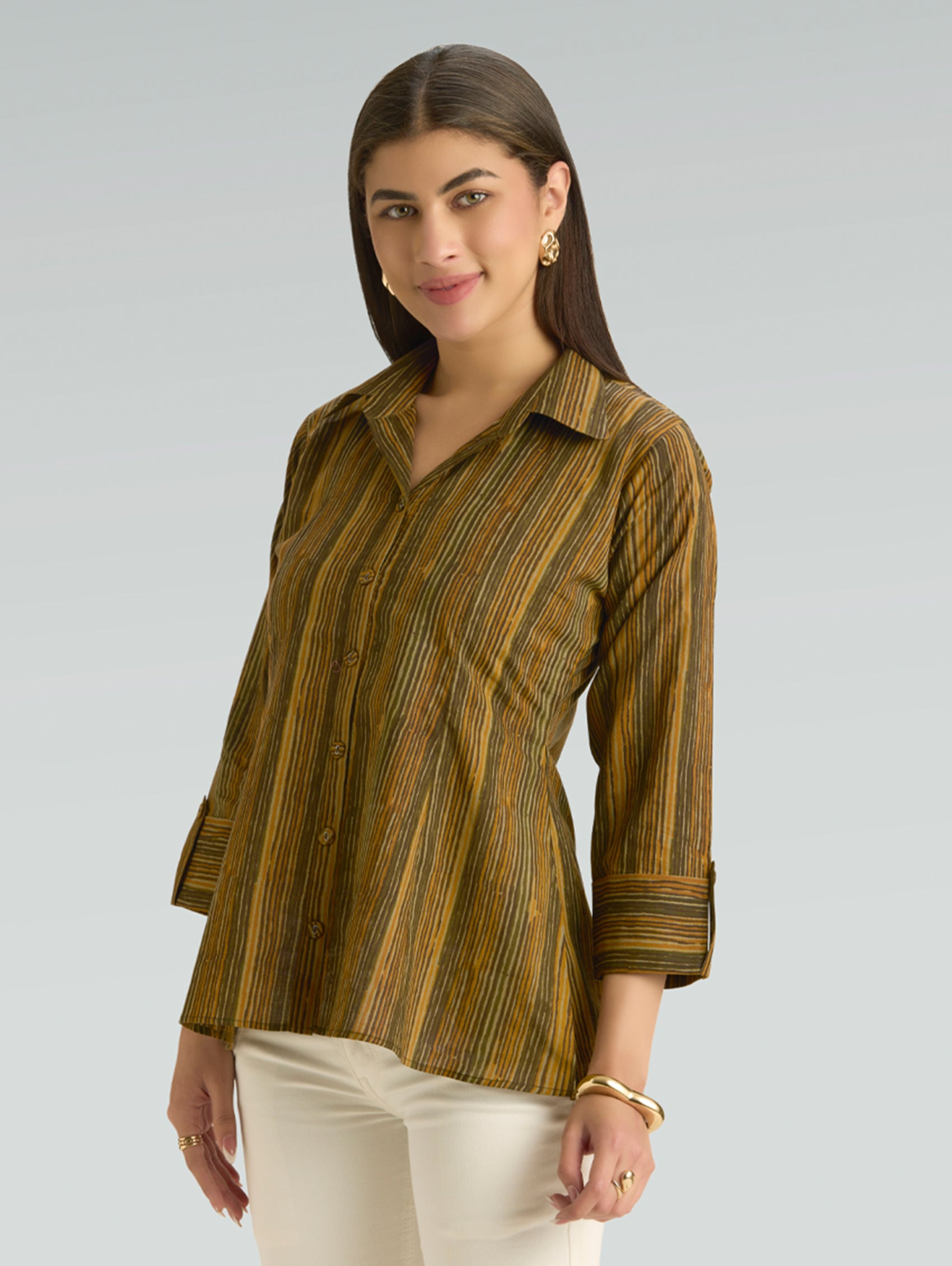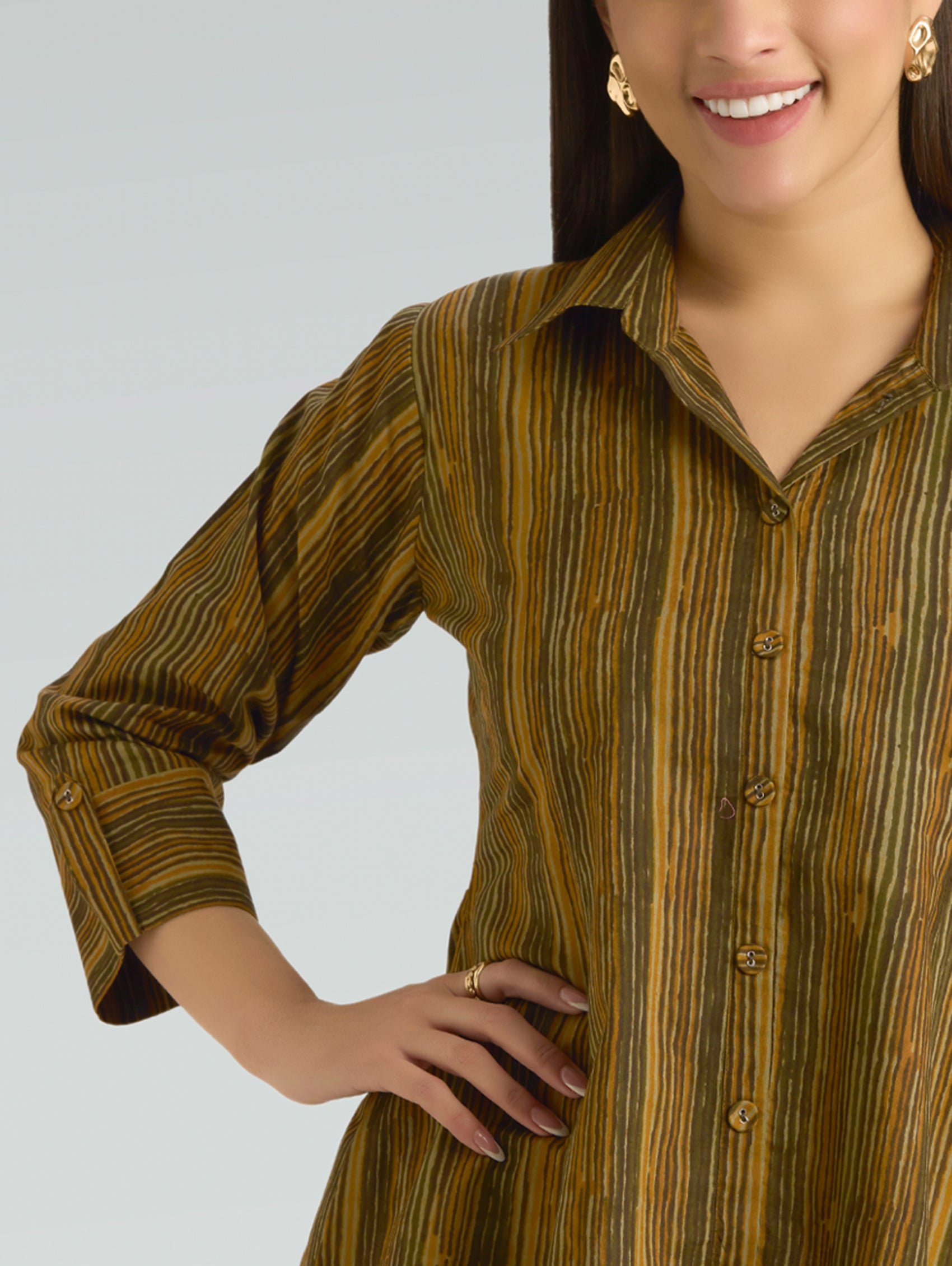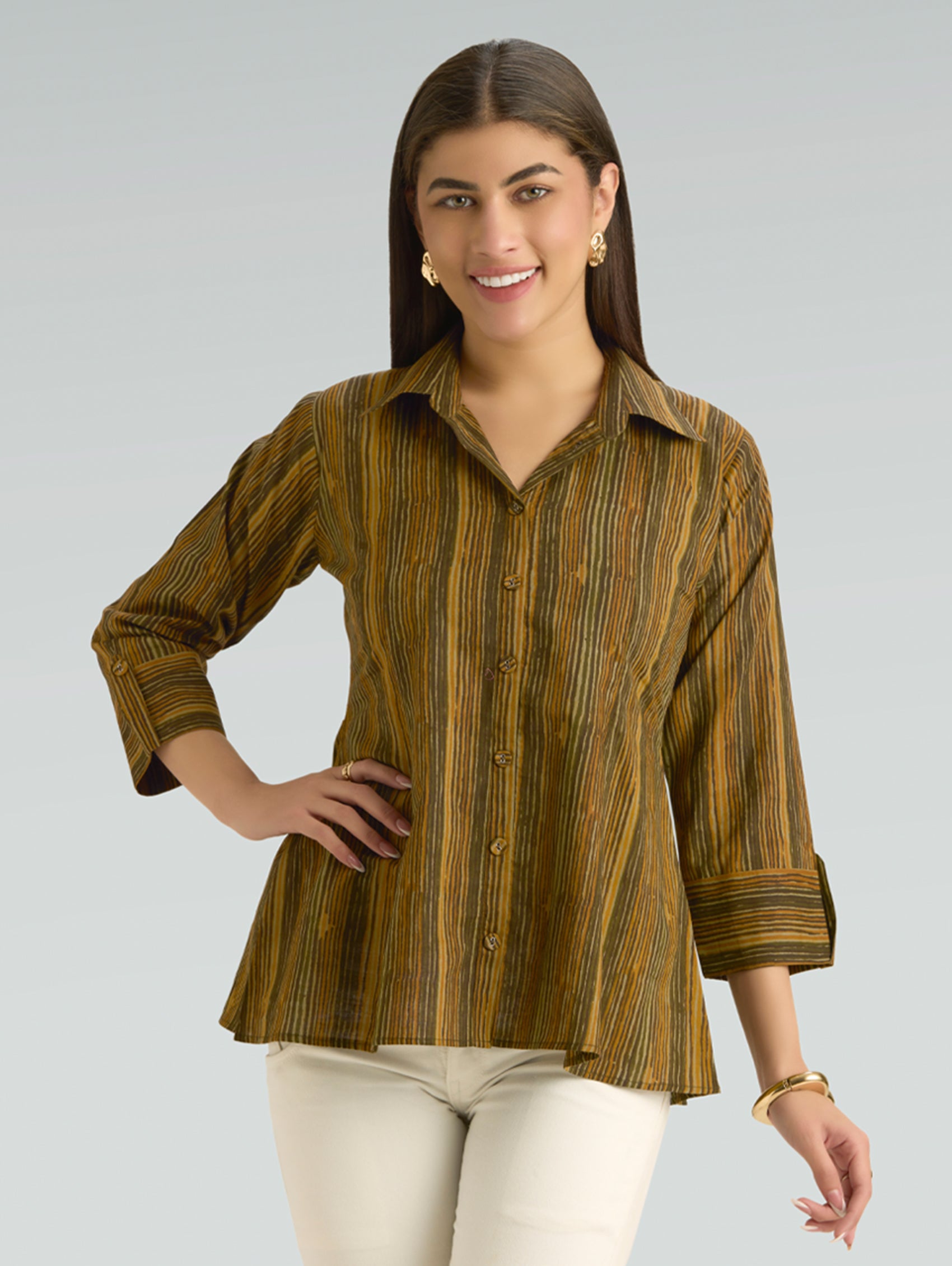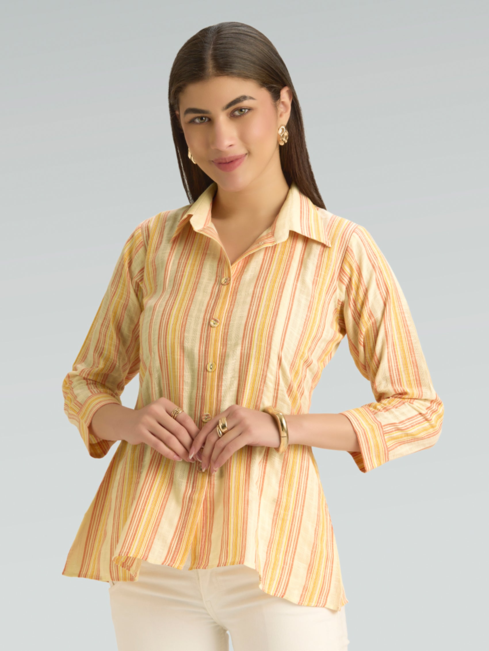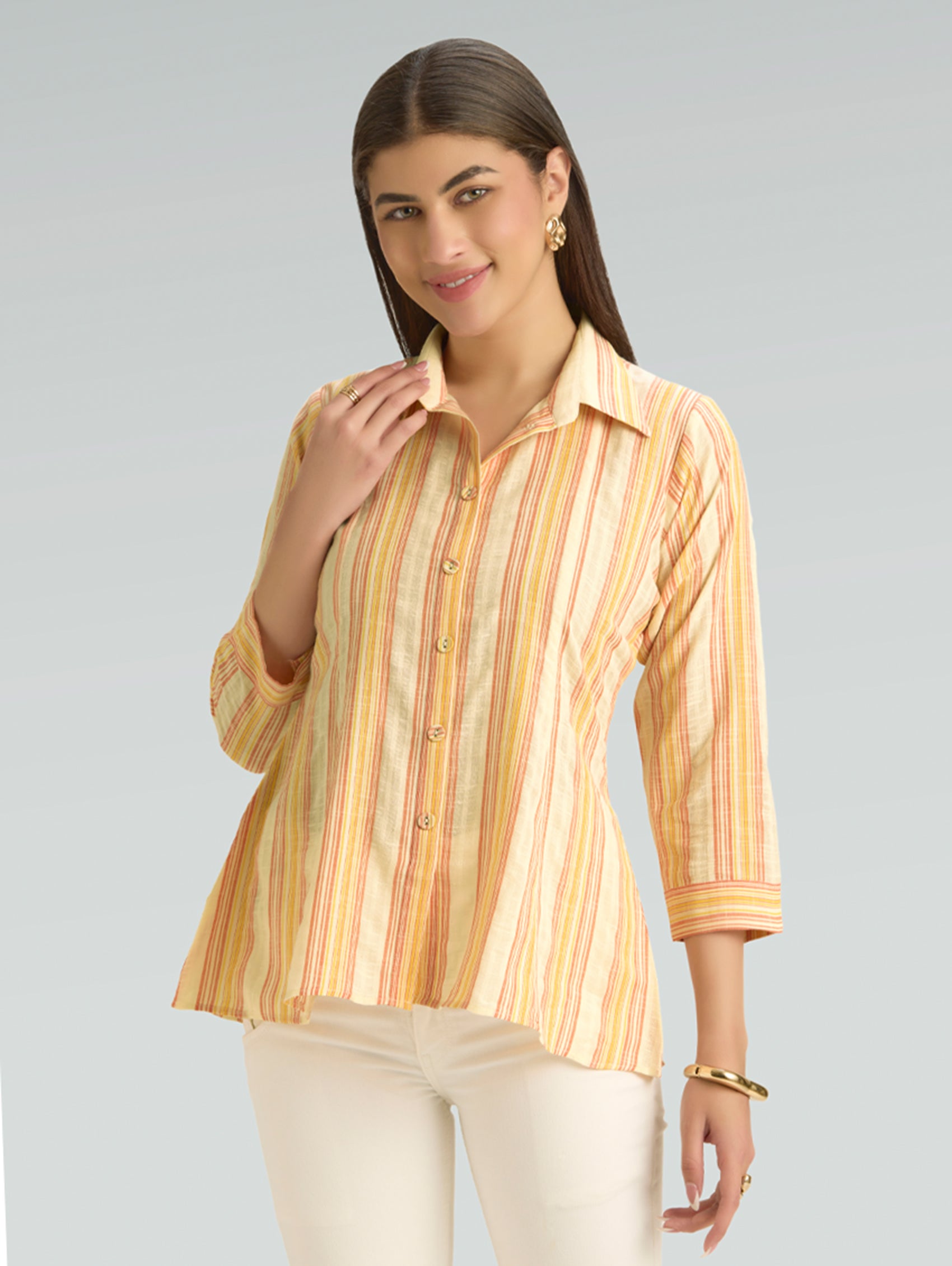 • Short Kurti with V-neckline, three-fourth sleeves, and side slits open