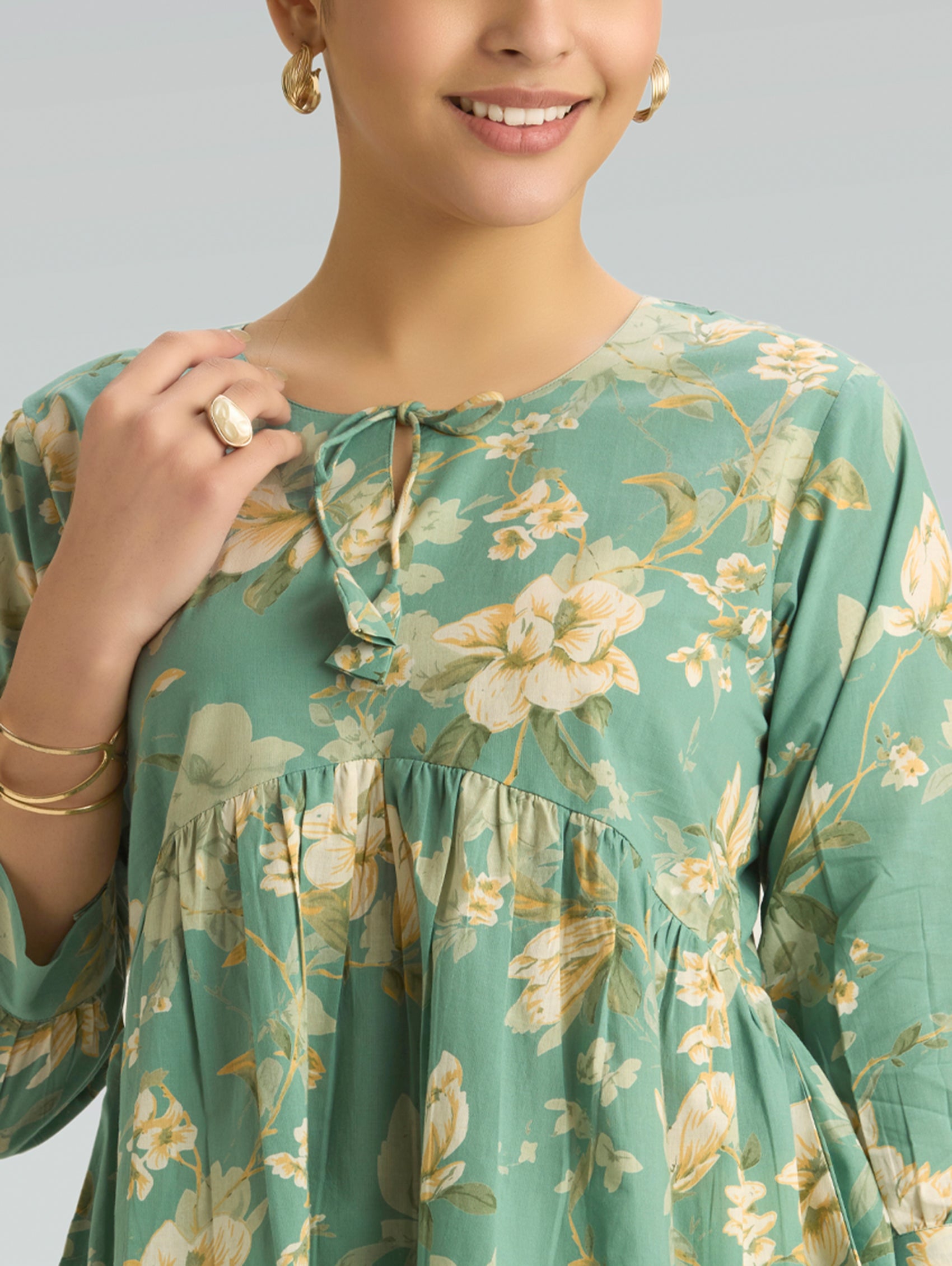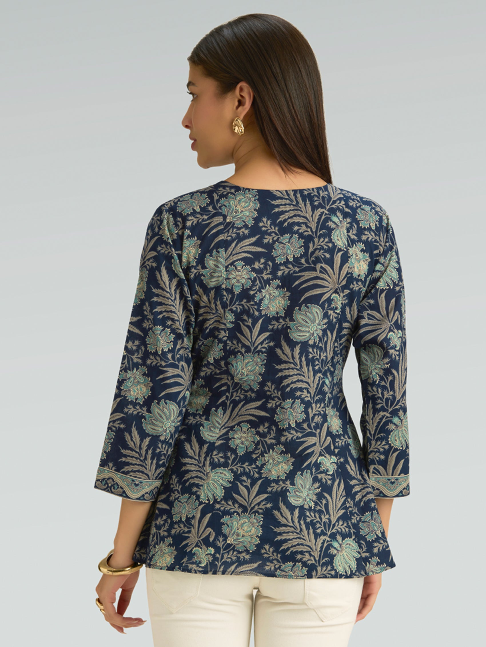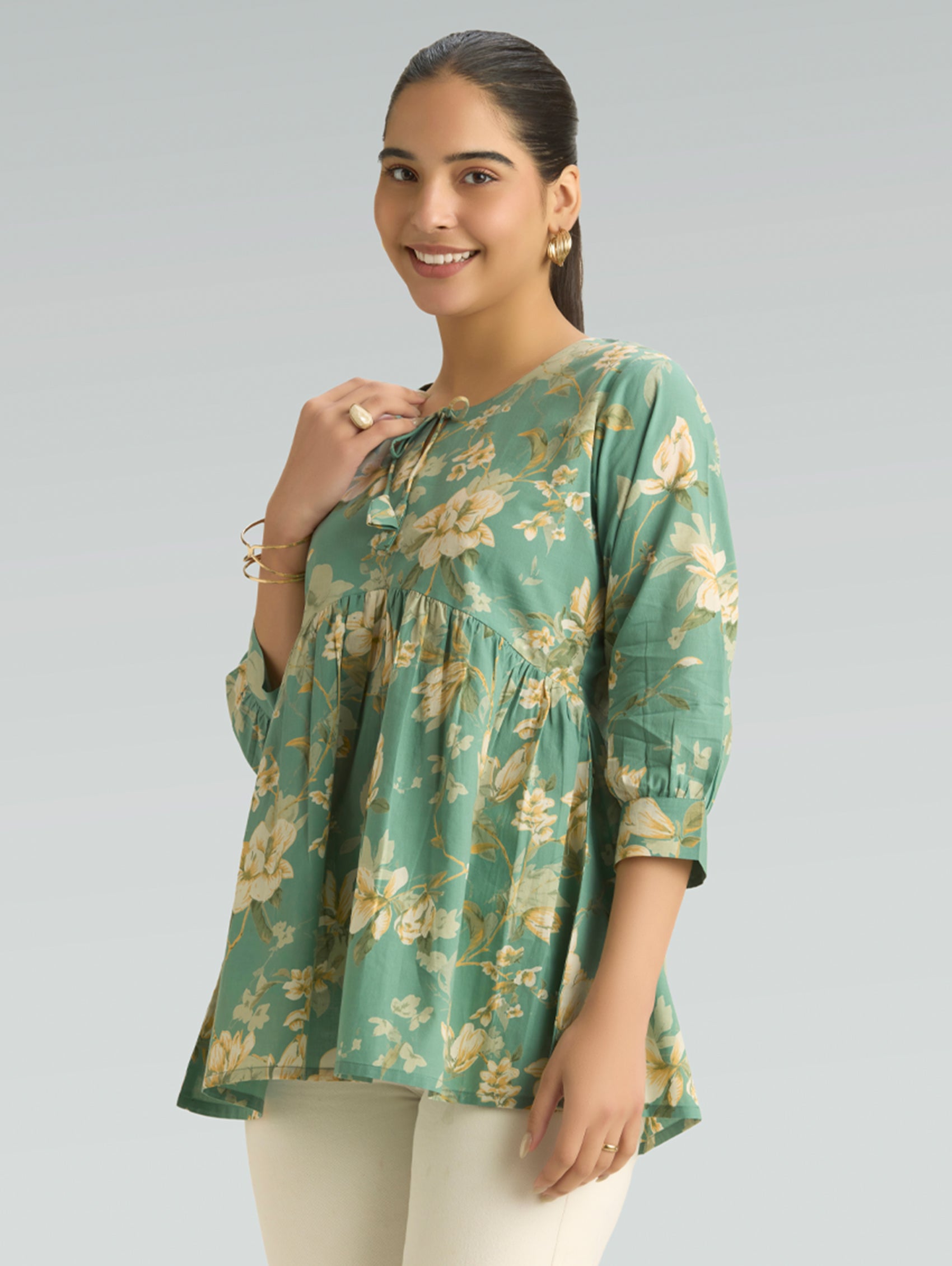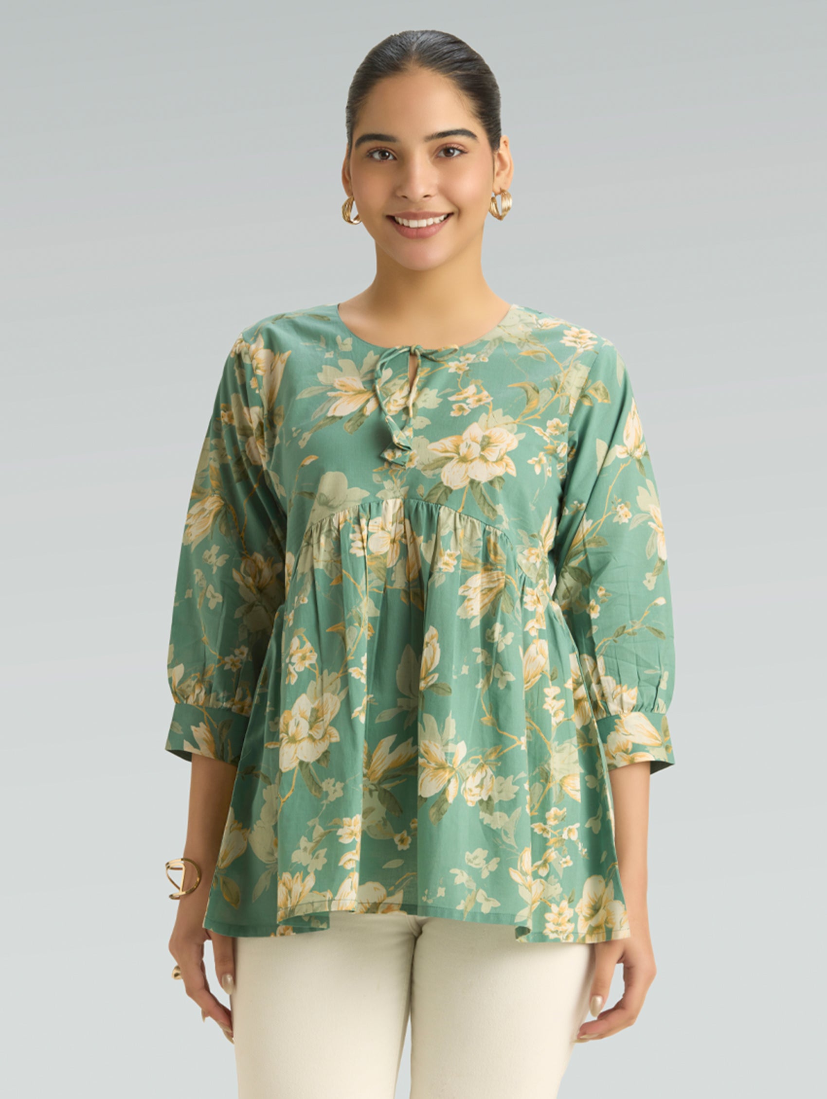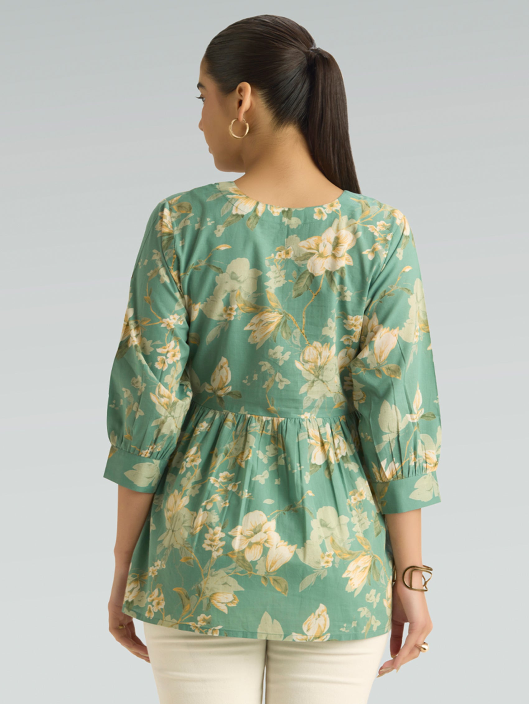 Bring together comfort and timeless ethnic style with this Pure Cotton Printed Short Kurti, thoughtfully designed for relaxed everyday wear. Crafted from soft and breathable pure cotton fabric, this kurti keeps you cool and comfortable while offering a refined traditional look. Designed in a rich deep green base, the kurti features delicate all-over traditional floral motifs prints that lend it a classic handcrafted aesthetic. The elegant V-neckline is enhanced with a contrasting printed border, adding subtle detail and elevating the overall design. The three-fourth sleeves with matching border accents and straight-fit silhouette create a flattering and versatile style that works effortlessly for daily wear. With its short length and side slits, this kurti pairs beautifully with trousers, palazzos, or even denim for a modern ethnic look.