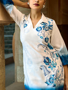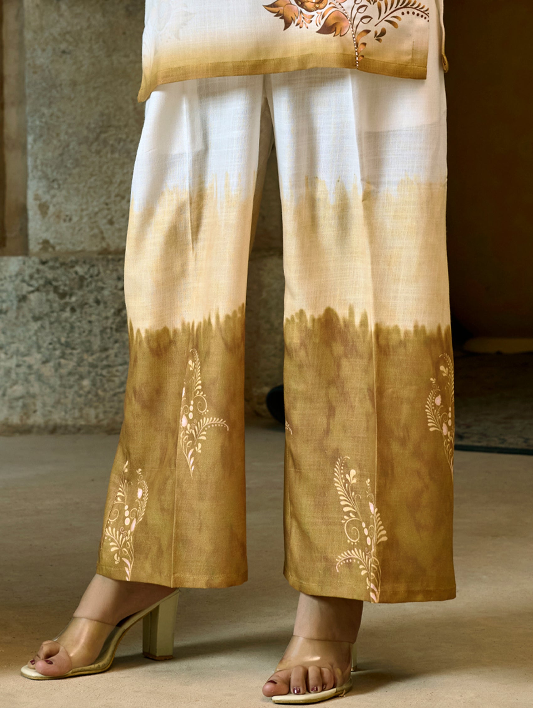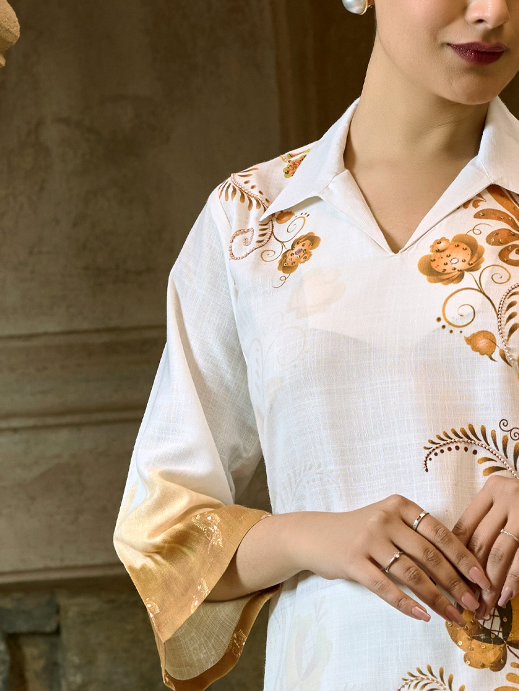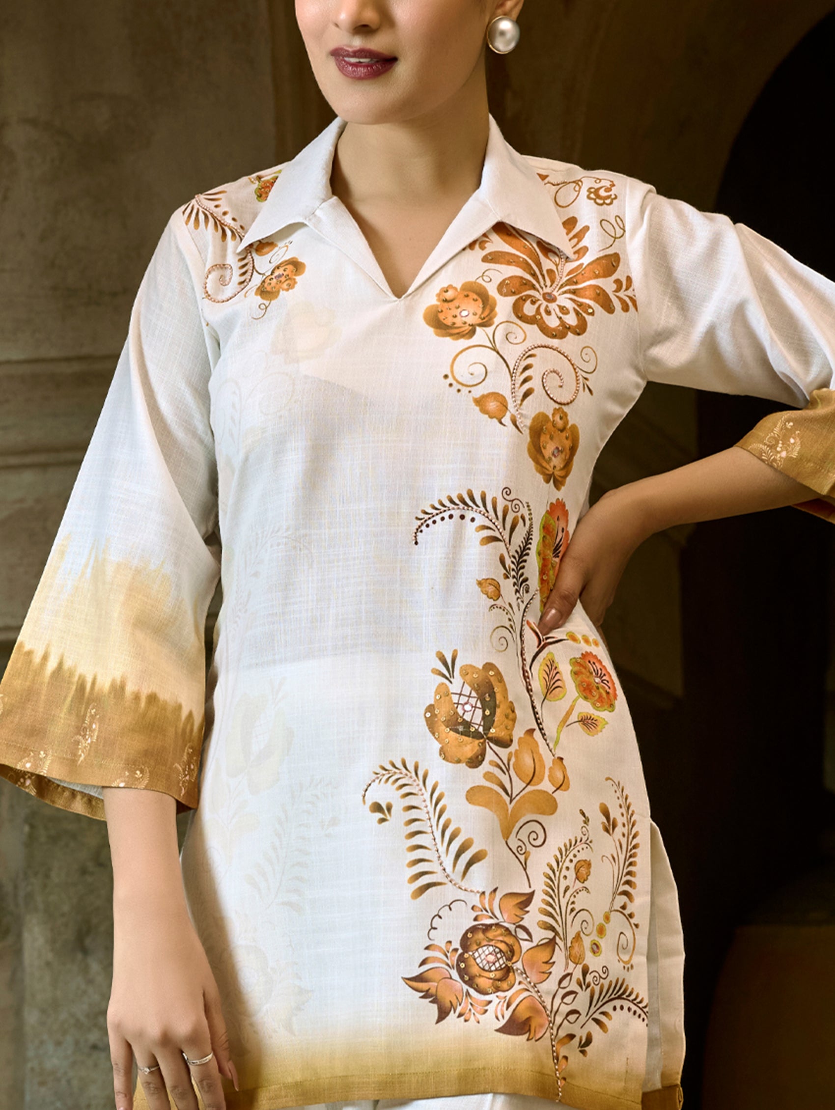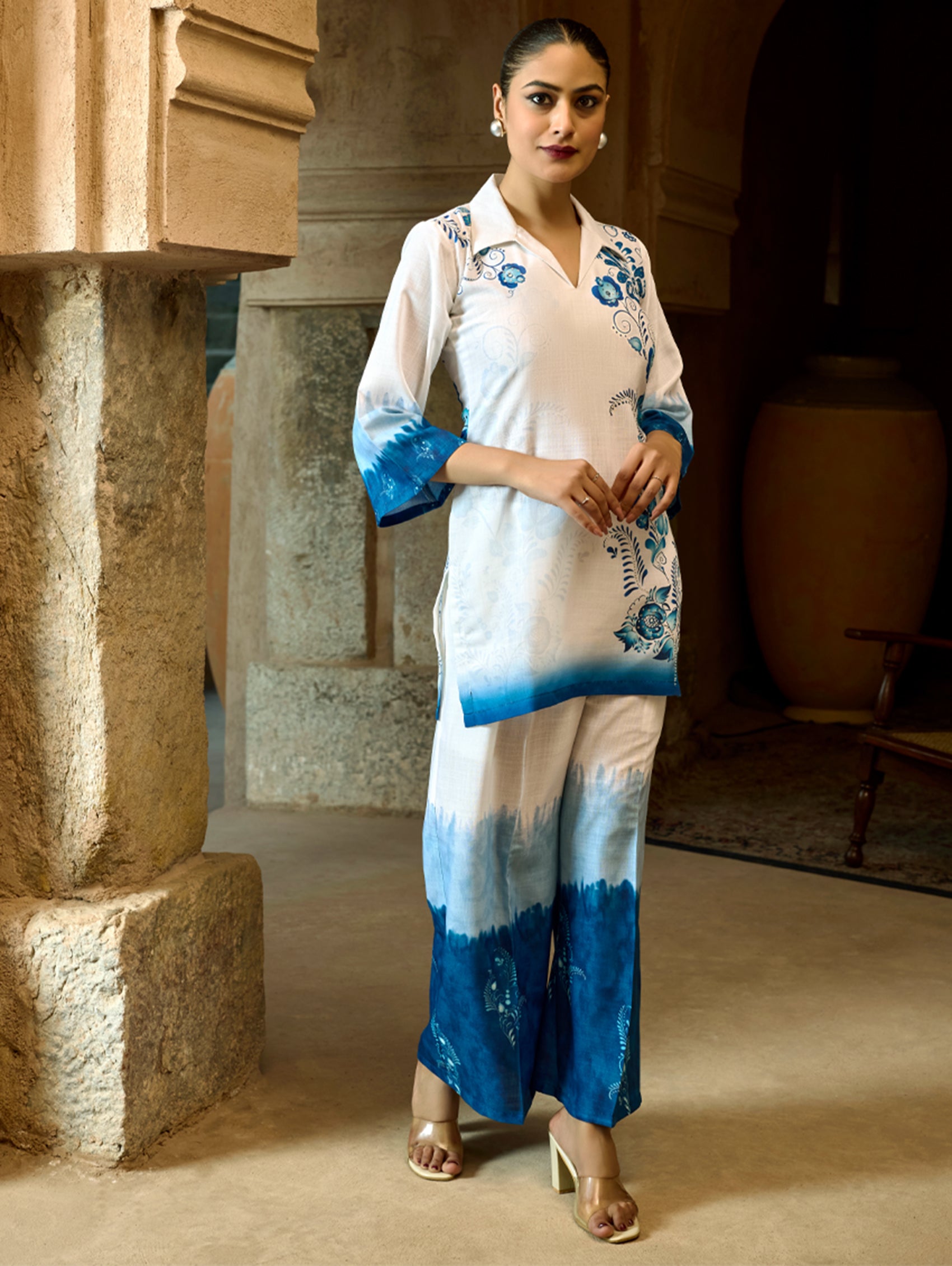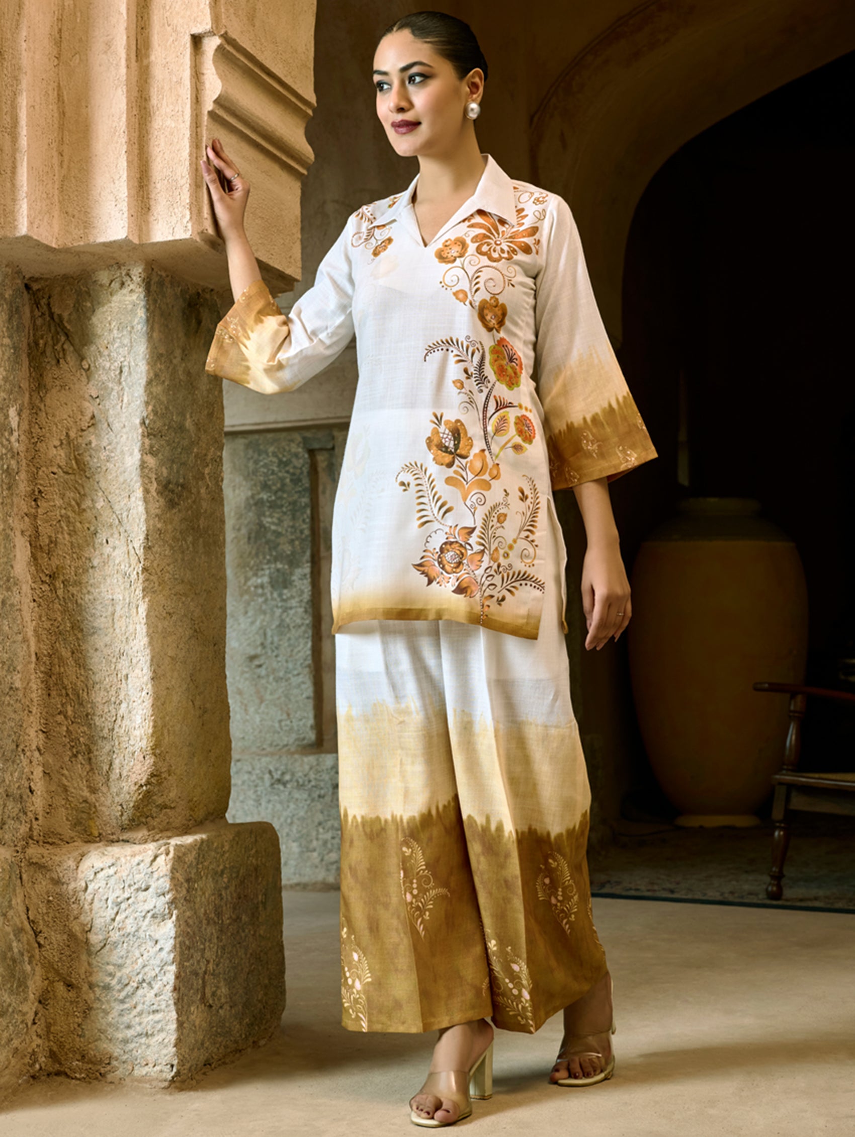Discover effortless style with our ethnic co-ord set, which includes a digitally printed cotton linen short kurti with a revere collar, three-quarter sleeves, and straight digitally printed pants. The partially elasticated waistband and roomy pockets provide added convenience, making it an ideal choice for everyday wear.