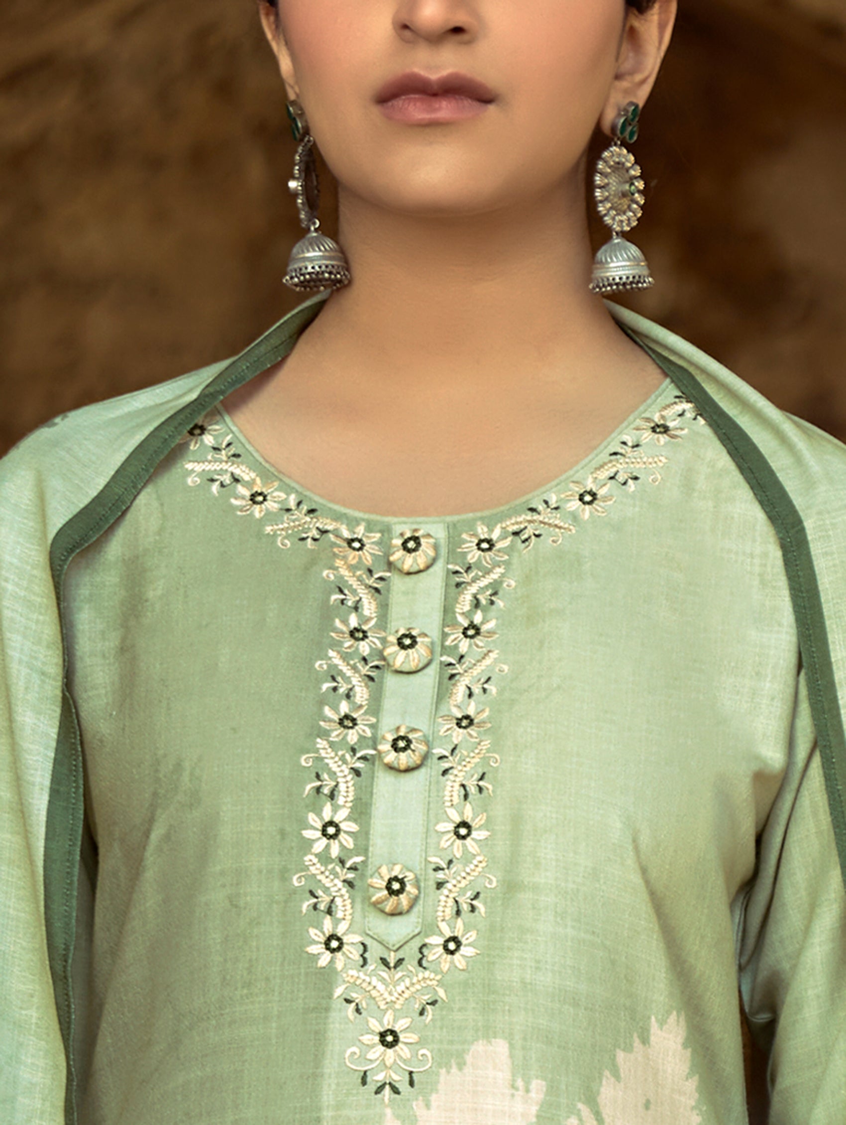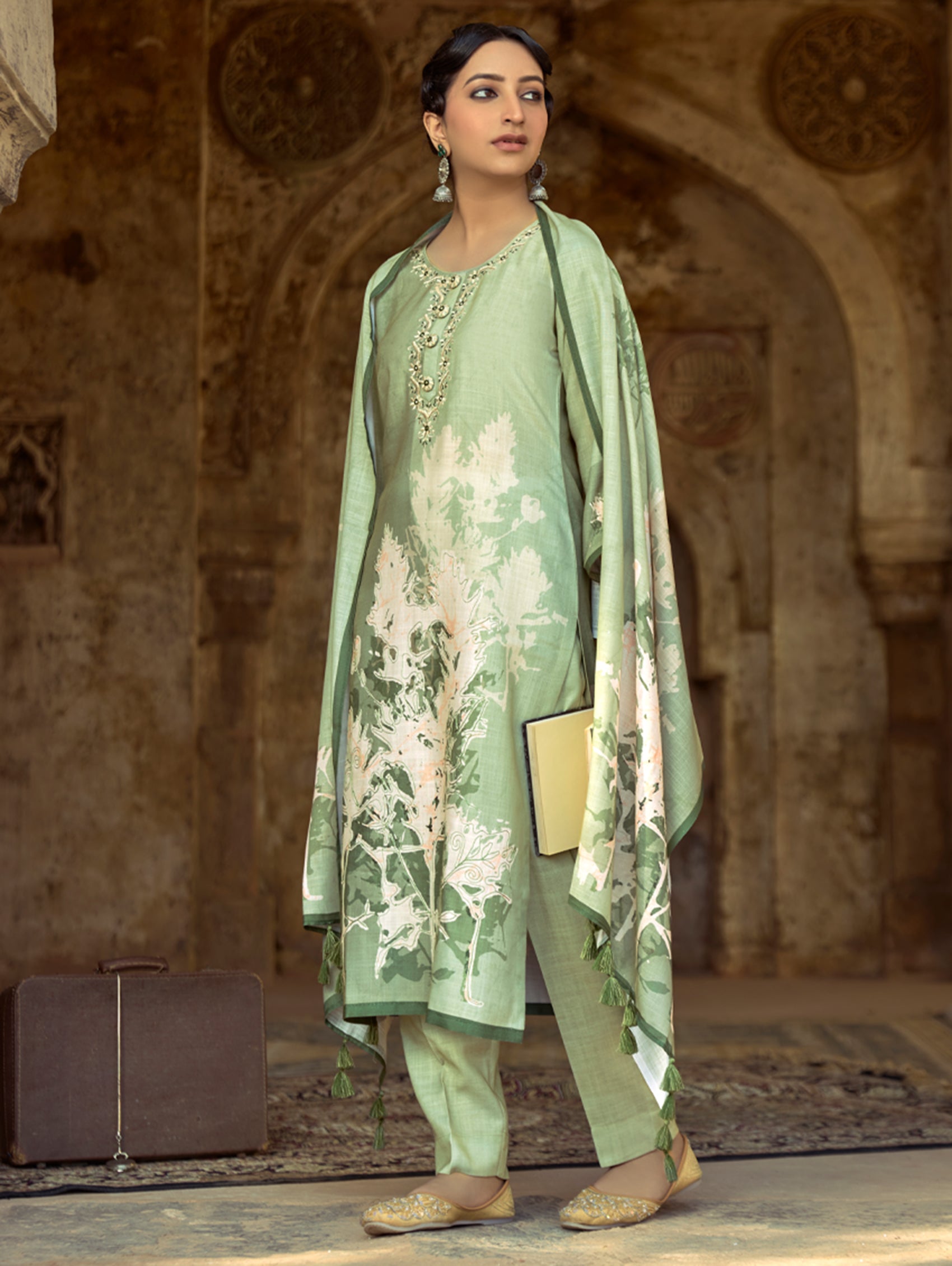 Get ready to elevate your style with this essential set! Embrace your inner trendsetter and indulge in the digitally printed cotton linen suit set, exuding sophistication and luxury. With a flawlessly designed kurta adorned with aari and computerized thread embroidery, sleek pants, and a coordinating dupatta, this set is sure to captivate and inspire. Experience the mesmerizing and motivating value of this set!
