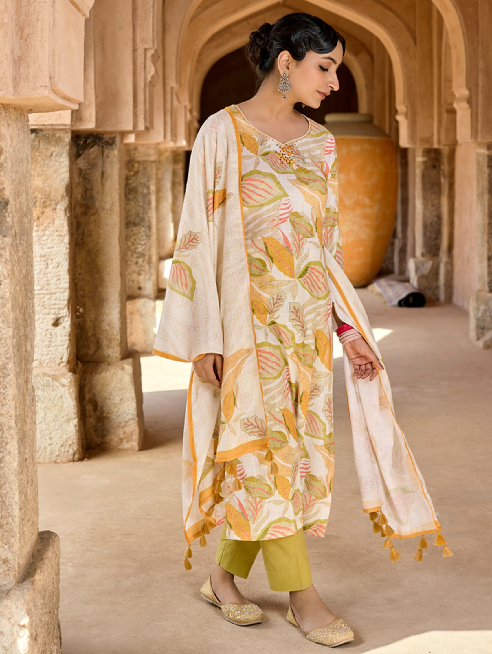 Discover the irresistible and alluring value of this must-have set! Unleash your inner fashion icon with this digitally printed cotton linen suit set, radiating elegance and opulence. Featuring a meticulously crafted kurta embellished with hand embroidery, stylish pants, and a matching dupatta. Transform your look with the enchanting and invigorating impact of this set!
