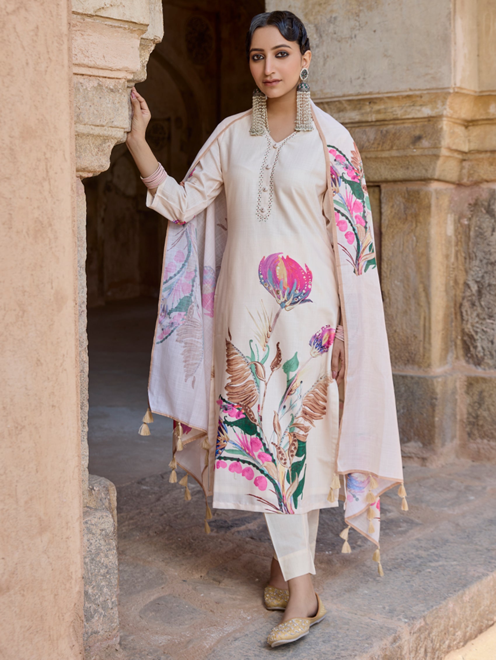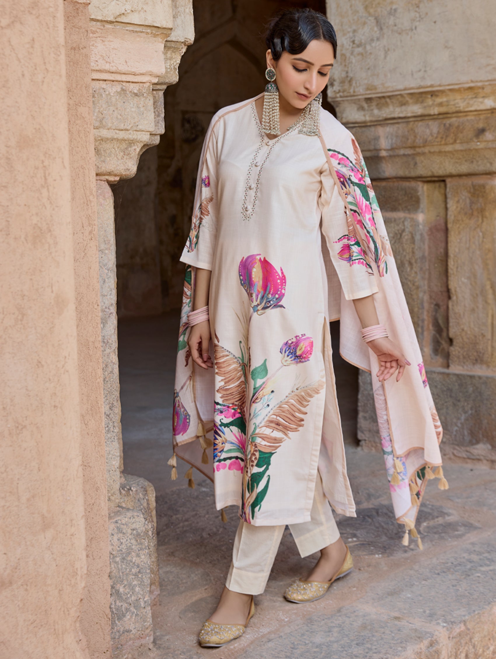 • Kurta with pants and digitally printed cotton linen dupatta