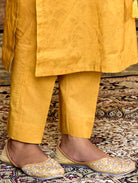 • Kurta with round neckline, three-fourth sleeves, and side slits open
