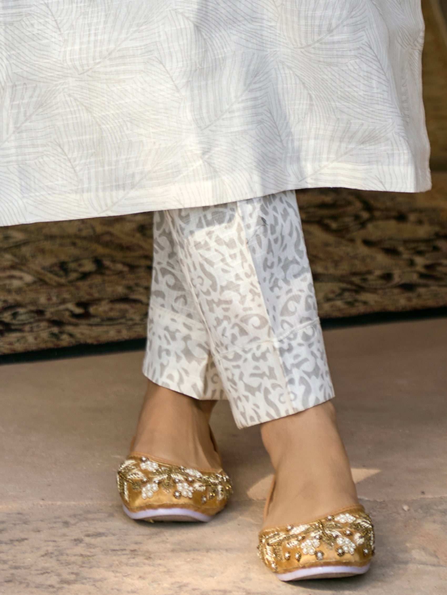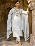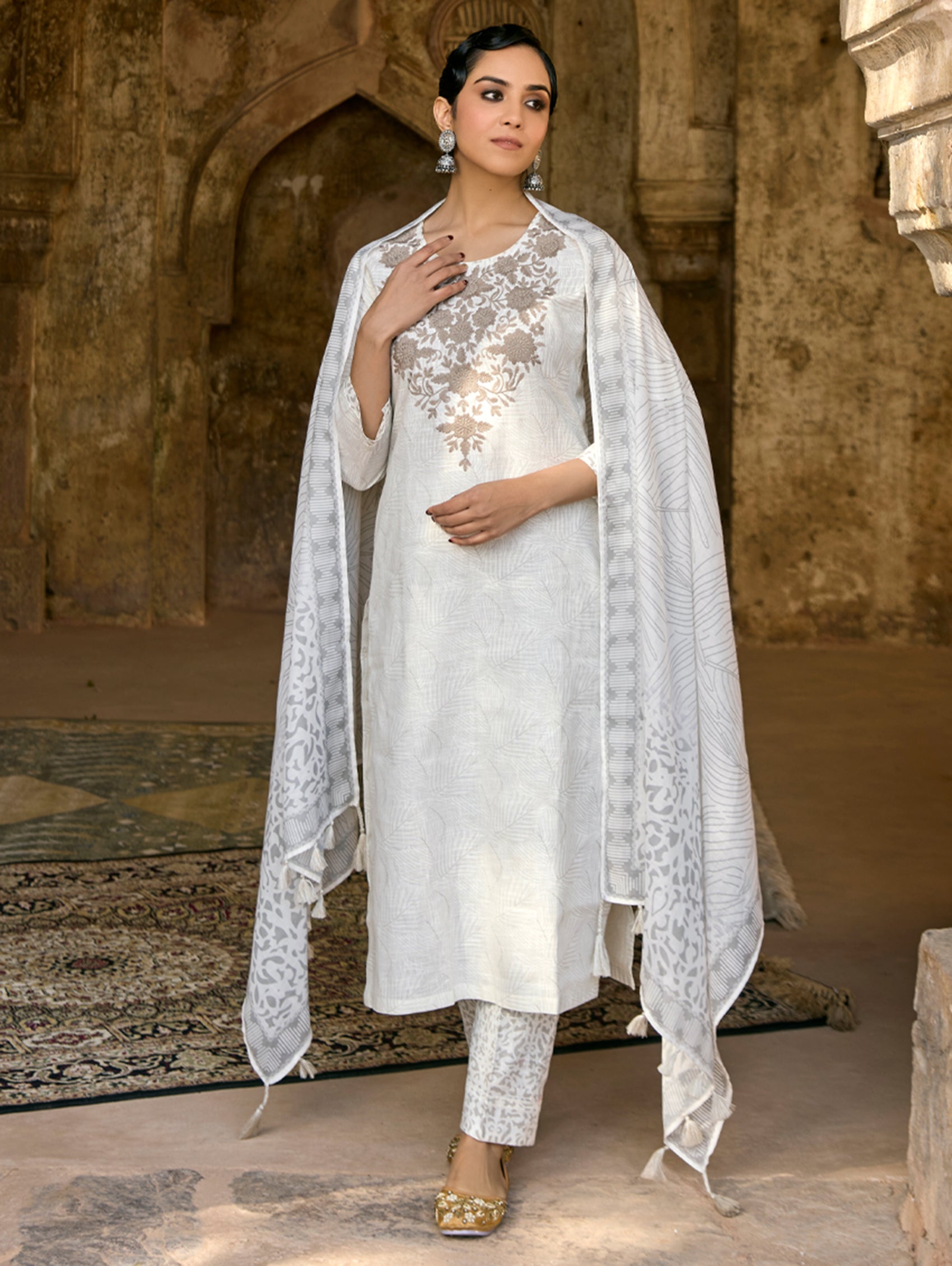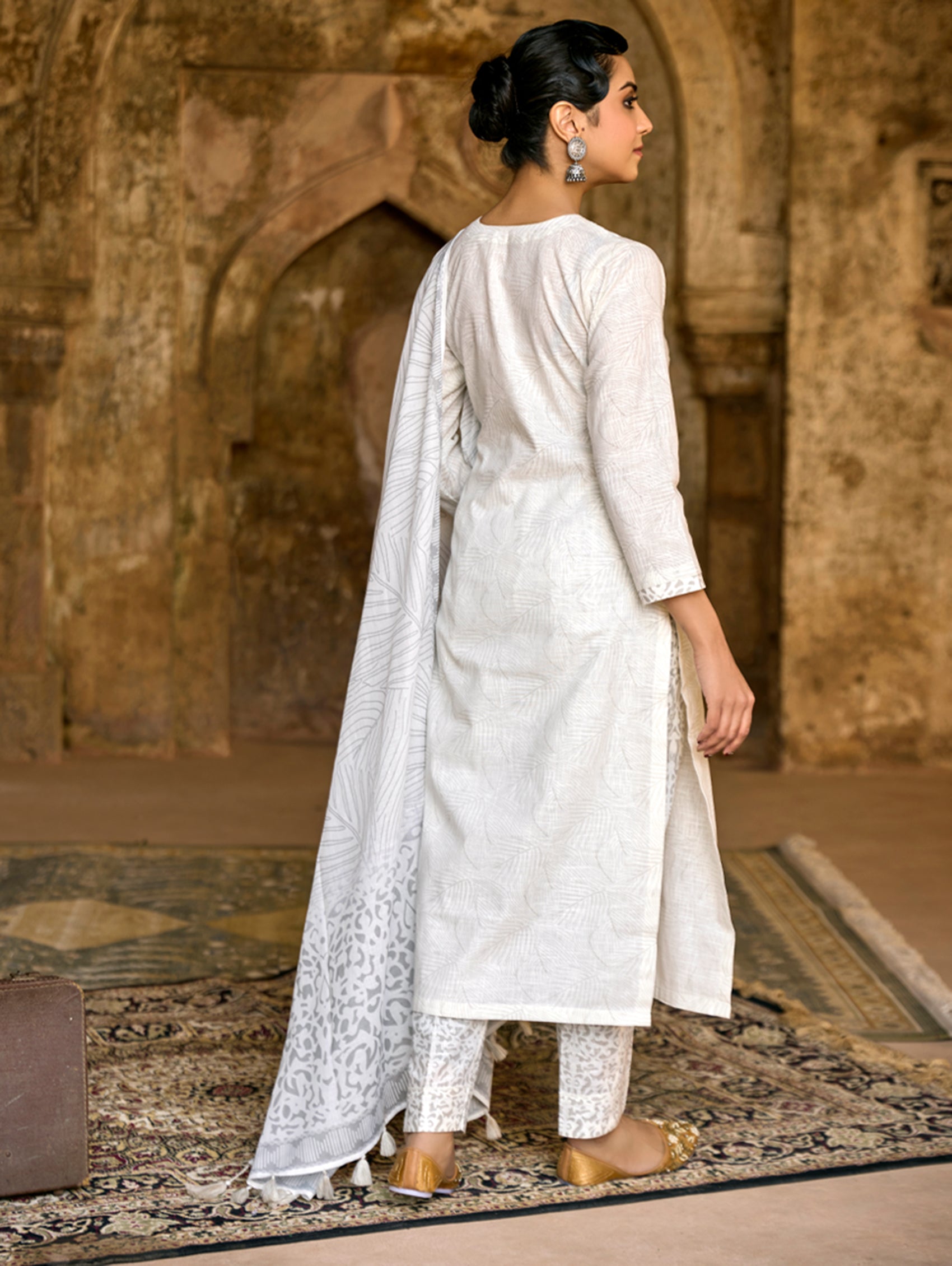 This stunning straight-cut suit set is a must-have for all fashion lovers looking to enhance their wardrobe. Featuring intricate computerized embroidery on a digitally printed cotton slub kurta, paired with straight pants and a digitally printed cotton mul dupatta, it effortlessly brings an air of elegance and charm to any assortment.