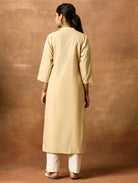 • Kurta with ban collar, three-fourth sleeves, and side slits open.