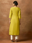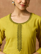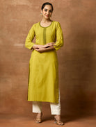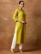 • Kurta with round neckline, three-fourth sleeves, and side slits open.
