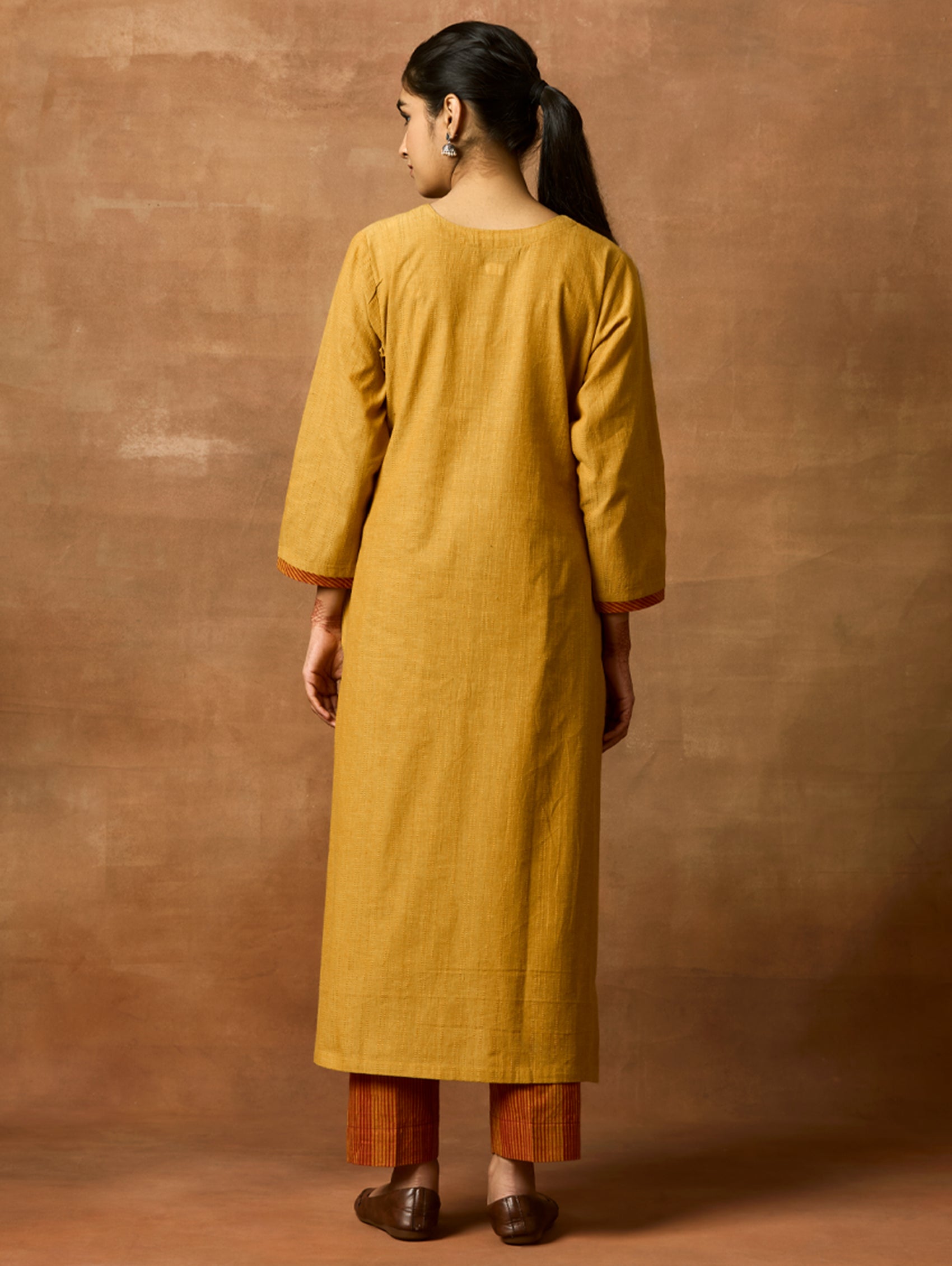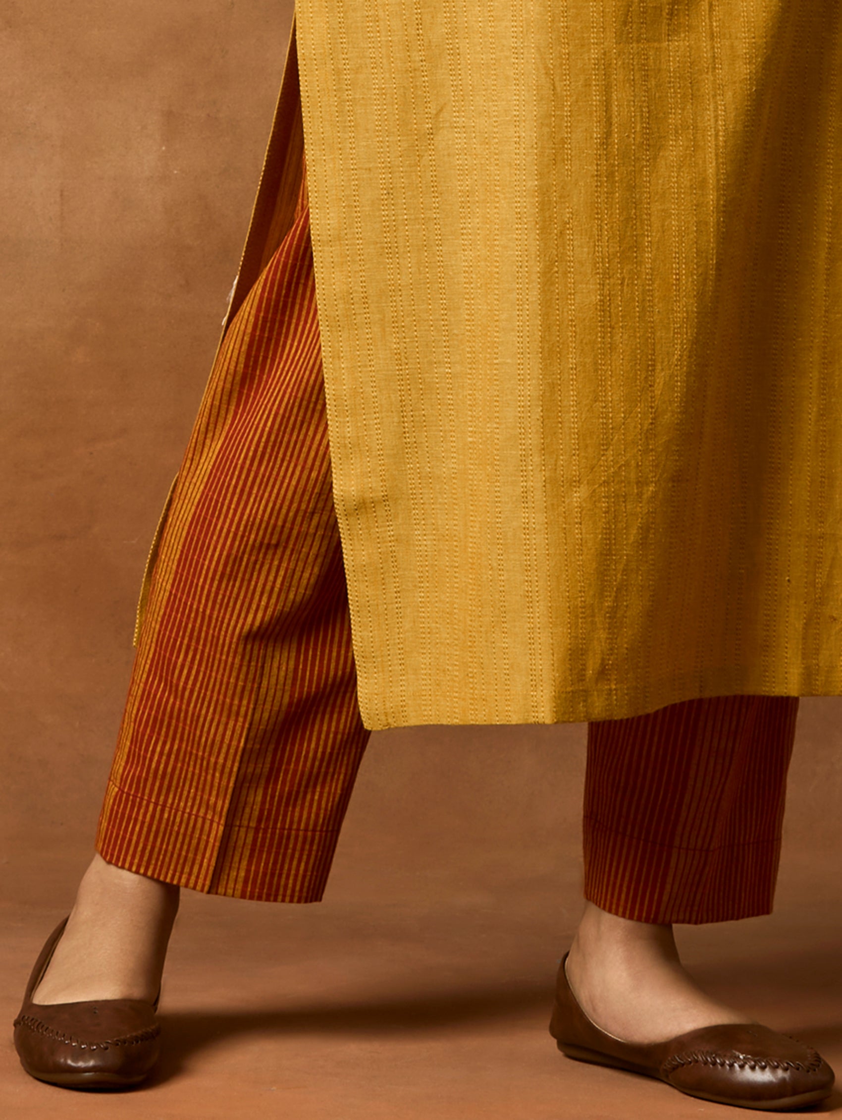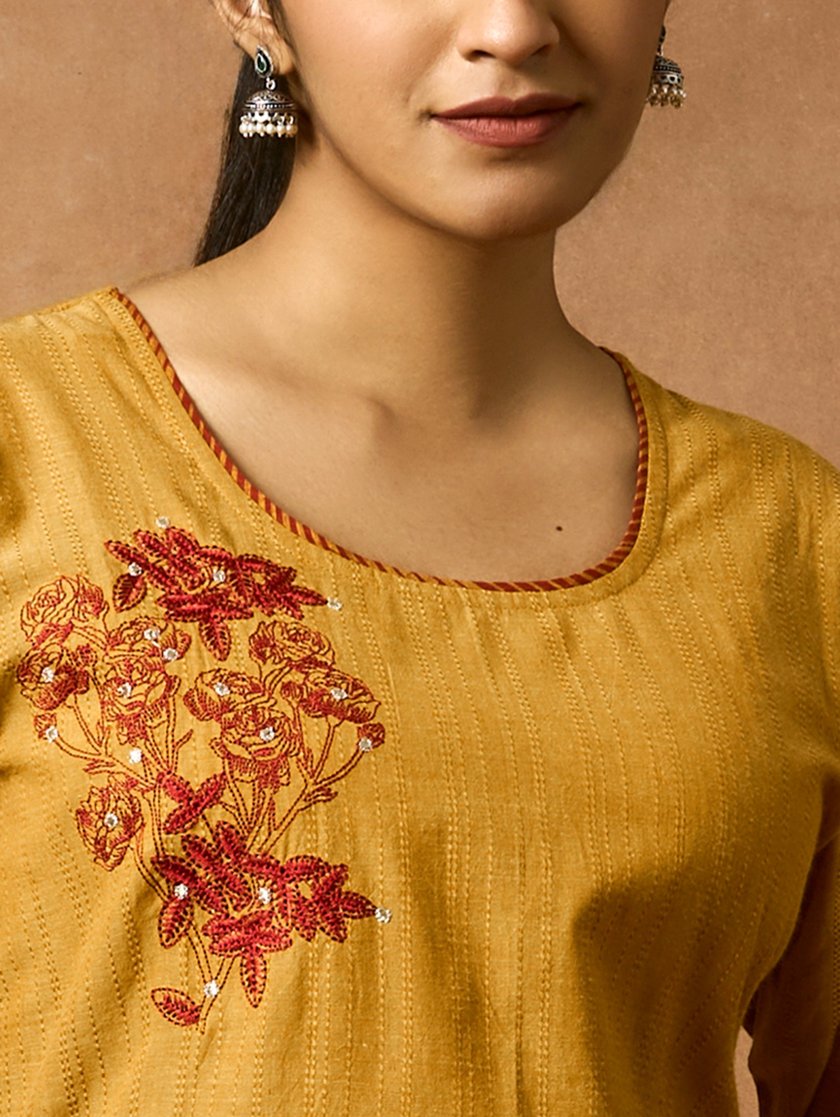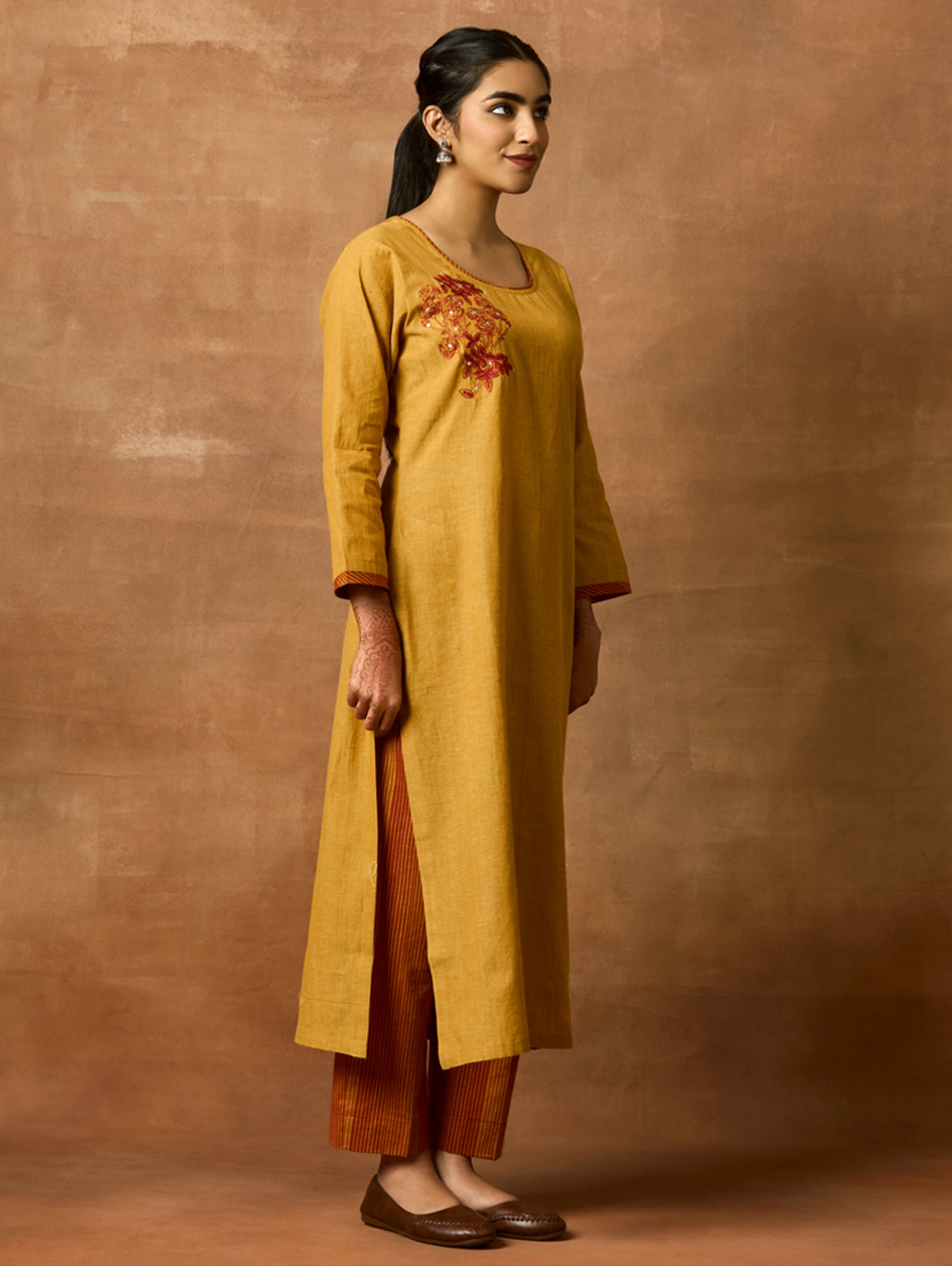 This kurta pants set is a must-have for your casual wardrobe! Crafted from pure cotton, it features a beautifully embroidered kurta with a round neckline and straight pants. The partially elasticated waistband and handy side pockets make these pants both comfortable and practical. Elevate your everyday style with this stunning set!