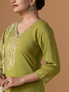 • Kurta with V-neckline, three-fourth sleeves, and side slits open