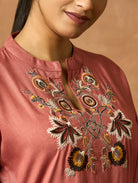 • Kurta with ban collar, three-fourth sleeves, and side slits open.
