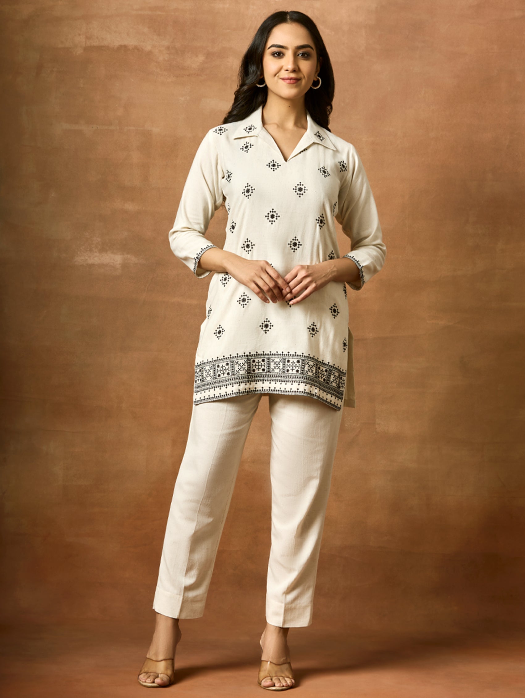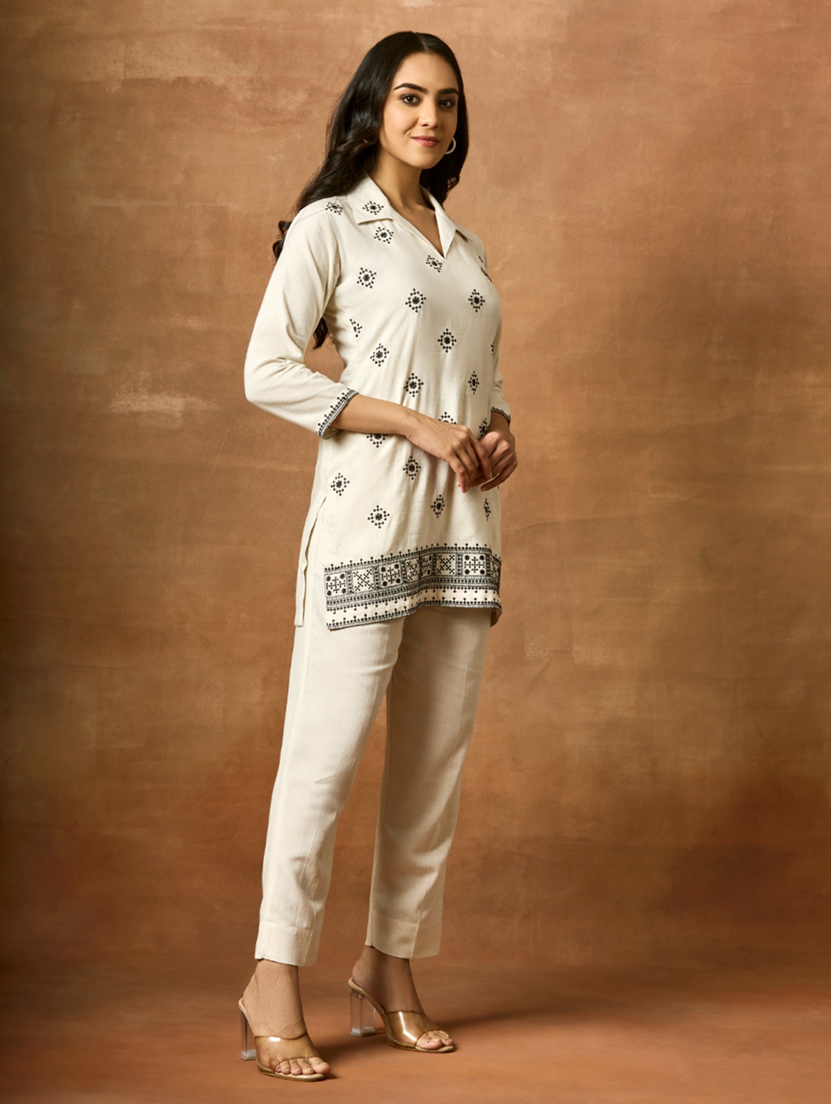 Experience effortless style and comfort with our stunning ethnic co-ord set, featuring a short kurti with a revere collar, three-fourth sleeves, and regular pants with a partially elasticated waistband and spacious pockets. Discover everyday outfits that exude beauty and charm!