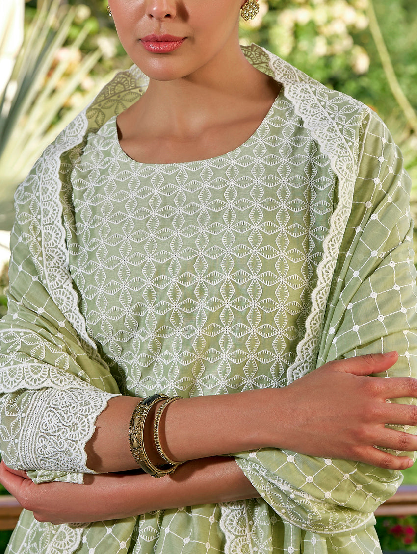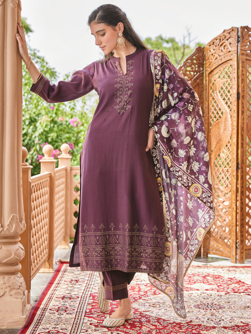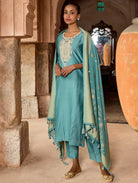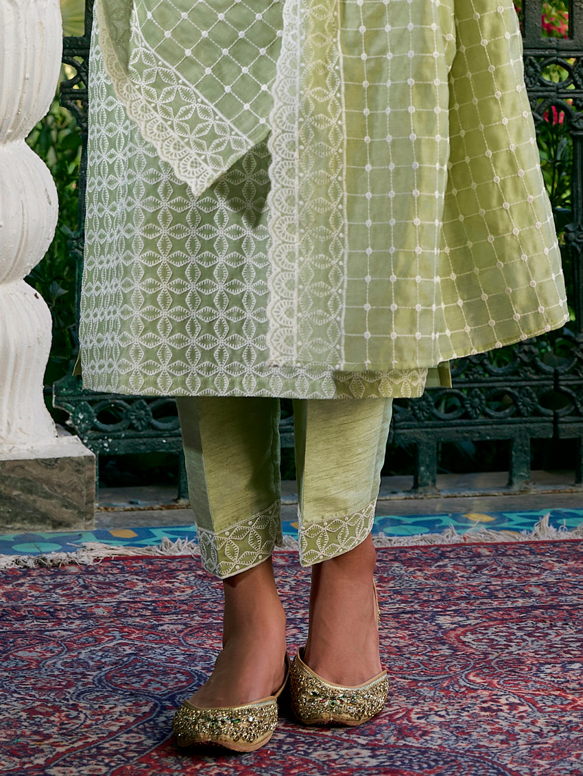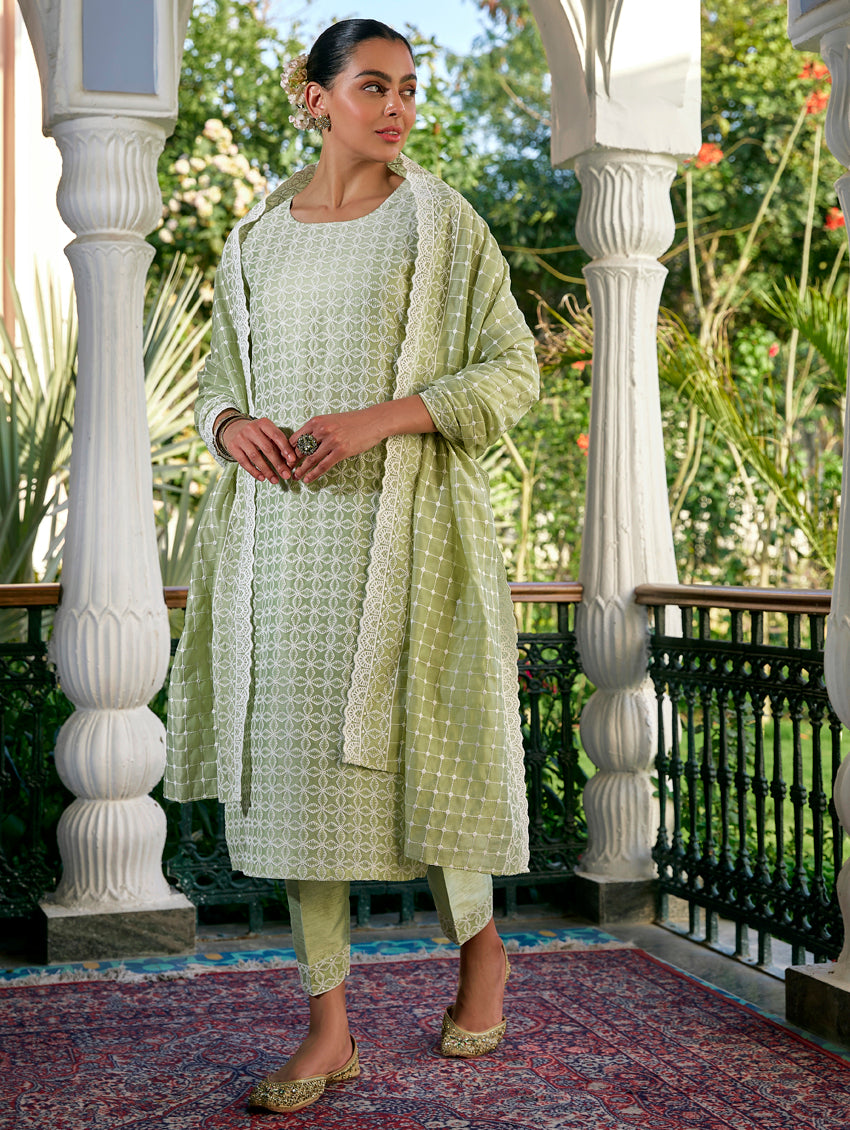 Transform your everyday style with this stunning suit set from our newest collection! Indulge in the luxurious feeling of a smooth viscose kurta adorned with intricate cording thread embroidery. Paired with traditional trousers and a jacquard-woven silk dupatta, this ensemble will elevate your look and empower you with confidence wherever you choose to wear it.