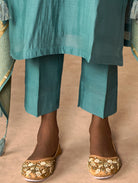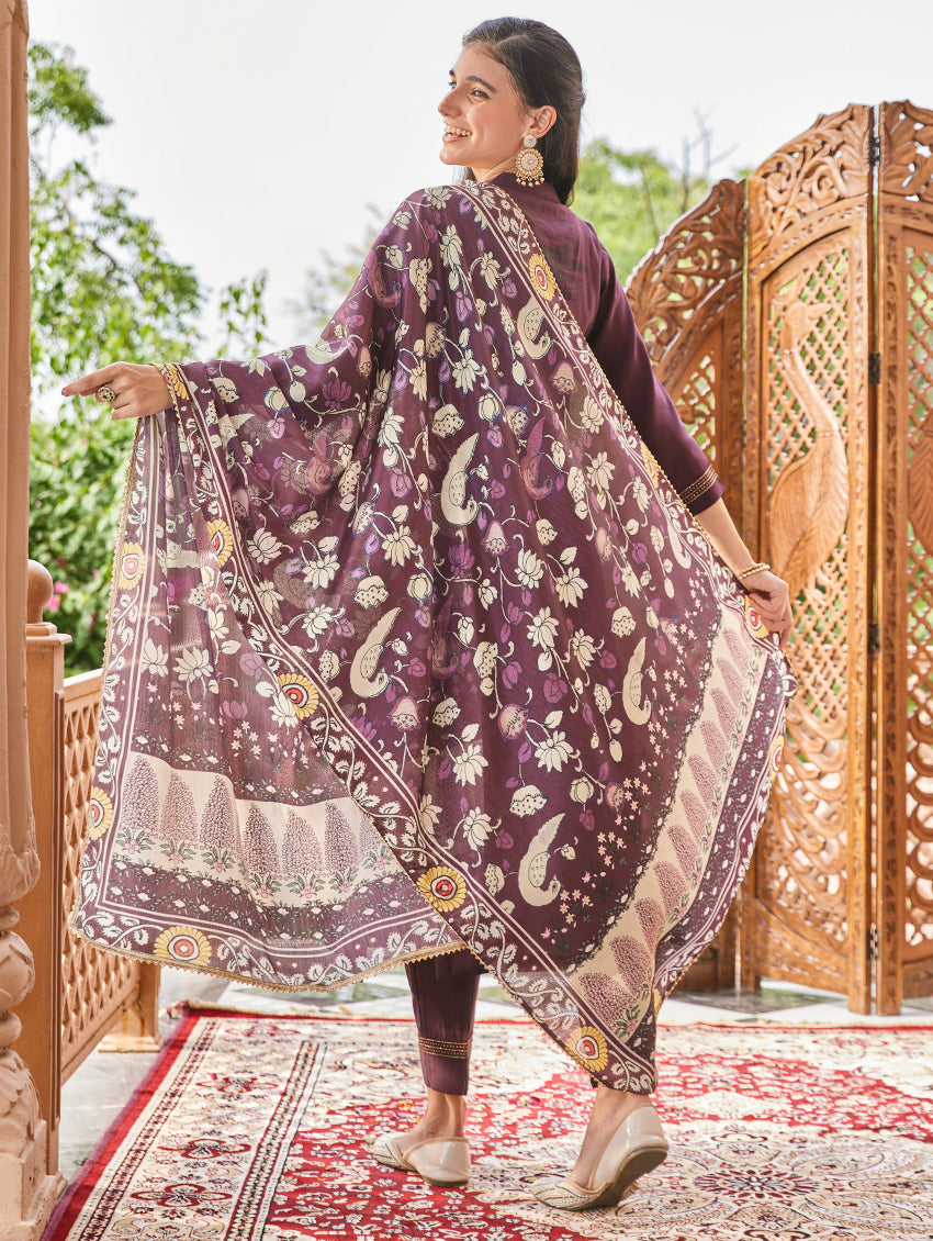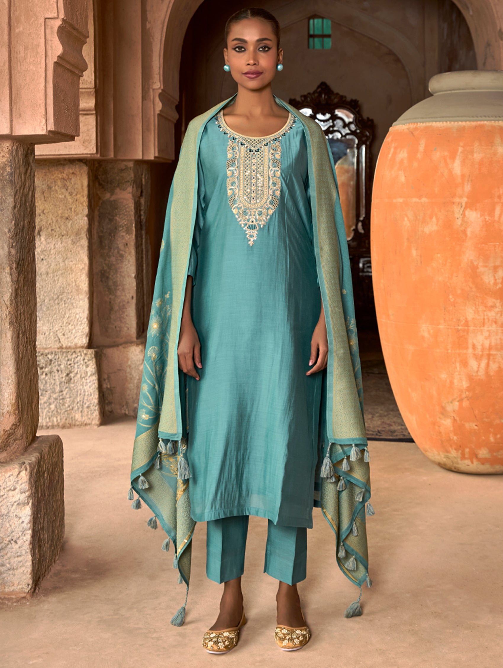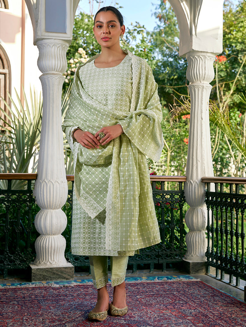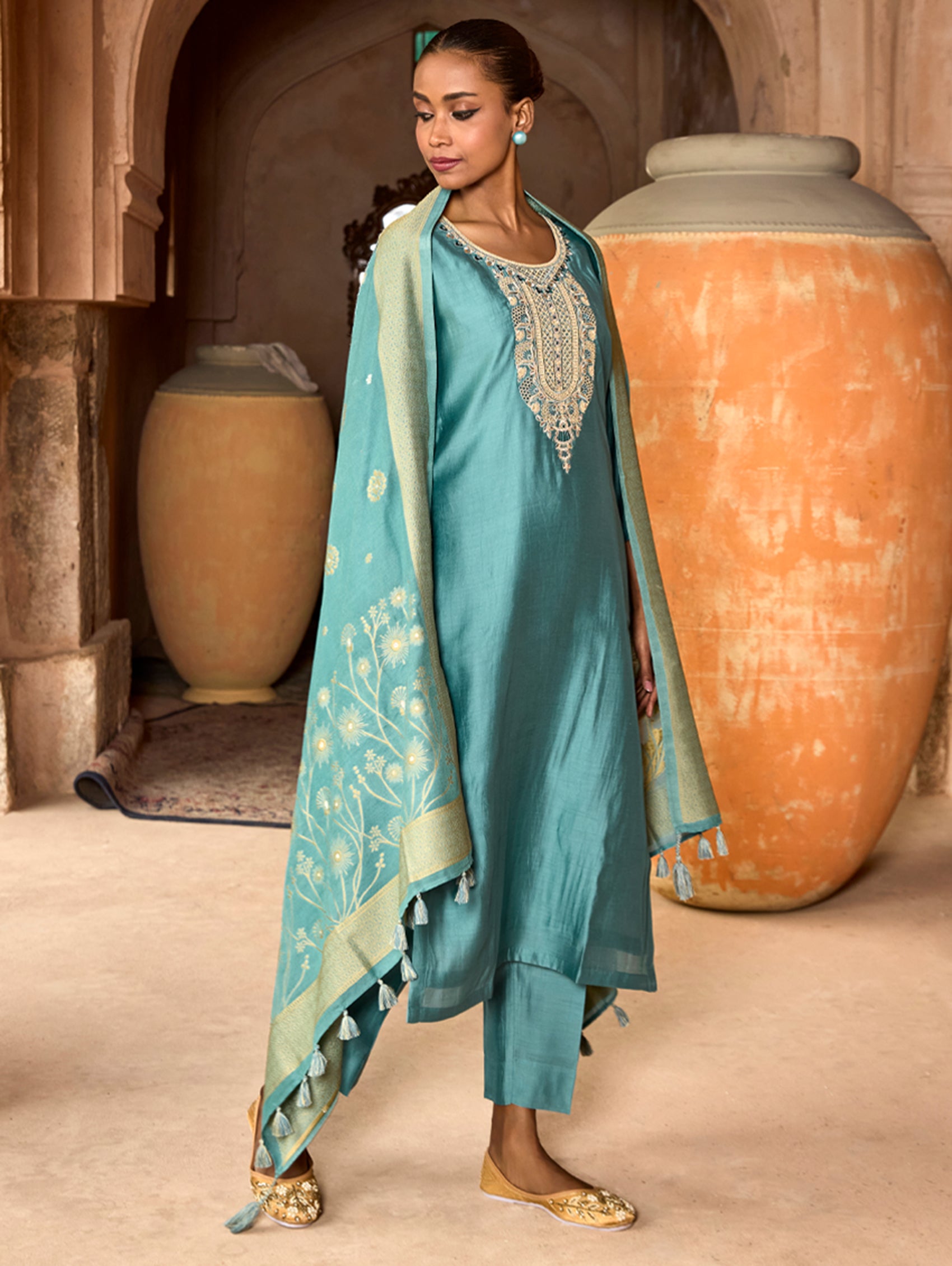 • Solid coloured kurta with pants and jacquard weave silk dupatta