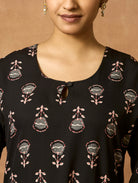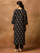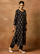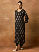 • Kurta with round neckline, three-fourth sleeves, and side slits open.