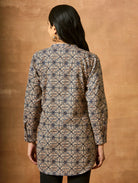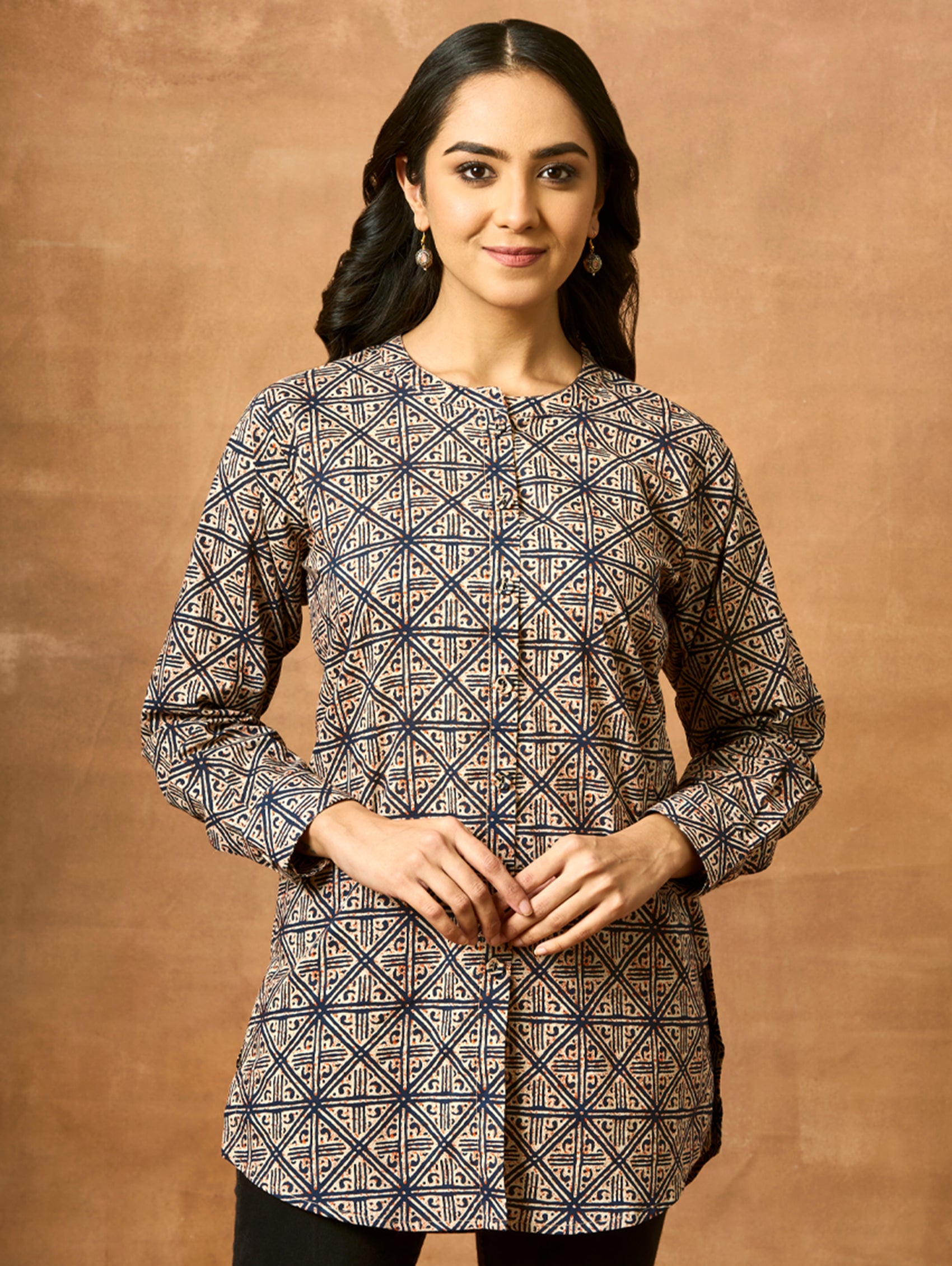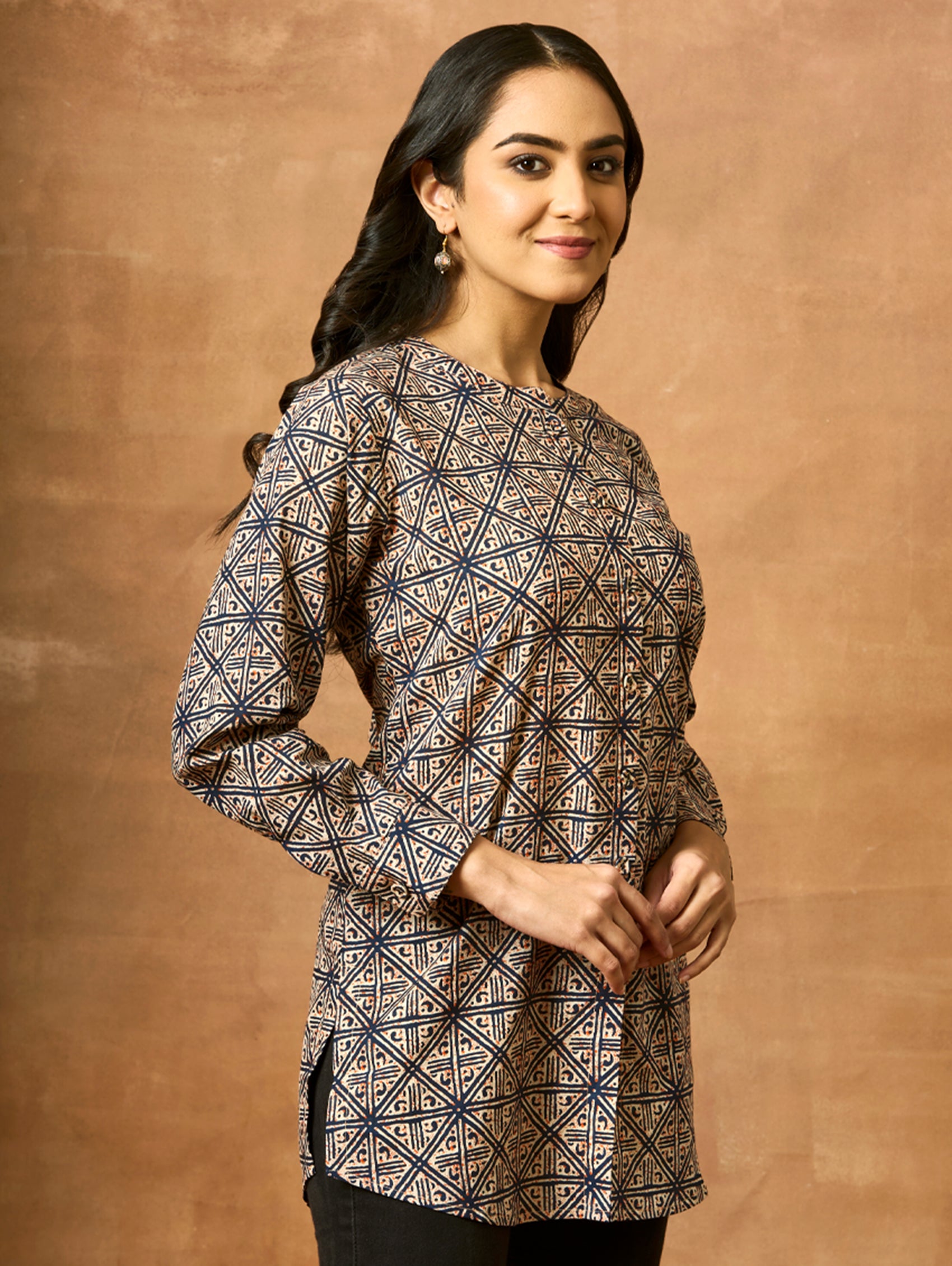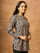 Discover our newest addition - a stunning printed pure cotton short kurti featuring a mandarin collar, full sleeves, and open side slits. Admire the impeccably crafted kurta, exuding sophistication and luxury. Elevate your style with this must-have ensemble!