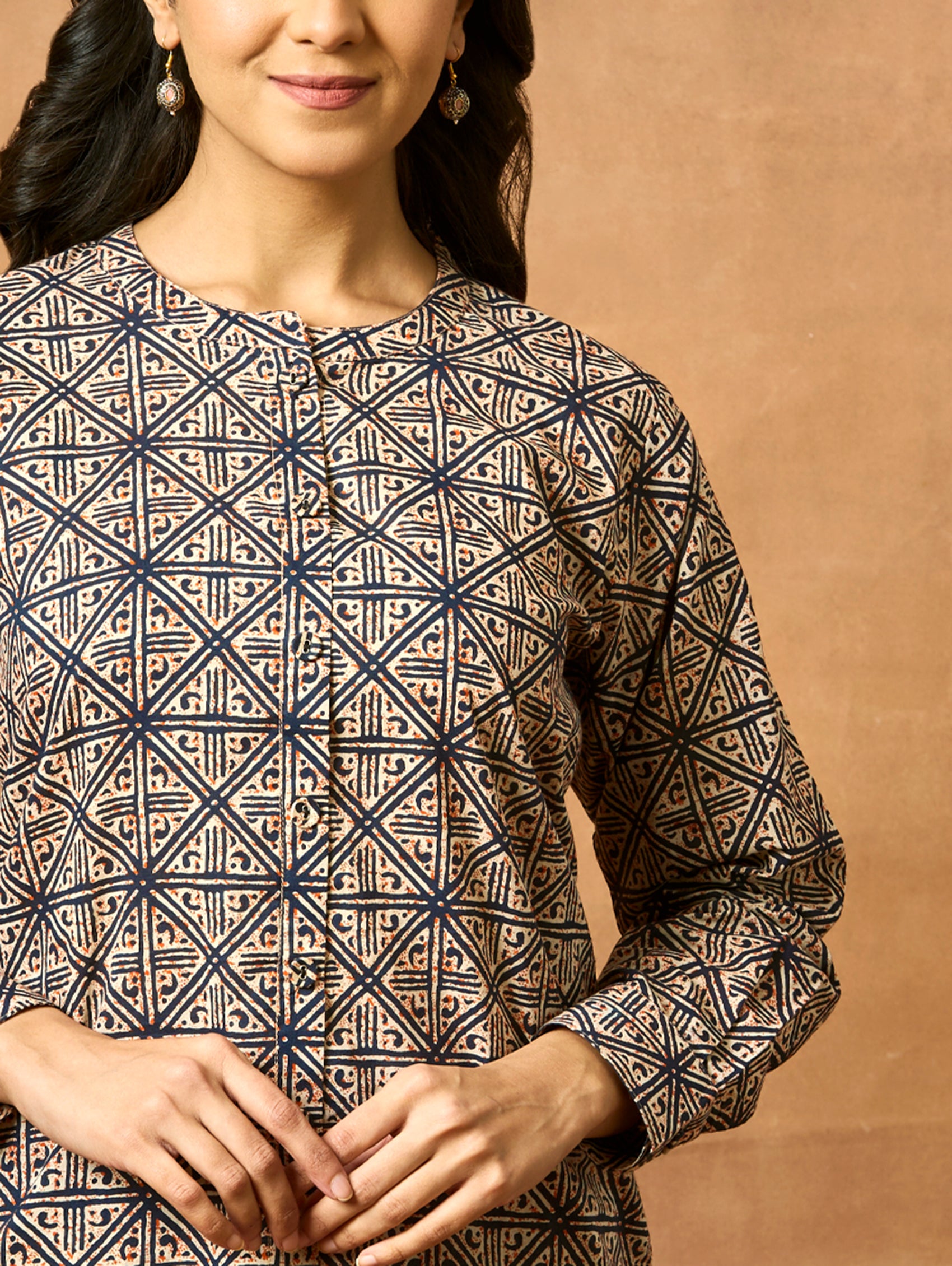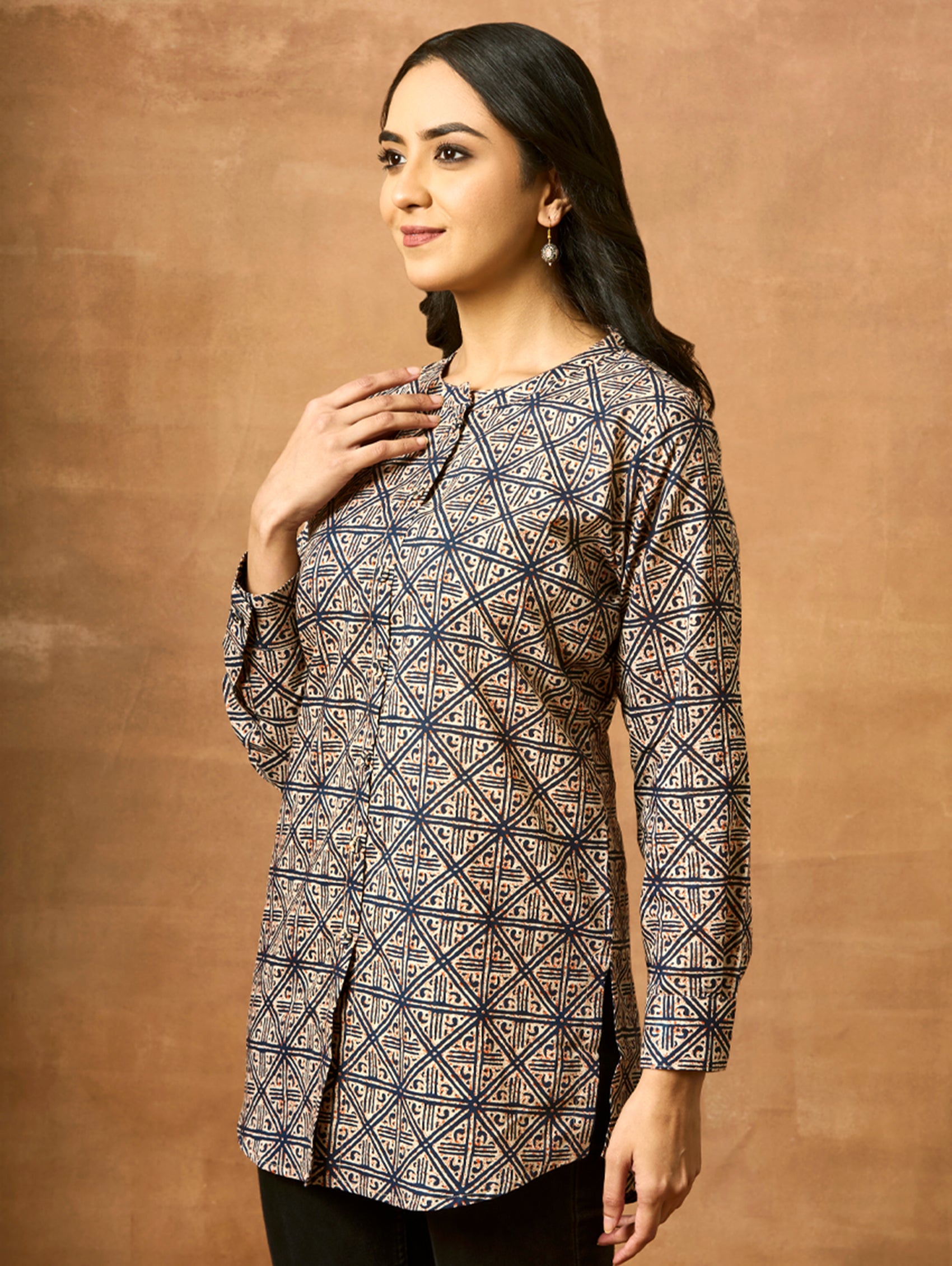 • Short Kurti with mandarin collar, full sleeves, and side slits open