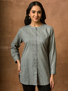 Discover our newest addition - a stunning printed pure cotton short kurti featuring a mandarin collar, full sleeves, and open side slits. Admire the impeccably crafted kurta, exuding sophistication and luxury. Elevate your style with this must-have ensemble!