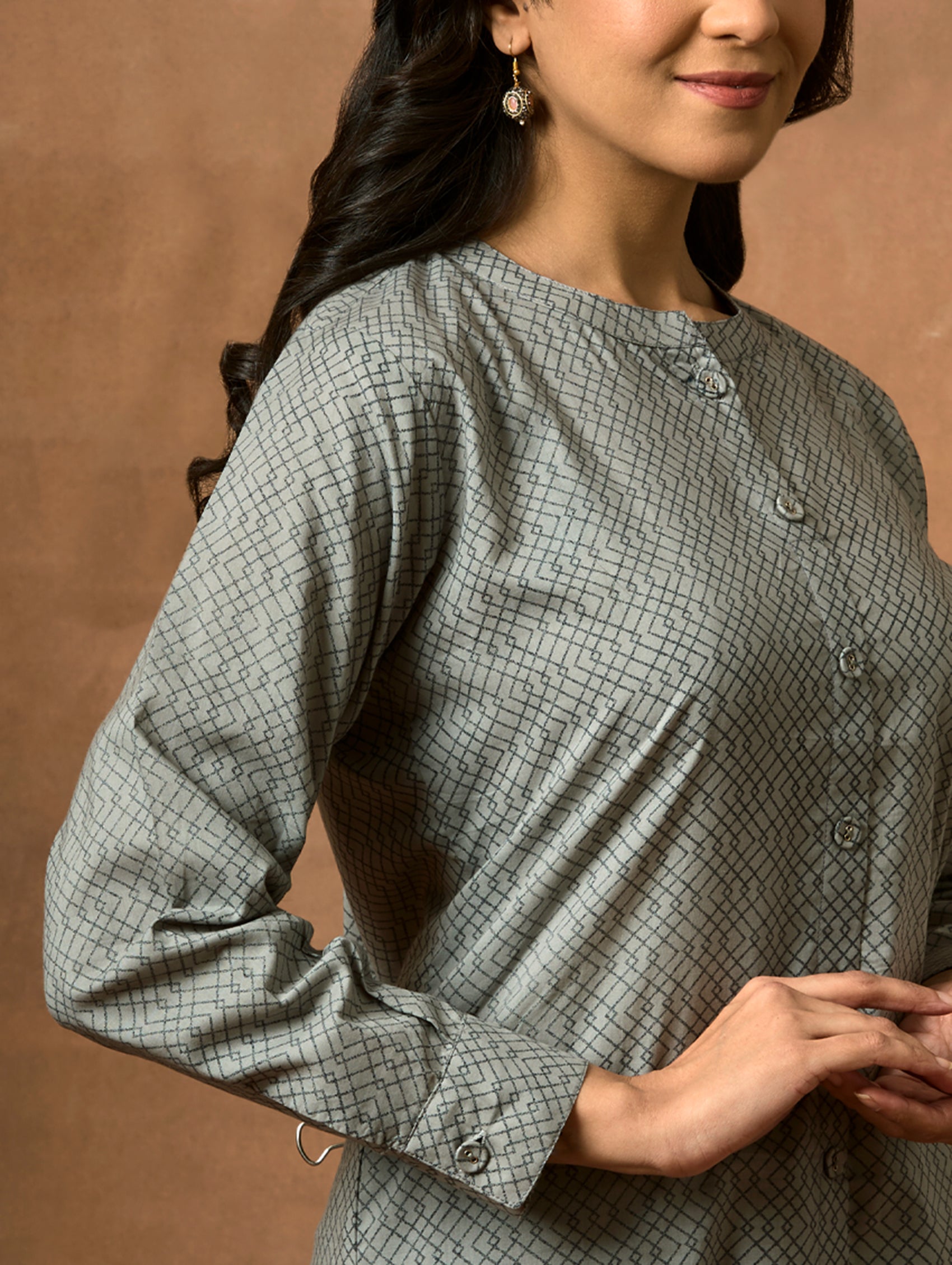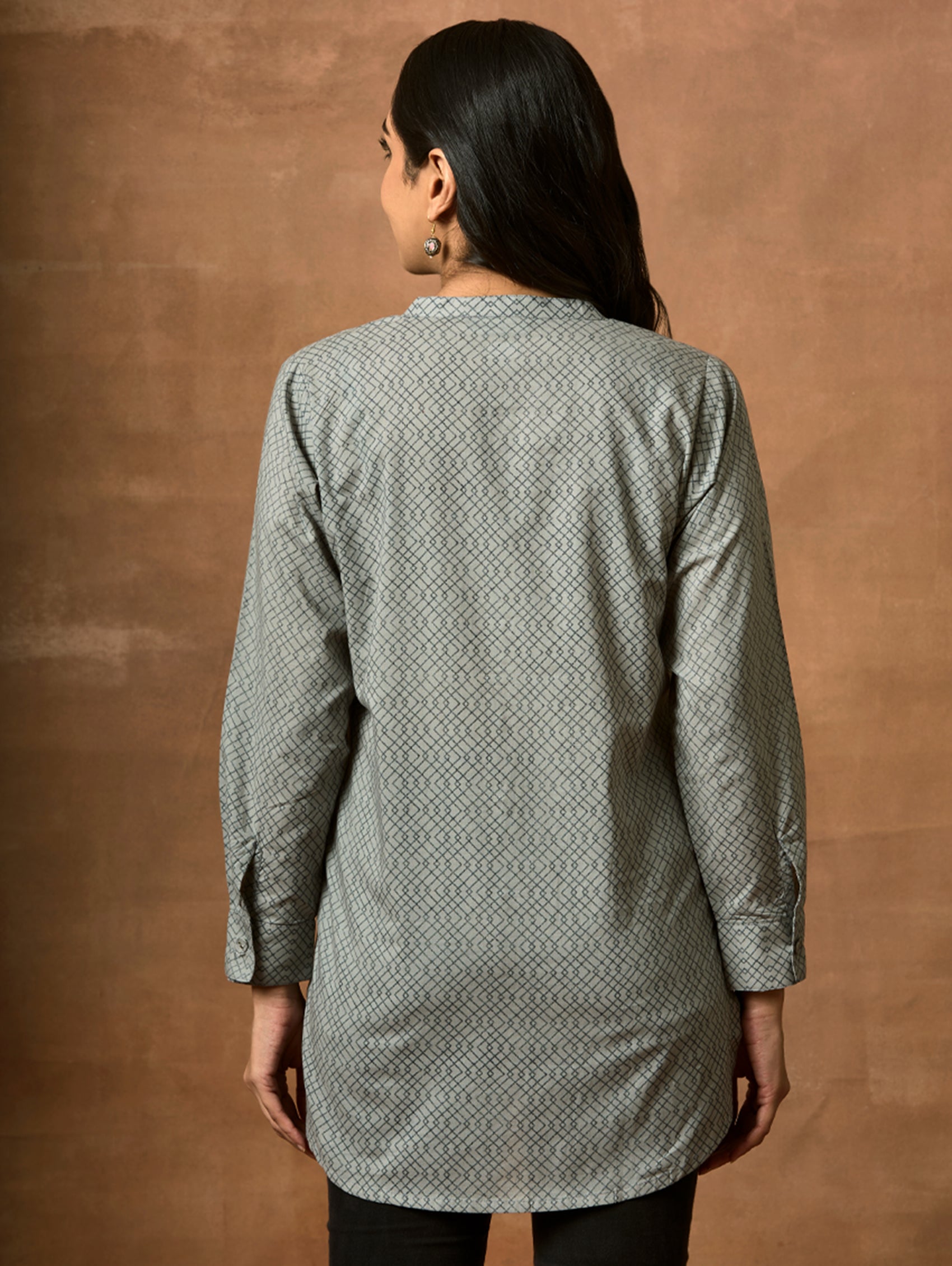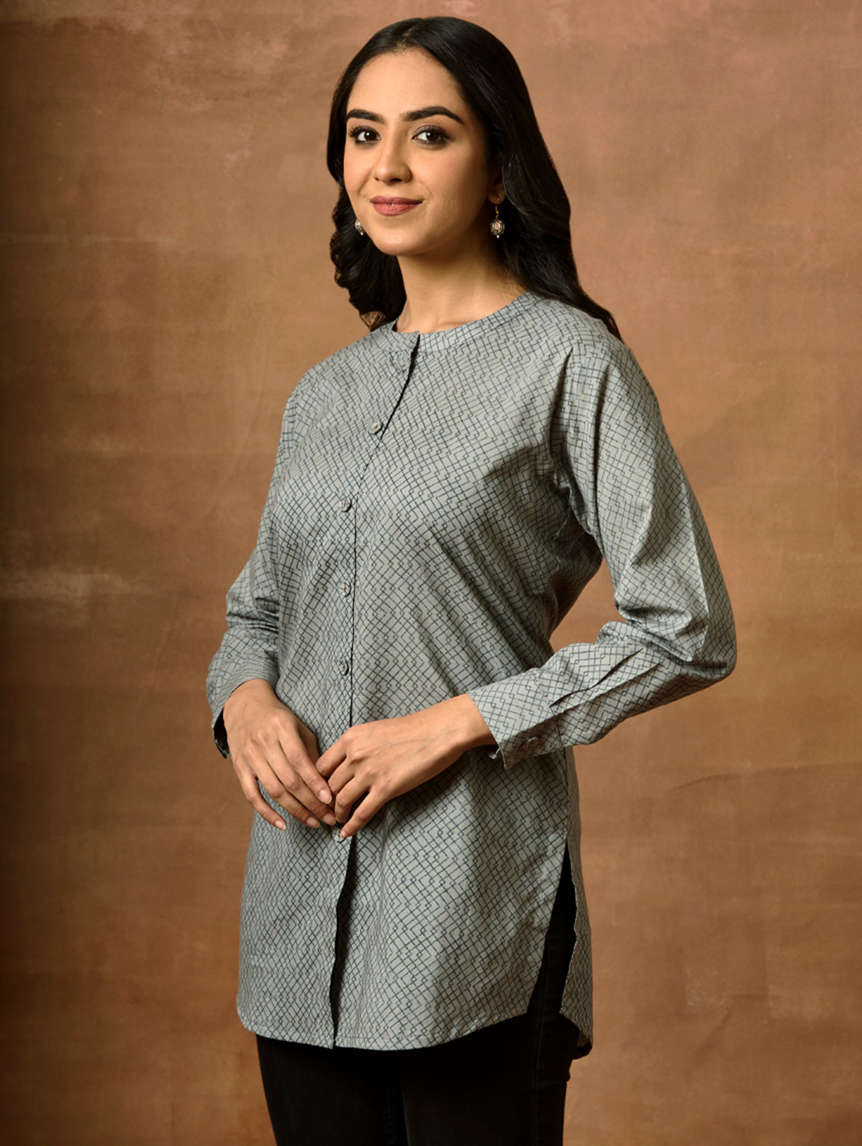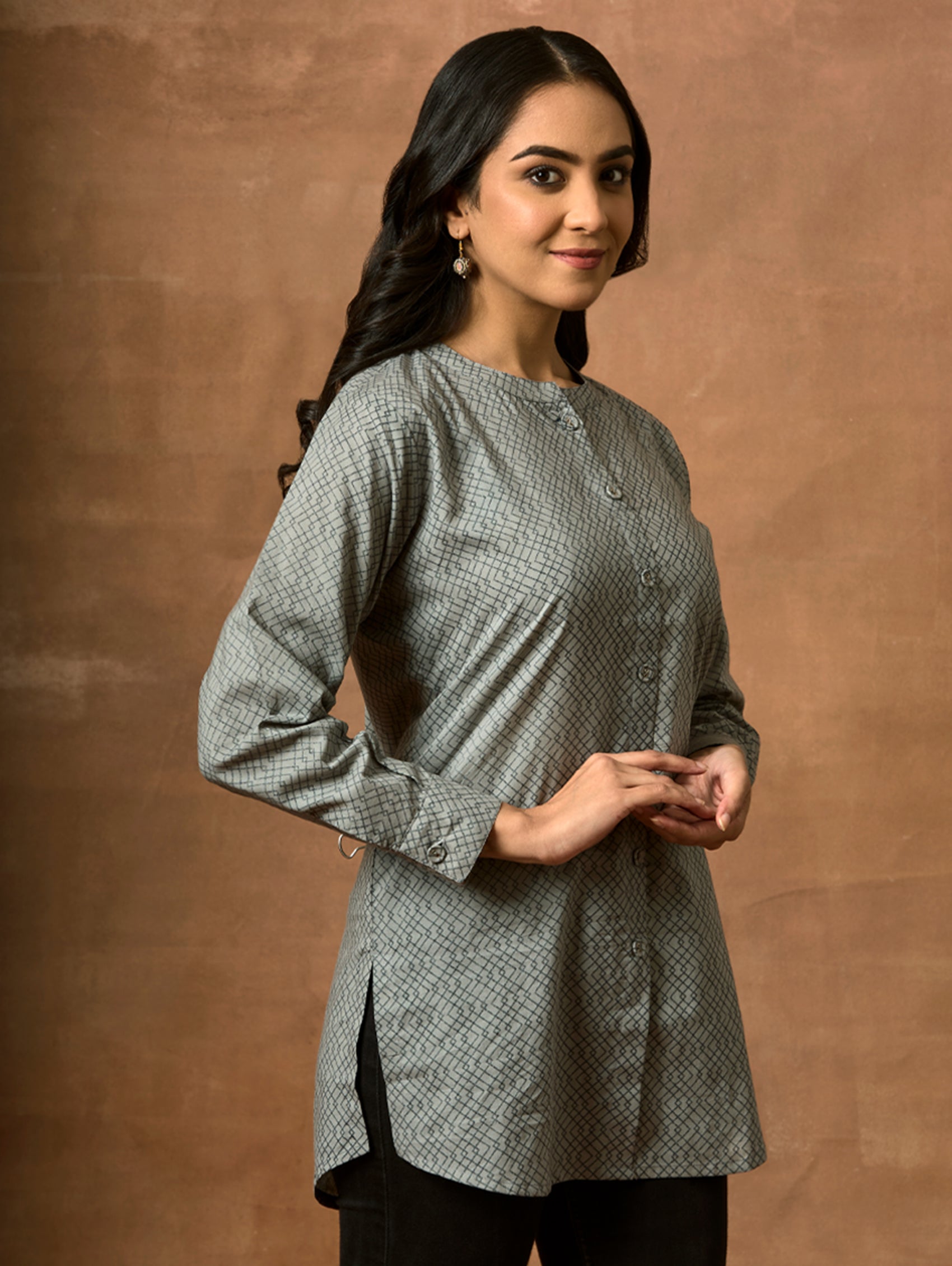 • Short Kurti with mandarin collar, full sleeves, and side slits open