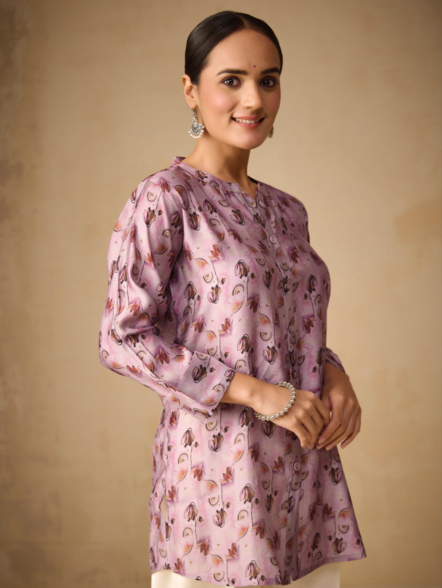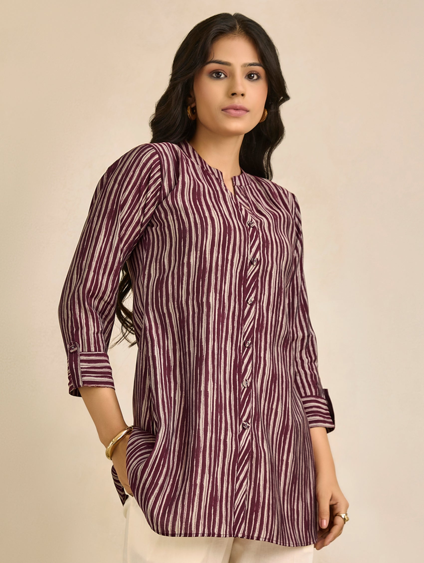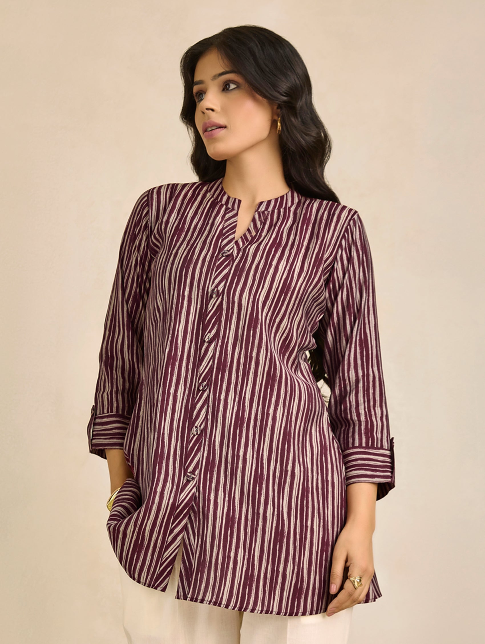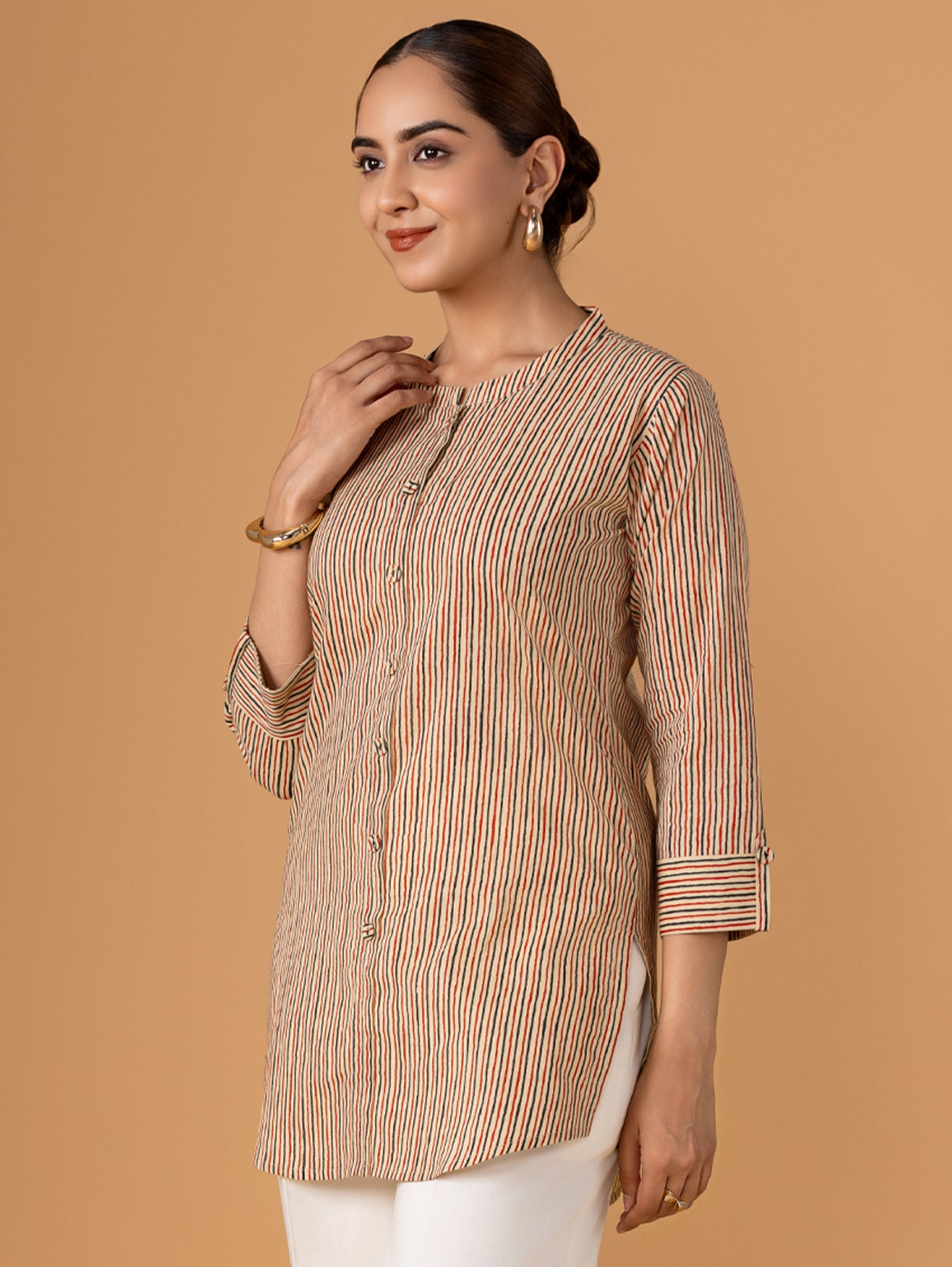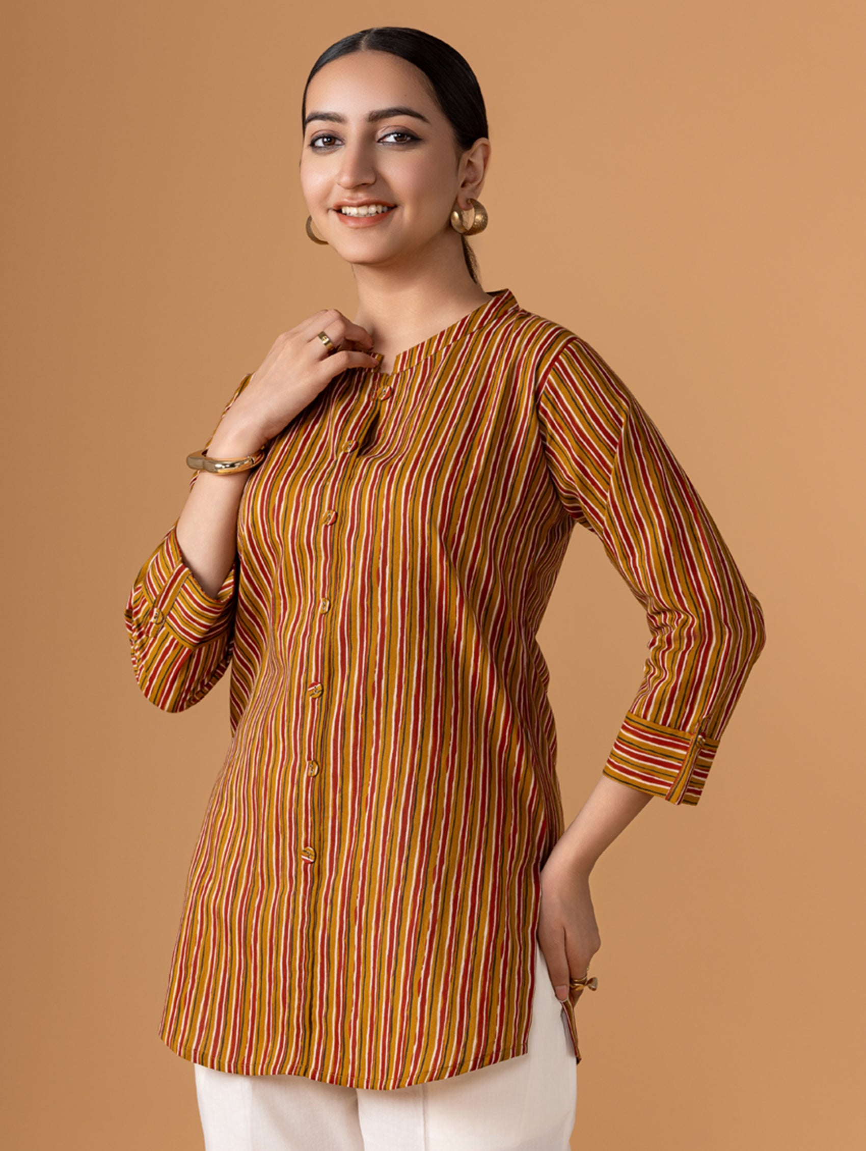 • Short Kurti with mandarin collar, three-fourth sleeves, and side slits open