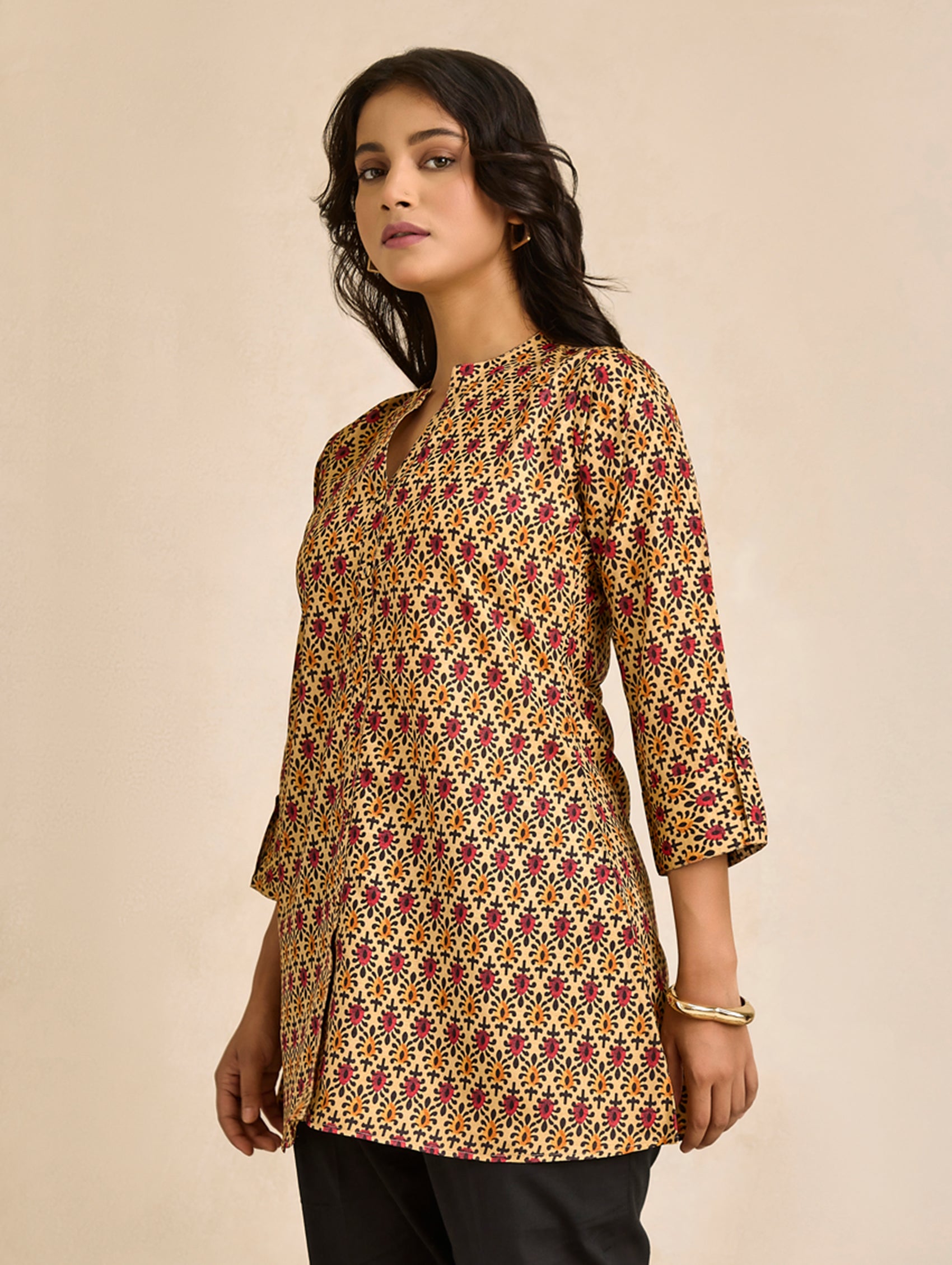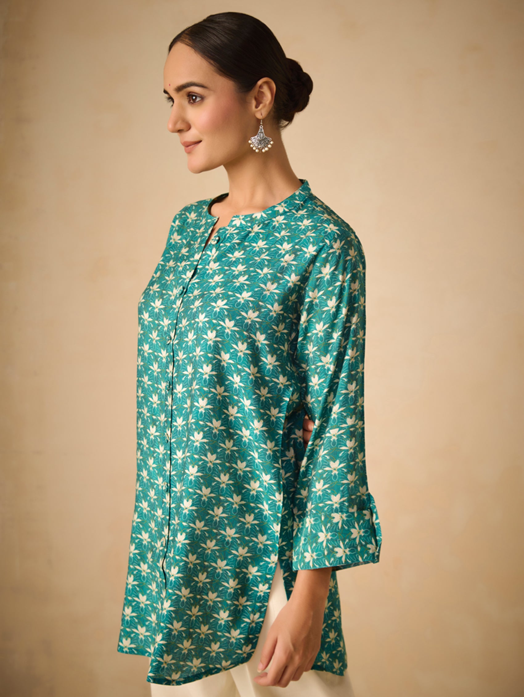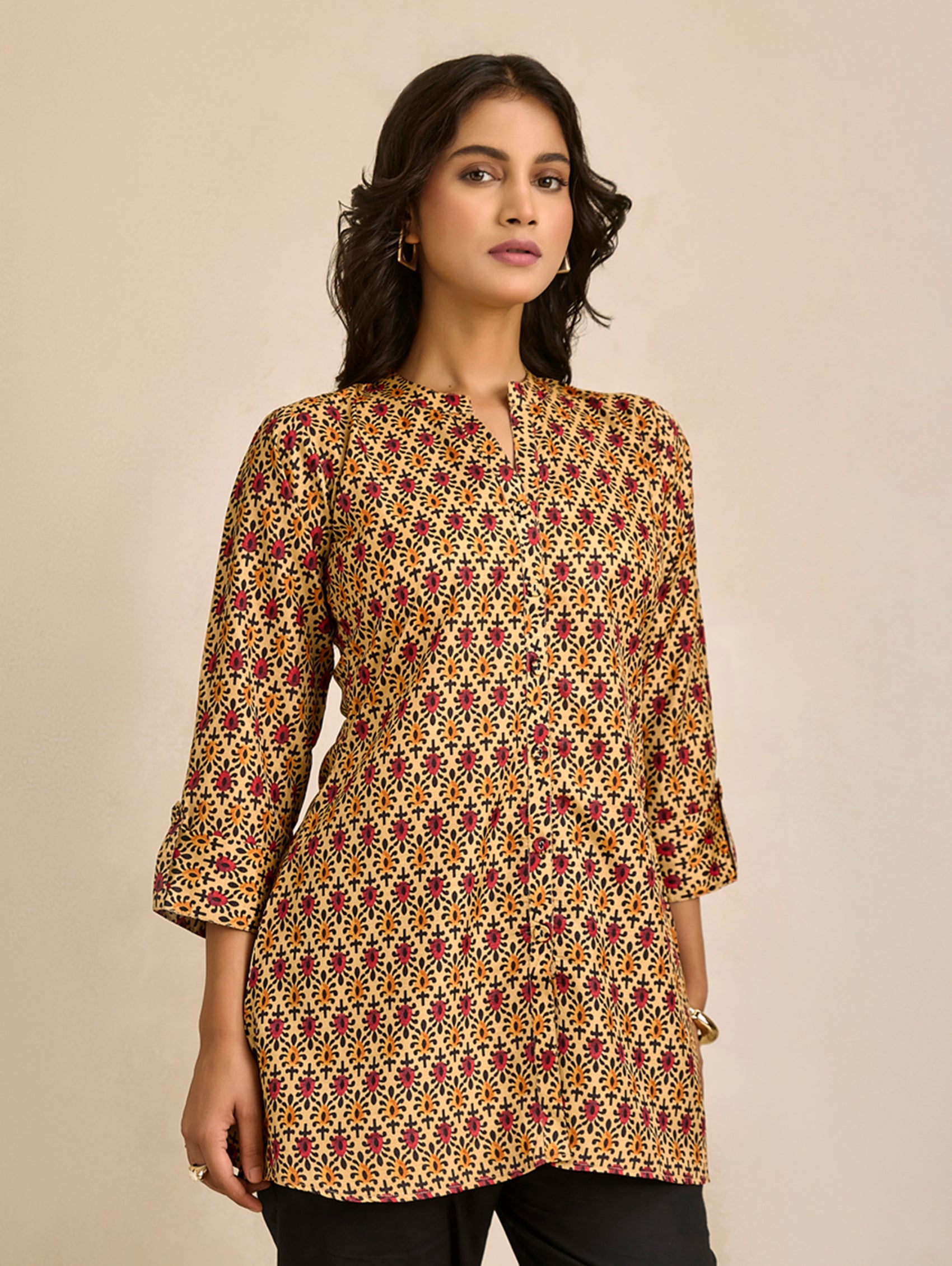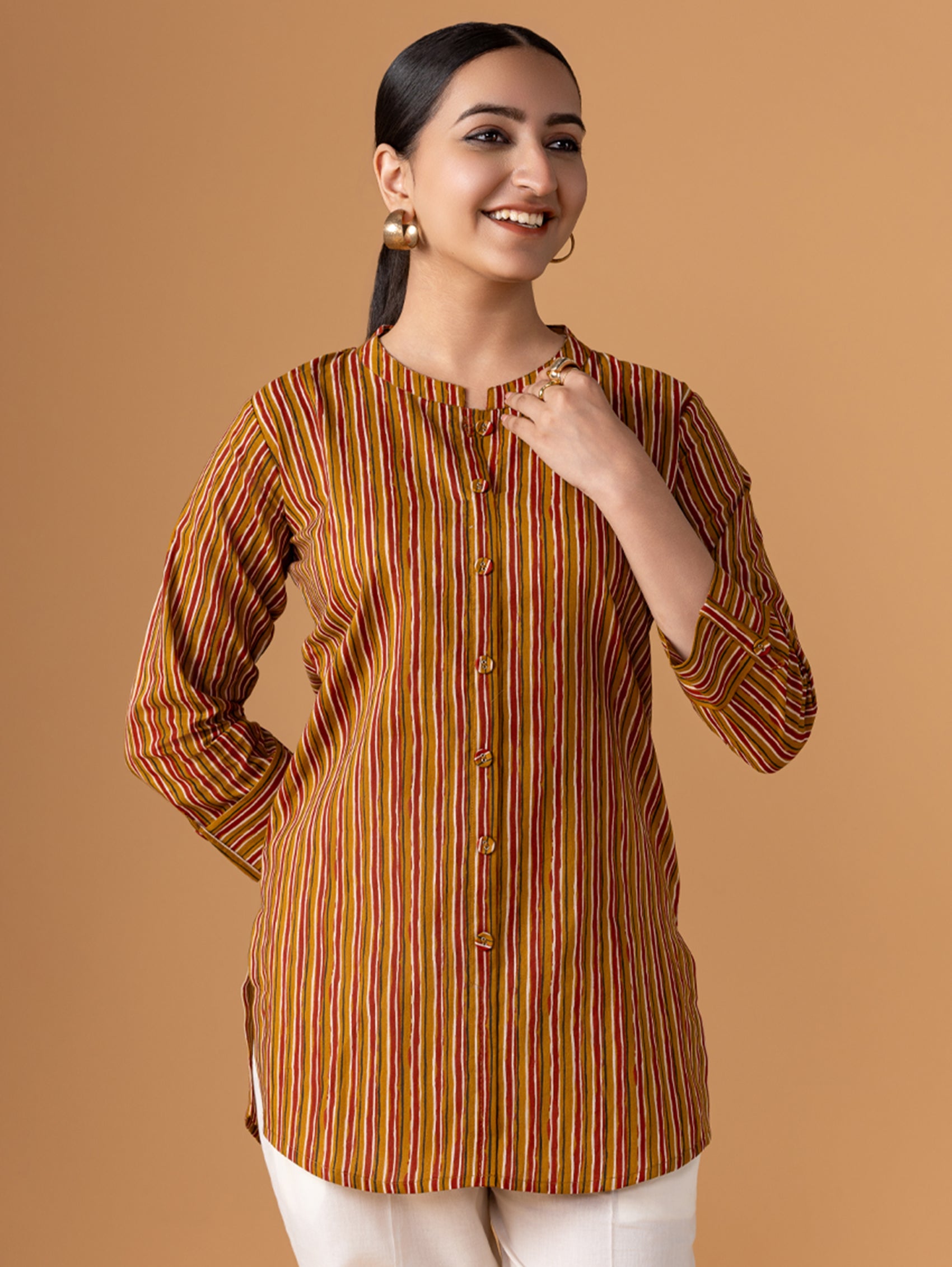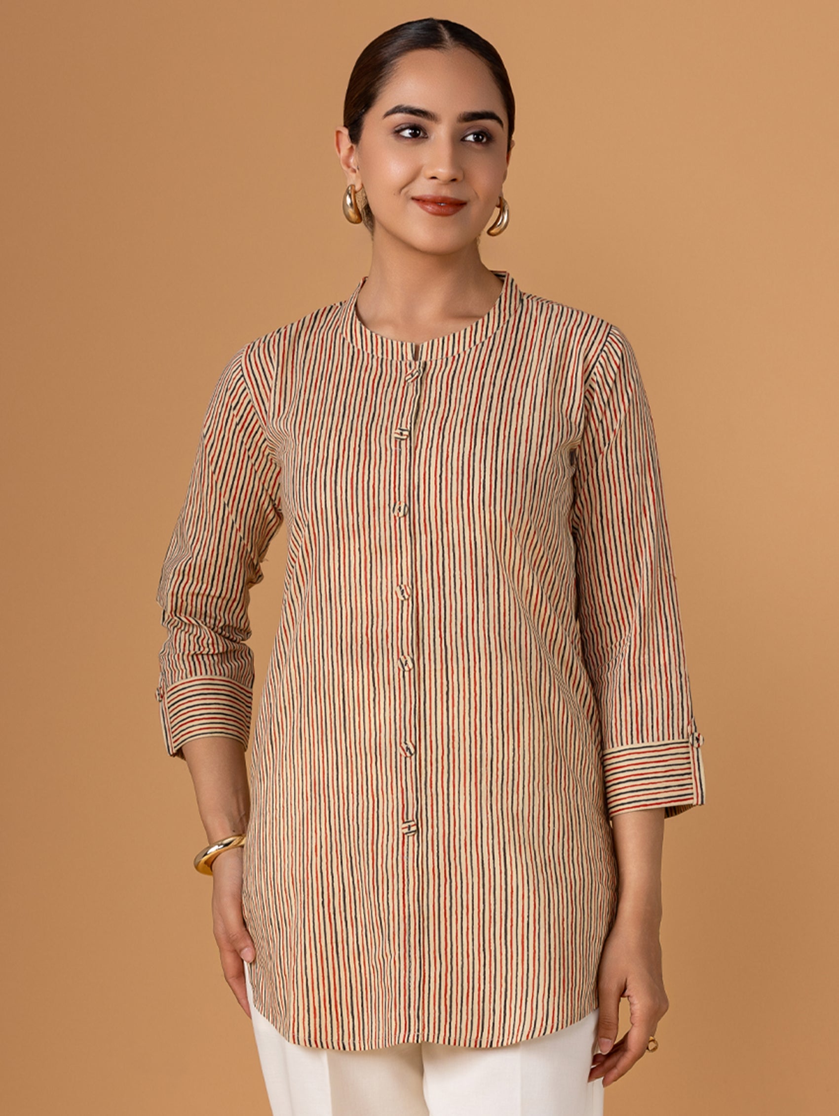 • Short Kurti with mandarin collar, three-fourth sleeves, and side slits open