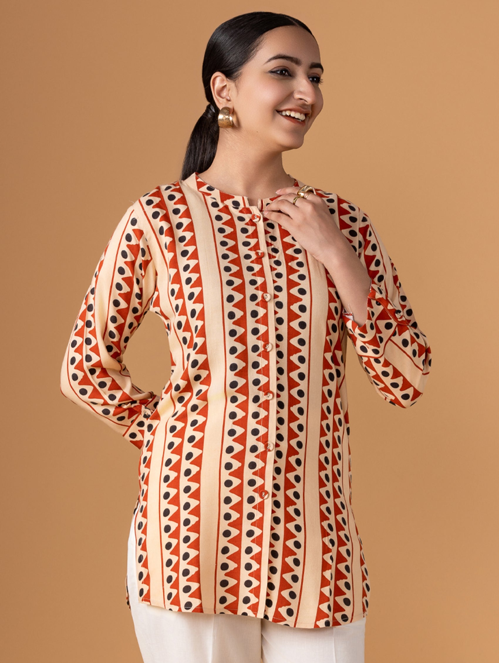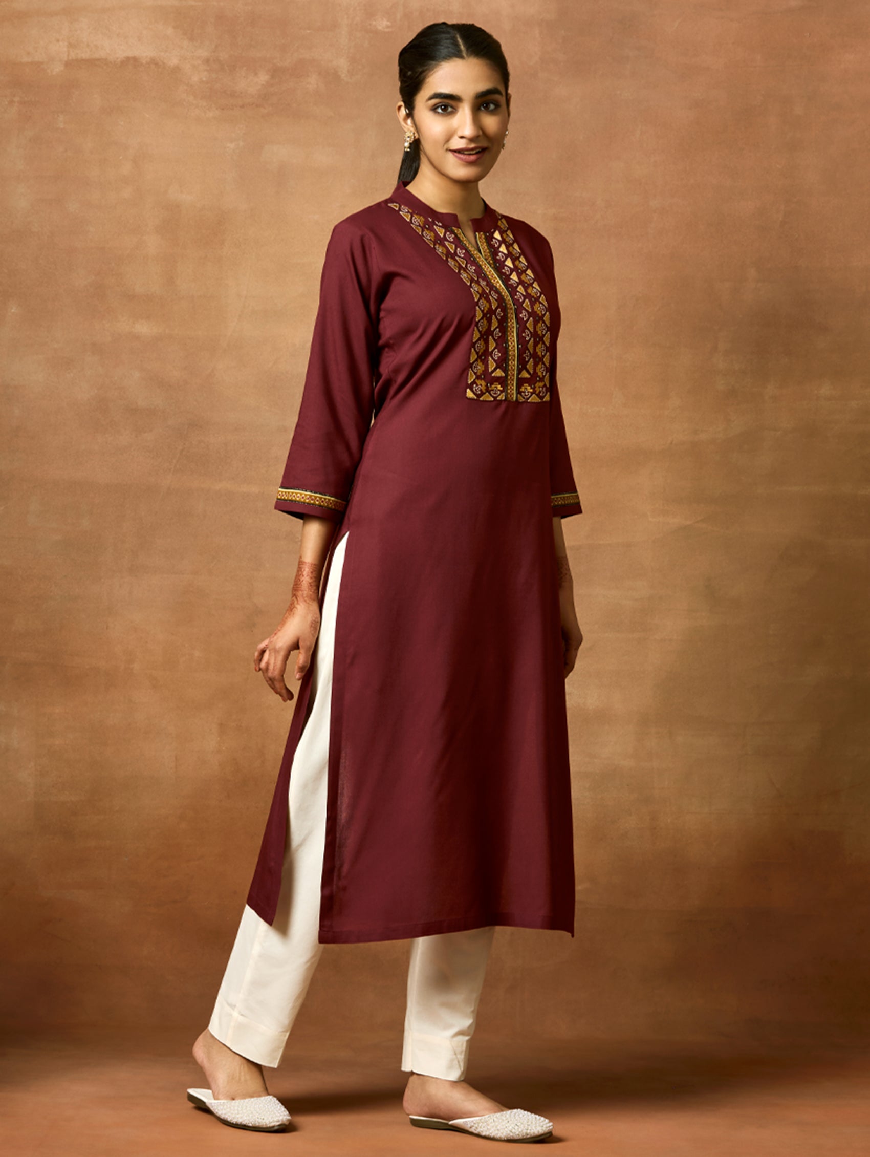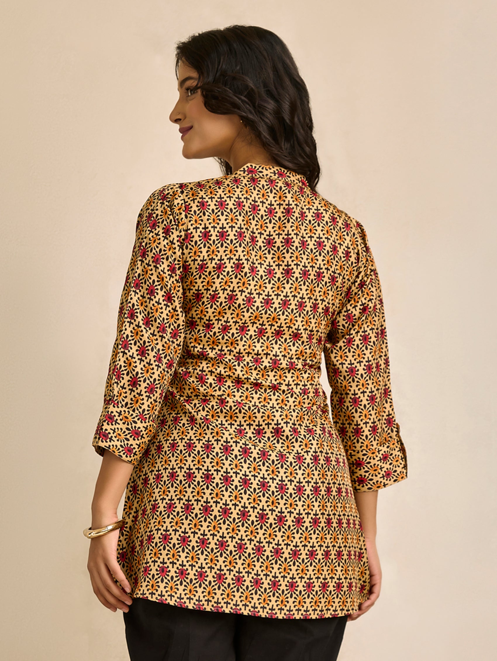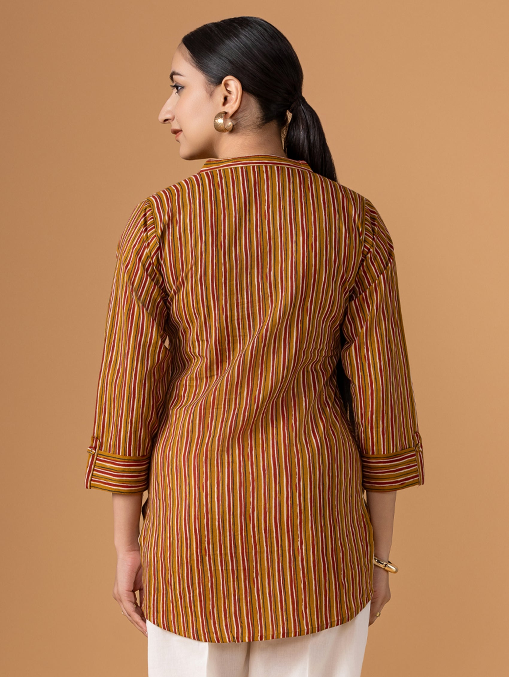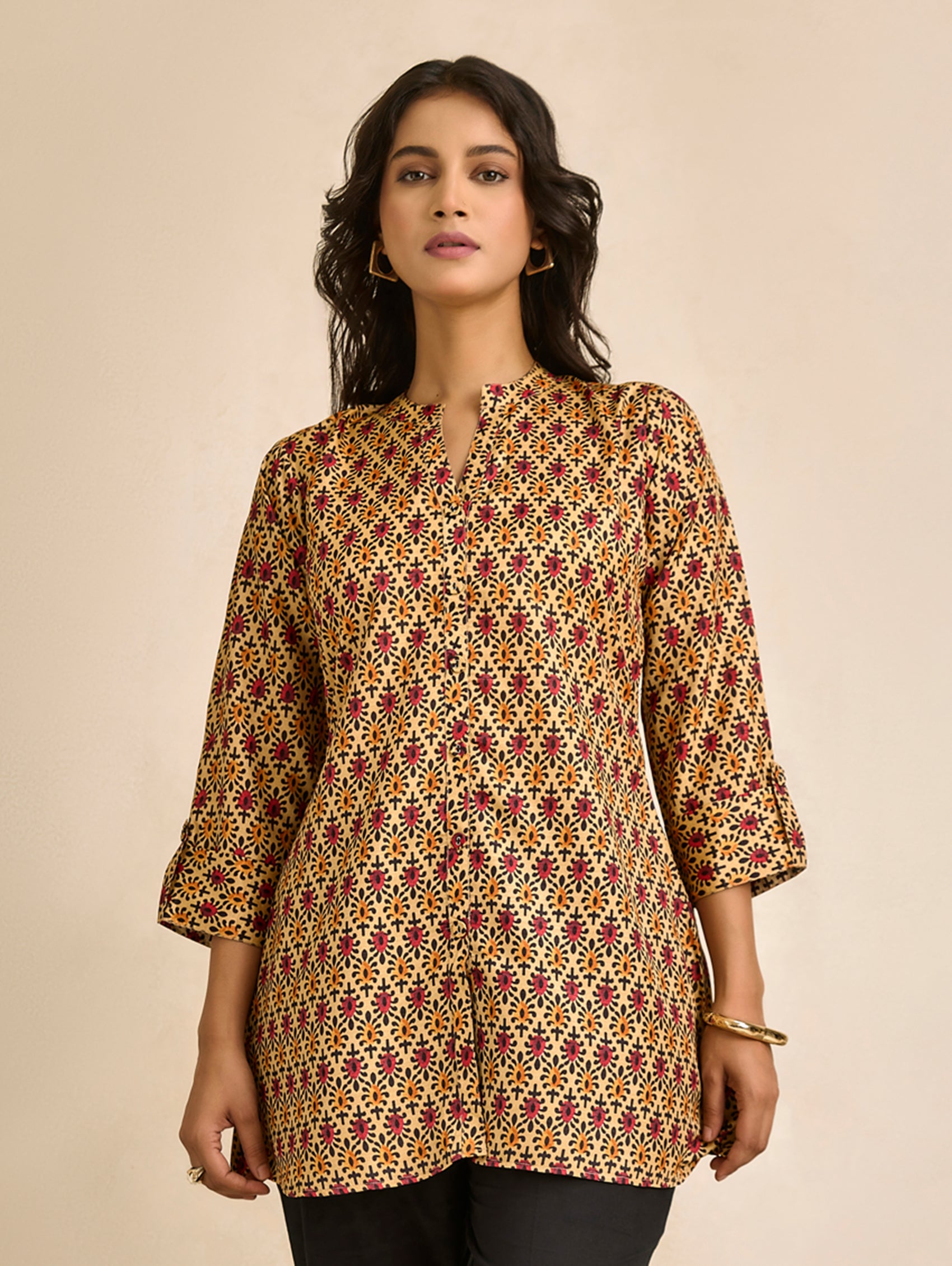 • Short Kurti with mandarin collar, three-fourth sleeves, and side slits open