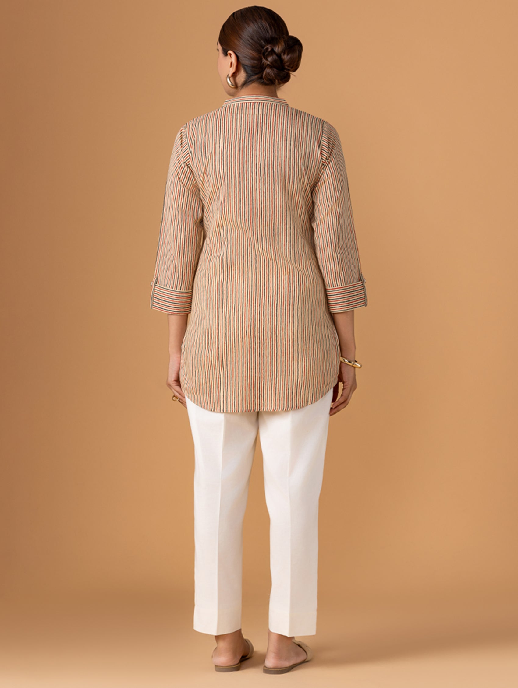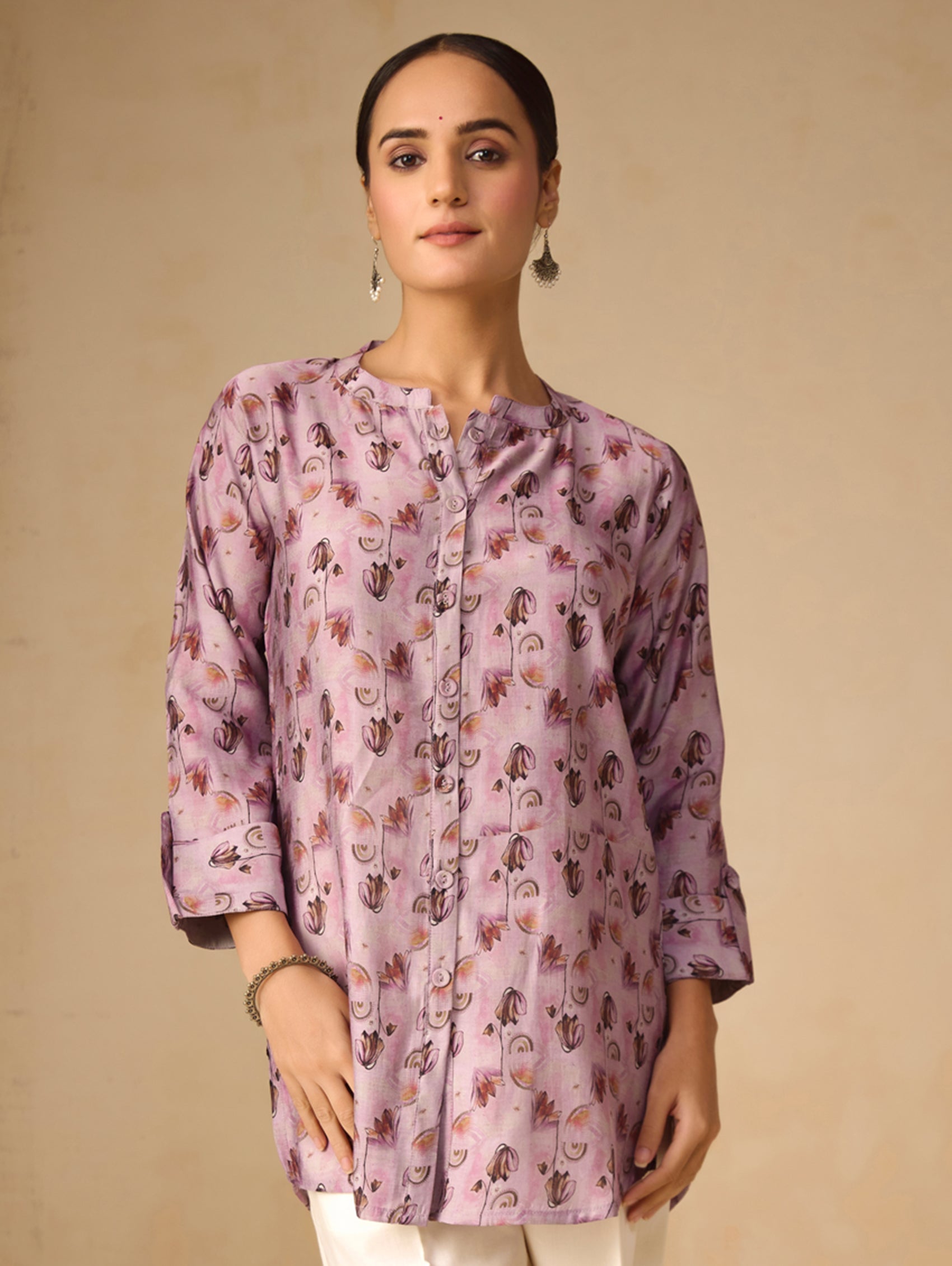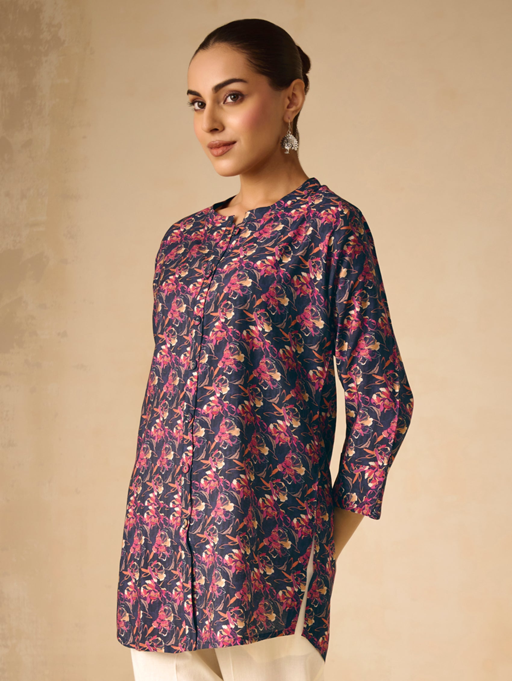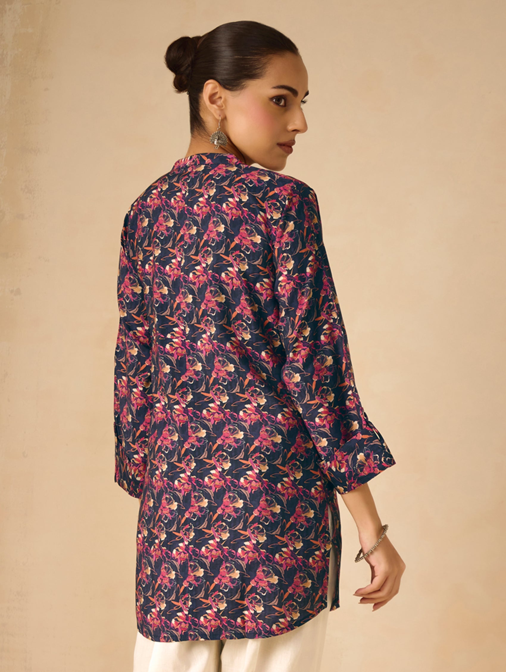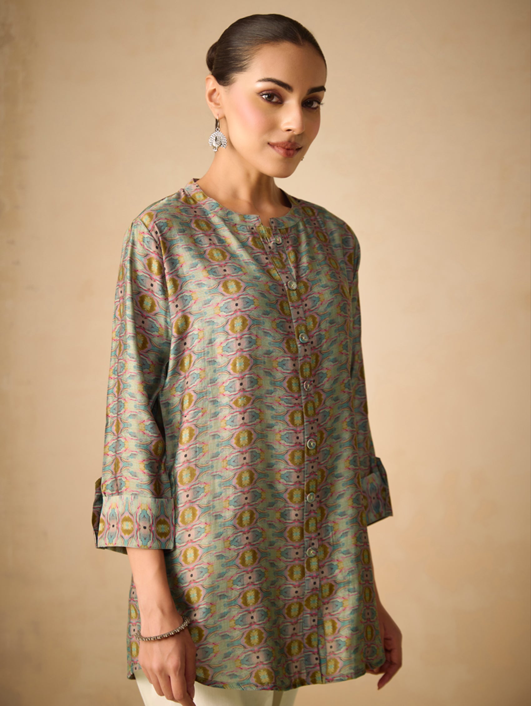 • Short Kurti with mandarin collar, three-fourth sleeves, and side slits open