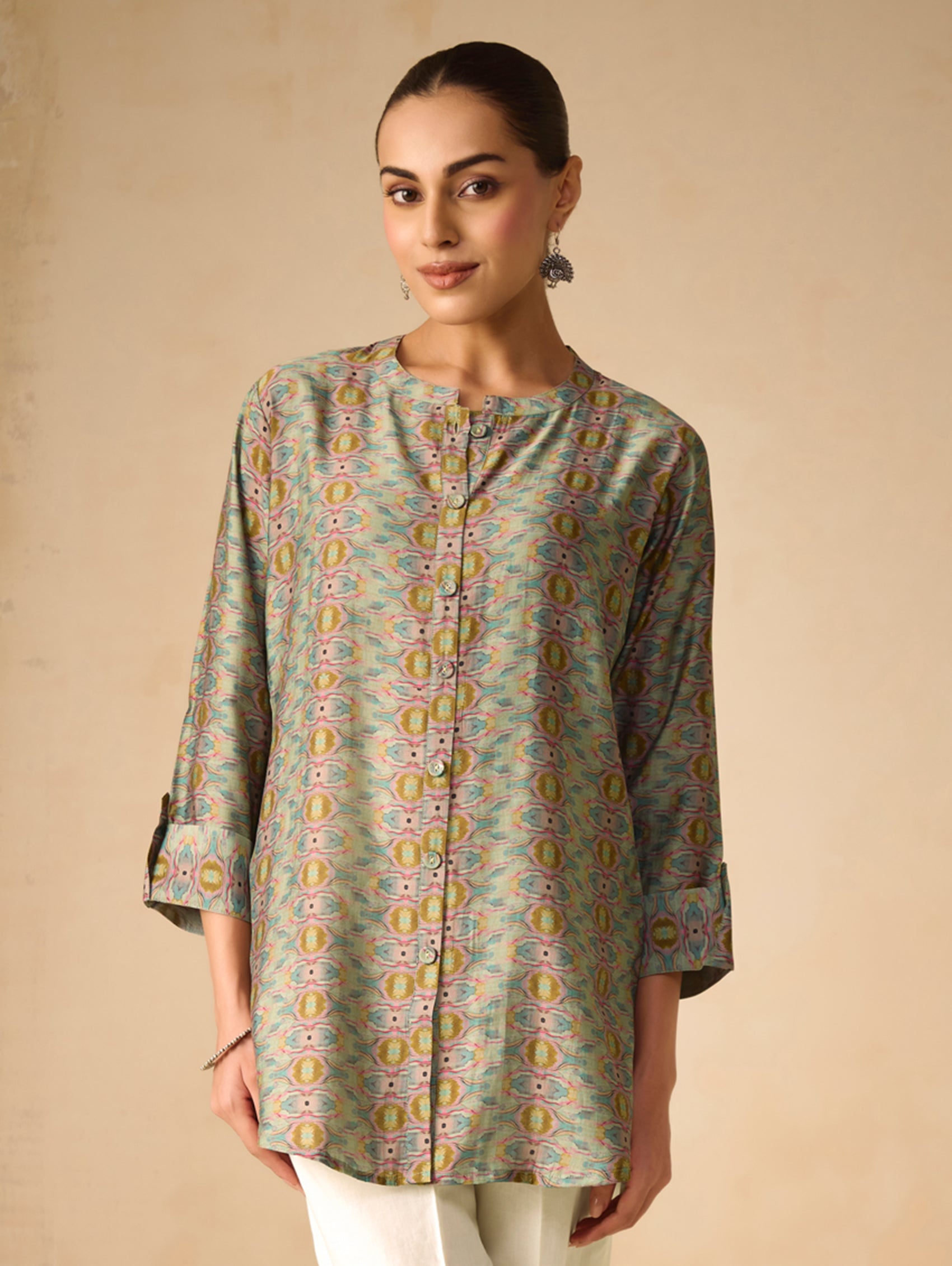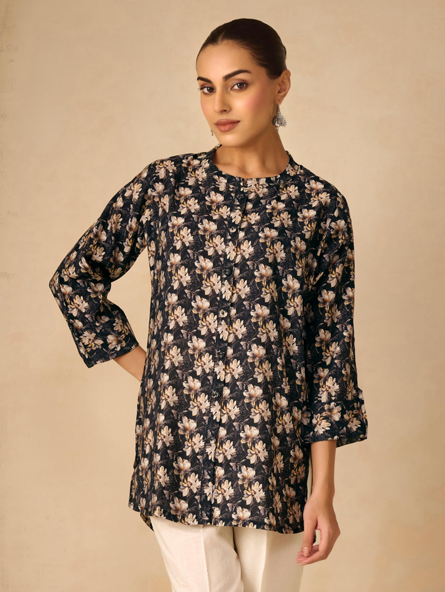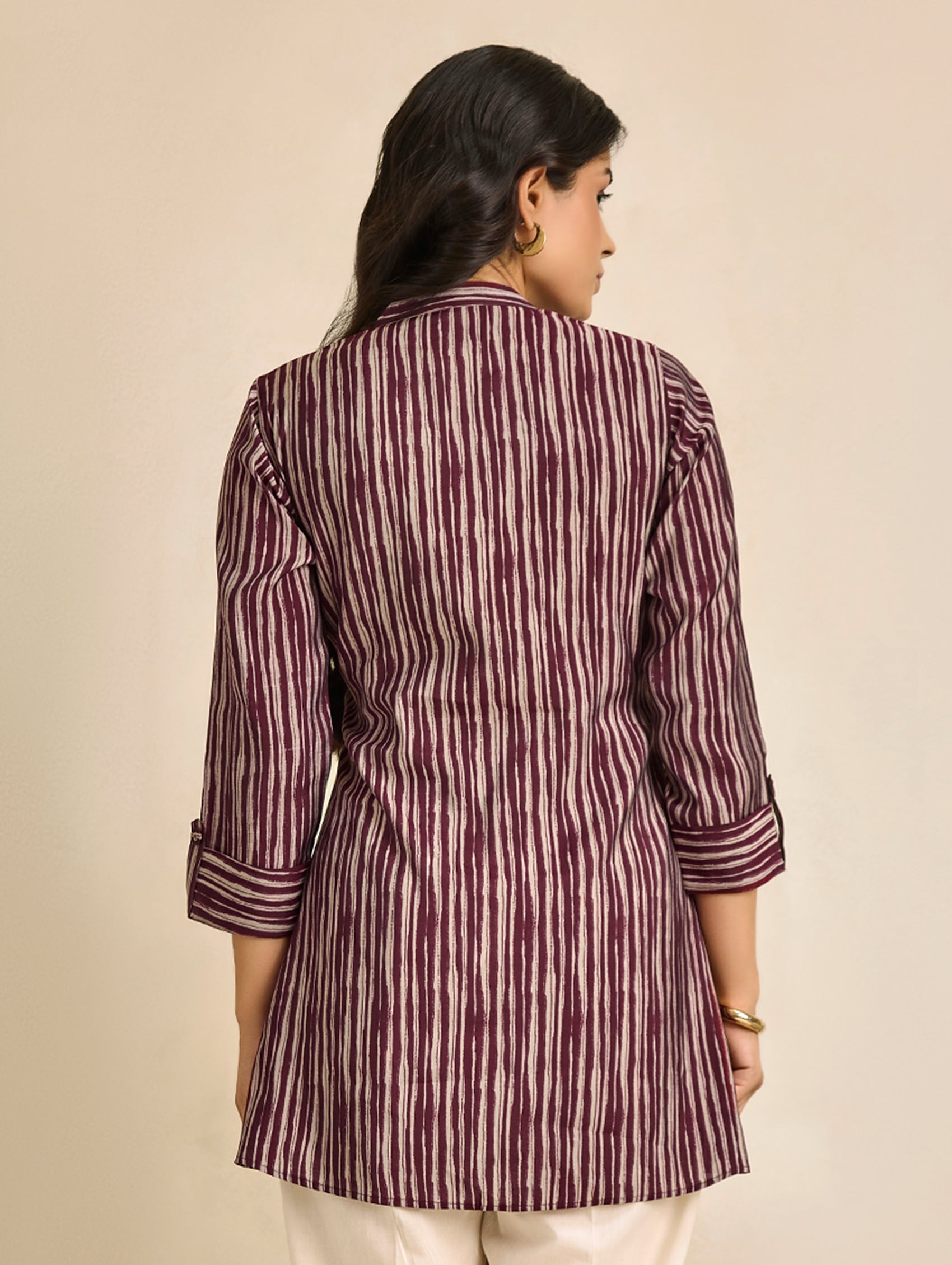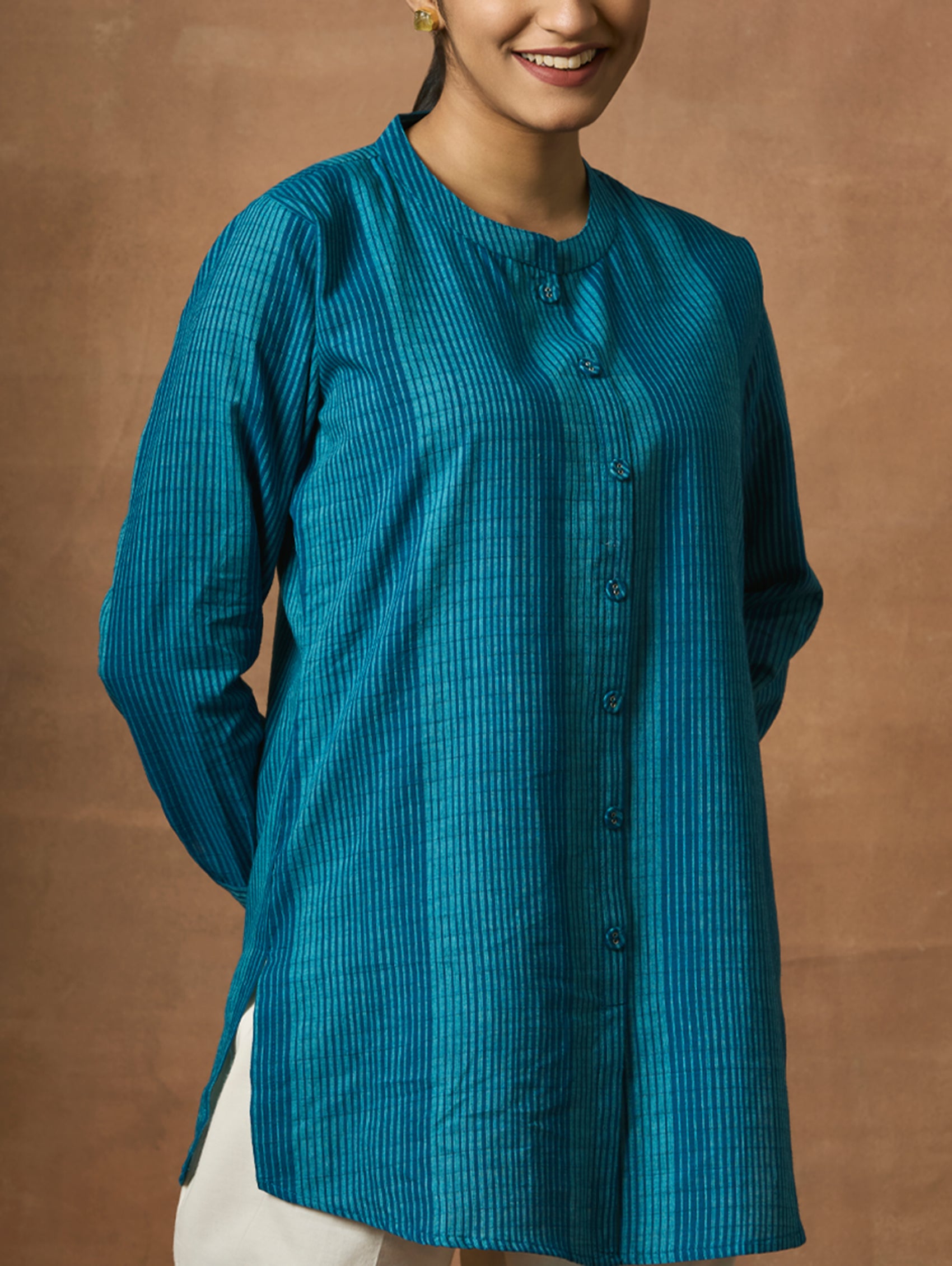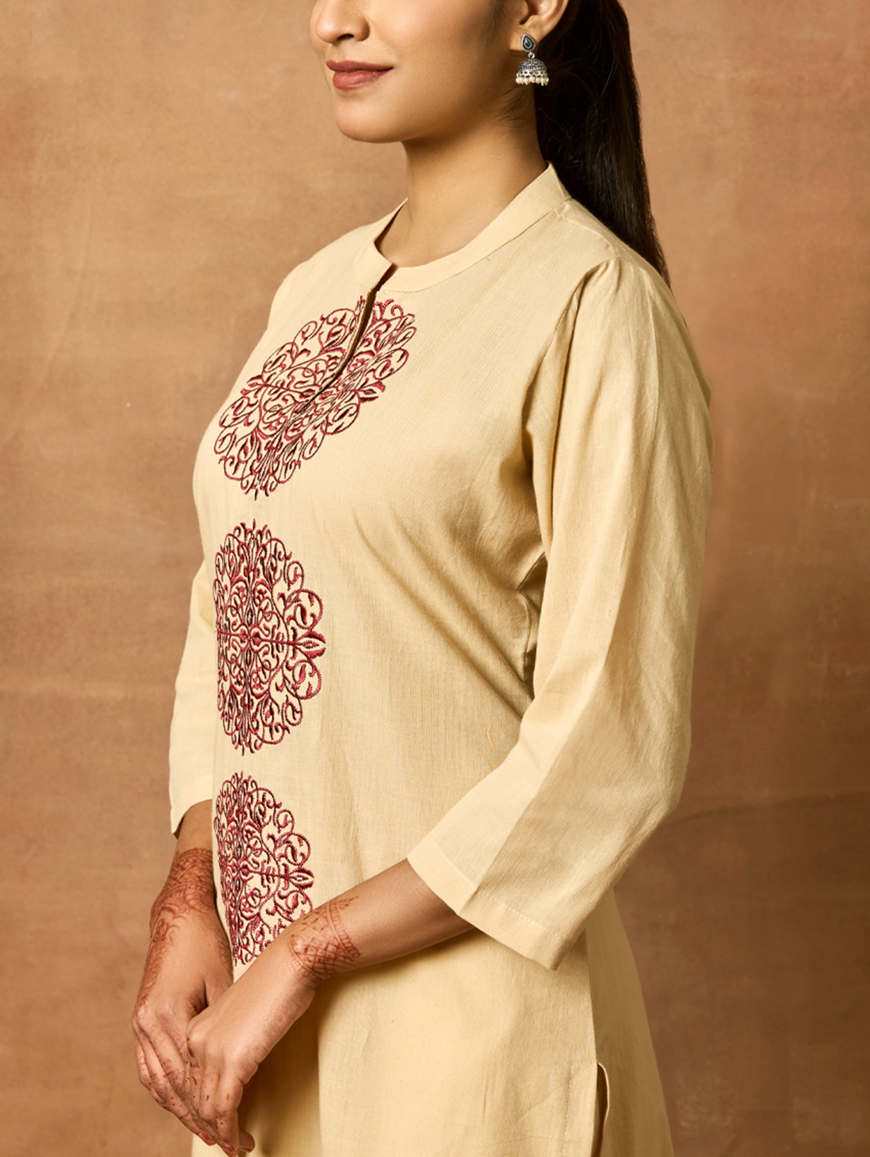 • Short Kurti with mandarin collar, three-fourth sleeves, and side slits open
