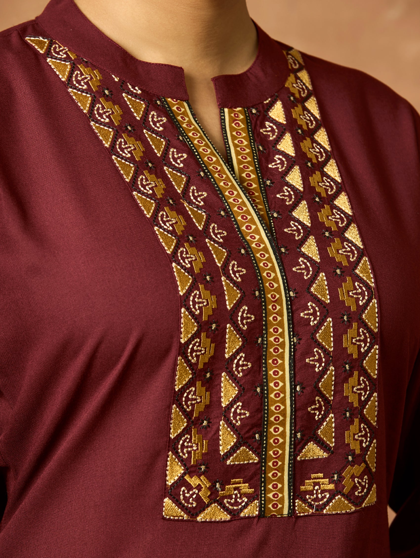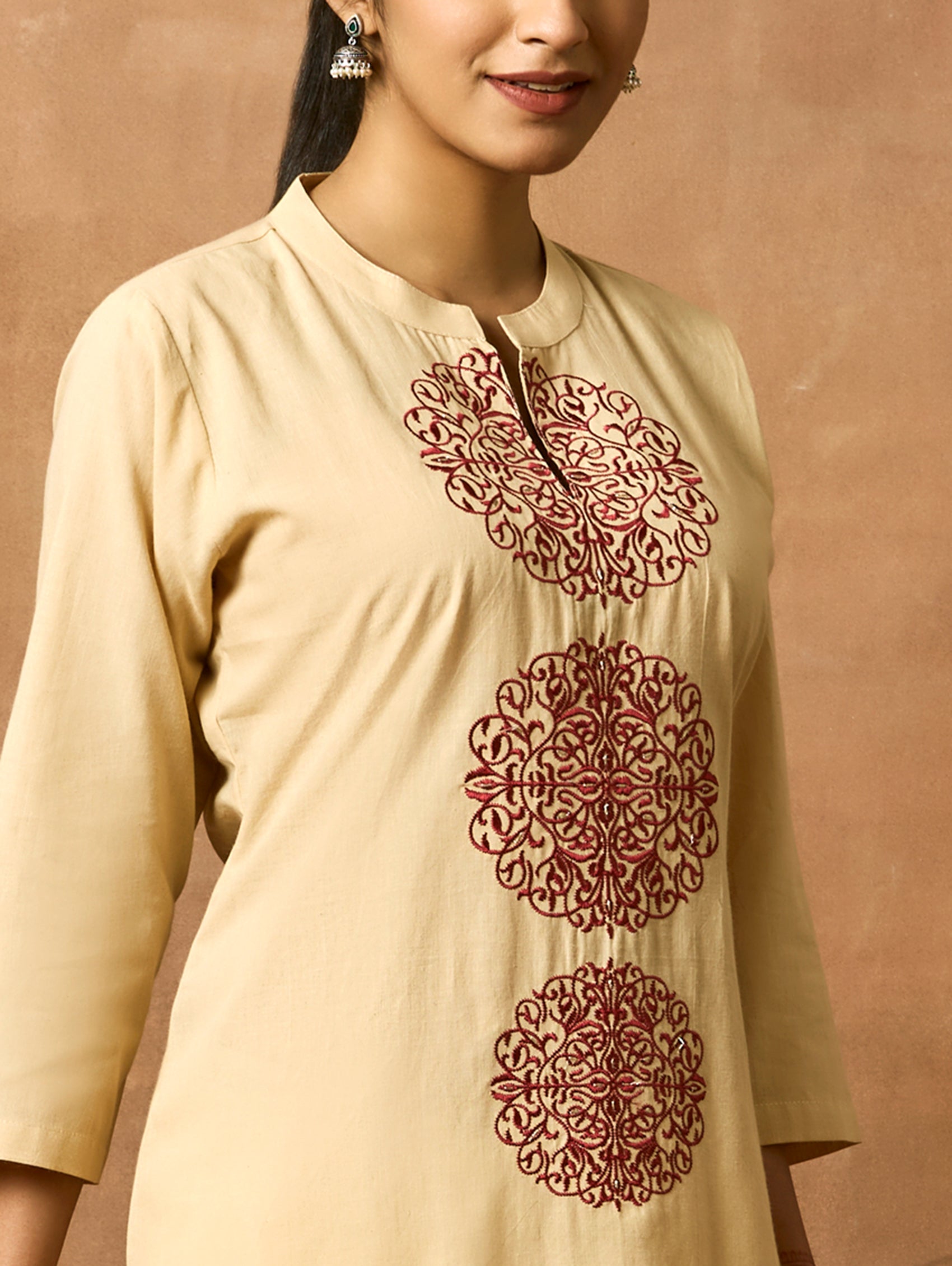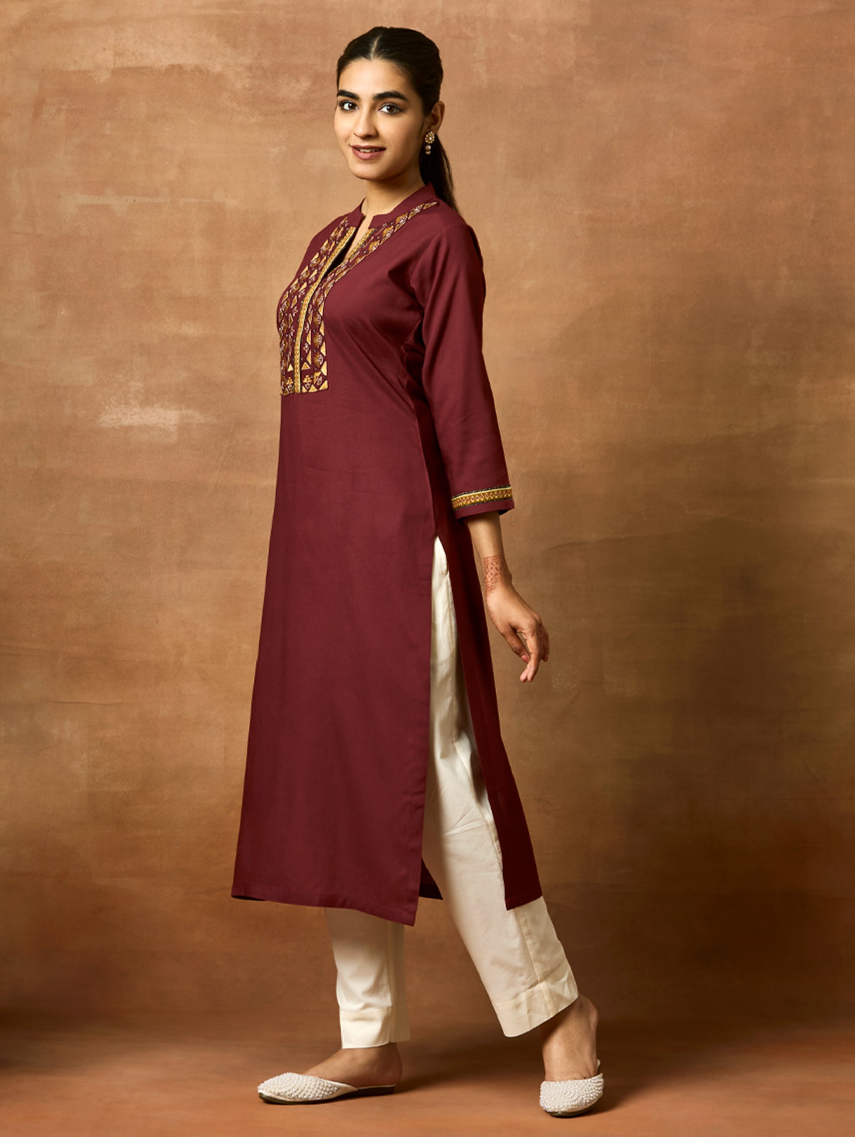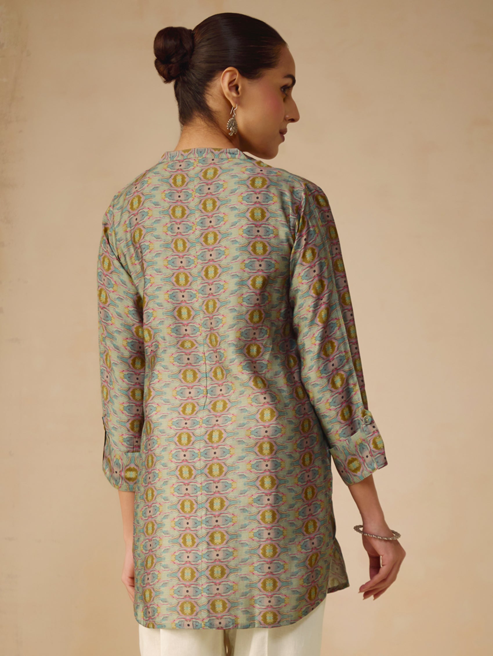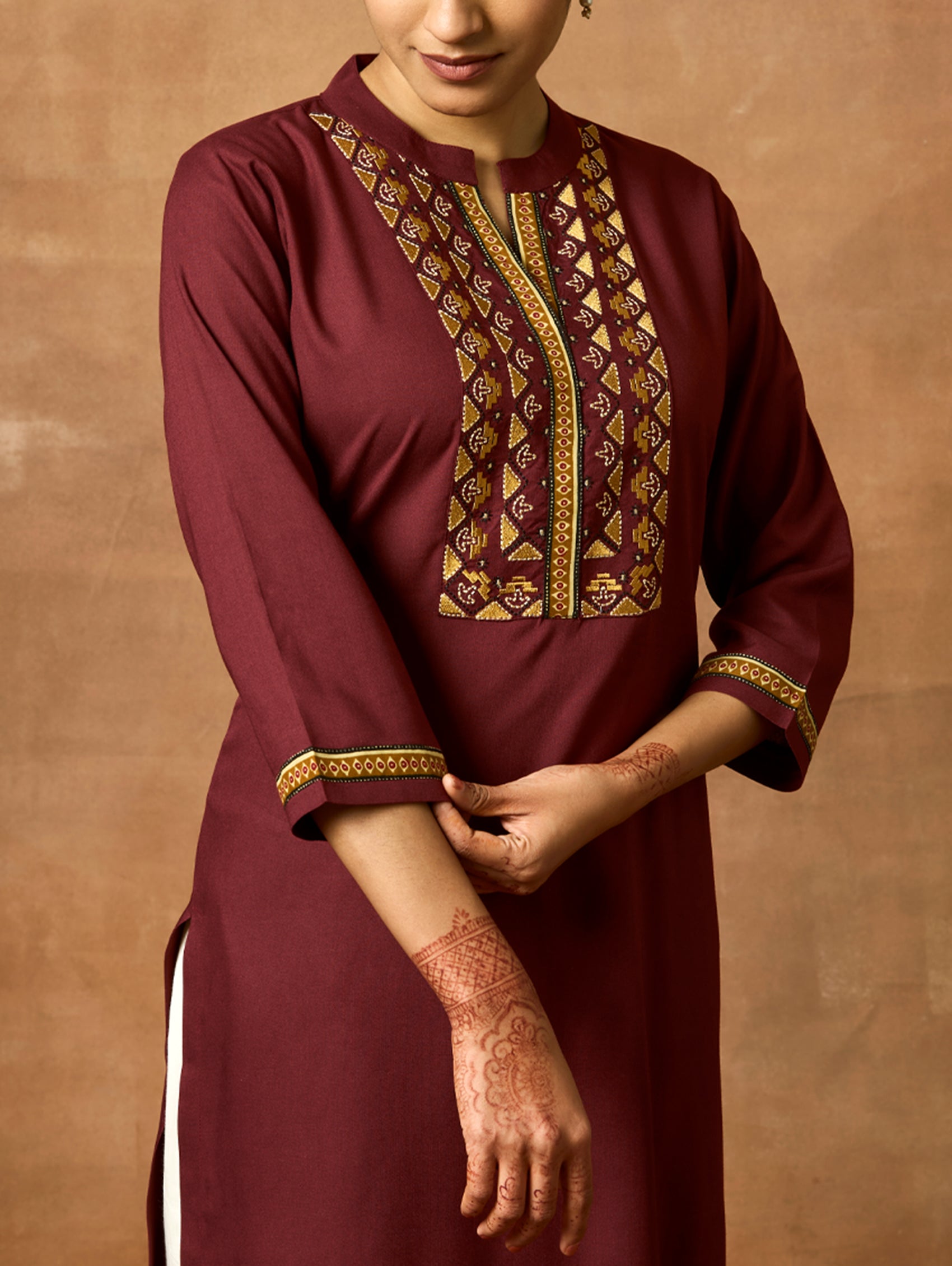 • Short Kurti with mandarin collar, three-fourth sleeves, and side slits open
