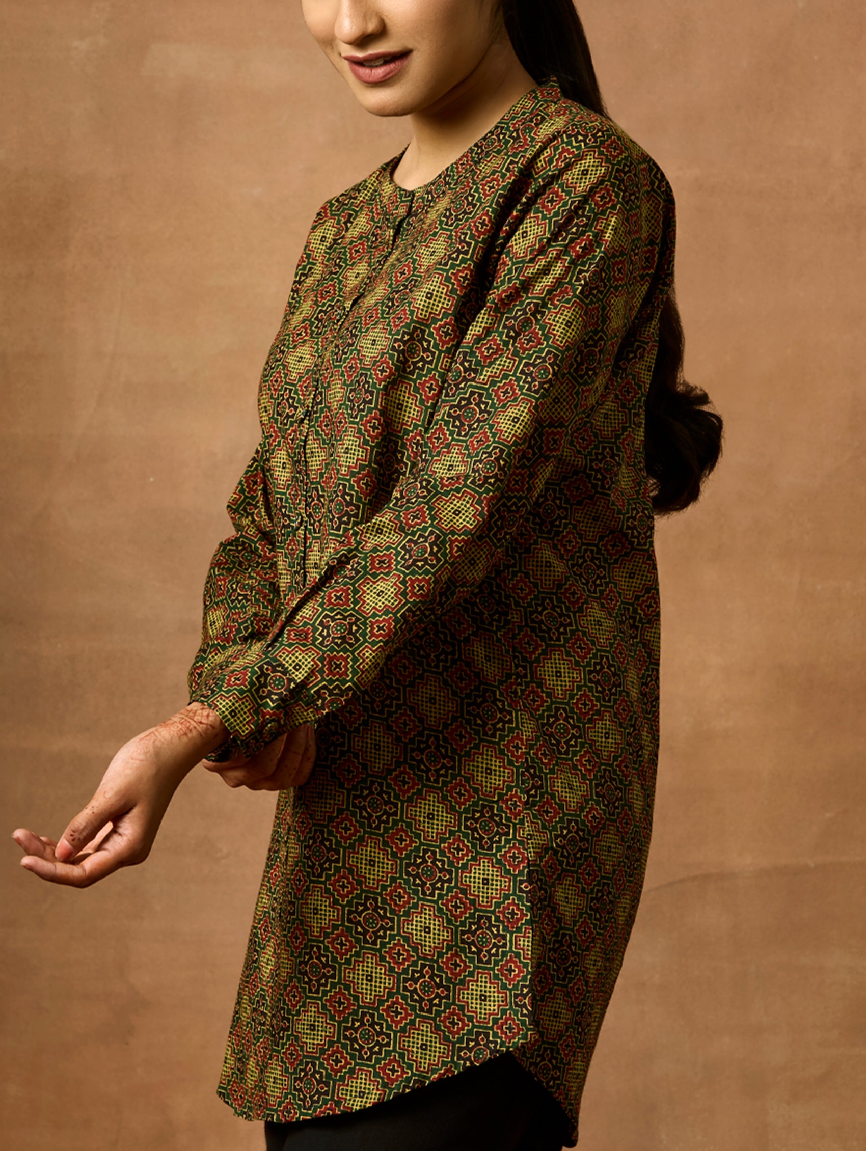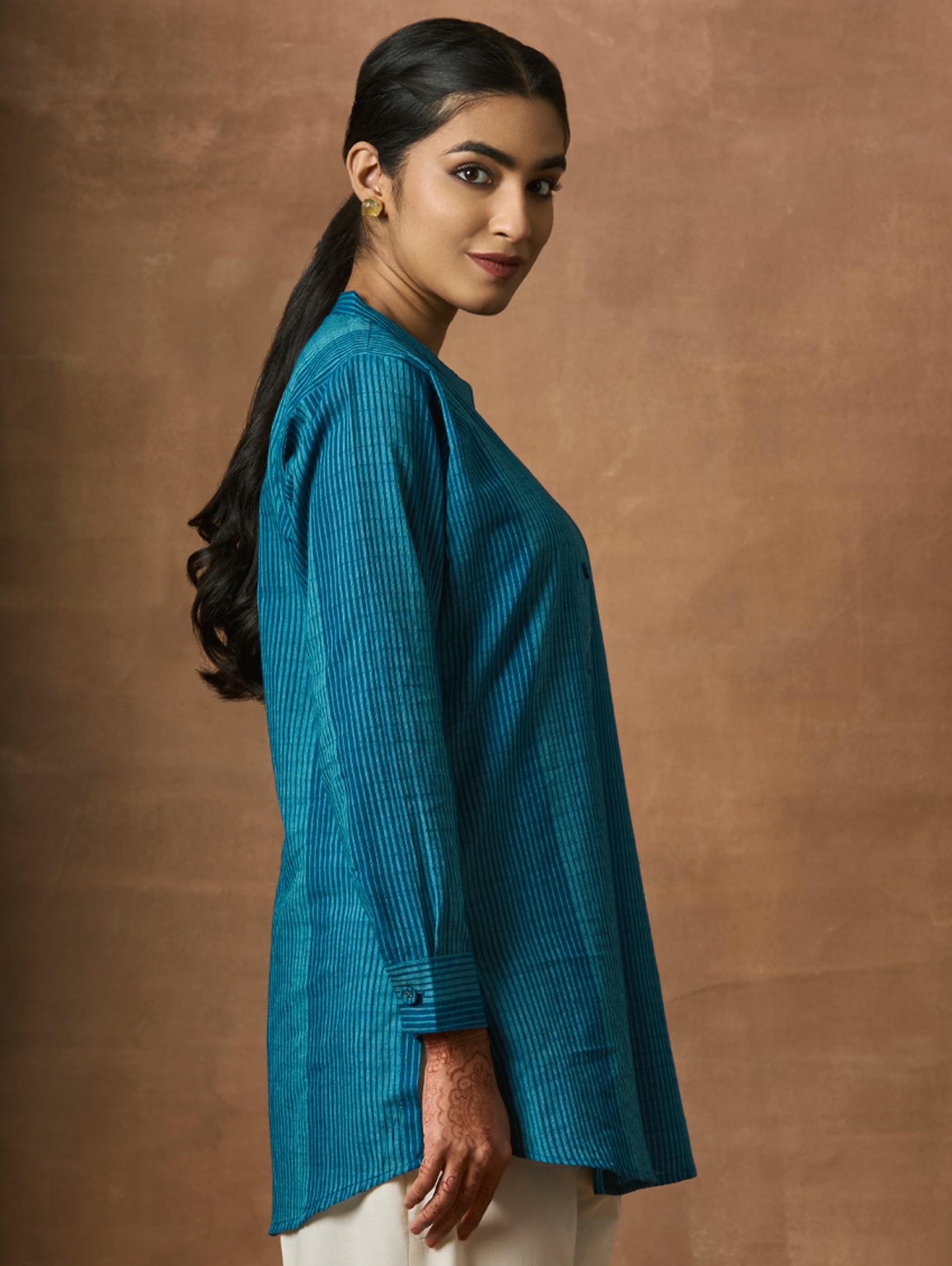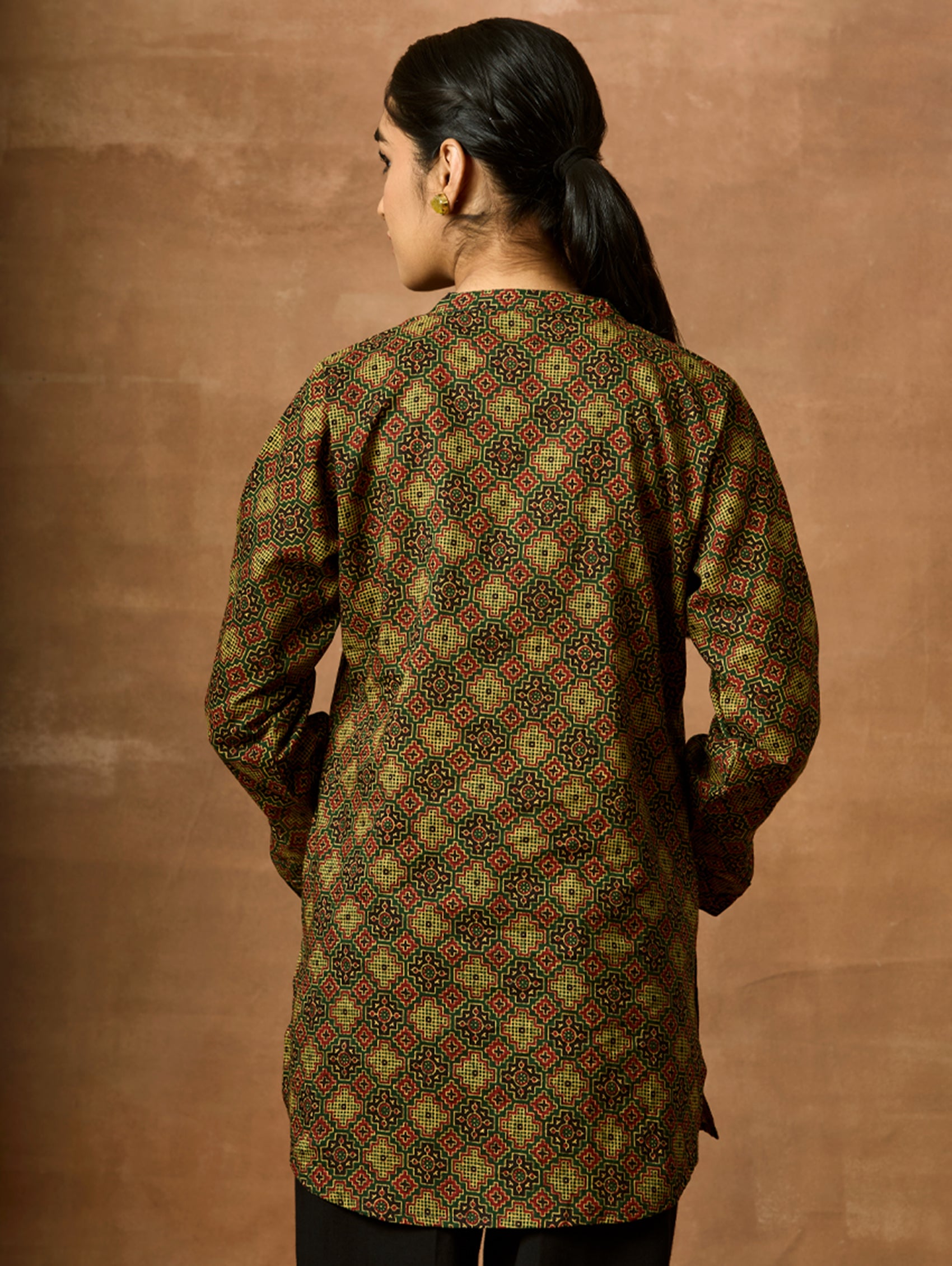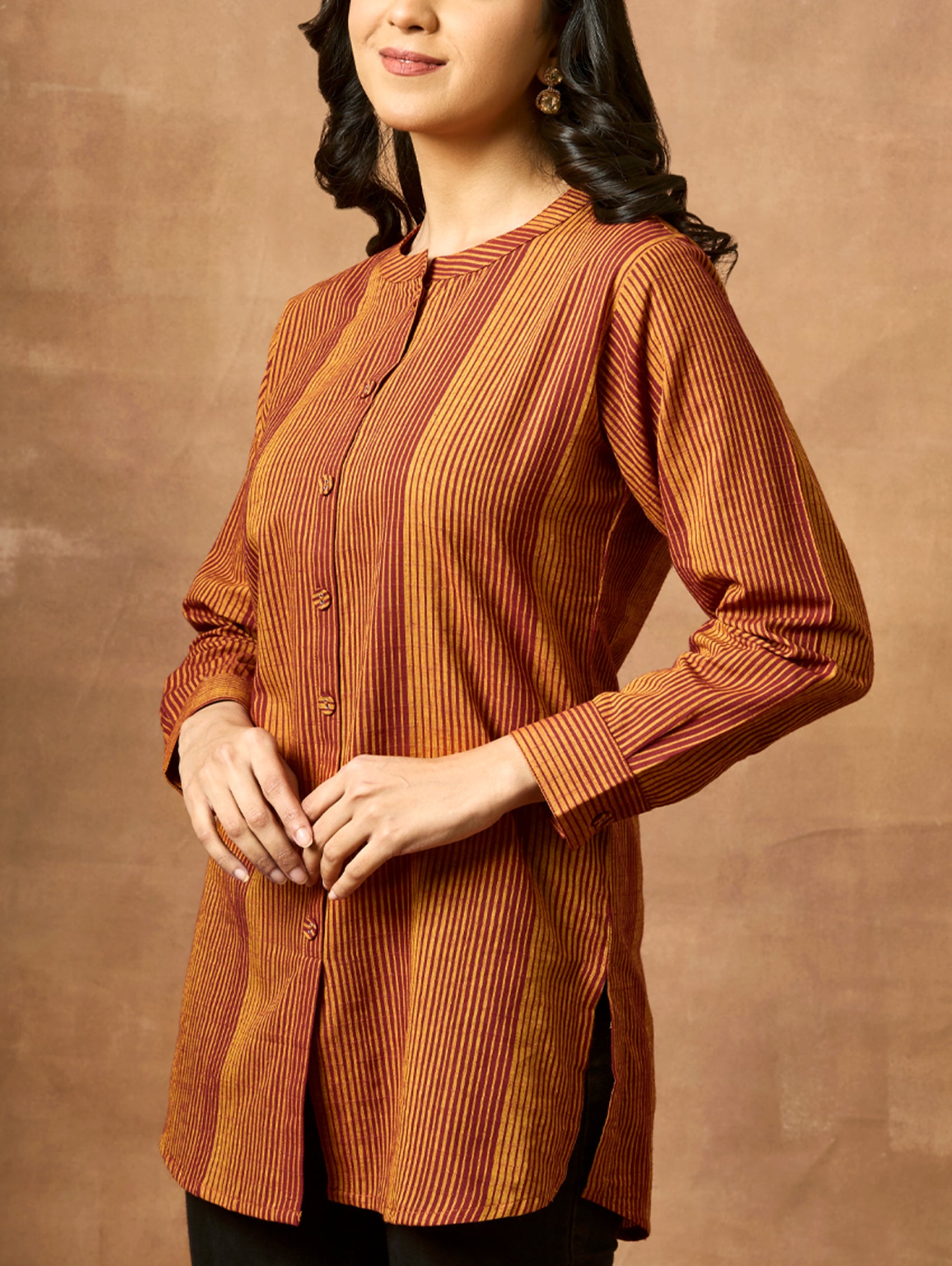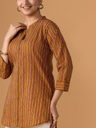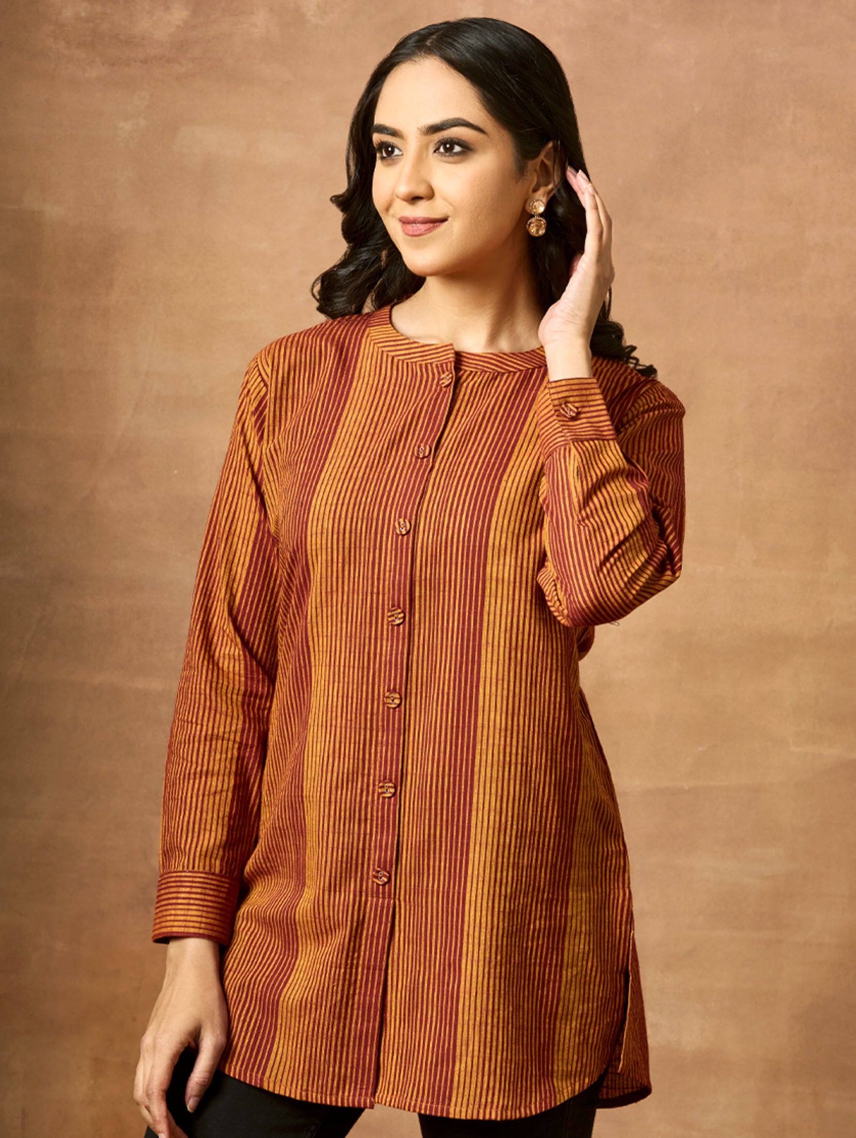 • Short Kurti with mandarin collar, three-fourth sleeves, and side slits open