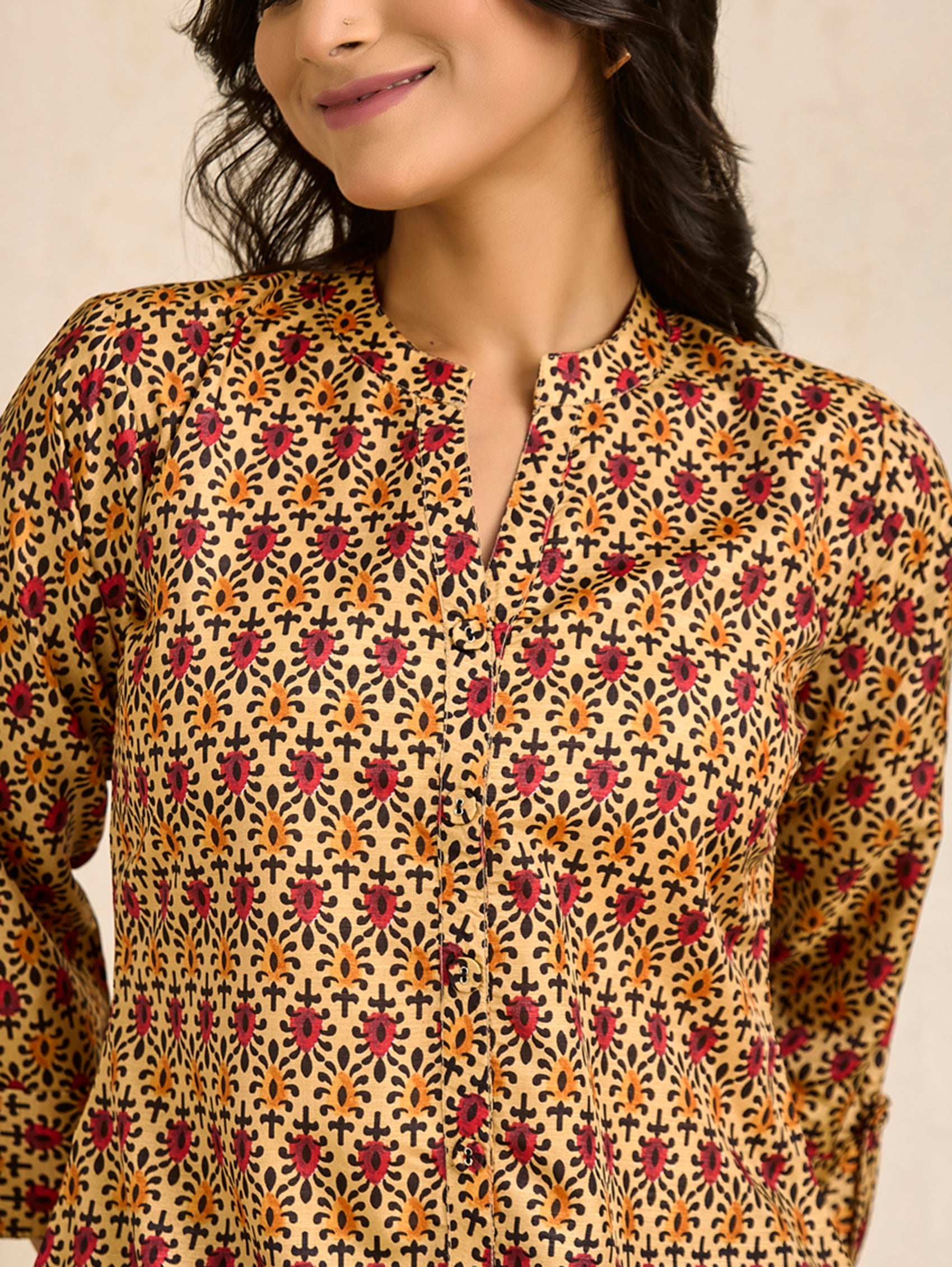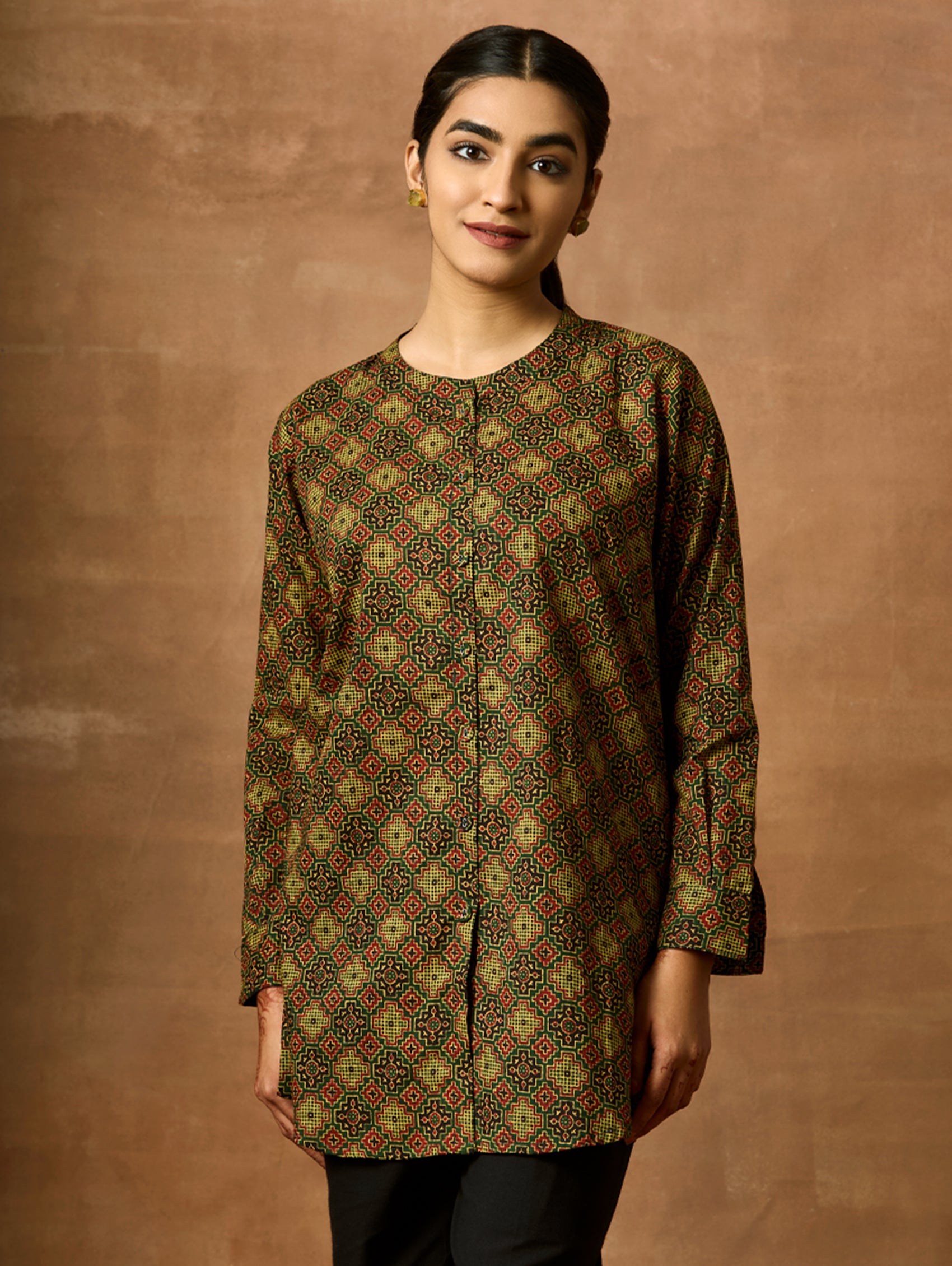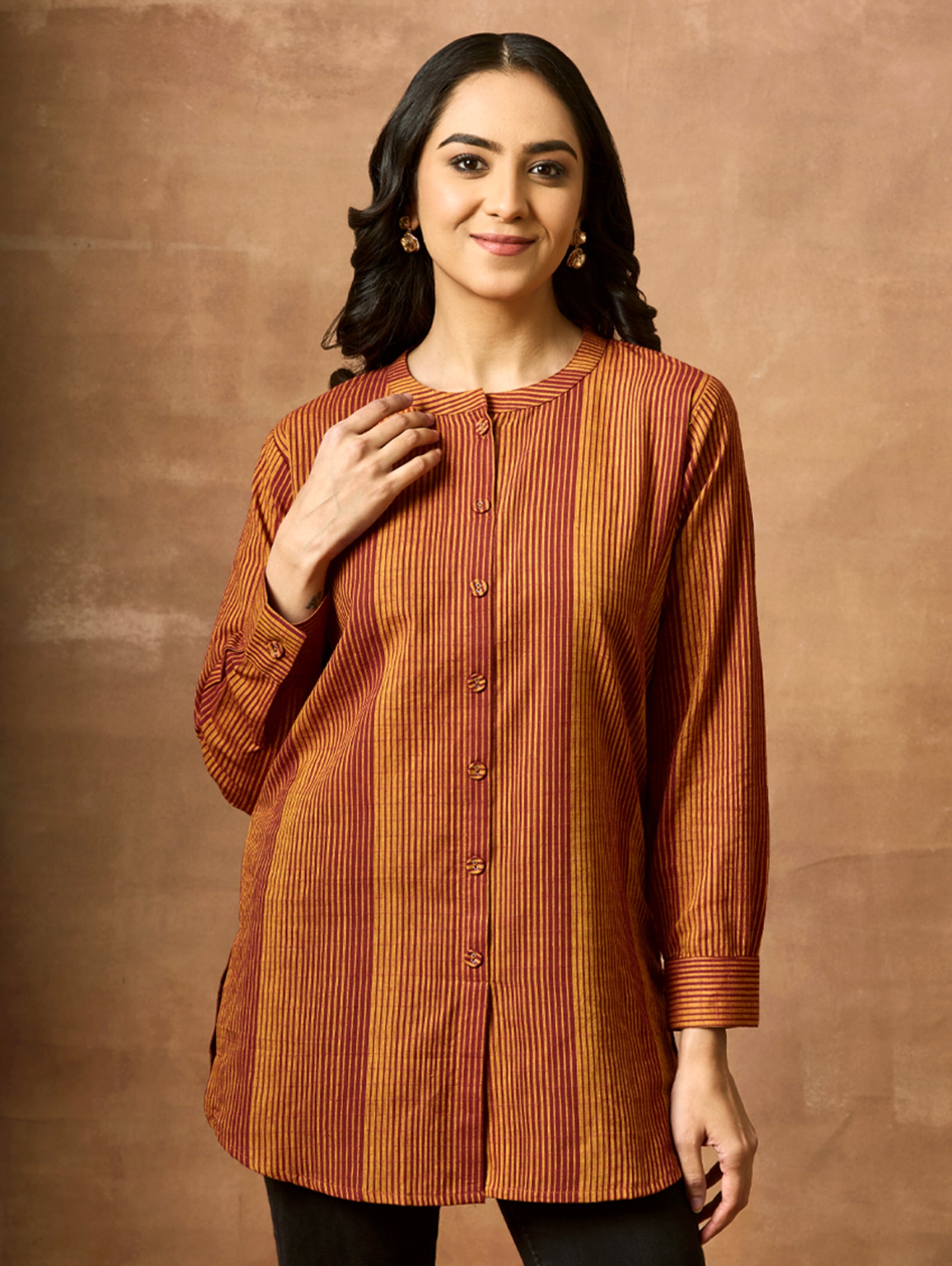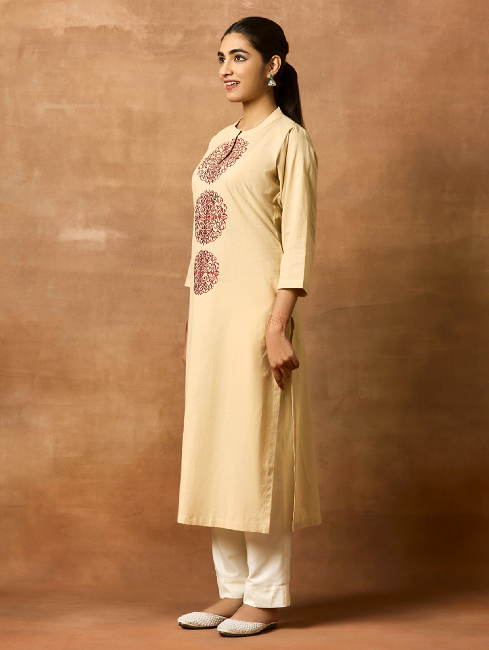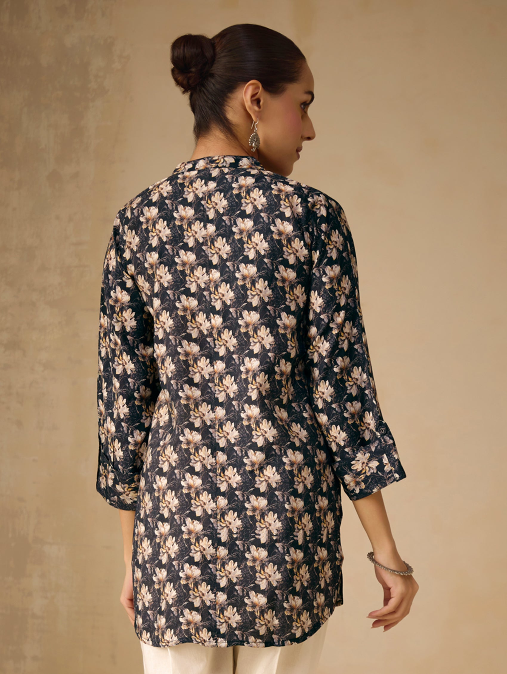 • Short Kurti with mandarin collar, three-fourth sleeves, and side slits open