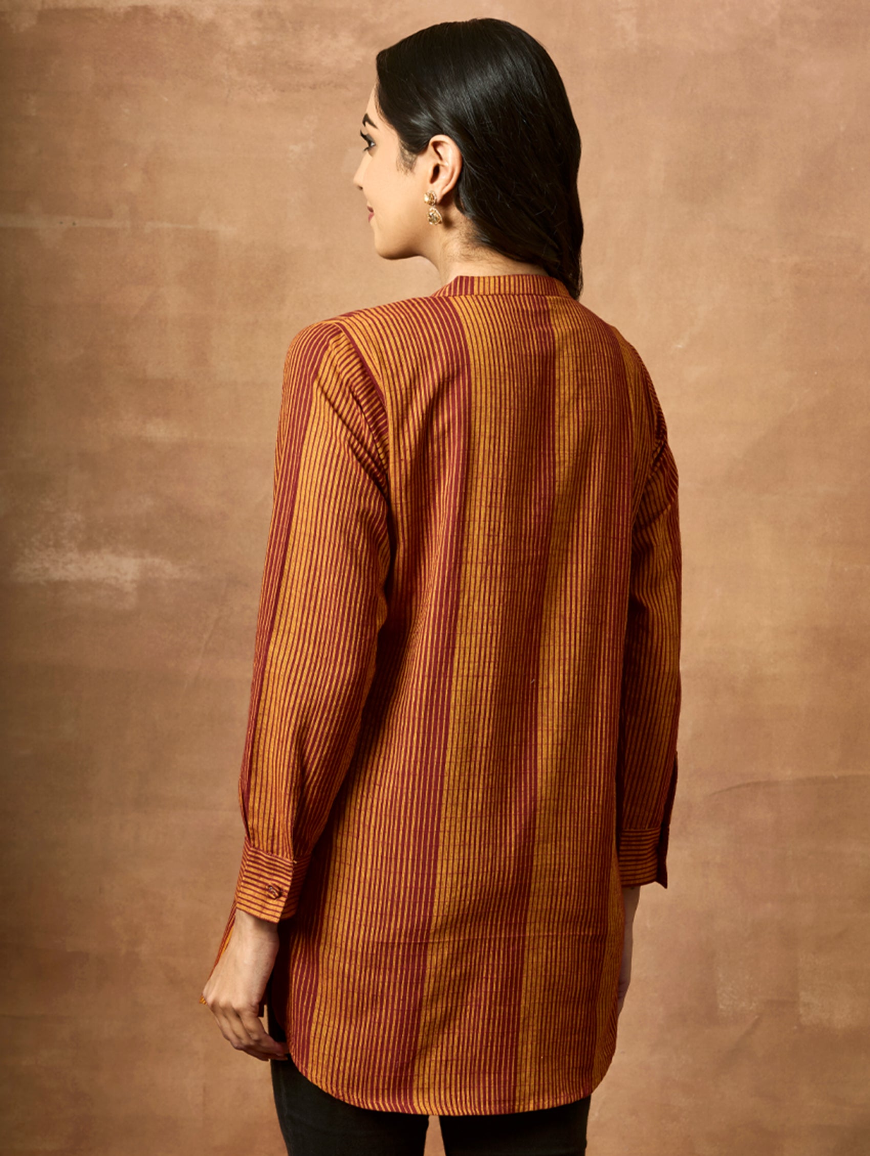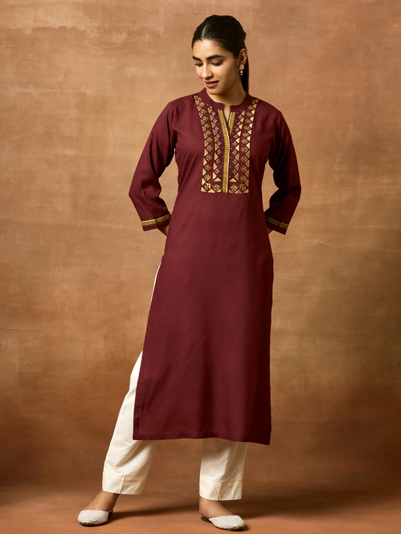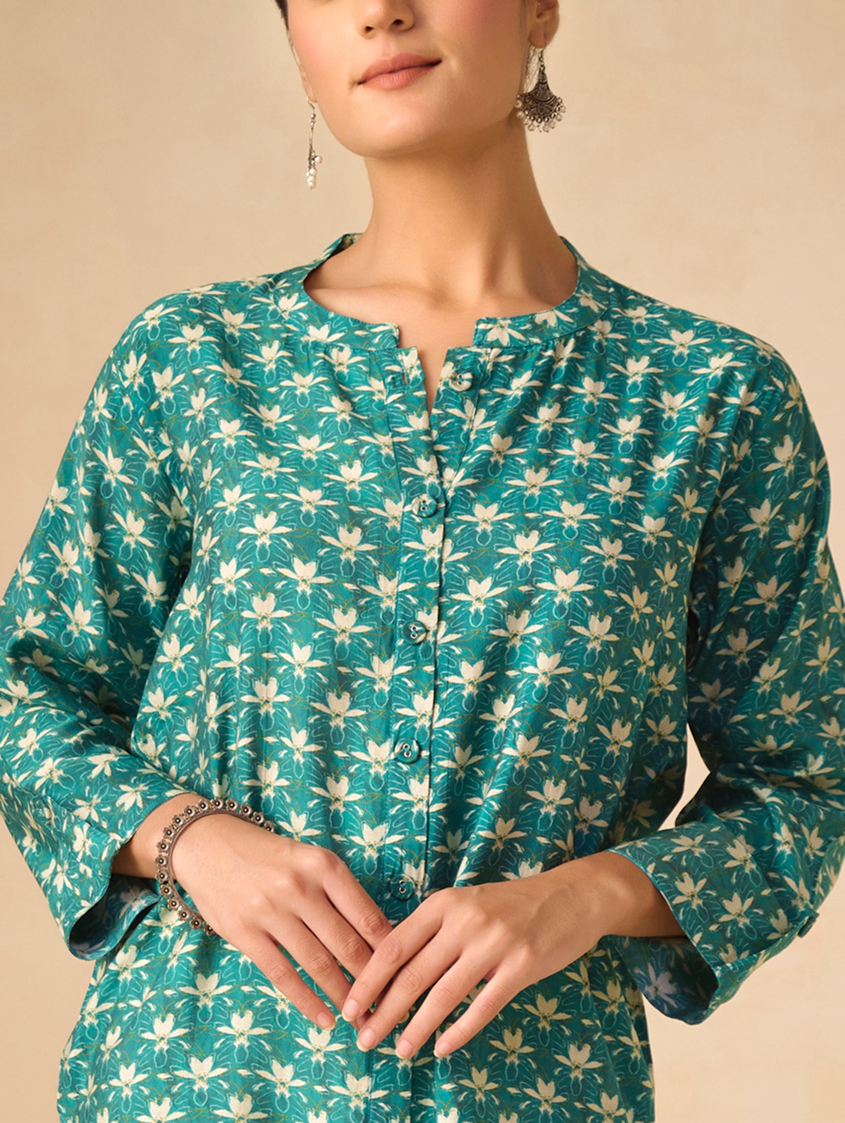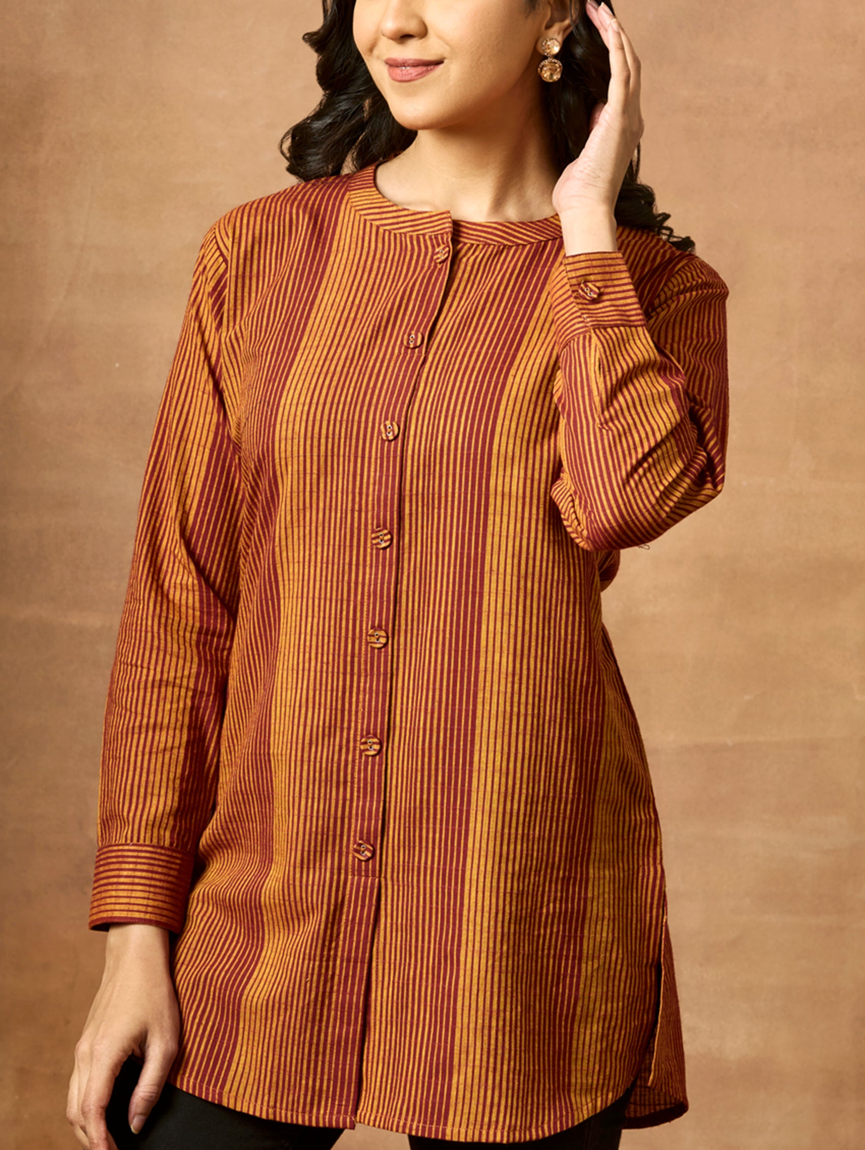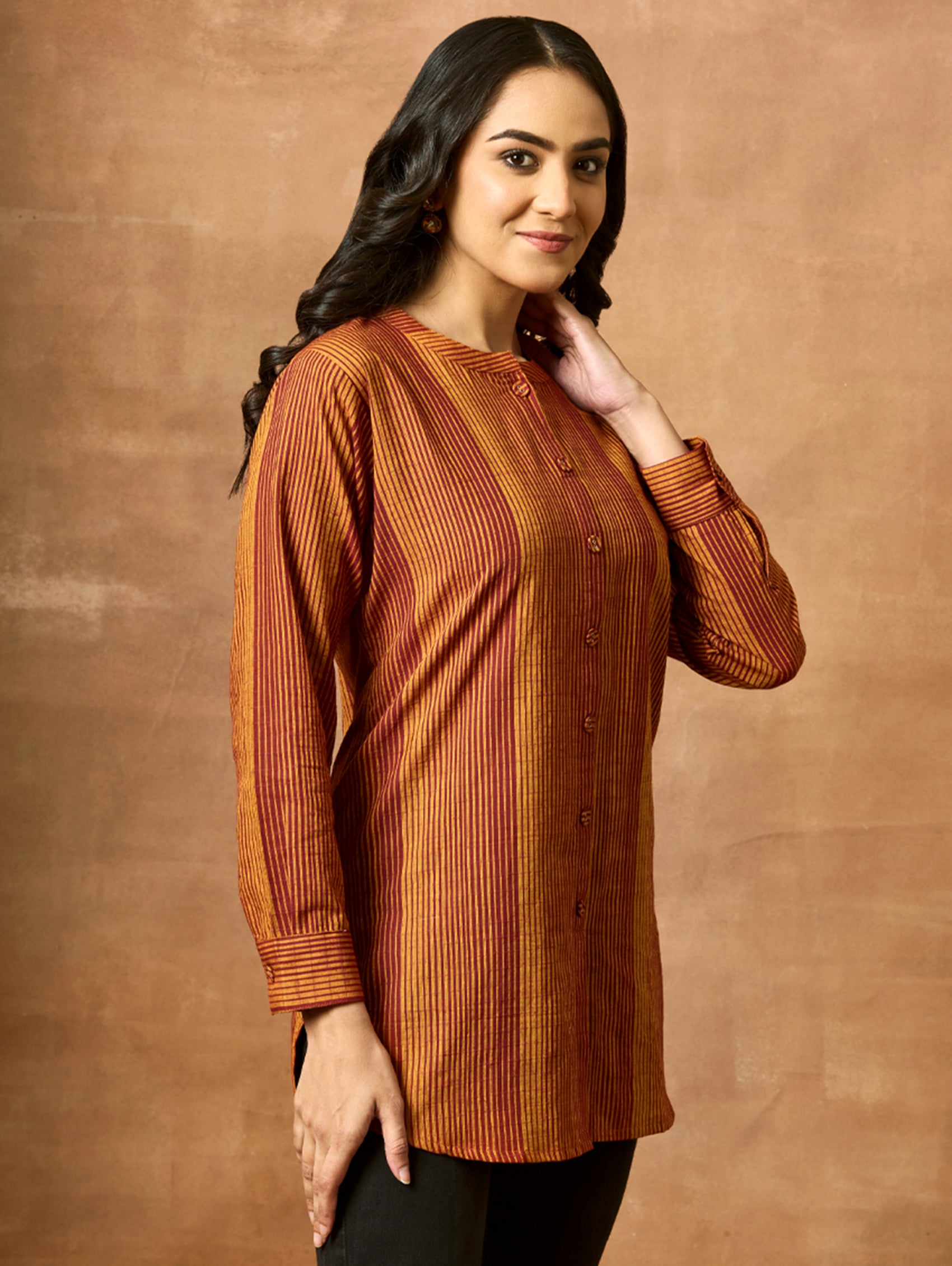 • Short Kurti with mandarin collar, three-fourth sleeves, and side slits open