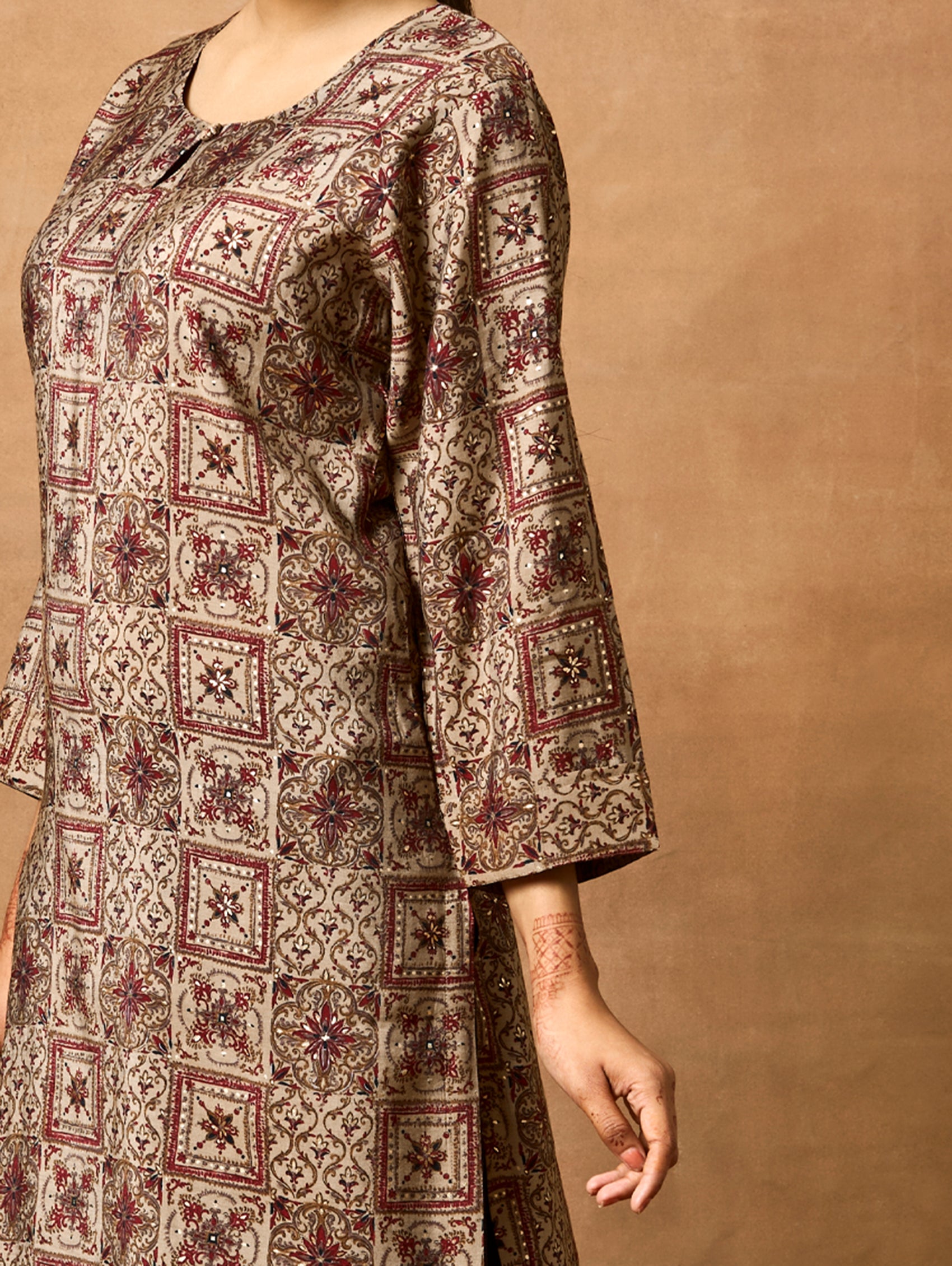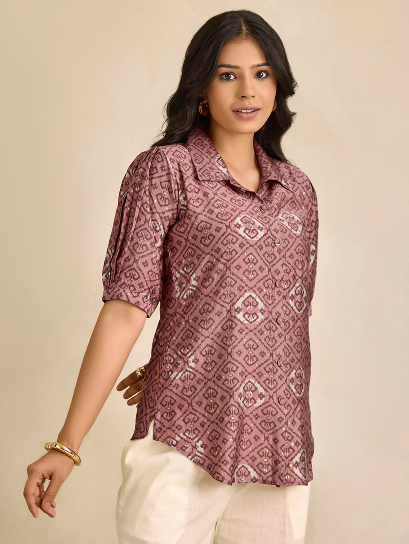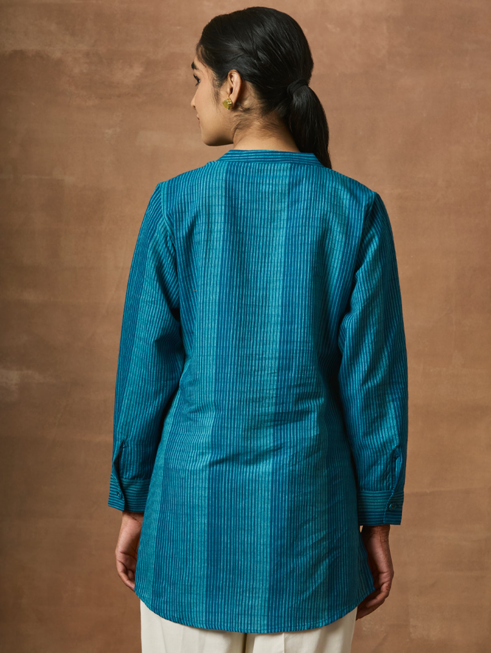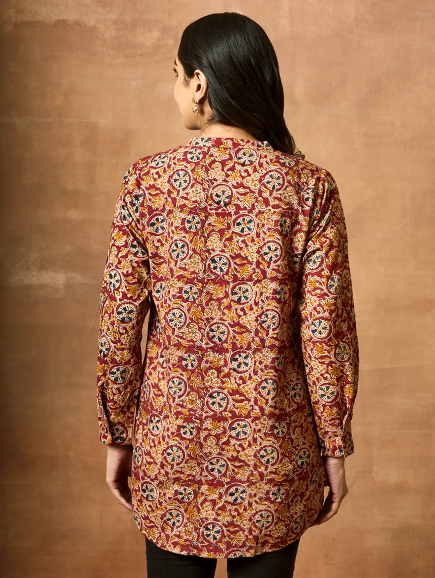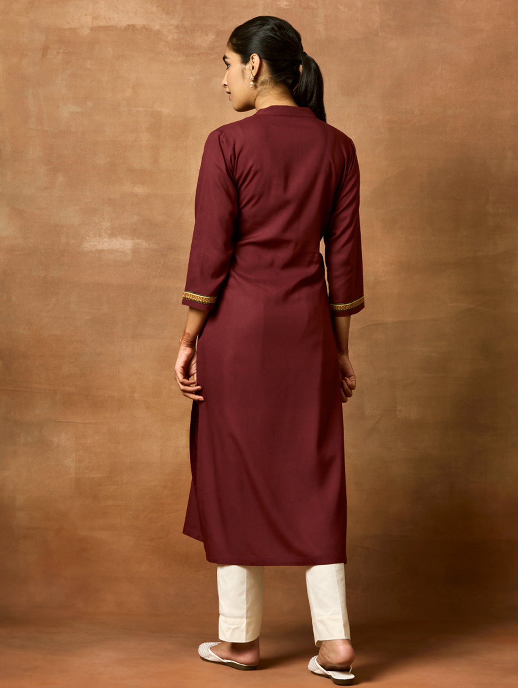 • Short Kurti with mandarin collar, three-fourth sleeves, and side slits open