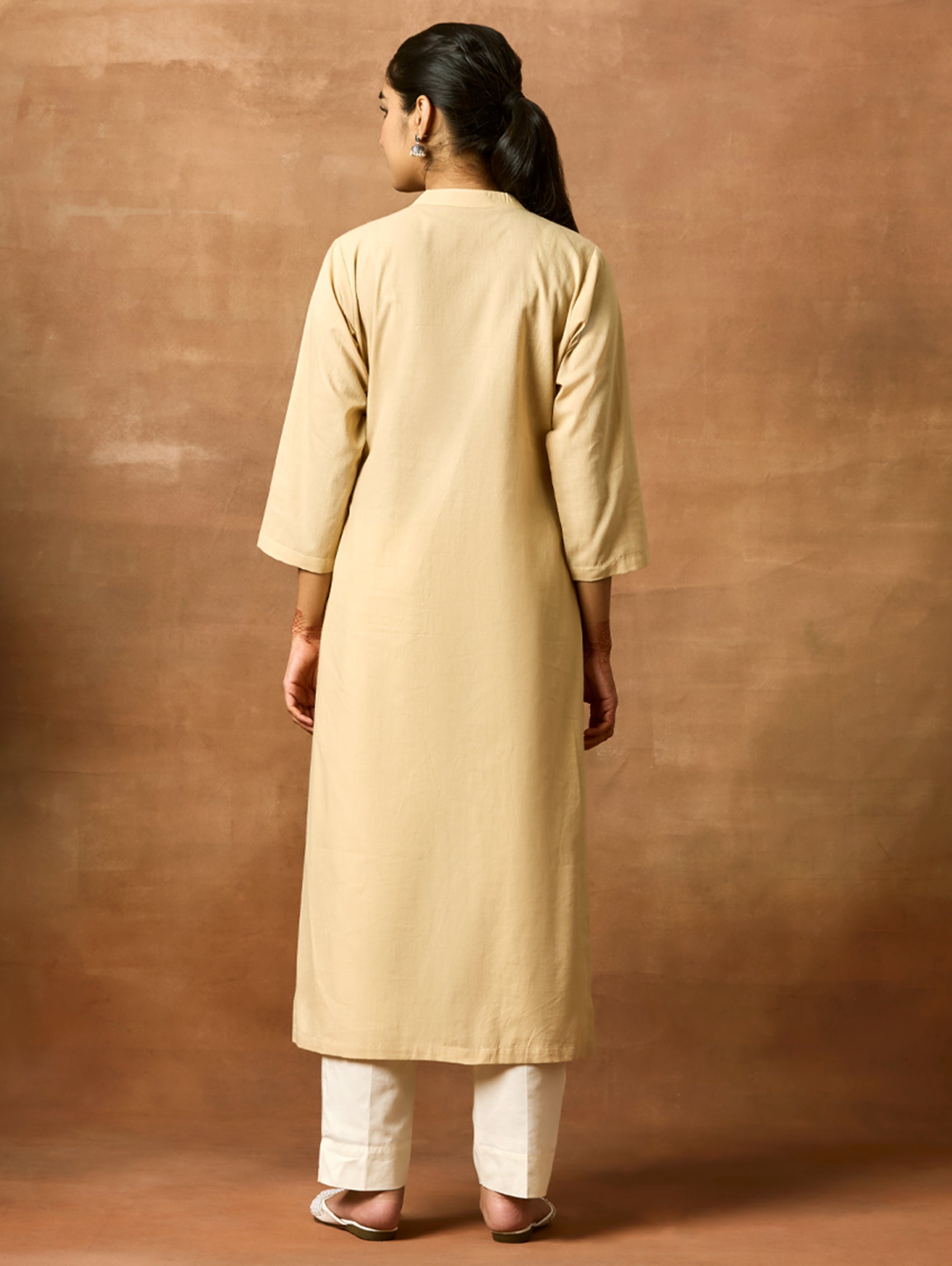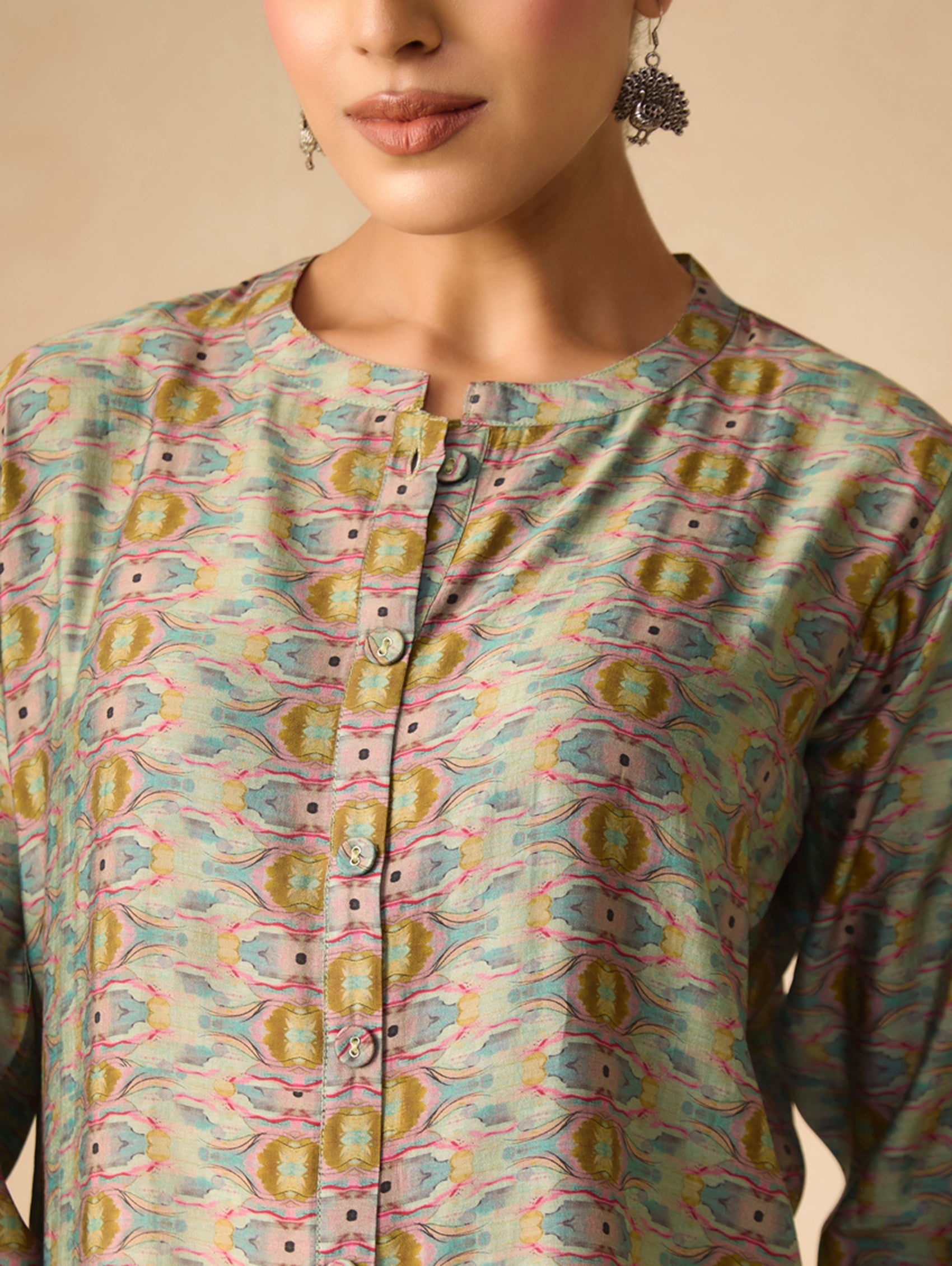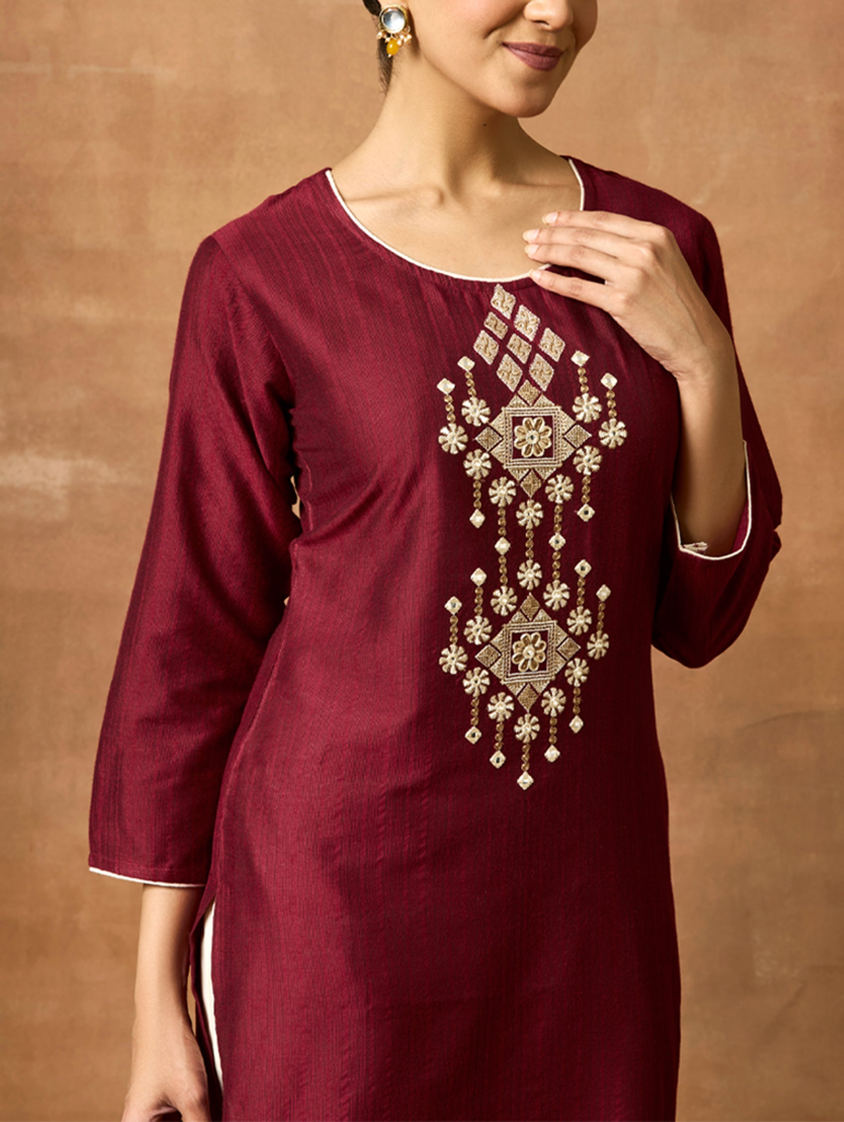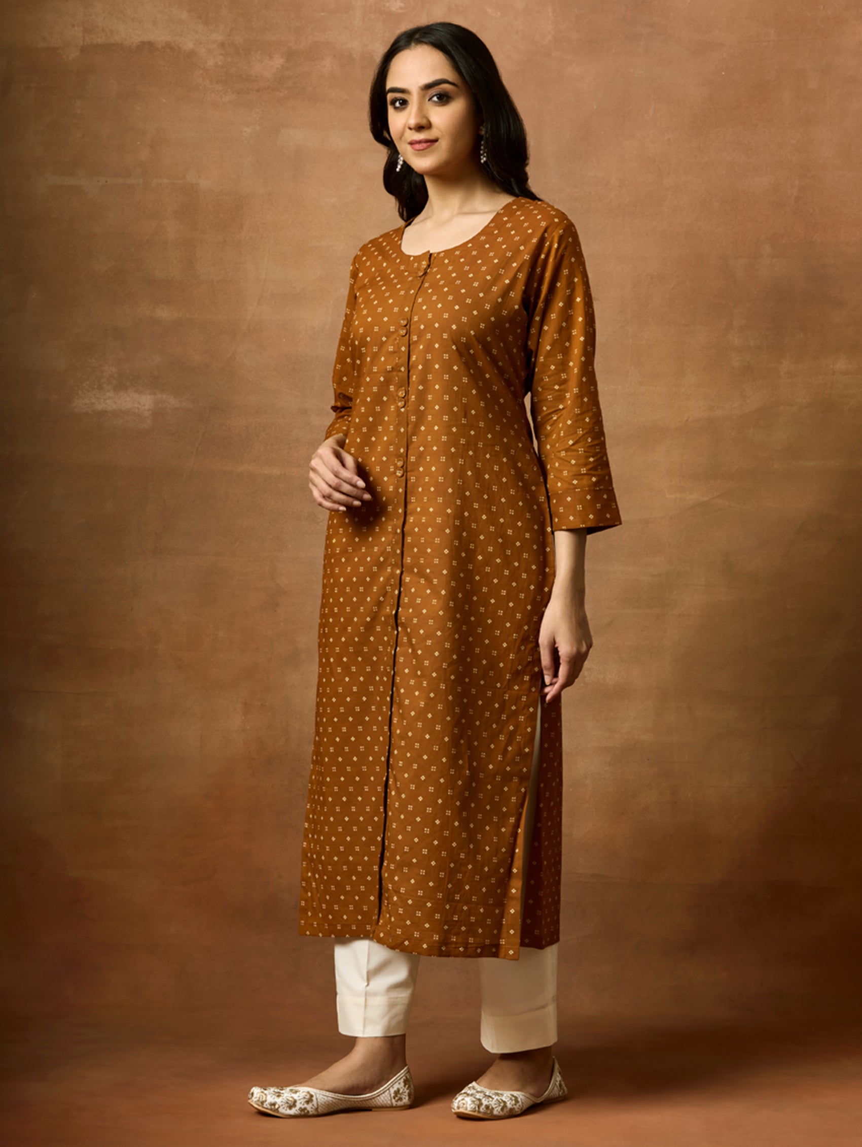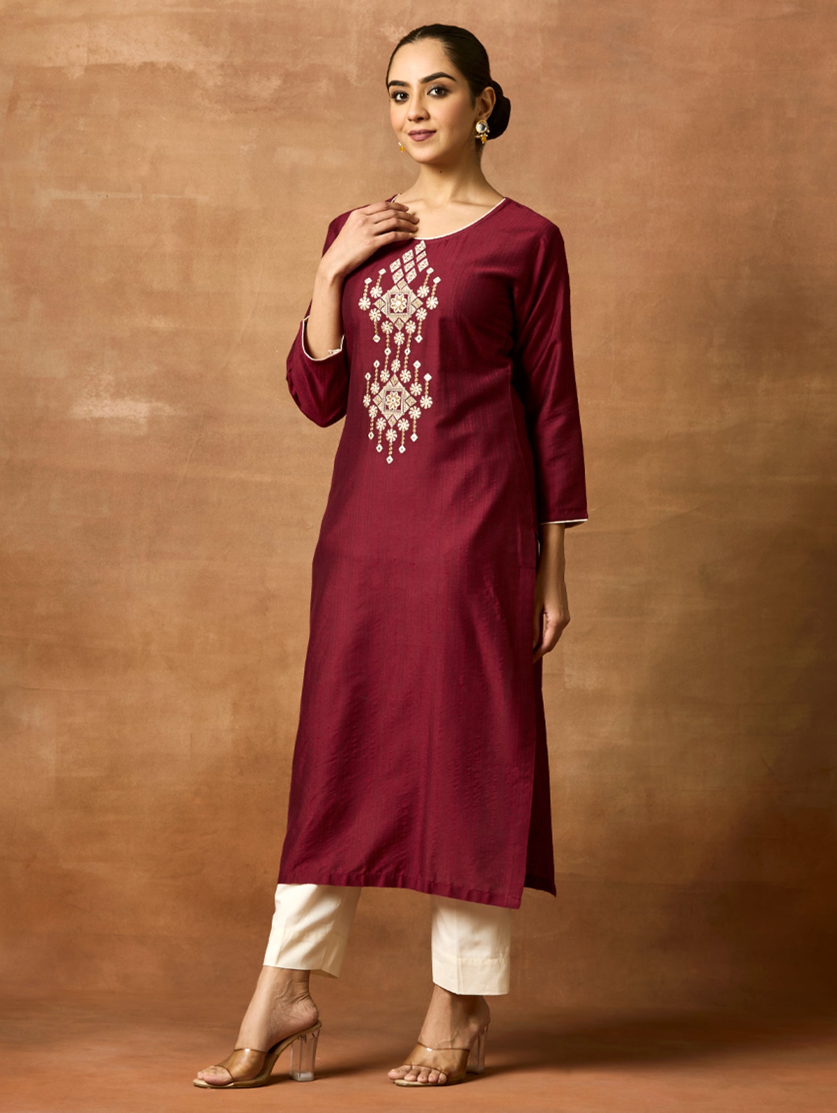 • Short Kurti with mandarin collar, three-fourth sleeves, and side slits open